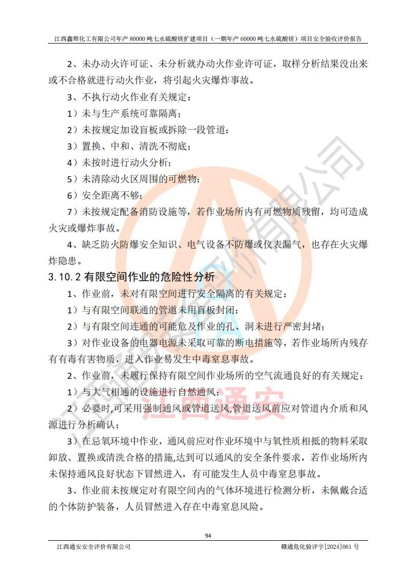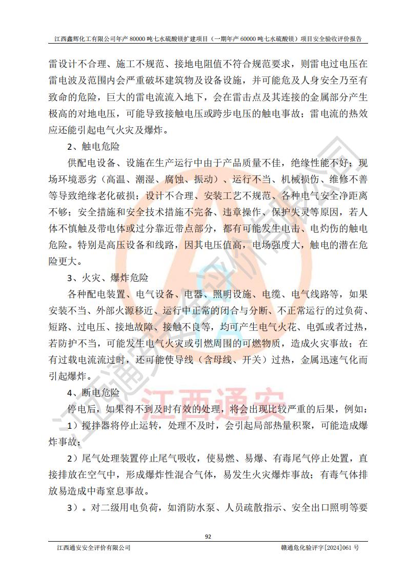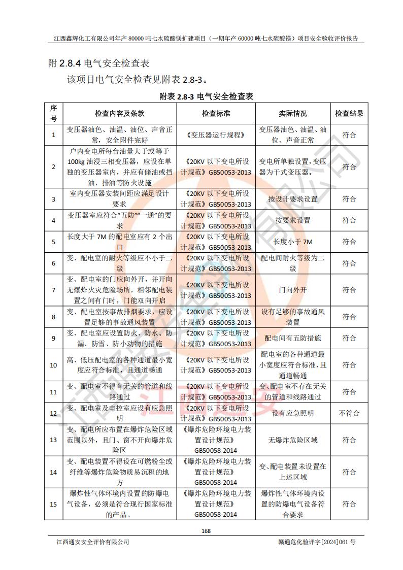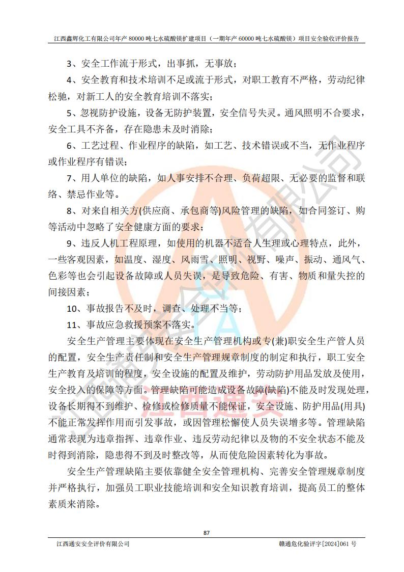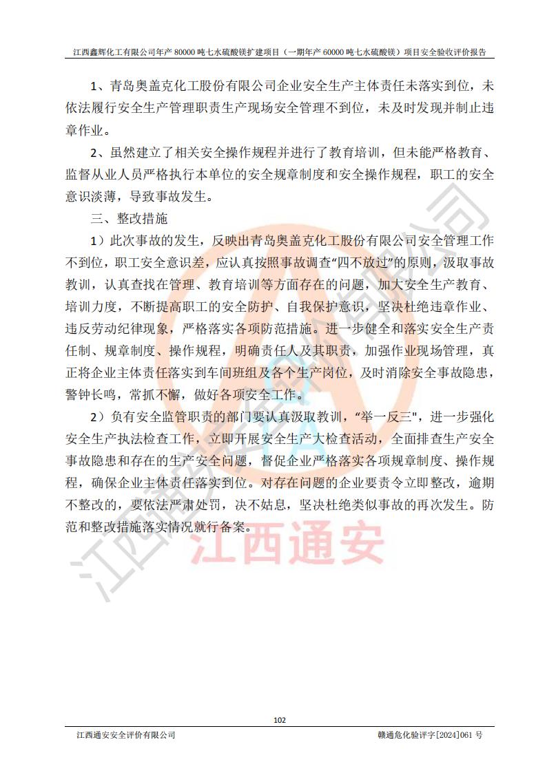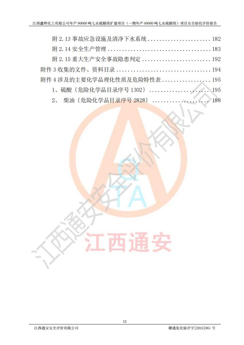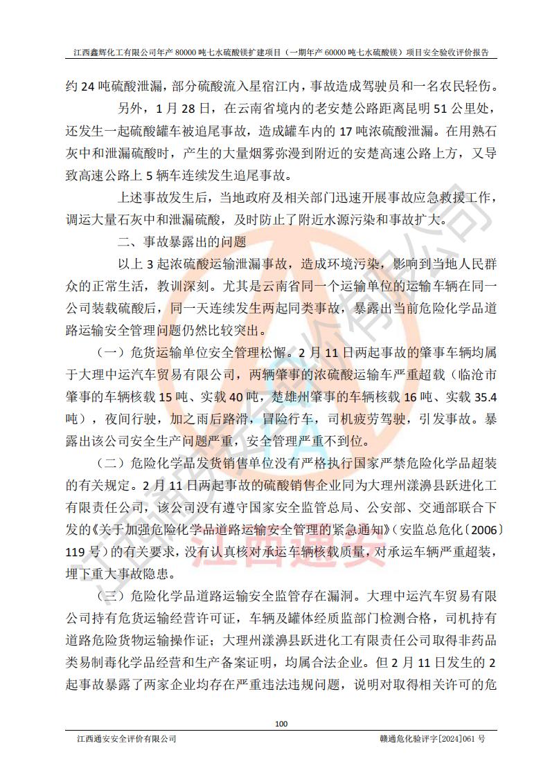 評價報告名稱 | 江西鑫輝化工有限公司年產(chǎn)80000噸七水硫酸鎂擴建項目(一期年產(chǎn)60000噸七水硫酸鎂)項目安全驗收評價 | |||