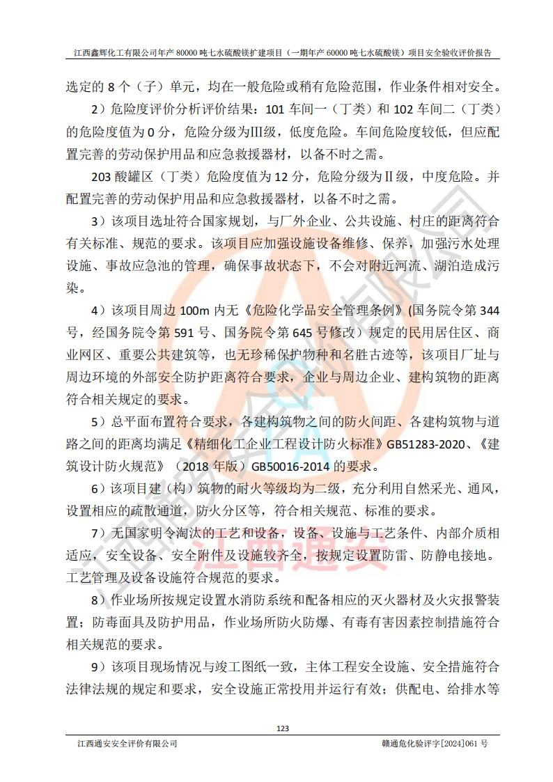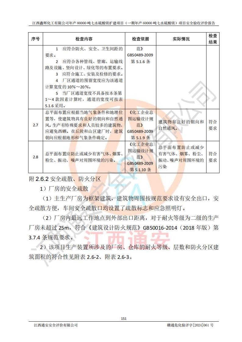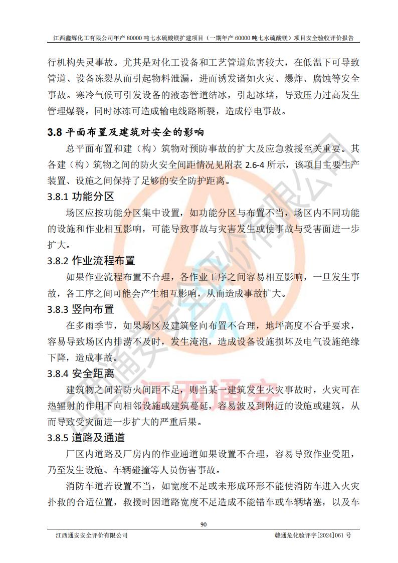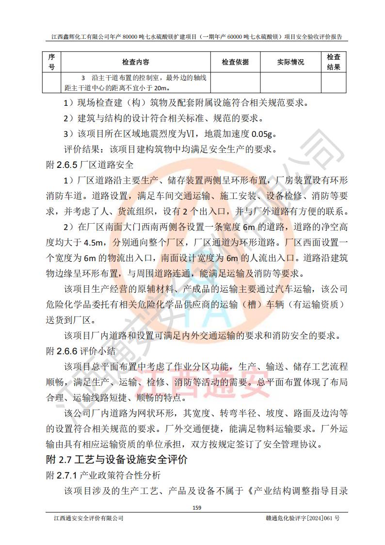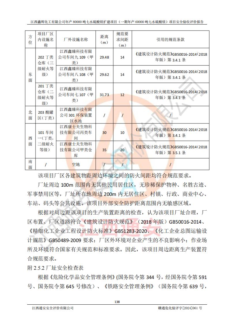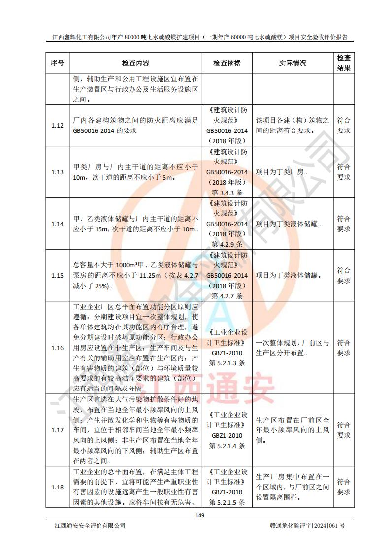 評價結論 | 1. 江西鑫輝化工有限公司年產(chǎn)80000噸七水硫酸鎂擴建項目(一期年產(chǎn)60000噸七水硫酸鎂)項目的安全設施與主體工程同時設計、同時施工、同時投入生產(chǎn)和使用,符合**有關建設項目“三同時”的規(guī)定和要求。 2. 江西鑫輝化工有限公司年產(chǎn)80000噸七水硫酸鎂擴建項目(一期年產(chǎn)60000噸七水硫酸鎂)符合新干縣鹽化工業(yè)城發(fā)展規(guī)劃的布局; 3. 該項目現(xiàn)場情況、企業(yè)總平面布置、設備設施的布置與設計圖、竣工圖紙一致,主體工程安全設施、安全措施符合法律法規(guī)的規(guī)定和要求,安全設施正常投用并運行**;供配電、給排水等公用工程及輔助設施滿足主體工程生產(chǎn)安全的需要;企業(yè)安全管理體系滿足生產(chǎn)安全的要求; 4. 總平面布置符合《建筑設計防火規(guī)范》GB50016-2014(2018年版)、《精細化工企業(yè)工程設計防火標準》GB51283-2020等標準、規(guī)范的要求; 5. 公司已針對本報告提出的安全隱患整改意見組織人員進行整改,整改措施已落實到位,企業(yè)安全生產(chǎn)的風險控制在可以接受的范圍內(nèi); 6. 該項目采用成熟的生產(chǎn)工藝和設備,本質(zhì)安全程度較高。 7. 綜上所述:本報告認為,江西鑫輝化工有限公司年產(chǎn)80000噸七水硫酸鎂擴建項目(一期年產(chǎn)60000噸七水硫酸鎂)項目的生產(chǎn)裝置現(xiàn)場情況與設計圖紙一致,安全設施及安全管理符合**及有關部門關于安全生產(chǎn)法律、法規(guī)、標準的要求,安全風險是受控制的,其風險程度是可以接受的,符合安全生產(chǎn)條件,能夠滿足安全生產(chǎn)的要求,具備安全設施“三同時”驗收條件。 | |||