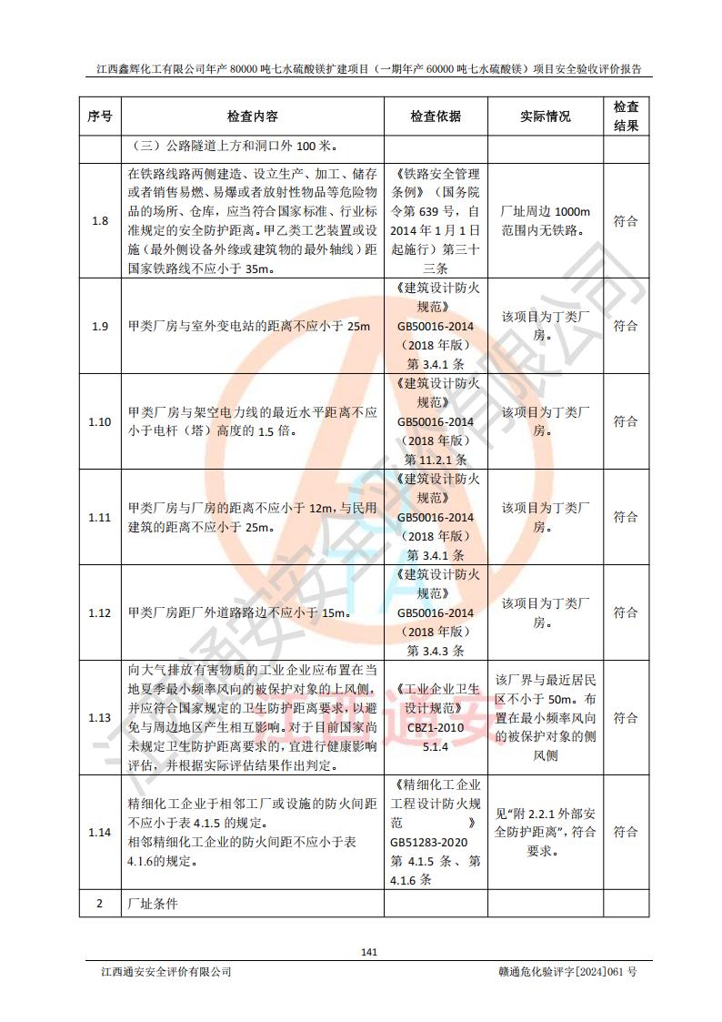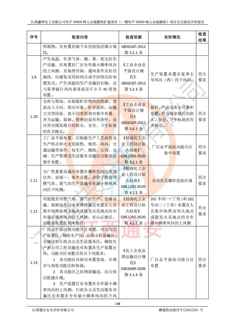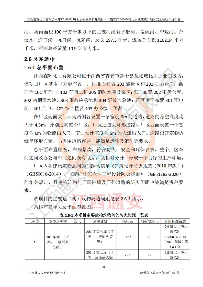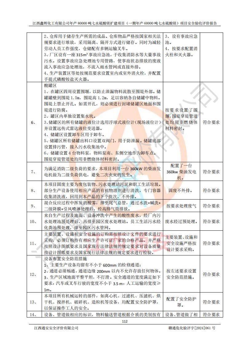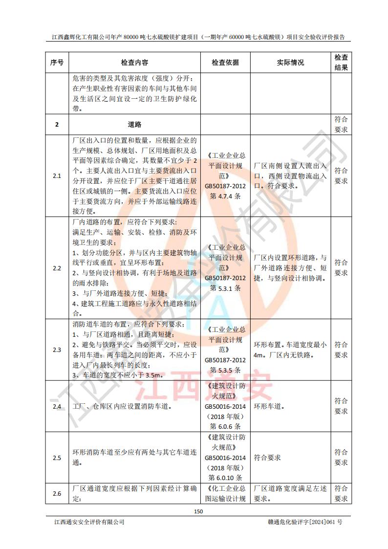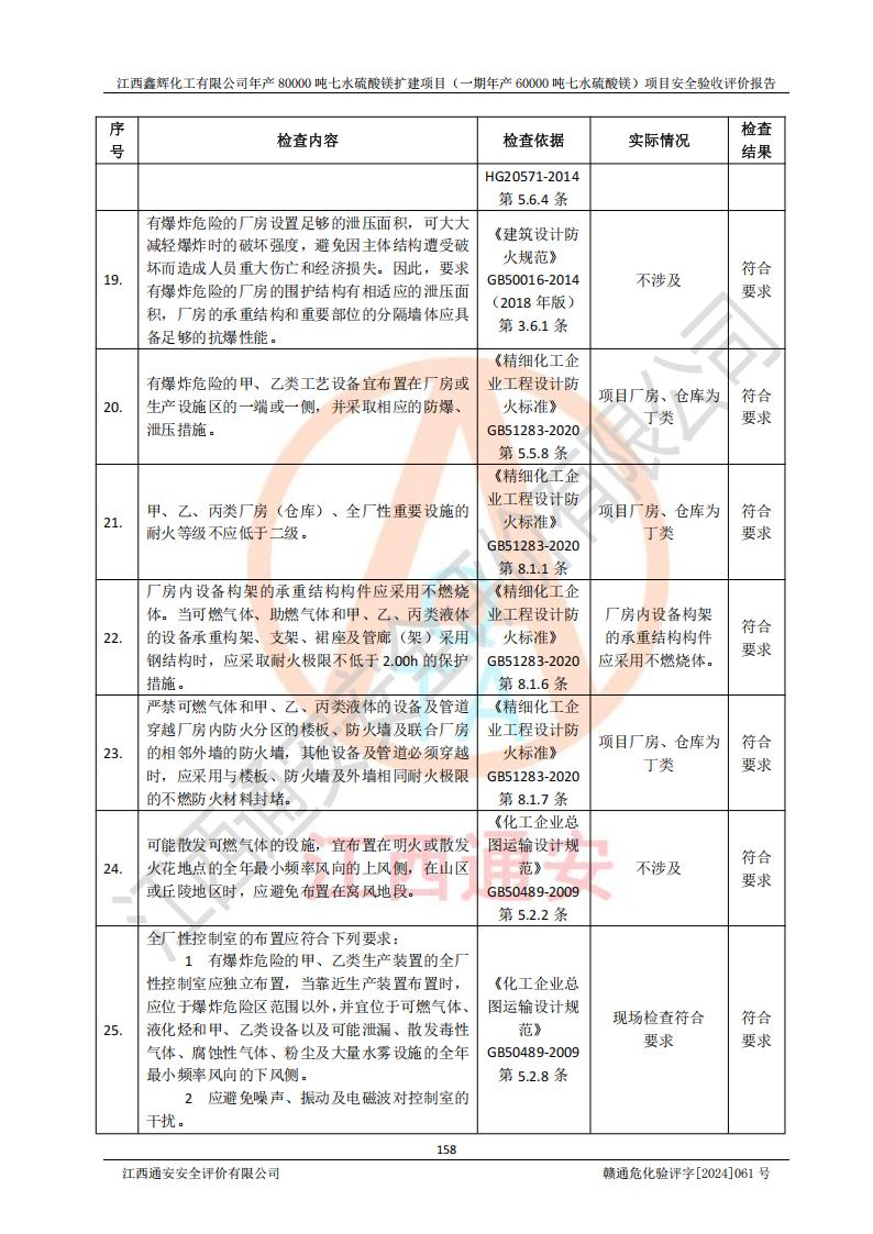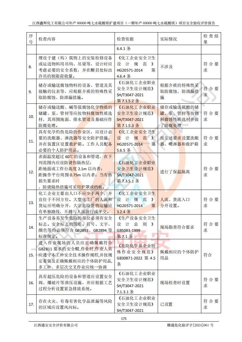 評價結論 | 1. 江西鑫輝化工有限公司年產(chǎn)80000噸七水硫酸鎂擴建項目(一期年產(chǎn)60000噸七水硫酸鎂)項目的安全設施與主體工程同時設計、同時施工、同時投入生產(chǎn)和使用,符合**有關建設項目“三同時”的規(guī)定和要求。 2. 江西鑫輝化工有限公司年產(chǎn)80000噸七水硫酸鎂擴建項目(一期年產(chǎn)60000噸七水硫酸鎂)符合新干縣鹽化工業(yè)城發(fā)展規(guī)劃的布局; 3. 該項目現(xiàn)場情況、企業(yè)總平面布置、設備設施的布置與設計圖、竣工圖紙一致,主體工程安全設施、安全措施符合法律法規(guī)的規(guī)定和要求,安全設施正常投用并運行**;供配電、給排水等公用工程及輔助設施滿足主體工程生產(chǎn)安全的需要;企業(yè)安全管理體系滿足生產(chǎn)安全的要求; 4. 總平面布置符合《建筑設計防火規(guī)范》GB50016-2014(2018年版)、《精細化工企業(yè)工程設計防火標準》GB51283-2020等標準、規(guī)范的要求; 5. 公司已針對本報告提出的安全隱患整改意見組織人員進行整改,整改措施已落實到位,企業(yè)安全生產(chǎn)的風險控制在可以接受的范圍內(nèi); 6. 該項目采用成熟的生產(chǎn)工藝和設備,本質(zhì)安全程度較高。 7. 綜上所述:本報告認為,江西鑫輝化工有限公司年產(chǎn)80000噸七水硫酸鎂擴建項目(一期年產(chǎn)60000噸七水硫酸鎂)項目的生產(chǎn)裝置現(xiàn)場情況與設計圖紙一致,安全設施及安全管理符合**及有關部門關于安全生產(chǎn)法律、法規(guī)、標準的要求,安全風險是受控制的,其風險程度是可以接受的,符合安全生產(chǎn)條件,能夠滿足安全生產(chǎn)的要求,具備安全設施“三同時”驗收條件。 | |||