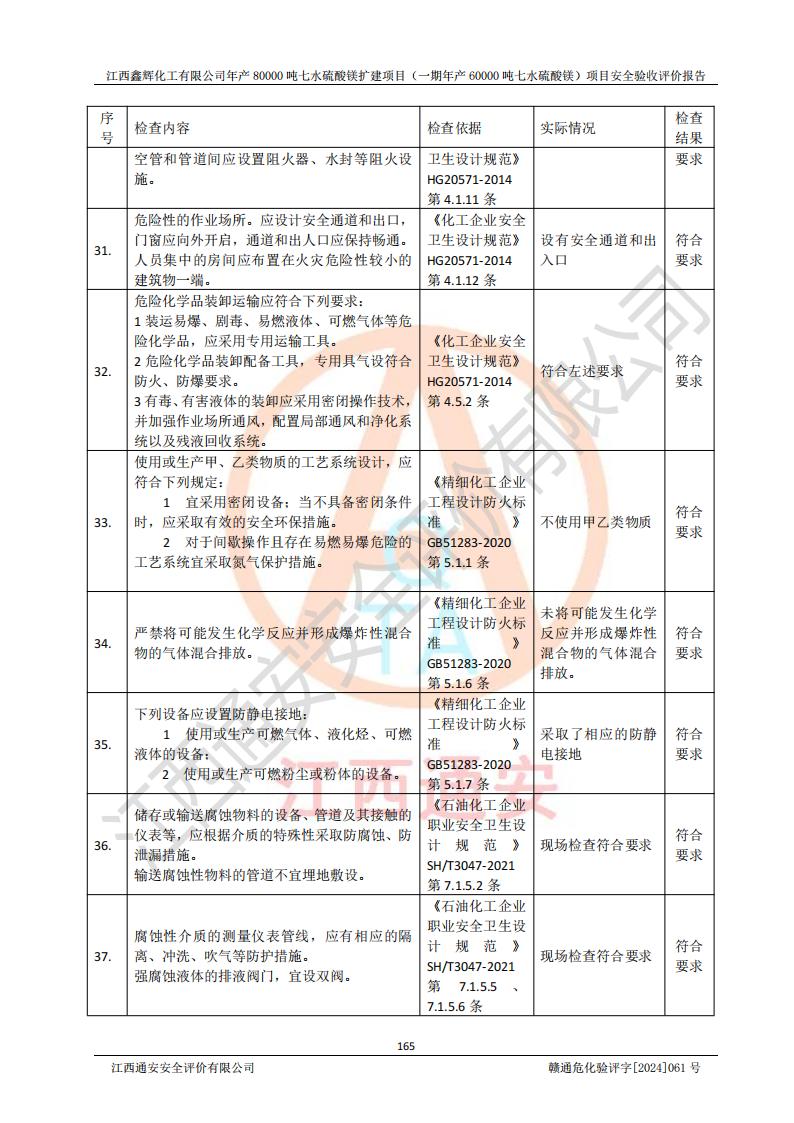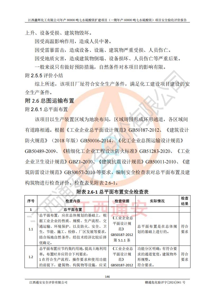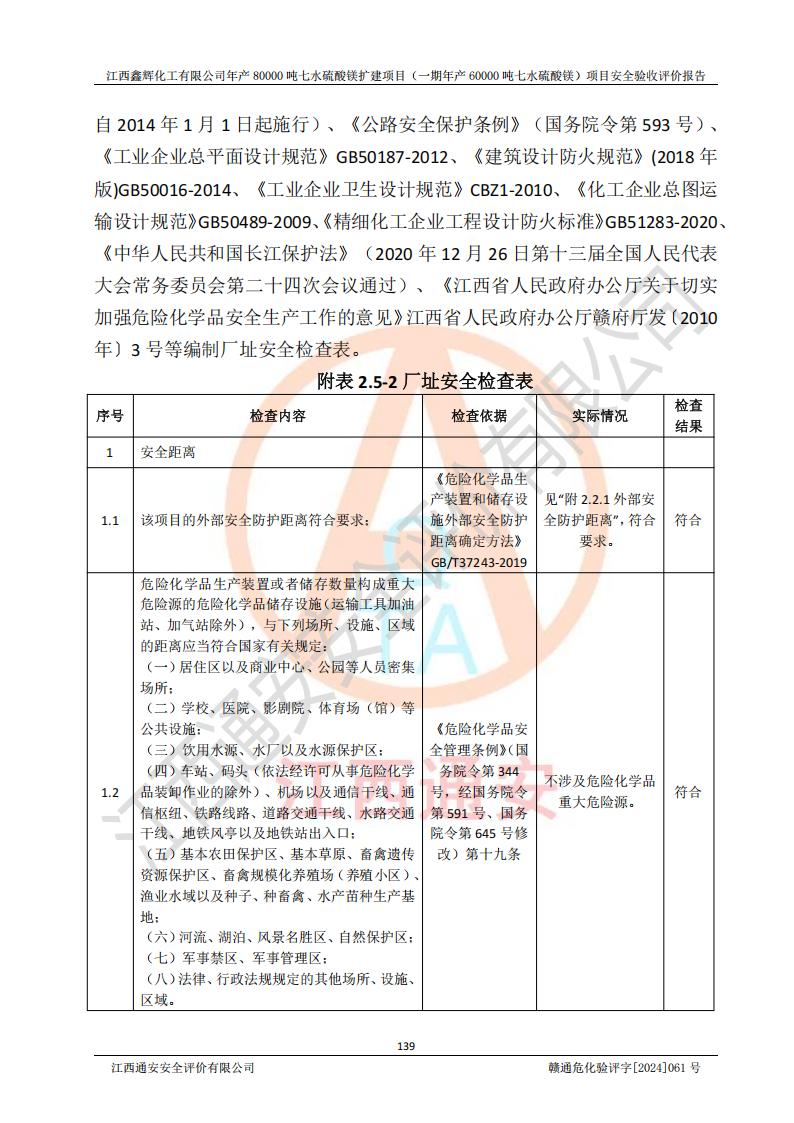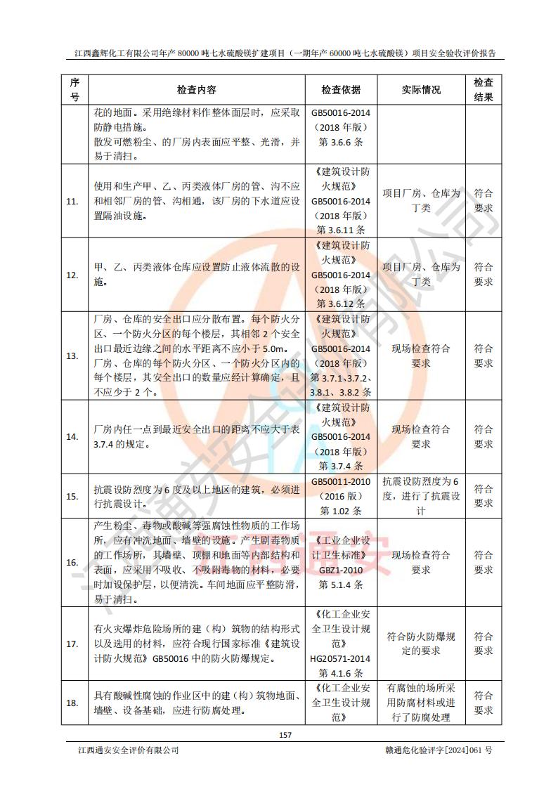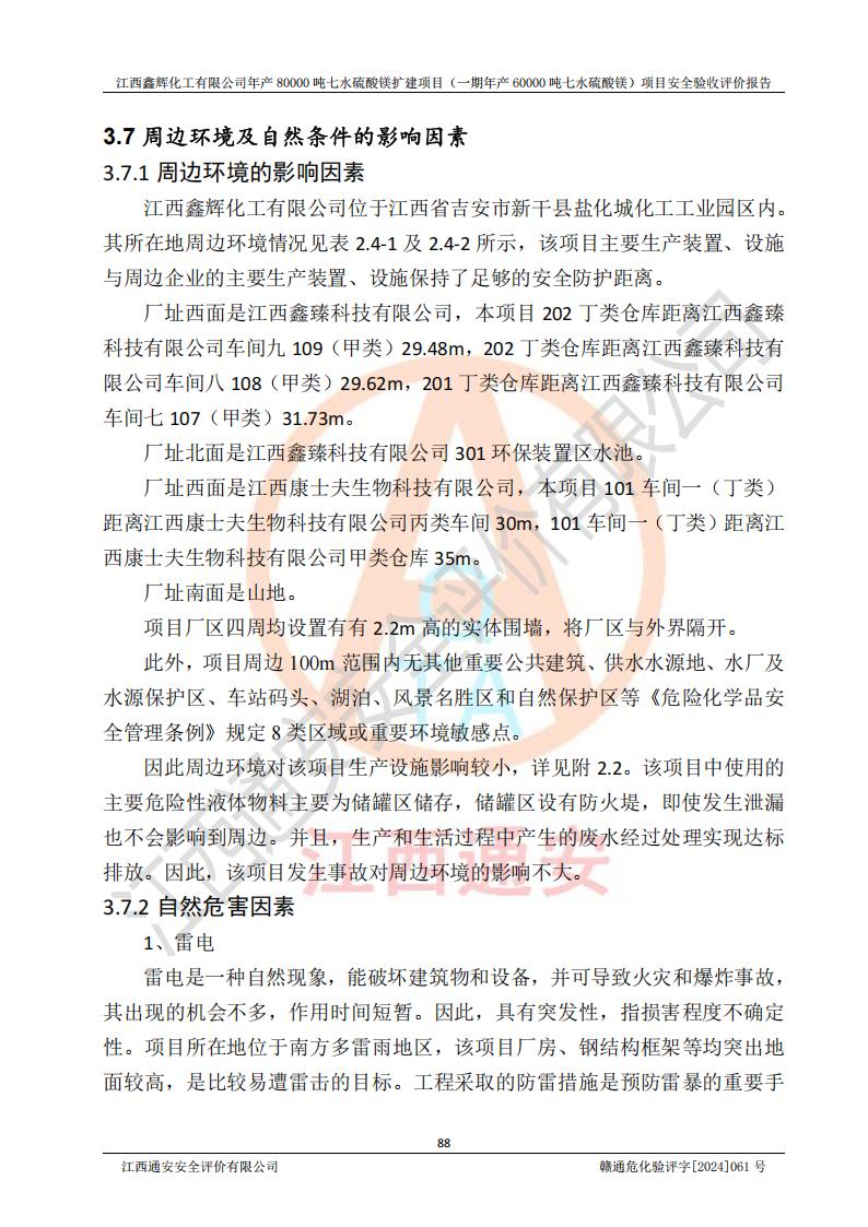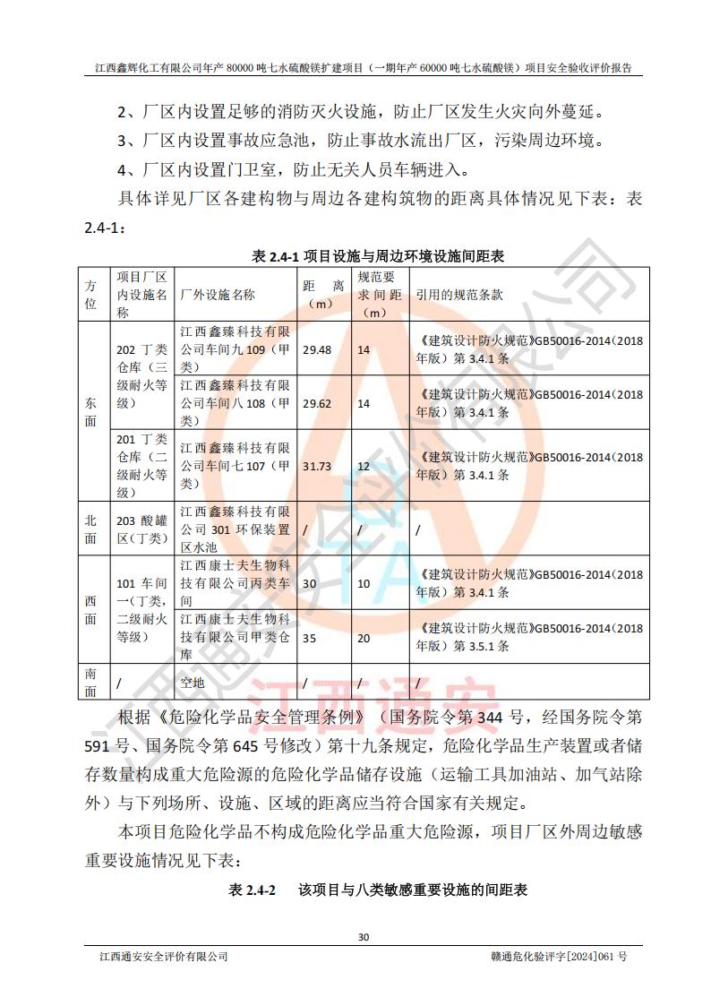 評價結論 | 1. 江西鑫輝化工有限公司年產(chǎn)80000噸七水硫酸鎂擴建項目(一期年產(chǎn)60000噸七水硫酸鎂)項目的安全設施與主體工程同時設計、同時施工、同時投入生產(chǎn)和使用,符合**有關建設項目“三同時”的規(guī)定和要求。 2. 江西鑫輝化工有限公司年產(chǎn)80000噸七水硫酸鎂擴建項目(一期年產(chǎn)60000噸七水硫酸鎂)符合新干縣鹽化工業(yè)城發(fā)展規(guī)劃的布局; 3. 該項目現(xiàn)場情況、企業(yè)總平面布置、設備設施的布置與設計圖、竣工圖紙一致,主體工程安全設施、安全措施符合法律法規(guī)的規(guī)定和要求,安全設施正常投用并運行**;供配電、給排水等公用工程及輔助設施滿足主體工程生產(chǎn)安全的需要;企業(yè)安全管理體系滿足生產(chǎn)安全的要求; 4. 總平面布置符合《建筑設計防火規(guī)范》GB50016-2014(2018年版)、《精細化工企業(yè)工程設計防火標準》GB51283-2020等標準、規(guī)范的要求; 5. 公司已針對本報告提出的安全隱患整改意見組織人員進行整改,整改措施已落實到位,企業(yè)安全生產(chǎn)的風險控制在可以接受的范圍內(nèi); 6. 該項目采用成熟的生產(chǎn)工藝和設備,本質(zhì)安全程度較高。 7. 綜上所述:本報告認為,江西鑫輝化工有限公司年產(chǎn)80000噸七水硫酸鎂擴建項目(一期年產(chǎn)60000噸七水硫酸鎂)項目的生產(chǎn)裝置現(xiàn)場情況與設計圖紙一致,安全設施及安全管理符合**及有關部門關于安全生產(chǎn)法律、法規(guī)、標準的要求,安全風險是受控制的,其風險程度是可以接受的,符合安全生產(chǎn)條件,能夠滿足安全生產(chǎn)的要求,具備安全設施“三同時”驗收條件。 | |||