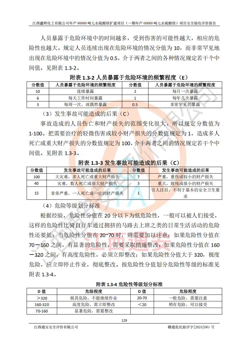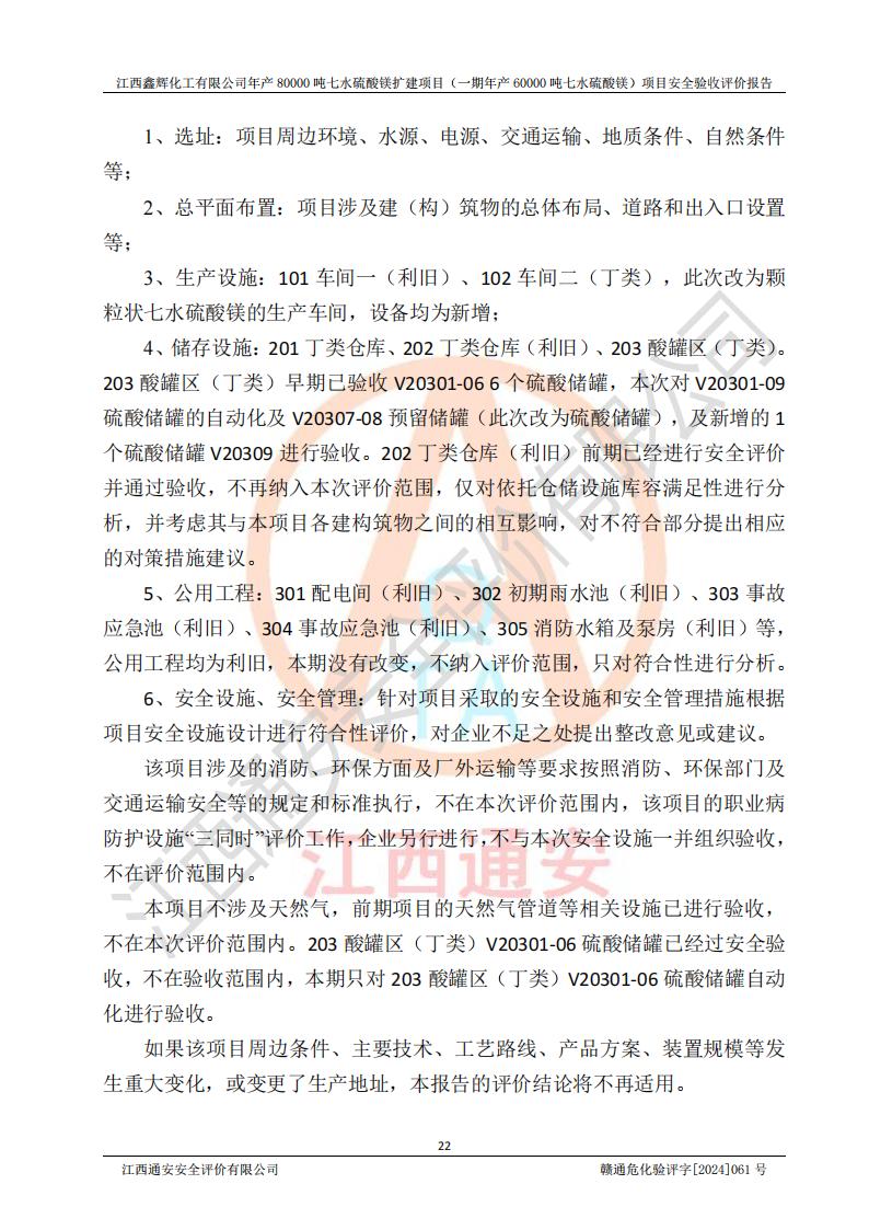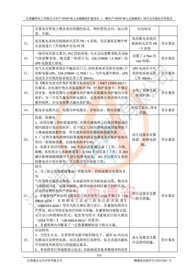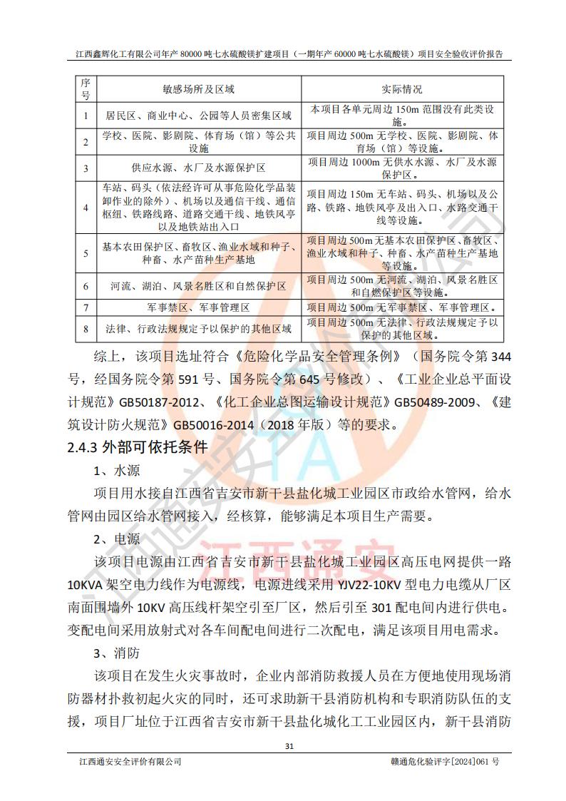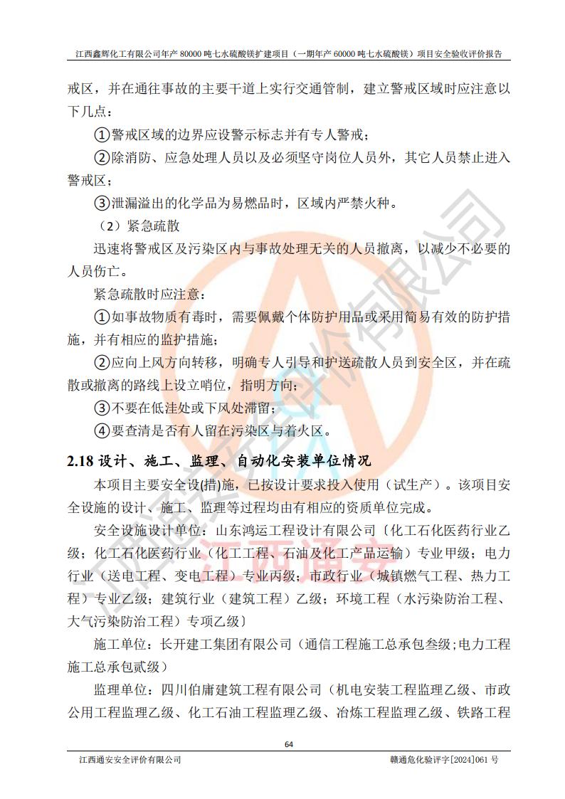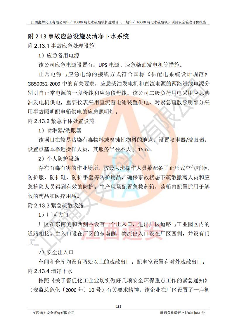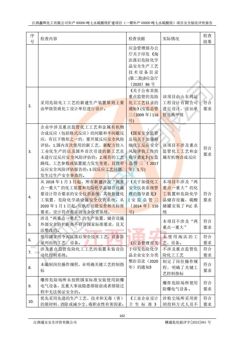 評價結論 | 1. 江西鑫輝化工有限公司年產(chǎn)80000噸七水硫酸鎂擴建項目(一期年產(chǎn)60000噸七水硫酸鎂)項目的安全設施與主體工程同時設計、同時施工、同時投入生產(chǎn)和使用,符合**有關建設項目“三同時”的規(guī)定和要求。 2. 江西鑫輝化工有限公司年產(chǎn)80000噸七水硫酸鎂擴建項目(一期年產(chǎn)60000噸七水硫酸鎂)符合新干縣鹽化工業(yè)城發(fā)展規(guī)劃的布局; 3. 該項目現(xiàn)場情況、企業(yè)總平面布置、設備設施的布置與設計圖、竣工圖紙一致,主體工程安全設施、安全措施符合法律法規(guī)的規(guī)定和要求,安全設施正常投用并運行**;供配電、給排水等公用工程及輔助設施滿足主體工程生產(chǎn)安全的需要;企業(yè)安全管理體系滿足生產(chǎn)安全的要求; 4. 總平面布置符合《建筑設計防火規(guī)范》GB50016-2014(2018年版)、《精細化工企業(yè)工程設計防火標準》GB51283-2020等標準、規(guī)范的要求; 5. 公司已針對本報告提出的安全隱患整改意見組織人員進行整改,整改措施已落實到位,企業(yè)安全生產(chǎn)的風險控制在可以接受的范圍內(nèi); 6. 該項目采用成熟的生產(chǎn)工藝和設備,本質(zhì)安全程度較高。 7. 綜上所述:本報告認為,江西鑫輝化工有限公司年產(chǎn)80000噸七水硫酸鎂擴建項目(一期年產(chǎn)60000噸七水硫酸鎂)項目的生產(chǎn)裝置現(xiàn)場情況與設計圖紙一致,安全設施及安全管理符合**及有關部門關于安全生產(chǎn)法律、法規(guī)、標準的要求,安全風險是受控制的,其風險程度是可以接受的,符合安全生產(chǎn)條件,能夠滿足安全生產(chǎn)的要求,具備安全設施“三同時”驗收條件。 | |||