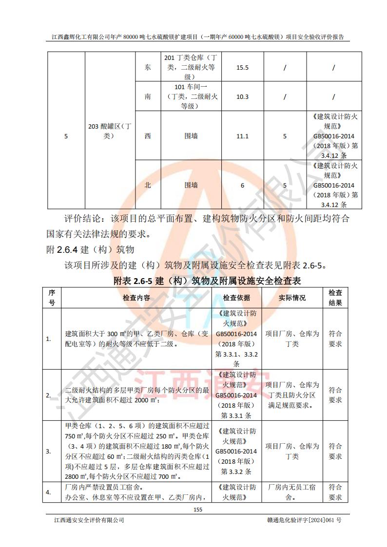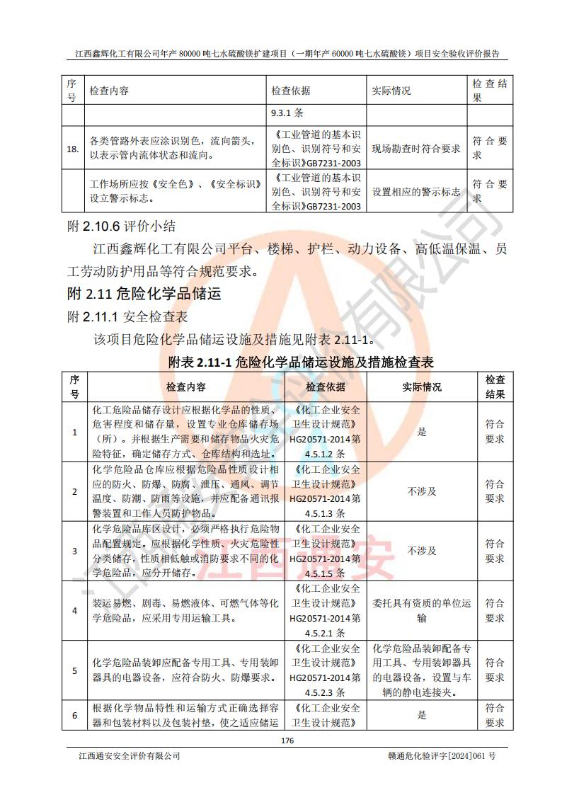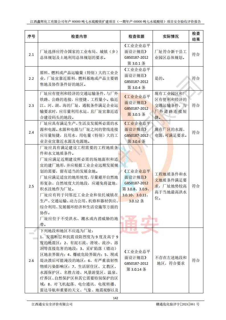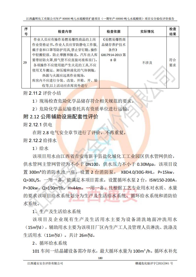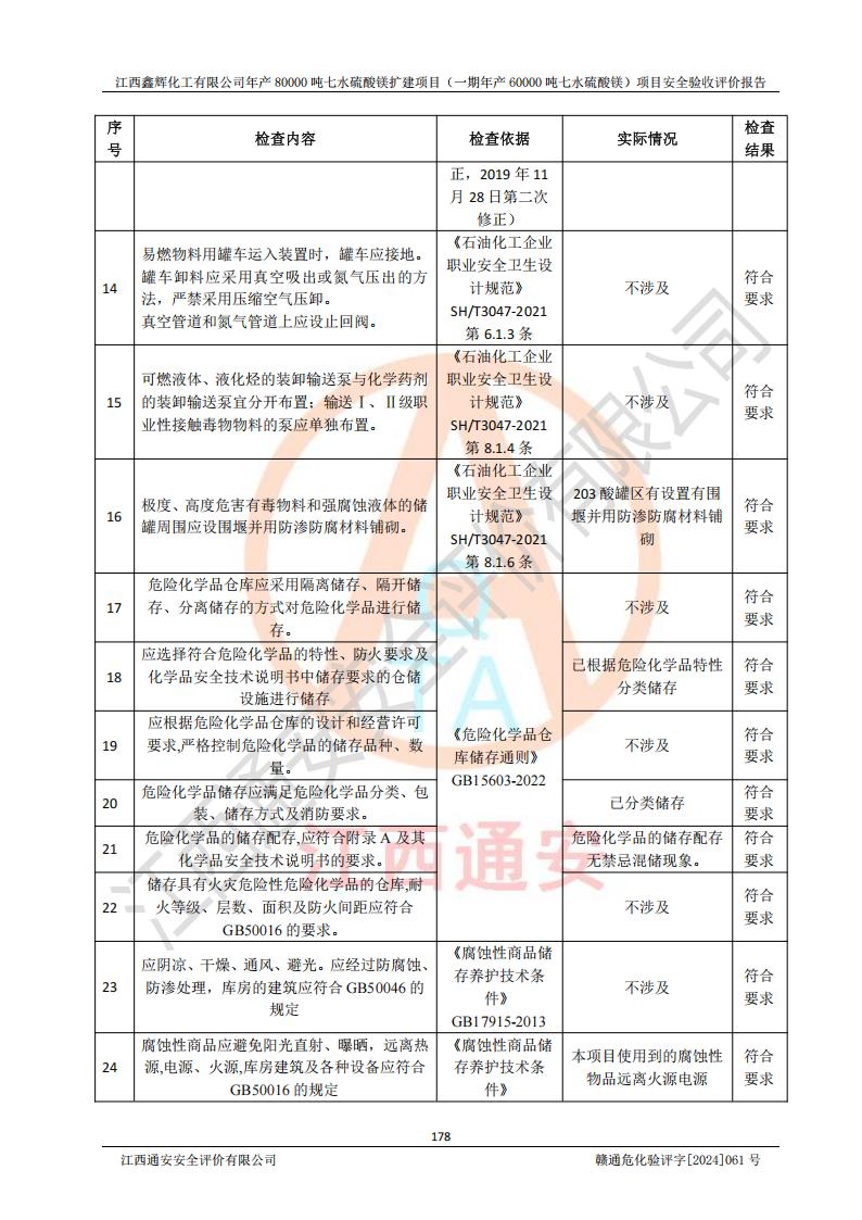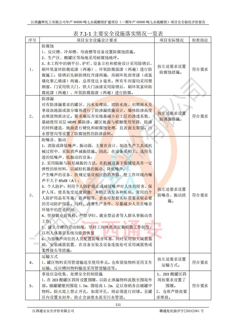 評價結論 | 1. 江西鑫輝化工有限公司年產(chǎn)80000噸七水硫酸鎂擴建項目(一期年產(chǎn)60000噸七水硫酸鎂)項目的安全設施與主體工程同時設計、同時施工、同時投入生產(chǎn)和使用,符合**有關建設項目“三同時”的規(guī)定和要求。 2. 江西鑫輝化工有限公司年產(chǎn)80000噸七水硫酸鎂擴建項目(一期年產(chǎn)60000噸七水硫酸鎂)符合新干縣鹽化工業(yè)城發(fā)展規(guī)劃的布局; 3. 該項目現(xiàn)場情況、企業(yè)總平面布置、設備設施的布置與設計圖、竣工圖紙一致,主體工程安全設施、安全措施符合法律法規(guī)的規(guī)定和要求,安全設施正常投用并運行**;供配電、給排水等公用工程及輔助設施滿足主體工程生產(chǎn)安全的需要;企業(yè)安全管理體系滿足生產(chǎn)安全的要求; 4. 總平面布置符合《建筑設計防火規(guī)范》GB50016-2014(2018年版)、《精細化工企業(yè)工程設計防火標準》GB51283-2020等標準、規(guī)范的要求; 5. 公司已針對本報告提出的安全隱患整改意見組織人員進行整改,整改措施已落實到位,企業(yè)安全生產(chǎn)的風險控制在可以接受的范圍內(nèi); 6. 該項目采用成熟的生產(chǎn)工藝和設備,本質(zhì)安全程度較高。 7. 綜上所述:本報告認為,江西鑫輝化工有限公司年產(chǎn)80000噸七水硫酸鎂擴建項目(一期年產(chǎn)60000噸七水硫酸鎂)項目的生產(chǎn)裝置現(xiàn)場情況與設計圖紙一致,安全設施及安全管理符合**及有關部門關于安全生產(chǎn)法律、法規(guī)、標準的要求,安全風險是受控制的,其風險程度是可以接受的,符合安全生產(chǎn)條件,能夠滿足安全生產(chǎn)的要求,具備安全設施“三同時”驗收條件。 | |||