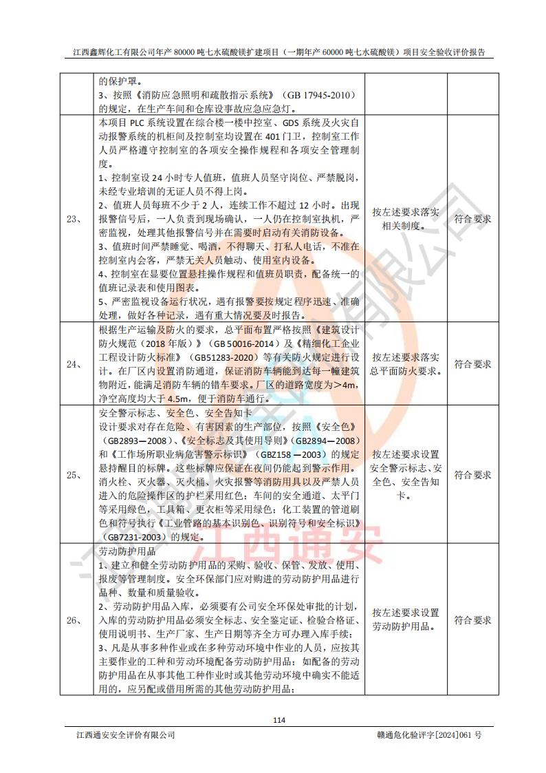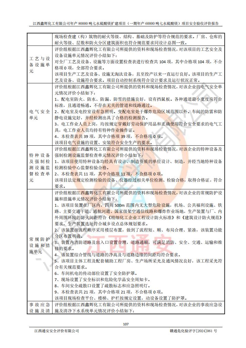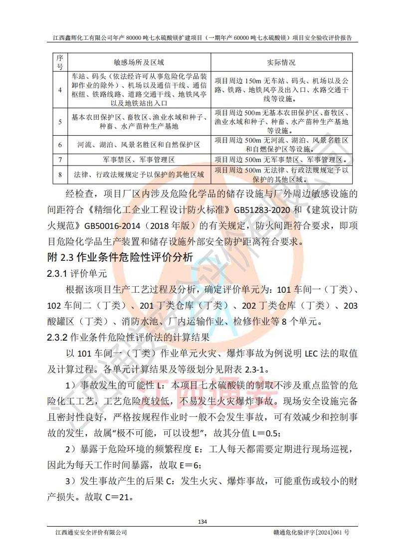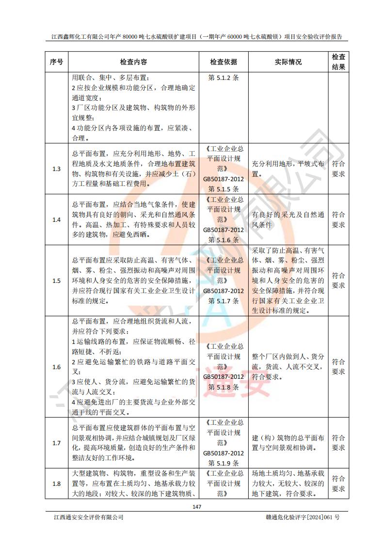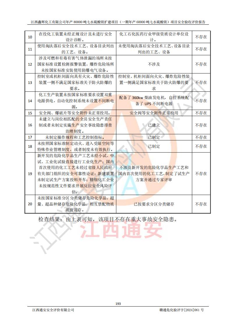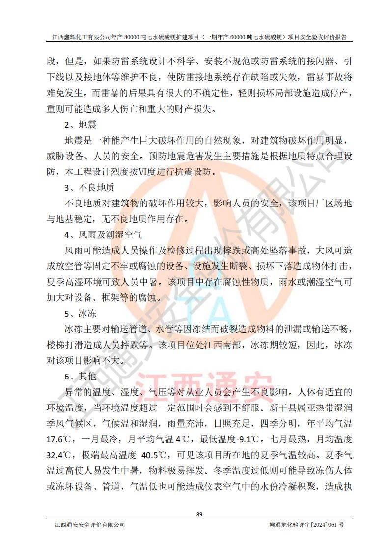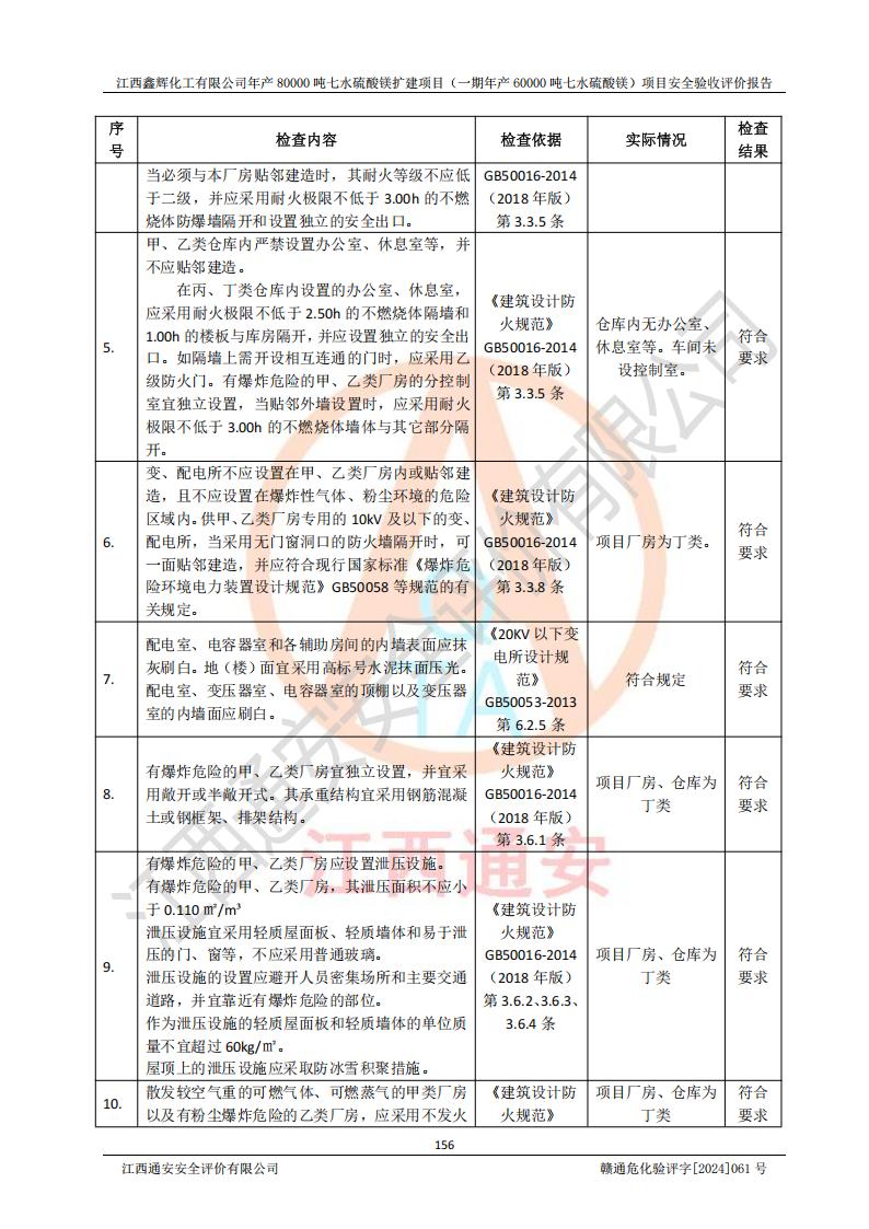 評價結論 | 1. 江西鑫輝化工有限公司年產(chǎn)80000噸七水硫酸鎂擴建項目(一期年產(chǎn)60000噸七水硫酸鎂)項目的安全設施與主體工程同時設計、同時施工、同時投入生產(chǎn)和使用,符合**有關建設項目“三同時”的規(guī)定和要求。 2. 江西鑫輝化工有限公司年產(chǎn)80000噸七水硫酸鎂擴建項目(一期年產(chǎn)60000噸七水硫酸鎂)符合新干縣鹽化工業(yè)城發(fā)展規(guī)劃的布局; 3. 該項目現(xiàn)場情況、企業(yè)總平面布置、設備設施的布置與設計圖、竣工圖紙一致,主體工程安全設施、安全措施符合法律法規(guī)的規(guī)定和要求,安全設施正常投用并運行**;供配電、給排水等公用工程及輔助設施滿足主體工程生產(chǎn)安全的需要;企業(yè)安全管理體系滿足生產(chǎn)安全的要求; 4. 總平面布置符合《建筑設計防火規(guī)范》GB50016-2014(2018年版)、《精細化工企業(yè)工程設計防火標準》GB51283-2020等標準、規(guī)范的要求; 5. 公司已針對本報告提出的安全隱患整改意見組織人員進行整改,整改措施已落實到位,企業(yè)安全生產(chǎn)的風險控制在可以接受的范圍內(nèi); 6. 該項目采用成熟的生產(chǎn)工藝和設備,本質(zhì)安全程度較高。 7. 綜上所述:本報告認為,江西鑫輝化工有限公司年產(chǎn)80000噸七水硫酸鎂擴建項目(一期年產(chǎn)60000噸七水硫酸鎂)項目的生產(chǎn)裝置現(xiàn)場情況與設計圖紙一致,安全設施及安全管理符合**及有關部門關于安全生產(chǎn)法律、法規(guī)、標準的要求,安全風險是受控制的,其風險程度是可以接受的,符合安全生產(chǎn)條件,能夠滿足安全生產(chǎn)的要求,具備安全設施“三同時”驗收條件。 | |||