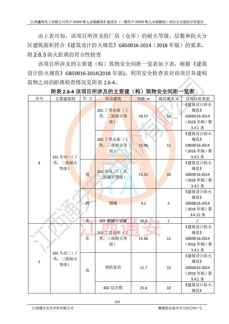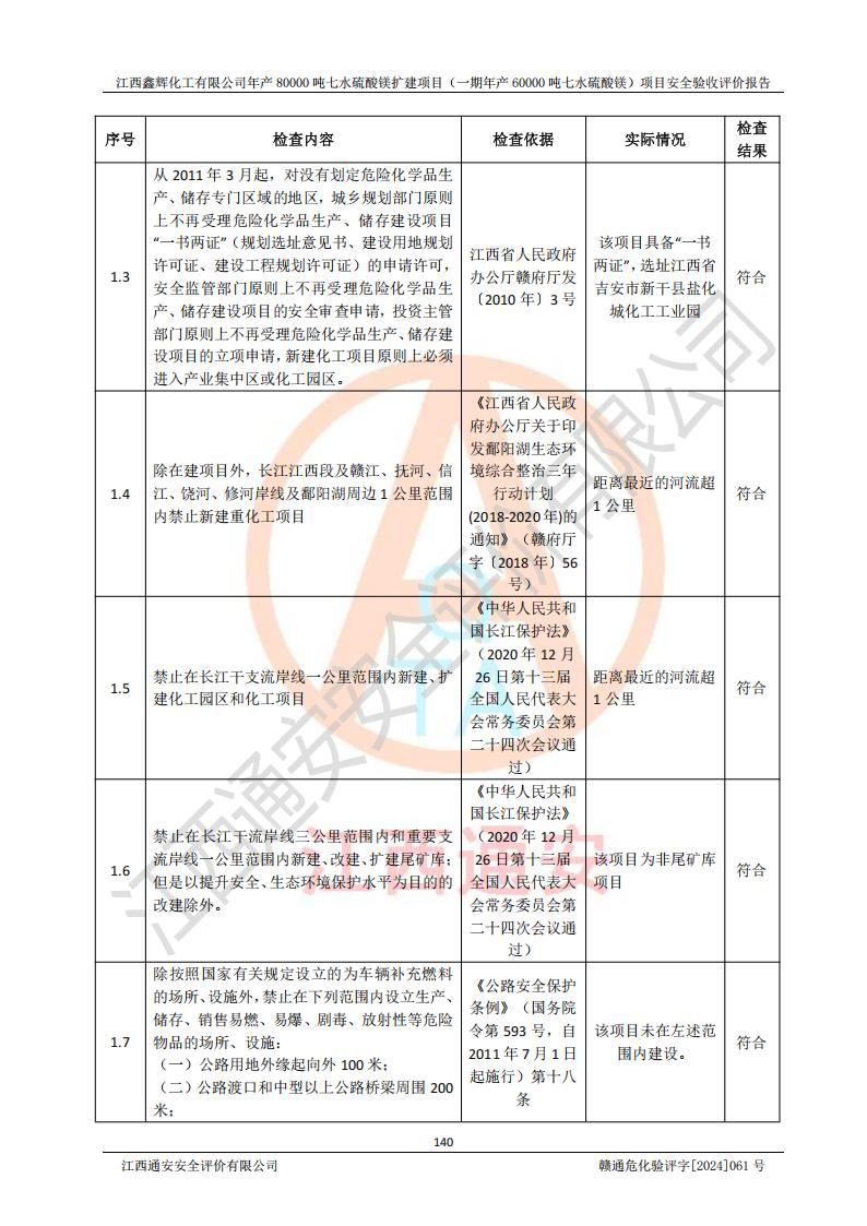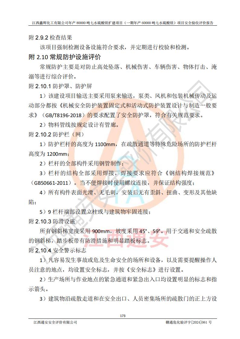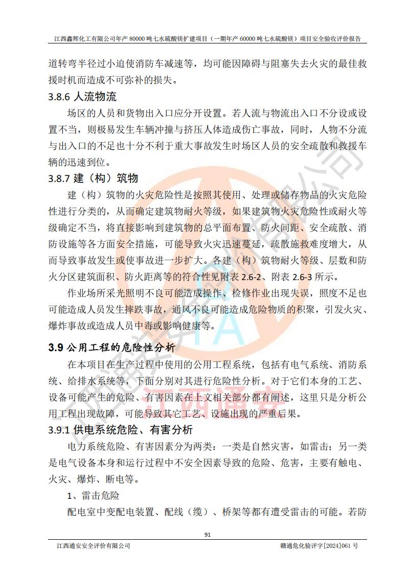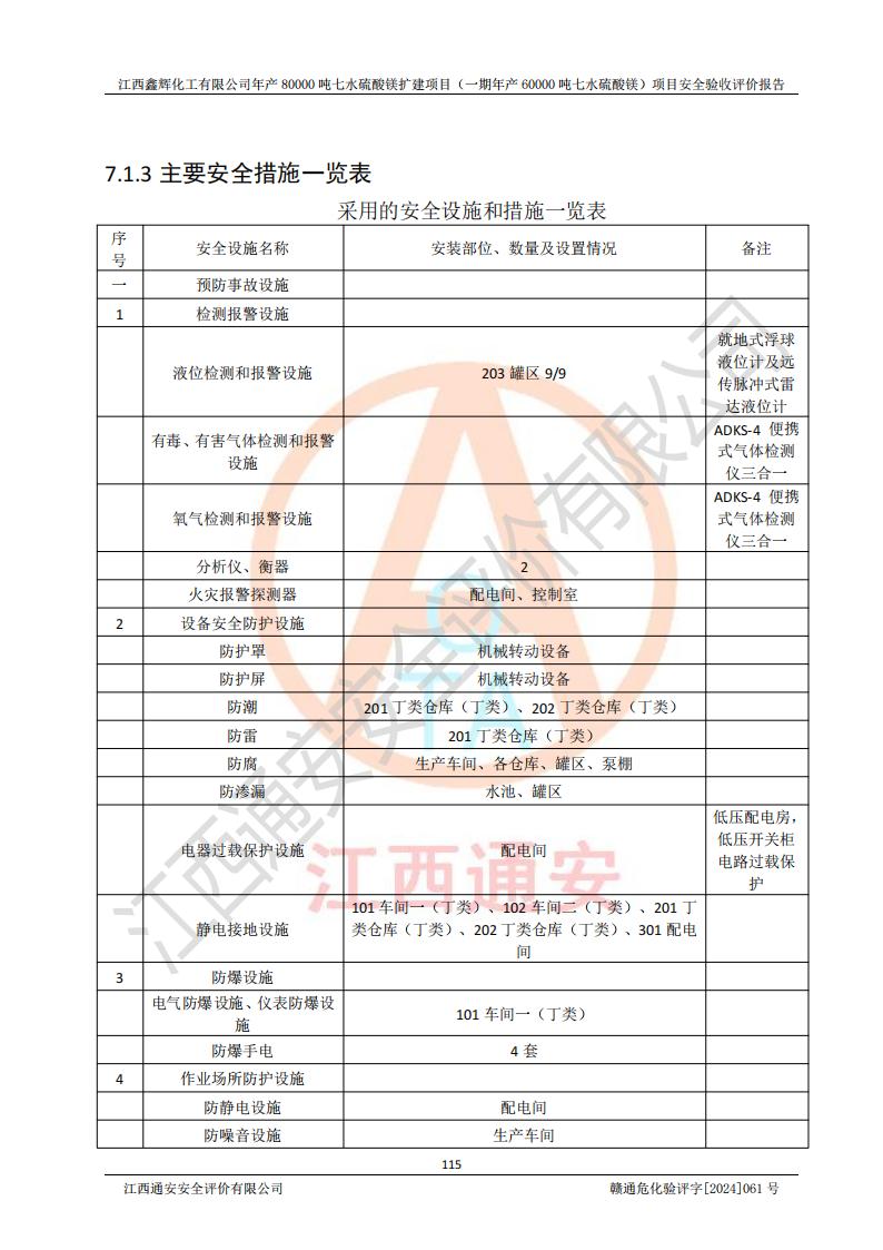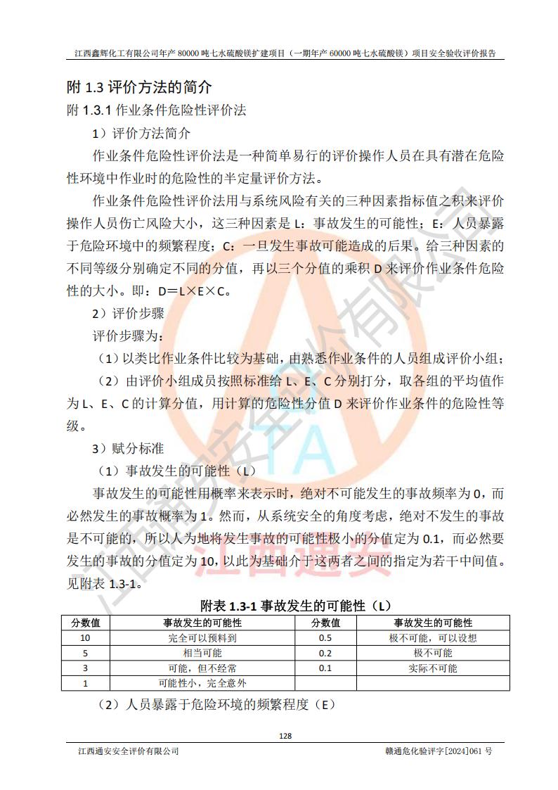 評價結論 | 1. 江西鑫輝化工有限公司年產(chǎn)80000噸七水硫酸鎂擴建項目(一期年產(chǎn)60000噸七水硫酸鎂)項目的安全設施與主體工程同時設計、同時施工、同時投入生產(chǎn)和使用,符合**有關建設項目“三同時”的規(guī)定和要求。 2. 江西鑫輝化工有限公司年產(chǎn)80000噸七水硫酸鎂擴建項目(一期年產(chǎn)60000噸七水硫酸鎂)符合新干縣鹽化工業(yè)城發(fā)展規(guī)劃的布局; 3. 該項目現(xiàn)場情況、企業(yè)總平面布置、設備設施的布置與設計圖、竣工圖紙一致,主體工程安全設施、安全措施符合法律法規(guī)的規(guī)定和要求,安全設施正常投用并運行**;供配電、給排水等公用工程及輔助設施滿足主體工程生產(chǎn)安全的需要;企業(yè)安全管理體系滿足生產(chǎn)安全的要求; 4. 總平面布置符合《建筑設計防火規(guī)范》GB50016-2014(2018年版)、《精細化工企業(yè)工程設計防火標準》GB51283-2020等標準、規(guī)范的要求; 5. 公司已針對本報告提出的安全隱患整改意見組織人員進行整改,整改措施已落實到位,企業(yè)安全生產(chǎn)的風險控制在可以接受的范圍內(nèi); 6. 該項目采用成熟的生產(chǎn)工藝和設備,本質(zhì)安全程度較高。 7. 綜上所述:本報告認為,江西鑫輝化工有限公司年產(chǎn)80000噸七水硫酸鎂擴建項目(一期年產(chǎn)60000噸七水硫酸鎂)項目的生產(chǎn)裝置現(xiàn)場情況與設計圖紙一致,安全設施及安全管理符合**及有關部門關于安全生產(chǎn)法律、法規(guī)、標準的要求,安全風險是受控制的,其風險程度是可以接受的,符合安全生產(chǎn)條件,能夠滿足安全生產(chǎn)的要求,具備安全設施“三同時”驗收條件。 | |||