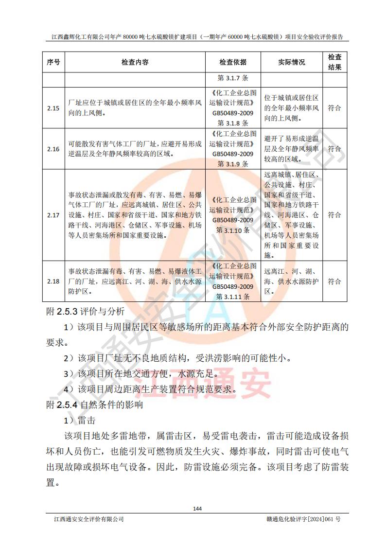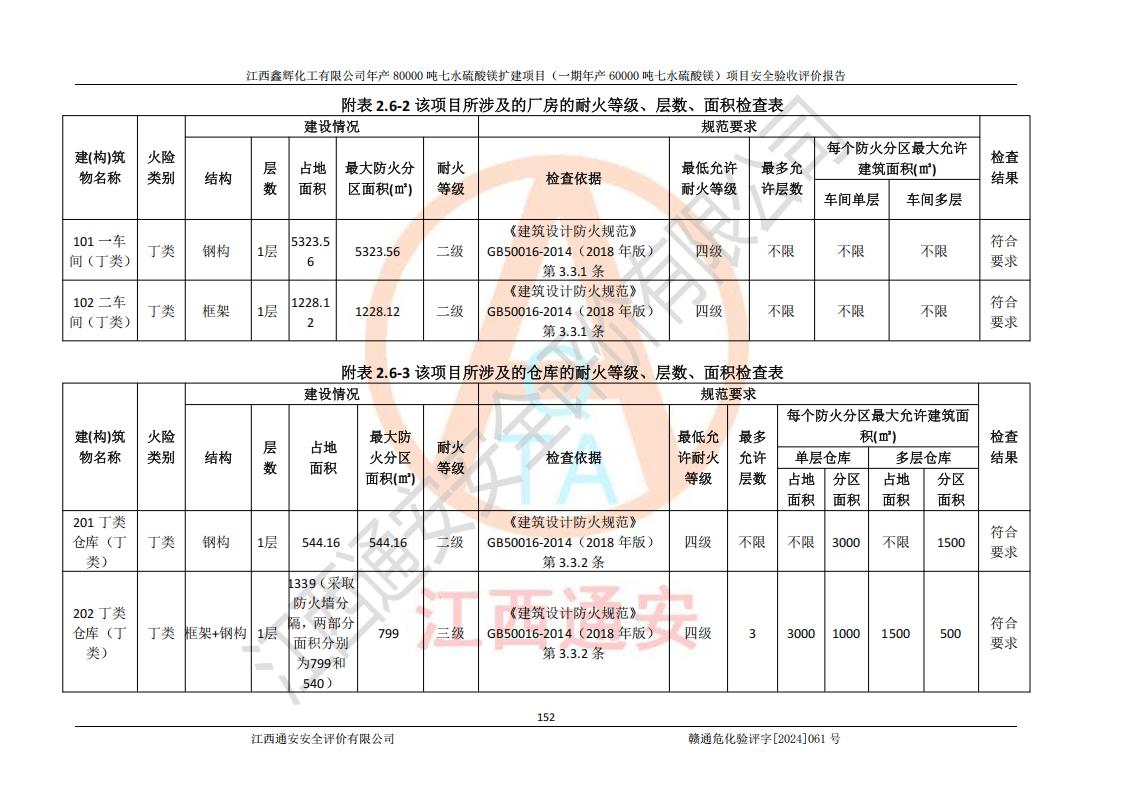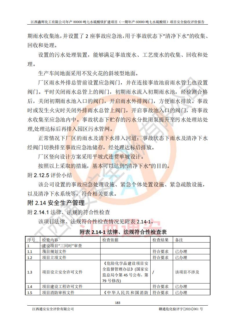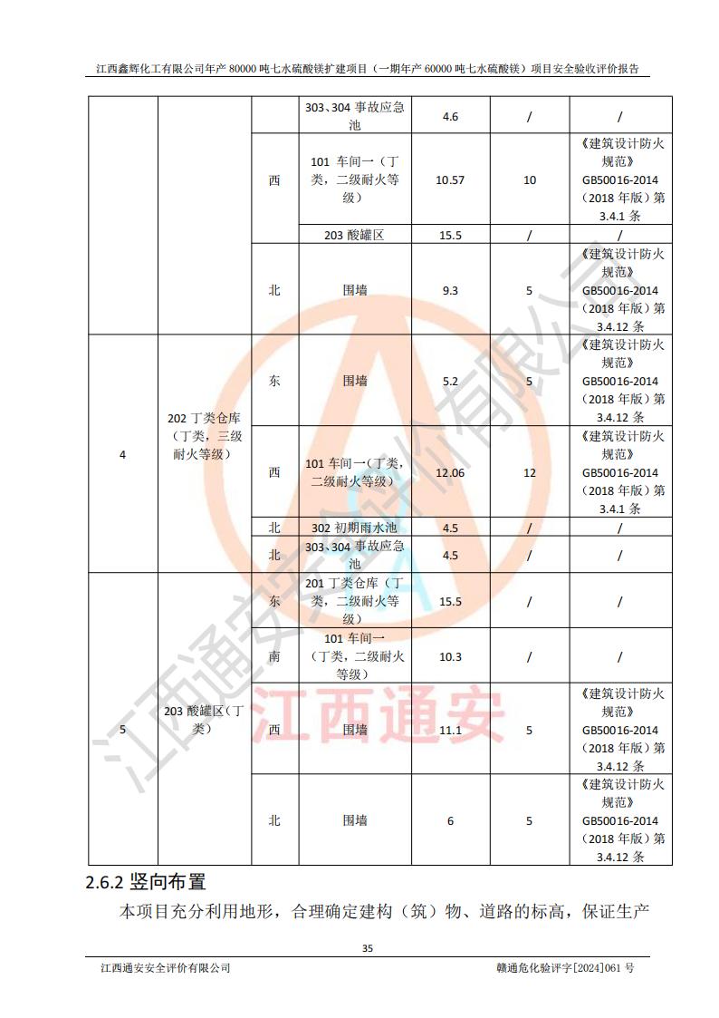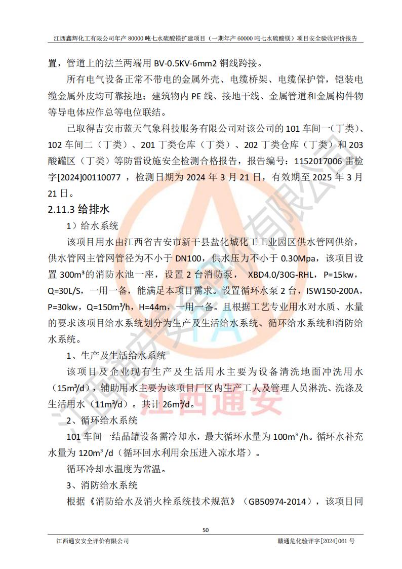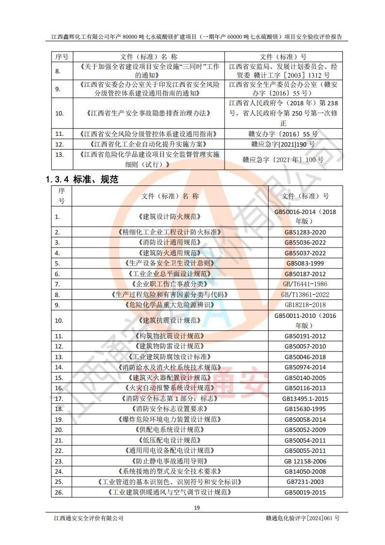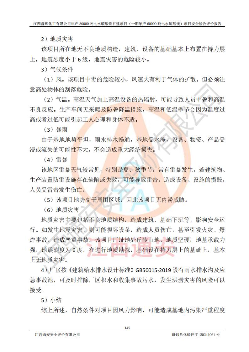評價結論 | 1. 江西鑫輝化工有限公司年產(chǎn)80000噸七水硫酸鎂擴建項目(一期年產(chǎn)60000噸七水硫酸鎂)項目的安全設施與主體工程同時設計、同時施工、同時投入生產(chǎn)和使用,符合**有關建設項目“三同時”的規(guī)定和要求。 2. 江西鑫輝化工有限公司年產(chǎn)80000噸七水硫酸鎂擴建項目(一期年產(chǎn)60000噸七水硫酸鎂)符合新干縣鹽化工業(yè)城發(fā)展規(guī)劃的布局; 3. 該項目現(xiàn)場情況、企業(yè)總平面布置、設備設施的布置與設計圖、竣工圖紙一致,主體工程安全設施、安全措施符合法律法規(guī)的規(guī)定和要求,安全設施正常投用并運行**;供配電、給排水等公用工程及輔助設施滿足主體工程生產(chǎn)安全的需要;企業(yè)安全管理體系滿足生產(chǎn)安全的要求; 4. 總平面布置符合《建筑設計防火規(guī)范》GB50016-2014(2018年版)、《精細化工企業(yè)工程設計防火標準》GB51283-2020等標準、規(guī)范的要求; 5. 公司已針對本報告提出的安全隱患整改意見組織人員進行整改,整改措施已落實到位,企業(yè)安全生產(chǎn)的風險控制在可以接受的范圍內(nèi); 6. 該項目采用成熟的生產(chǎn)工藝和設備,本質(zhì)安全程度較高。 7. 綜上所述:本報告認為,江西鑫輝化工有限公司年產(chǎn)80000噸七水硫酸鎂擴建項目(一期年產(chǎn)60000噸七水硫酸鎂)項目的生產(chǎn)裝置現(xiàn)場情況與設計圖紙一致,安全設施及安全管理符合**及有關部門關于安全生產(chǎn)法律、法規(guī)、標準的要求,安全風險是受控制的,其風險程度是可以接受的,符合安全生產(chǎn)條件,能夠滿足安全生產(chǎn)的要求,具備安全設施“三同時”驗收條件。 | |||