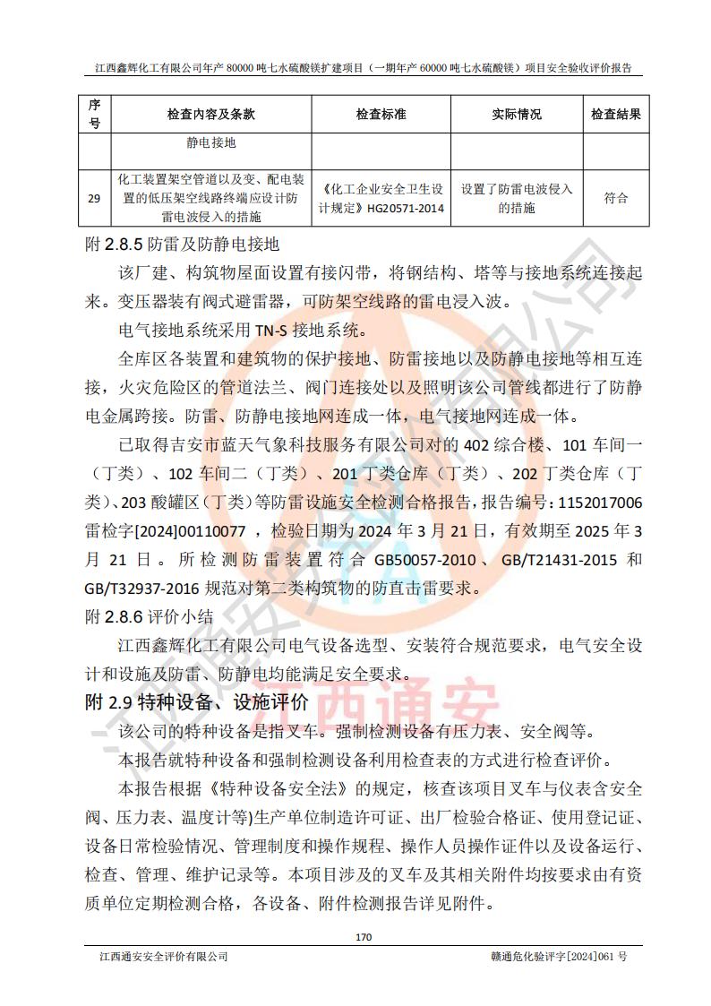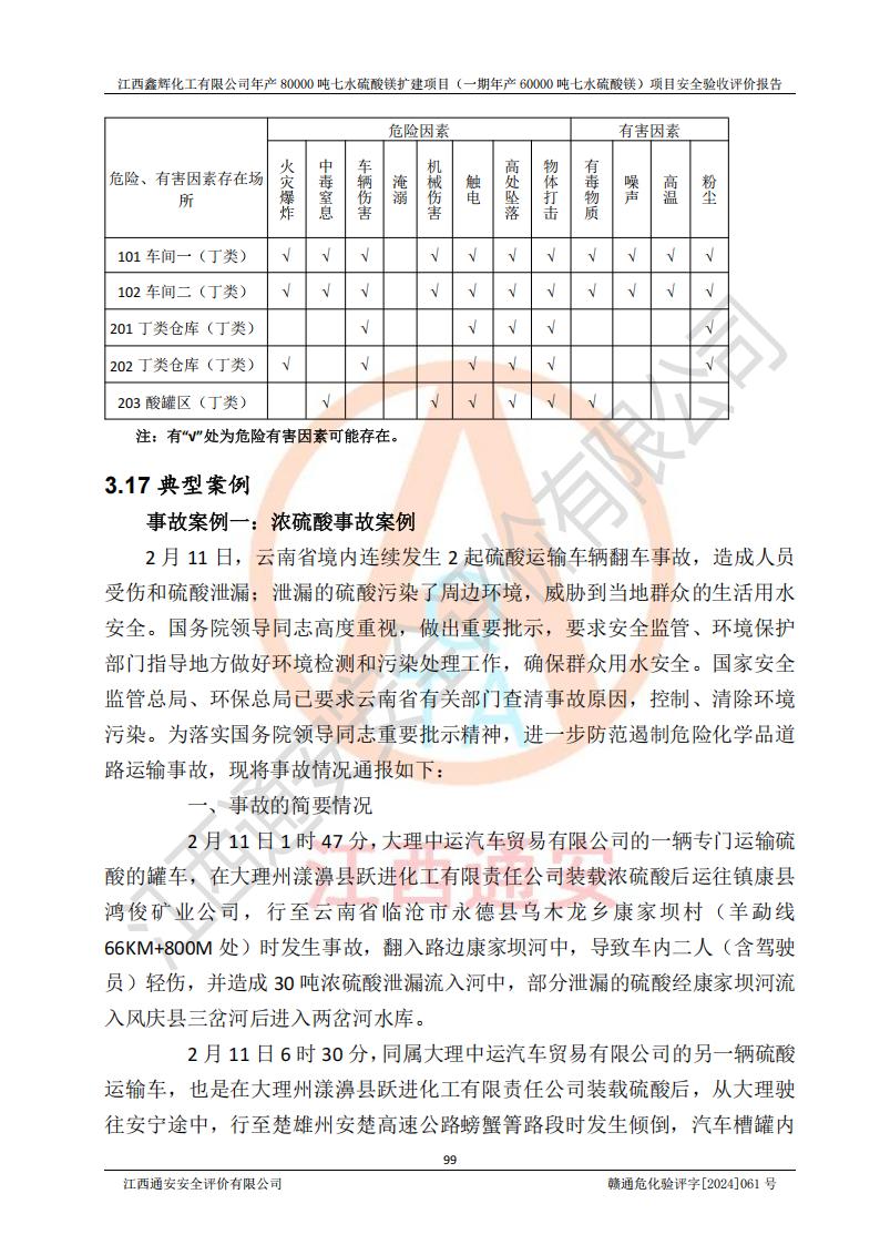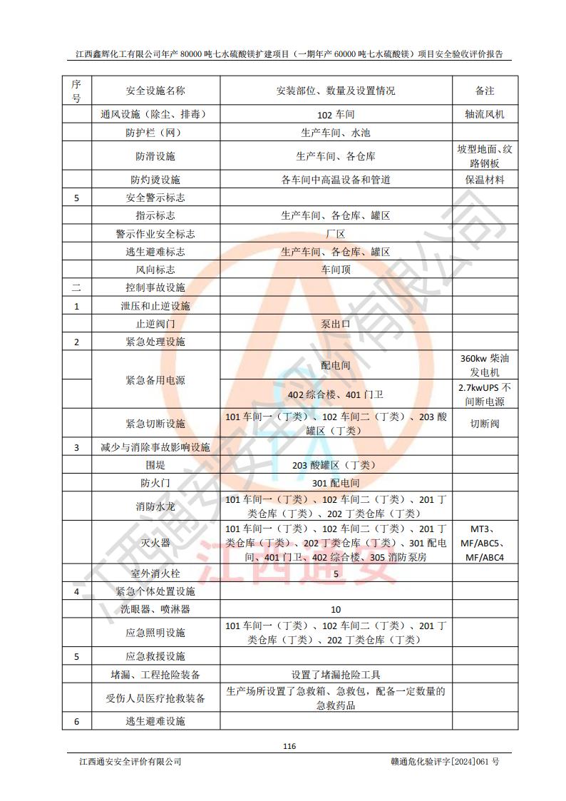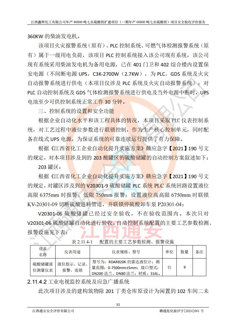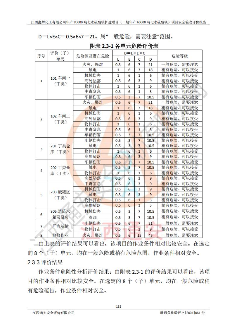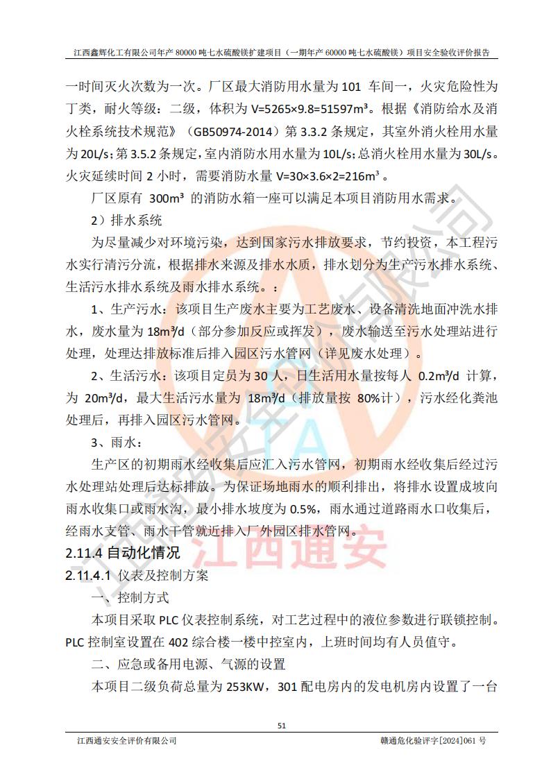 評價結論 | 1. 江西鑫輝化工有限公司年產(chǎn)80000噸七水硫酸鎂擴建項目(一期年產(chǎn)60000噸七水硫酸鎂)項目的安全設施與主體工程同時設計、同時施工、同時投入生產(chǎn)和使用,符合**有關建設項目“三同時”的規(guī)定和要求。 2. 江西鑫輝化工有限公司年產(chǎn)80000噸七水硫酸鎂擴建項目(一期年產(chǎn)60000噸七水硫酸鎂)符合新干縣鹽化工業(yè)城發(fā)展規(guī)劃的布局; 3. 該項目現(xiàn)場情況、企業(yè)總平面布置、設備設施的布置與設計圖、竣工圖紙一致,主體工程安全設施、安全措施符合法律法規(guī)的規(guī)定和要求,安全設施正常投用并運行**;供配電、給排水等公用工程及輔助設施滿足主體工程生產(chǎn)安全的需要;企業(yè)安全管理體系滿足生產(chǎn)安全的要求; 4. 總平面布置符合《建筑設計防火規(guī)范》GB50016-2014(2018年版)、《精細化工企業(yè)工程設計防火標準》GB51283-2020等標準、規(guī)范的要求; 5. 公司已針對本報告提出的安全隱患整改意見組織人員進行整改,整改措施已落實到位,企業(yè)安全生產(chǎn)的風險控制在可以接受的范圍內(nèi); 6. 該項目采用成熟的生產(chǎn)工藝和設備,本質(zhì)安全程度較高。 7. 綜上所述:本報告認為,江西鑫輝化工有限公司年產(chǎn)80000噸七水硫酸鎂擴建項目(一期年產(chǎn)60000噸七水硫酸鎂)項目的生產(chǎn)裝置現(xiàn)場情況與設計圖紙一致,安全設施及安全管理符合**及有關部門關于安全生產(chǎn)法律、法規(guī)、標準的要求,安全風險是受控制的,其風險程度是可以接受的,符合安全生產(chǎn)條件,能夠滿足安全生產(chǎn)的要求,具備安全設施“三同時”驗收條件。 | |||