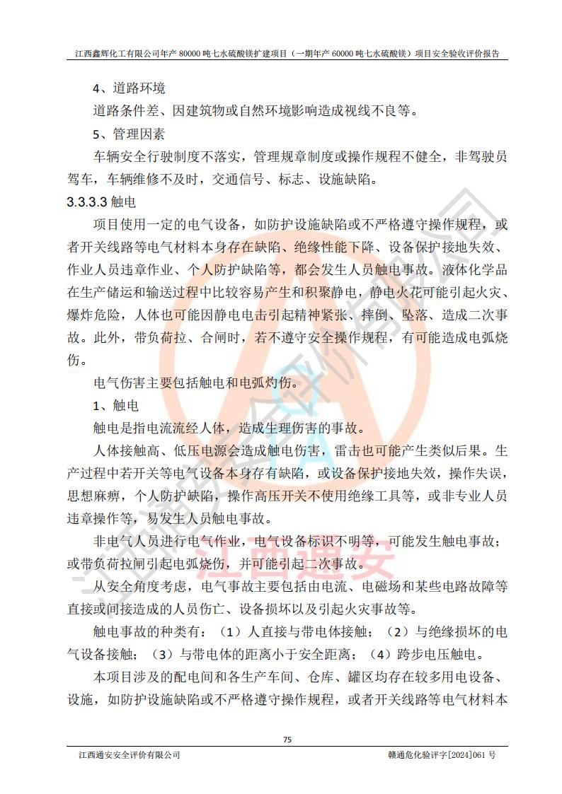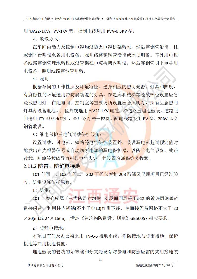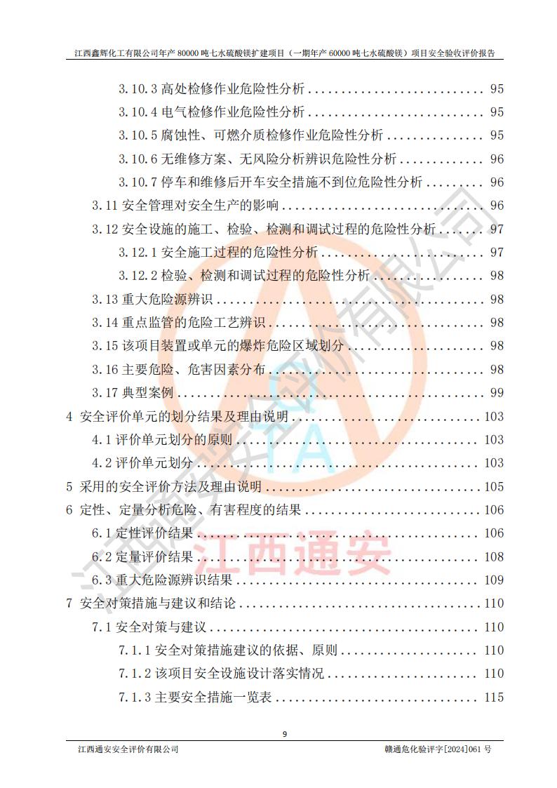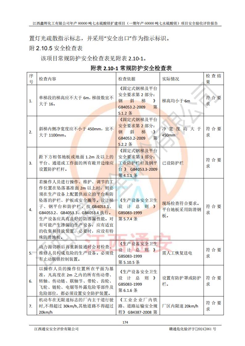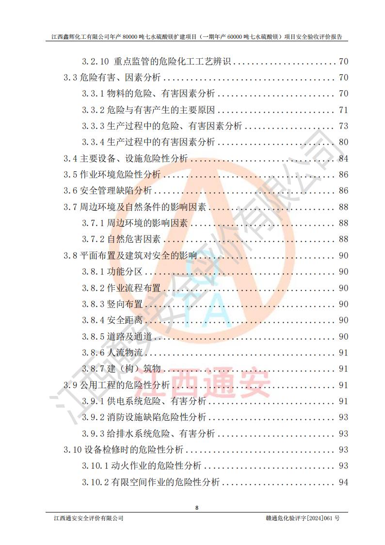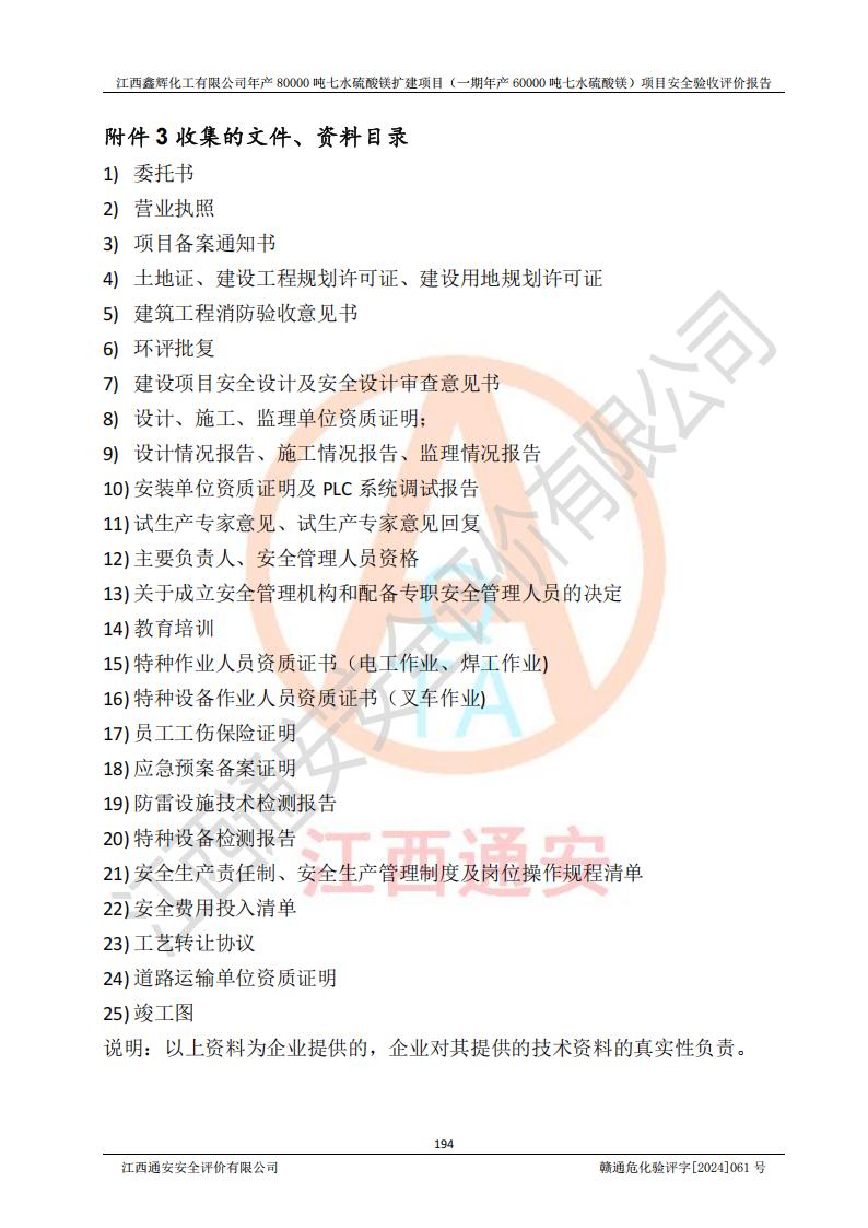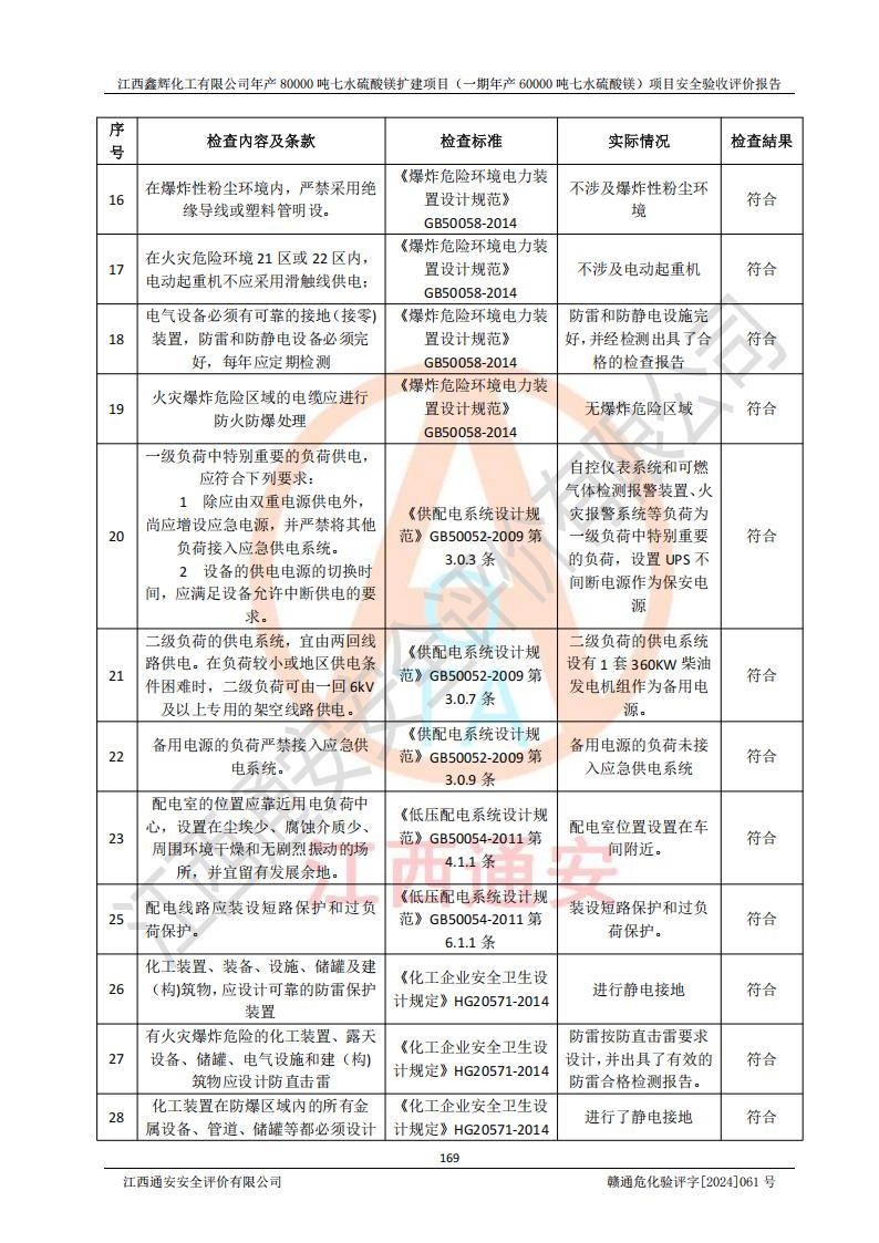 評價結論 | 1. 江西鑫輝化工有限公司年產(chǎn)80000噸七水硫酸鎂擴建項目(一期年產(chǎn)60000噸七水硫酸鎂)項目的安全設施與主體工程同時設計、同時施工、同時投入生產(chǎn)和使用,符合**有關建設項目“三同時”的規(guī)定和要求。 2. 江西鑫輝化工有限公司年產(chǎn)80000噸七水硫酸鎂擴建項目(一期年產(chǎn)60000噸七水硫酸鎂)符合新干縣鹽化工業(yè)城發(fā)展規(guī)劃的布局; 3. 該項目現(xiàn)場情況、企業(yè)總平面布置、設備設施的布置與設計圖、竣工圖紙一致,主體工程安全設施、安全措施符合法律法規(guī)的規(guī)定和要求,安全設施正常投用并運行**;供配電、給排水等公用工程及輔助設施滿足主體工程生產(chǎn)安全的需要;企業(yè)安全管理體系滿足生產(chǎn)安全的要求; 4. 總平面布置符合《建筑設計防火規(guī)范》GB50016-2014(2018年版)、《精細化工企業(yè)工程設計防火標準》GB51283-2020等標準、規(guī)范的要求; 5. 公司已針對本報告提出的安全隱患整改意見組織人員進行整改,整改措施已落實到位,企業(yè)安全生產(chǎn)的風險控制在可以接受的范圍內(nèi); 6. 該項目采用成熟的生產(chǎn)工藝和設備,本質(zhì)安全程度較高。 7. 綜上所述:本報告認為,江西鑫輝化工有限公司年產(chǎn)80000噸七水硫酸鎂擴建項目(一期年產(chǎn)60000噸七水硫酸鎂)項目的生產(chǎn)裝置現(xiàn)場情況與設計圖紙一致,安全設施及安全管理符合**及有關部門關于安全生產(chǎn)法律、法規(guī)、標準的要求,安全風險是受控制的,其風險程度是可以接受的,符合安全生產(chǎn)條件,能夠滿足安全生產(chǎn)的要求,具備安全設施“三同時”驗收條件。 | |||