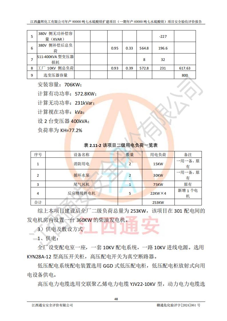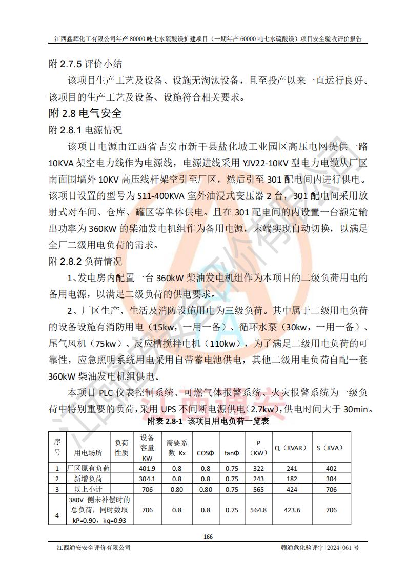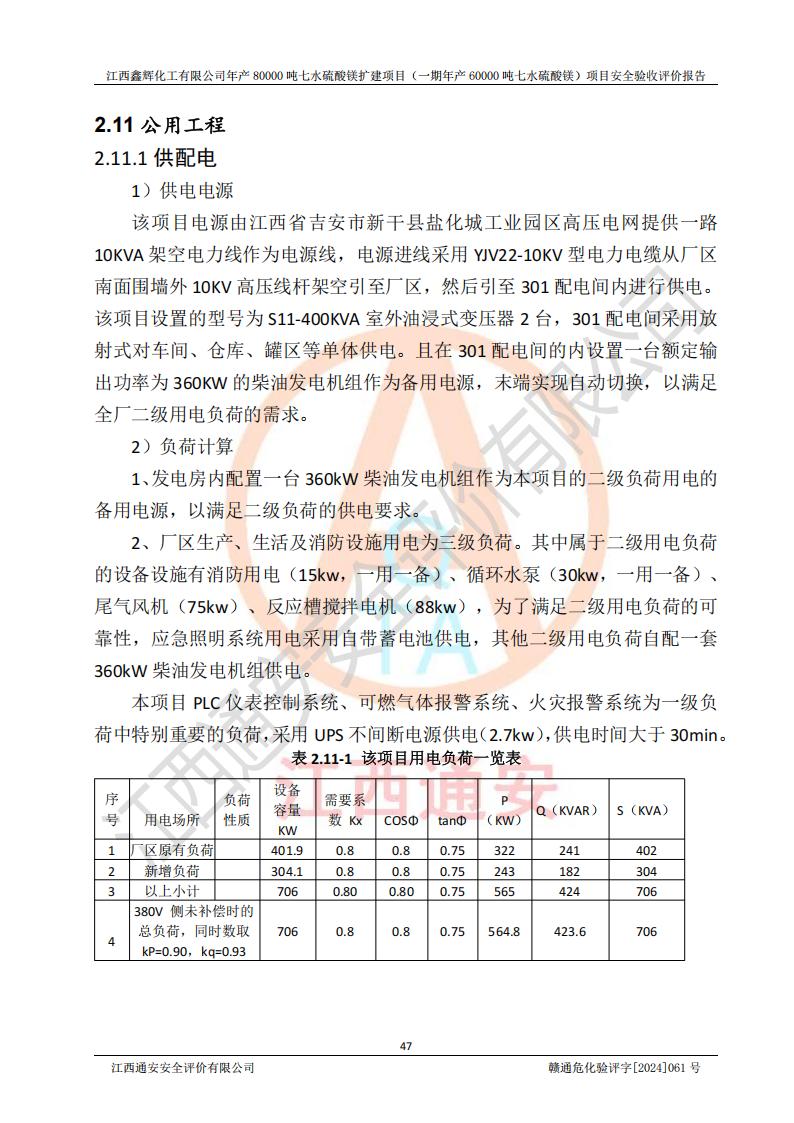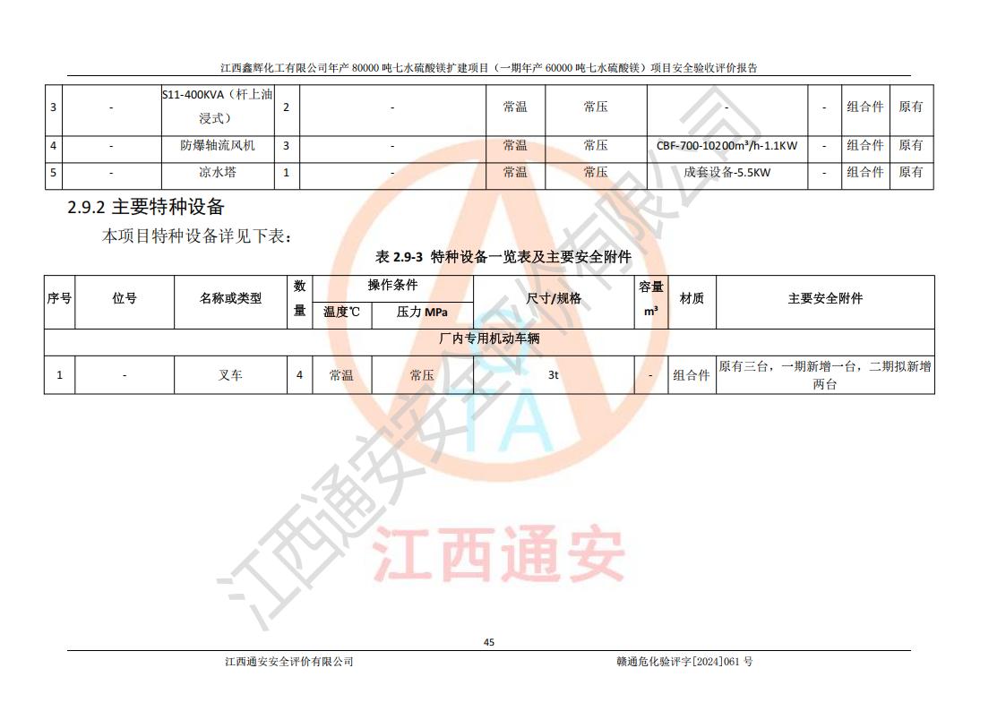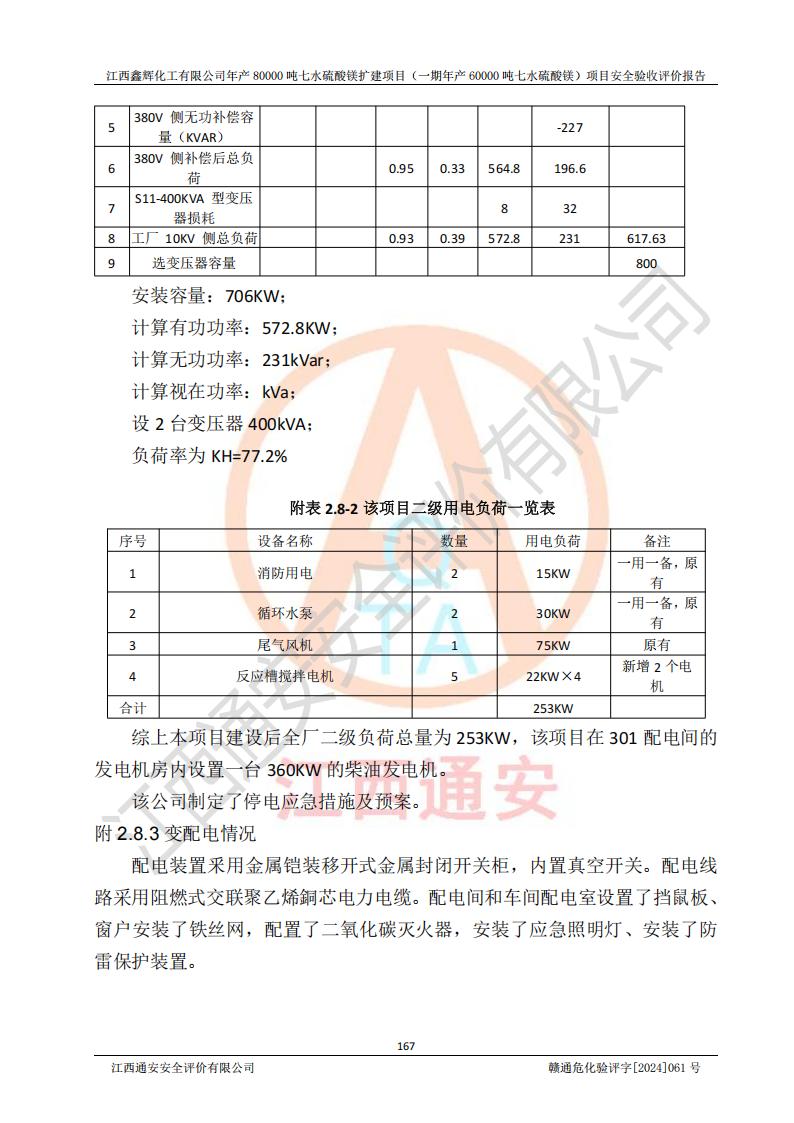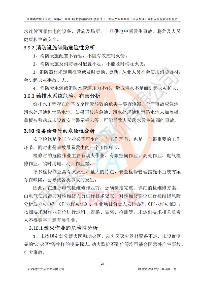 評價結論 | 1. 江西鑫輝化工有限公司年產(chǎn)80000噸七水硫酸鎂擴建項目(一期年產(chǎn)60000噸七水硫酸鎂)項目的安全設施與主體工程同時設計、同時施工、同時投入生產(chǎn)和使用,符合**有關建設項目“三同時”的規(guī)定和要求。 2. 江西鑫輝化工有限公司年產(chǎn)80000噸七水硫酸鎂擴建項目(一期年產(chǎn)60000噸七水硫酸鎂)符合新干縣鹽化工業(yè)城發(fā)展規(guī)劃的布局; 3. 該項目現(xiàn)場情況、企業(yè)總平面布置、設備設施的布置與設計圖、竣工圖紙一致,主體工程安全設施、安全措施符合法律法規(guī)的規(guī)定和要求,安全設施正常投用并運行**;供配電、給排水等公用工程及輔助設施滿足主體工程生產(chǎn)安全的需要;企業(yè)安全管理體系滿足生產(chǎn)安全的要求; 4. 總平面布置符合《建筑設計防火規(guī)范》GB50016-2014(2018年版)、《精細化工企業(yè)工程設計防火標準》GB51283-2020等標準、規(guī)范的要求; 5. 公司已針對本報告提出的安全隱患整改意見組織人員進行整改,整改措施已落實到位,企業(yè)安全生產(chǎn)的風險控制在可以接受的范圍內(nèi); 6. 該項目采用成熟的生產(chǎn)工藝和設備,本質(zhì)安全程度較高。 7. 綜上所述:本報告認為,江西鑫輝化工有限公司年產(chǎn)80000噸七水硫酸鎂擴建項目(一期年產(chǎn)60000噸七水硫酸鎂)項目的生產(chǎn)裝置現(xiàn)場情況與設計圖紙一致,安全設施及安全管理符合**及有關部門關于安全生產(chǎn)法律、法規(guī)、標準的要求,安全風險是受控制的,其風險程度是可以接受的,符合安全生產(chǎn)條件,能夠滿足安全生產(chǎn)的要求,具備安全設施“三同時”驗收條件。 | |||
