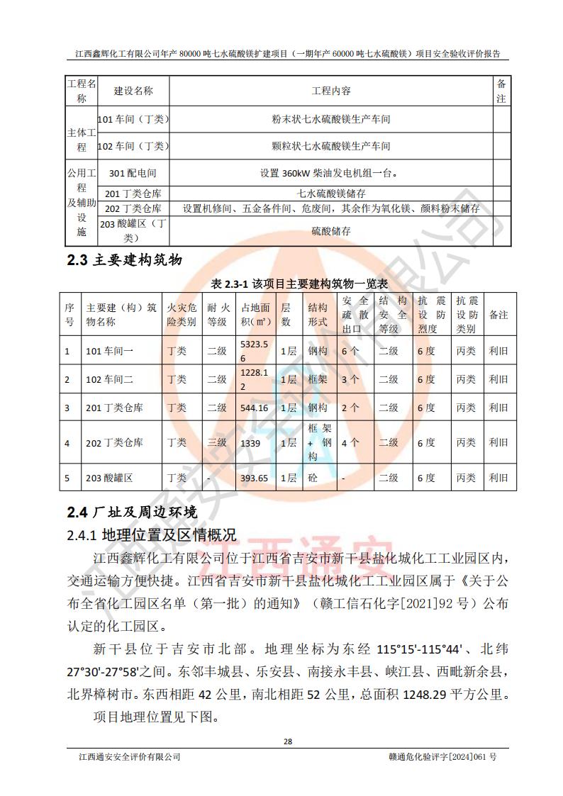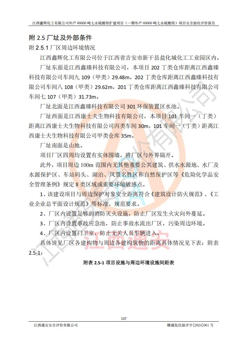 項目簡介 | 江西鑫輝化工有限公司注冊成立于2014 年10月15日,統(tǒng)一社會信用代碼:91360824309120959J,法定**人:張志剛,注冊資本 1000 萬元,地址位于江西省吉安市新干縣鹽化城。經(jīng)營范圍:化工產(chǎn)品銷售,基礎化學原料制造(含危險化學品等許可類化學品的制造)(除許可業(yè)務外,可自主依法經(jīng)營法律法規(guī)非禁止或限制項目)。 本項目在原有廠區(qū)內(nèi)擴建,擴建項目于2022 年11月22日取得新干縣發(fā)展和改革委員會頒發(fā)的江西省企業(yè)投資項目備案通知書《年產(chǎn)80000 噸七水硫酸鎂擴建項目》(統(tǒng)一項目代碼:2211-360824-04-01-296854)。該公司位于新干縣鹽化工業(yè)城。江西新干鹽化工業(yè)城屬于“關于公布**化工園區(qū)名單(**批)的通知 ”贛工信石化字[2021]92號中的化工園區(qū)。 江西鑫輝化工有限公司于2023年7月委托山東鴻運工程設計有限公司編制《江西鑫輝化工有限公司年產(chǎn)80000 噸七水硫酸鎂擴建項目安全設施設計》,并于2023年8月26日由江西鑫輝化工有限公司組織有關單位和專家對安全設施設計進行了評審。 江西鑫輝化工有限公司年年產(chǎn)80000 噸七水硫酸鎂擴建項目分兩期建設,一期主要建設年產(chǎn)60000噸七水硫酸鎂生產(chǎn)線,二期建設內(nèi)容為年產(chǎn)20000噸七水硫酸鎂生產(chǎn)線。本次評價僅對江西鑫輝化工有限公司一期年產(chǎn)60000噸七水硫酸鎂得生產(chǎn)線進行安全驗收評價。 | |||