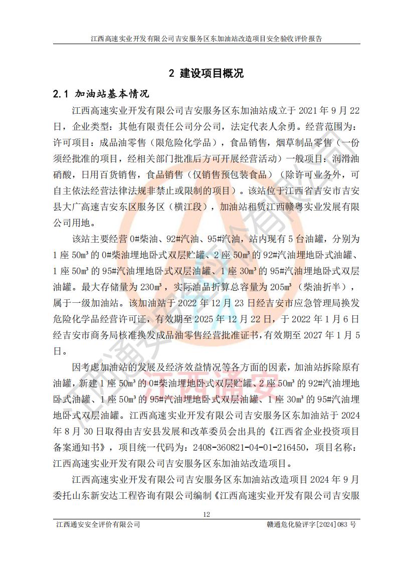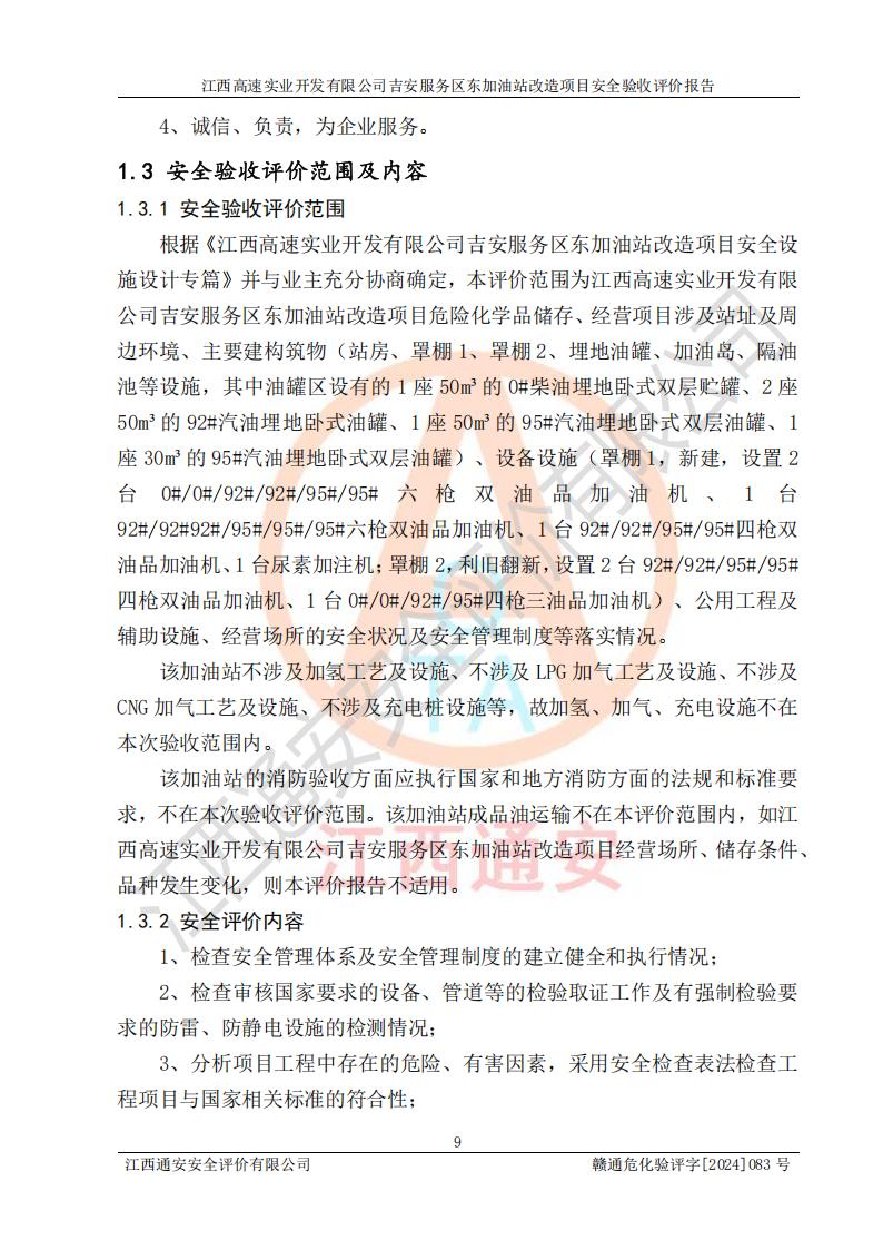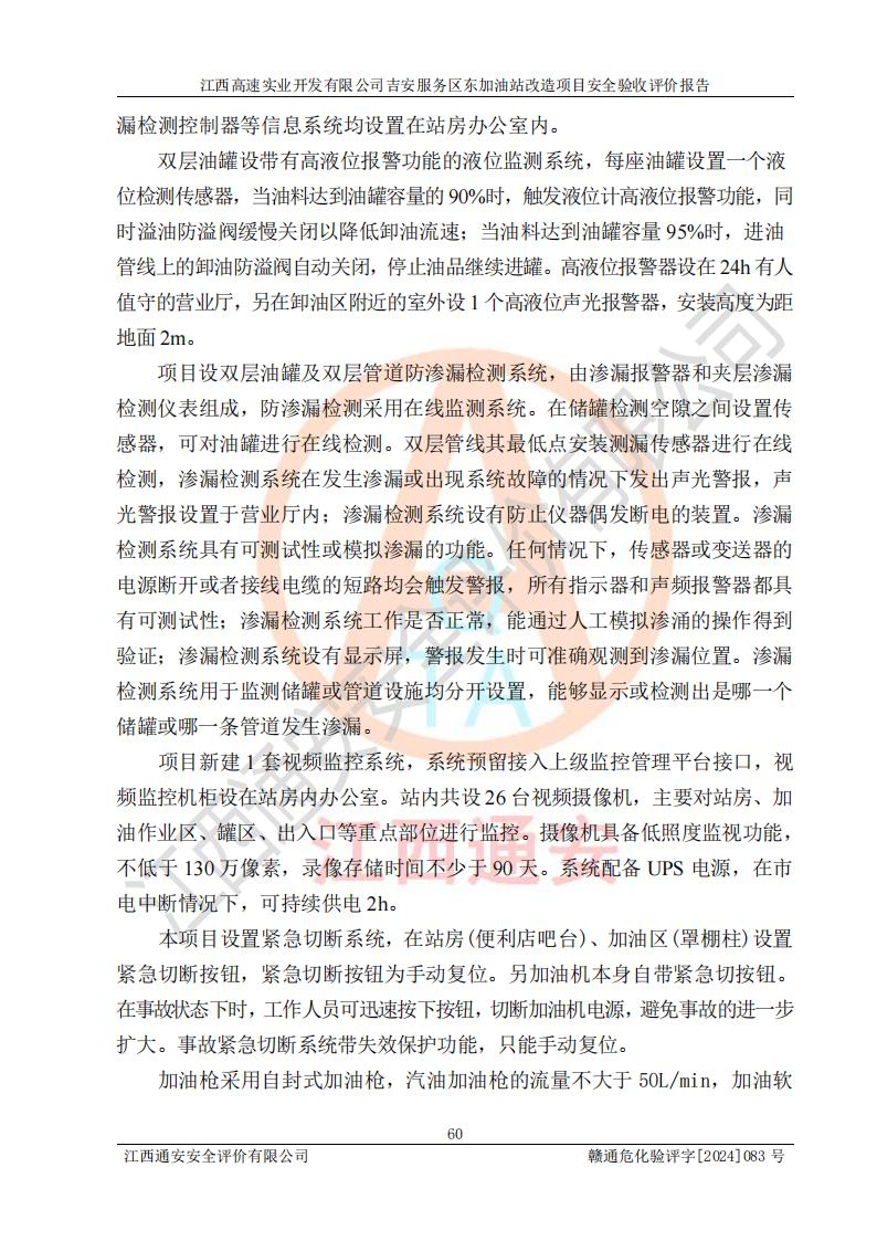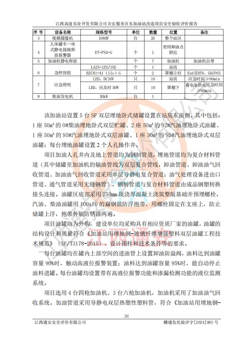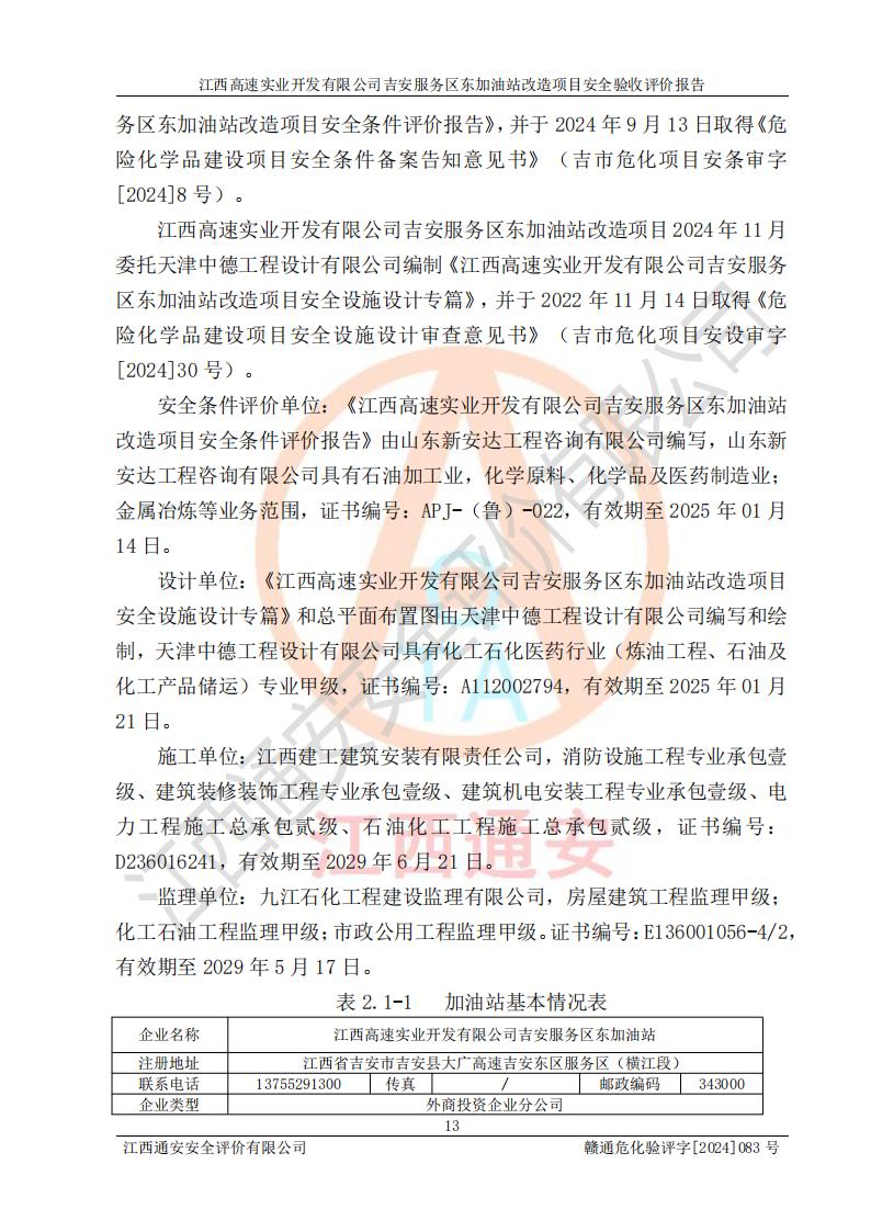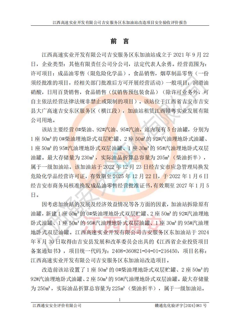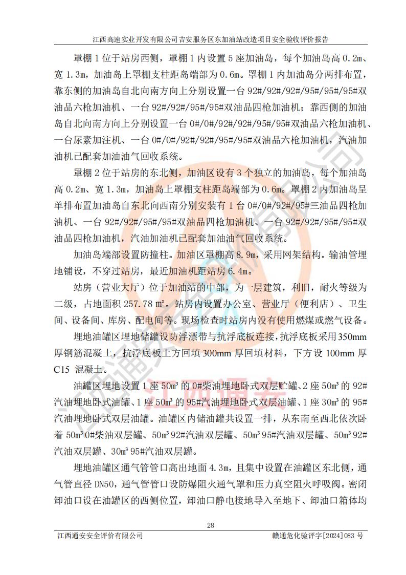 評(píng)價(jià)報(bào)告名稱(chēng) | 江西高速實(shí)業(yè)開(kāi)發(fā)有限公司吉安服務(wù)區(qū)東加油站改造項(xiàng)目安全驗(yàn)收狀評(píng)價(jià)報(bào)告 | |||