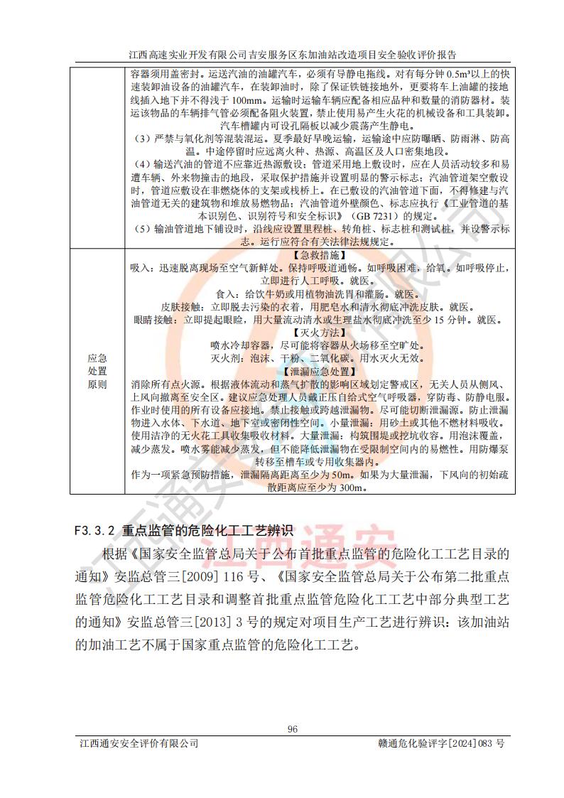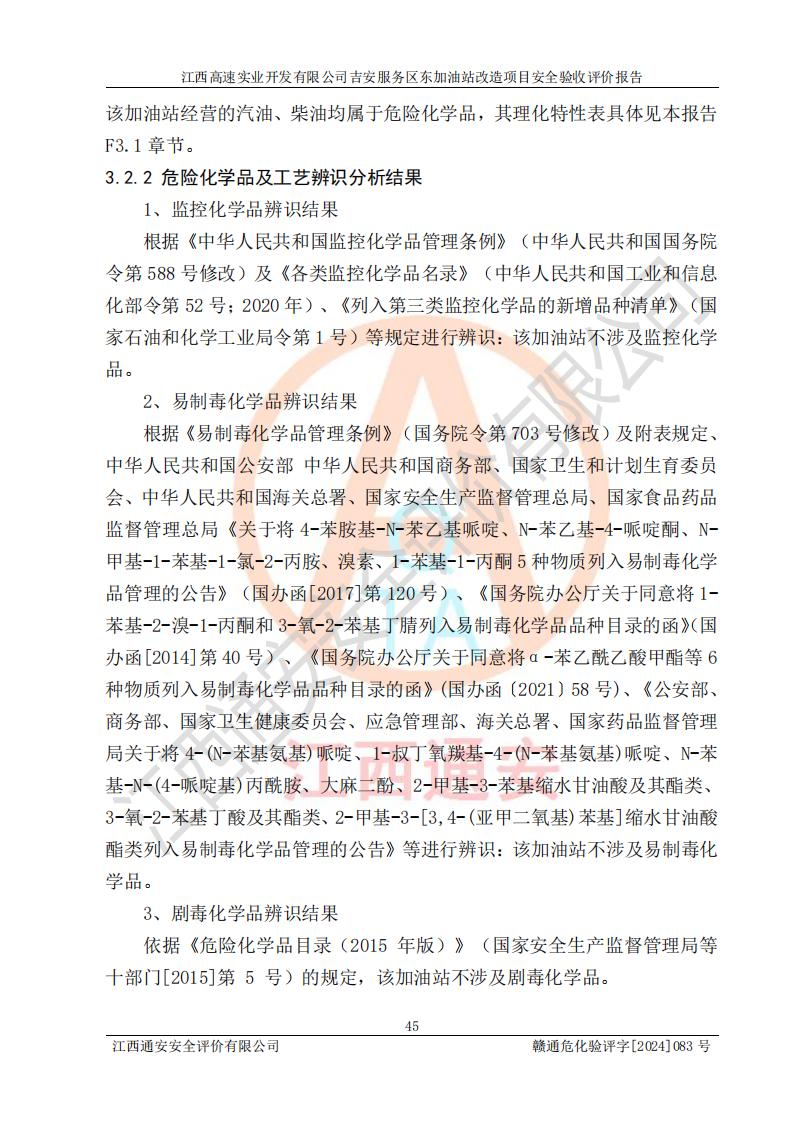 項(xiàng)目簡(jiǎn)介 | 江西高速實(shí)業(yè)開(kāi)發(fā)有限公司吉安服務(wù)區(qū)東加油站成立于2021年9月22日,企業(yè)類(lèi)型:其他有限責(zé)任公司分公司,法定**人余勇。 江西高速實(shí)業(yè)開(kāi)發(fā)有限公司吉安服務(wù)區(qū)東加油站2024年8月30日取得由吉安縣發(fā)展和改革委員會(huì)出具的《江西省企業(yè)投資項(xiàng)目備案通知書(shū)》,項(xiàng)目統(tǒng)一代碼為:2408-360821-04-01-216450,項(xiàng)目名稱(chēng):江西高速實(shí)業(yè)開(kāi)發(fā)有限公司吉安服務(wù)區(qū)東加油站改造項(xiàng)目。 江西高速實(shí)業(yè)開(kāi)發(fā)有限公司吉安服務(wù)區(qū)東加油站位于江西省吉安市吉安縣大廣高速吉安東區(qū)服務(wù)區(qū)(橫江段),加油站租賃江西贛粵實(shí)業(yè)發(fā)展有限公司用地。該加油站設(shè)有的1座503的0#柴油埋地臥式雙層貯罐、2座50m3的92#汽油埋地臥式油罐、1座50m3的95#汽油埋地臥式雙層油罐、1座30m3的95#汽油埋地臥式雙層油罐;*大存儲(chǔ)量為230m3,實(shí)際油品折算總?cè)萘繛?05m3(柴油折半),屬于**加油站。 江西高速實(shí)業(yè)開(kāi)發(fā)有限公司吉安服務(wù)區(qū)東加油站改造項(xiàng)目2024年9月委托山東新安達(dá)工程咨詢(xún)有限公司編制《江西高速實(shí)業(yè)開(kāi)發(fā)有限公司吉安服務(wù)區(qū)東加油站改造項(xiàng)目安全條件評(píng)價(jià)報(bào)告》,并于2024年9月13日取得《危險(xiǎn)化學(xué)品建設(shè)項(xiàng)目安全條件備案告知意見(jiàn)書(shū)》(吉市?;?xiàng)目安條審字[2024]8號(hào))。 江西高速實(shí)業(yè)開(kāi)發(fā)有限公司吉安服務(wù)區(qū)東加油站改造項(xiàng)目2024年11月委托天津中德工程設(shè)計(jì)有限公司編制《江西高速實(shí)業(yè)開(kāi)發(fā)有限公司吉安服務(wù)區(qū)東加油站改造項(xiàng)目安全設(shè)施設(shè)計(jì)專(zhuān)篇》,并于2022年11月14日取得《危險(xiǎn)化學(xué)品建設(shè)項(xiàng)目安全設(shè)施設(shè)計(jì)審查意見(jiàn)書(shū)》(吉市?;?xiàng)目安設(shè)審字[2024]30號(hào))。 項(xiàng)目生產(chǎn)過(guò)程中涉及的危險(xiǎn)化學(xué)品有:汽油、柴油等。 項(xiàng)目各生產(chǎn)和儲(chǔ)存單元均未構(gòu)成危險(xiǎn)化學(xué)品重大危險(xiǎn)源。 | |||
