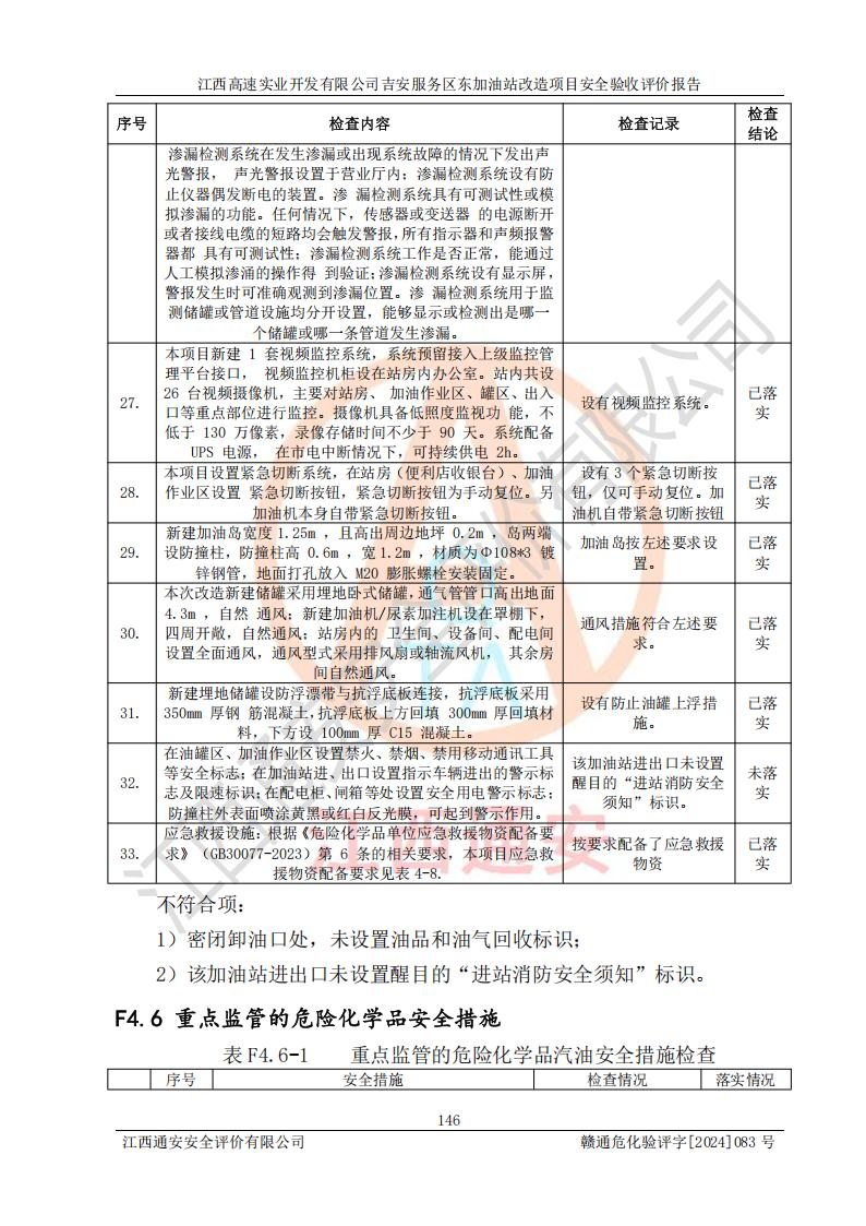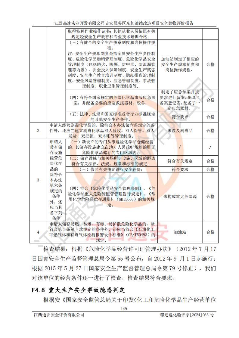 評(píng)價(jià)結(jié)論 | 江西高速實(shí)業(yè)開(kāi)發(fā)有限公司吉安服務(wù)區(qū)東加油站改造項(xiàng)目現(xiàn)場(chǎng)布置與設(shè)計(jì)圖紙一致,有關(guān)從業(yè)人員資質(zhì)符合《江西省危險(xiǎn)化學(xué)品安全專(zhuān)項(xiàng)整治三年行動(dòng)實(shí)施方案》要求,具備**有關(guān)安全生產(chǎn)法律、法規(guī)、部門(mén)規(guī)章及標(biāo)準(zhǔn)規(guī)范要求的安全條件,符合經(jīng)營(yíng)和儲(chǔ)存危險(xiǎn)化學(xué)品的安全條件要求,具備安全驗(yàn)收的要求。 | |||