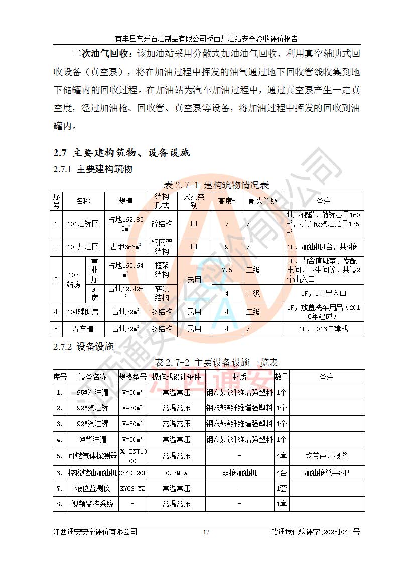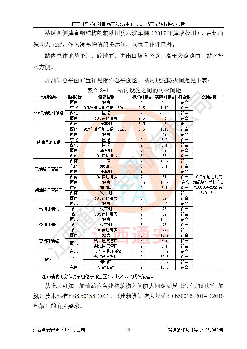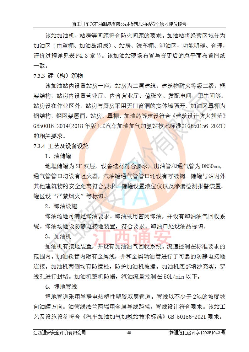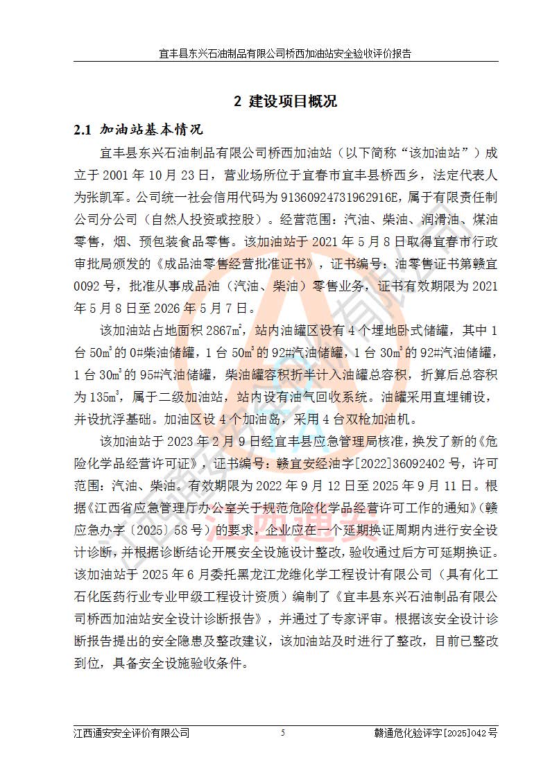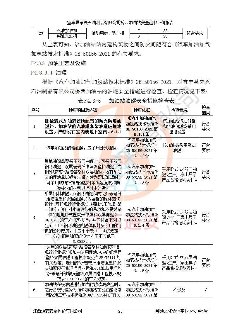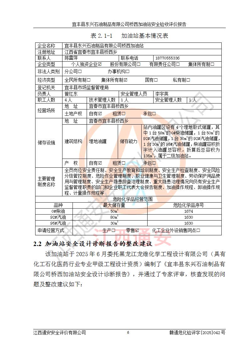 項目簡介 | 宜豐縣東興石油制品有限公司橋西加油站(以下簡稱“該加油站”)成立于2001年10月23日,營業(yè)場所位于宜春市宜豐縣橋西鄉(xiāng),法定**人為張凱軍。該加油站統(tǒng)一社會信用代碼為91360924731962916E,屬于有限責任制公司分公司(自然人投資或控股)。經(jīng)營范圍:汽油、柴油、潤滑油、煤油零售,煙、預(yù)包裝食品零售。 該加油站油罐區(qū)設(shè)有4個埋地臥式儲罐,其中1臺50m3的0#柴油儲罐,1臺50m3的92#汽油儲罐,1臺30m3的92#汽油儲罐,1臺30m3的95#汽油儲罐,柴油罐容積折半計入油罐總?cè)莘e,折算后總?cè)莘e為135m3,屬于二級加油站,站內(nèi)設(shè)有油氣回收系統(tǒng)。油罐采用直埋鋪設(shè),并設(shè)抗浮基礎(chǔ)。加油區(qū)設(shè)4個加油島,采用4臺雙槍加油機。該加油站于2023年2月9日經(jīng)宜豐縣應(yīng)急管理局核準,換發(fā)了新的《危險化學品經(jīng)營許可證》,證書編號:贛宜安經(jīng)油字[2022]36092402號,許可范圍:汽油、柴油。**期限為2022年9月12日至2025年9月11日。 根據(jù)《危險化學品安全管理條例》(經(jīng)***令第344號發(fā)布,***令第591號、***令第645號修改),《危險化學品經(jīng)營許可證管理辦法》(2012年7月17日**安全生產(chǎn)監(jiān)督管理總局令第55號公布,自2012年9月1日起施行;根據(jù)2015年5月27日**安全生產(chǎn)監(jiān)督管理總局令第79號修正)等法律法規(guī)及文件要求,該加油站的危險化學品經(jīng)營許可證三年**期即將到期,需要重新進行安全現(xiàn)狀評價。由于該加油站2013年建成投運,安全設(shè)施“三同時”資料不全,根據(jù)《江西省應(yīng)急管理廳辦公室關(guān)于規(guī)范危險化學品經(jīng)營許可工作的通知》(贛應(yīng)急辦字〔2025〕58號)等要求,危險化學品經(jīng)營企業(yè)應(yīng)在一個延期換證周期內(nèi)進行安全設(shè)計診斷,并根據(jù)診斷結(jié)論開展安全設(shè)施設(shè)計整改,驗收通過后方可延期換證。該加油站于2025年6月委托黑龍江龍維化學工程設(shè)計有限公司(具有化工石化醫(yī)藥行業(yè)專業(yè)**工程設(shè)計資質(zhì))編制了《宜豐縣東興石油制品有限公司橋西加油站安全設(shè)計診斷報告》,并通過了專家評審。根據(jù)該安全設(shè)計診斷報告提出的安全隱患及整改建議,該加油站及時進行了整改,目前已整改到位,具備安全設(shè)施驗收條件。