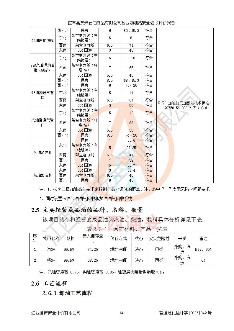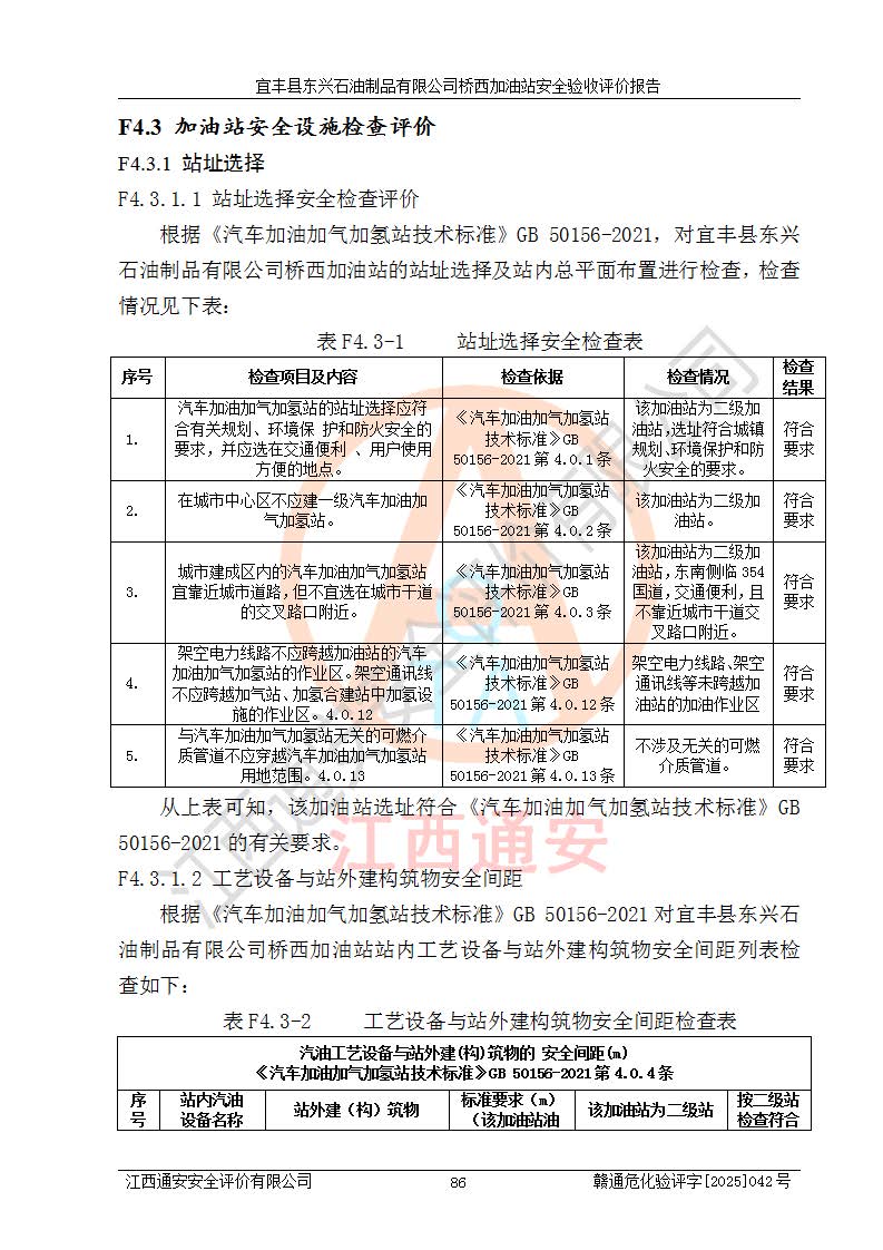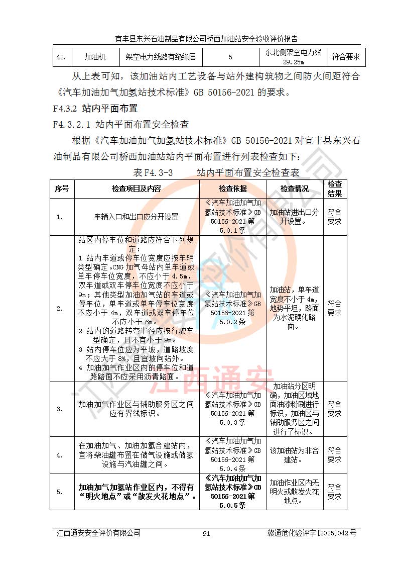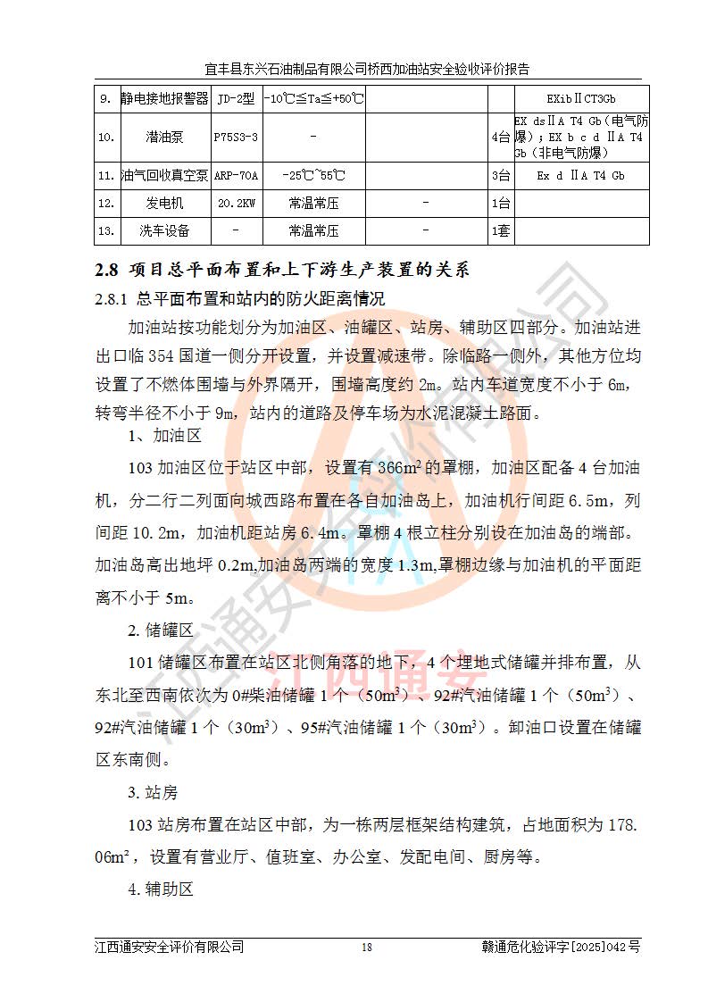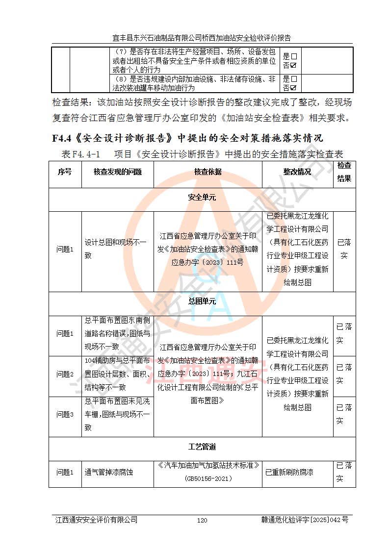 項目簡介 | 宜豐縣東興石油制品有限公司橋西加油站(以下簡稱“該加油站”)成立于2001年10月23日,營業(yè)場所位于宜春市宜豐縣橋西鄉(xiāng),法定**人為張凱軍。該加油站統(tǒng)一社會信用代碼為91360924731962916E,屬于有限責任制公司分公司(自然人投資或控股)。經(jīng)營范圍:汽油、柴油、潤滑油、煤油零售,煙、預(yù)包裝食品零售。 該加油站油罐區(qū)設(shè)有4個埋地臥式儲罐,其中1臺50m3的0#柴油儲罐,1臺50m3的92#汽油儲罐,1臺30m3的92#汽油儲罐,1臺30m3的95#汽油儲罐,柴油罐容積折半計入油罐總?cè)莘e,折算后總?cè)莘e為135m3,屬于二級加油站,站內(nèi)設(shè)有油氣回收系統(tǒng)。油罐采用直埋鋪設(shè),并設(shè)抗浮基礎(chǔ)。加油區(qū)設(shè)4個加油島,采用4臺雙槍加油機。該加油站于2023年2月9日經(jīng)宜豐縣應(yīng)急管理局核準,換發(fā)了新的《危險化學品經(jīng)營許可證》,證書編號:贛宜安經(jīng)油字[2022]36092402號,許可范圍:汽油、柴油。**期限為2022年9月12日至2025年9月11日。 根據(jù)《危險化學品安全管理條例》(經(jīng)***令第344號發(fā)布,***令第591號、***令第645號修改),《危險化學品經(jīng)營許可證管理辦法》(2012年7月17日**安全生產(chǎn)監(jiān)督管理總局令第55號公布,自2012年9月1日起施行;根據(jù)2015年5月27日**安全生產(chǎn)監(jiān)督管理總局令第79號修正)等法律法規(guī)及文件要求,該加油站的危險化學品經(jīng)營許可證三年**期即將到期,需要重新進行安全現(xiàn)狀評價。由于該加油站2013年建成投運,安全設(shè)施“三同時”資料不全,根據(jù)《江西省應(yīng)急管理廳辦公室關(guān)于規(guī)范危險化學品經(jīng)營許可工作的通知》(贛應(yīng)急辦字〔2025〕58號)等要求,危險化學品經(jīng)營企業(yè)應(yīng)在一個延期換證周期內(nèi)進行安全設(shè)計診斷,并根據(jù)診斷結(jié)論開展安全設(shè)施設(shè)計整改,驗收通過后方可延期換證。該加油站于2025年6月委托黑龍江龍維化學工程設(shè)計有限公司(具有化工石化醫(yī)藥行業(yè)專業(yè)**工程設(shè)計資質(zhì))編制了《宜豐縣東興石油制品有限公司橋西加油站安全設(shè)計診斷報告》,并通過了專家評審。根據(jù)該安全設(shè)計診斷報告提出的安全隱患及整改建議,該加油站及時進行了整改,目前已整改到位,具備安全設(shè)施驗收條件。