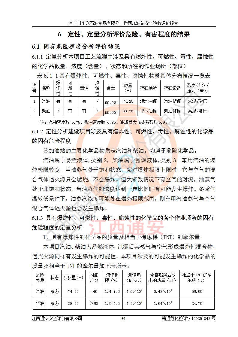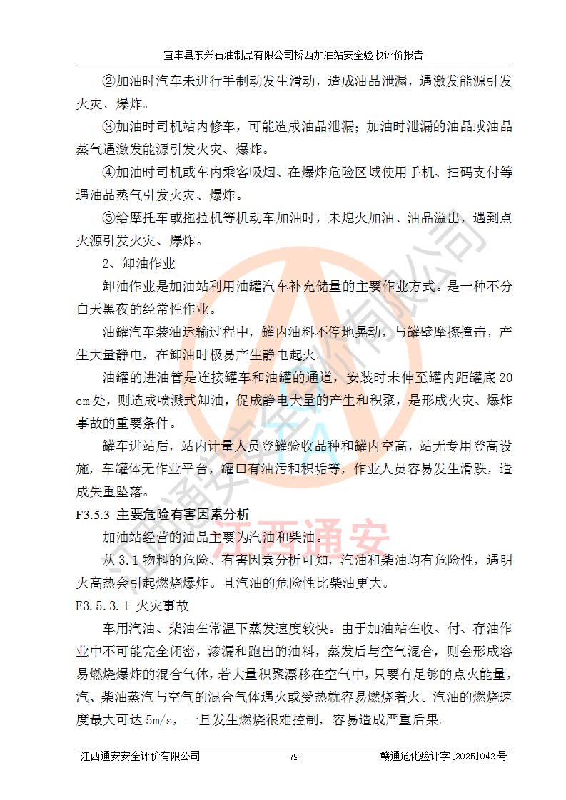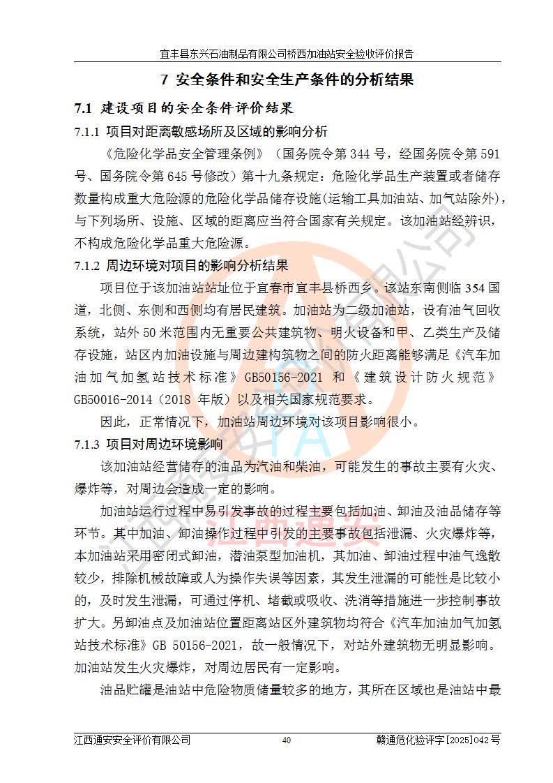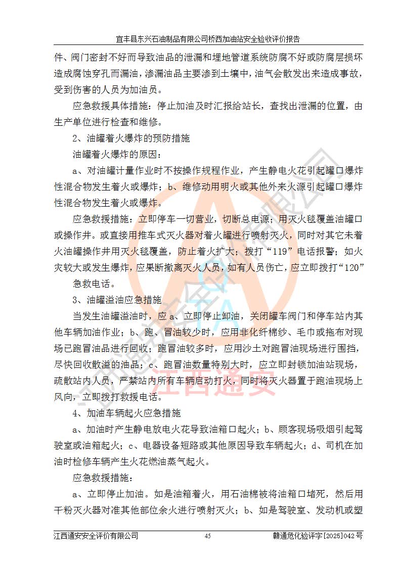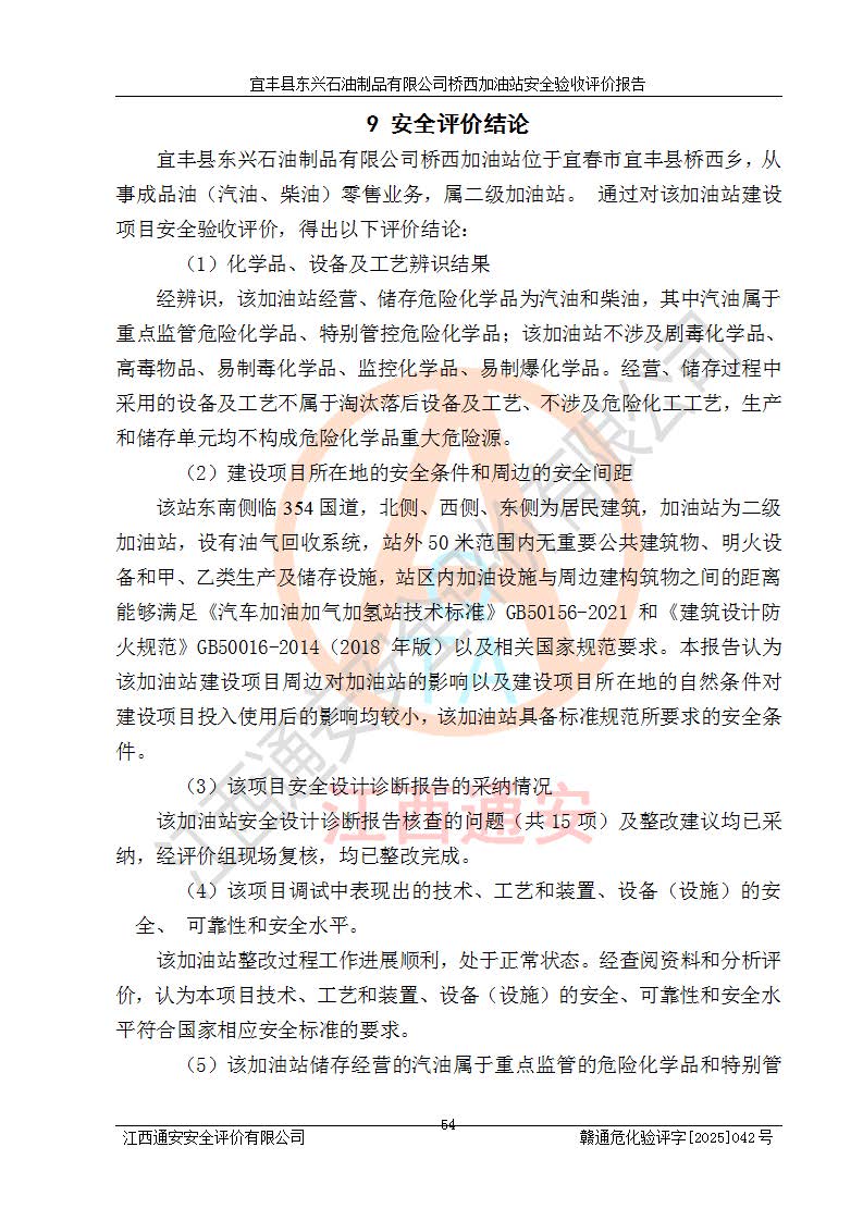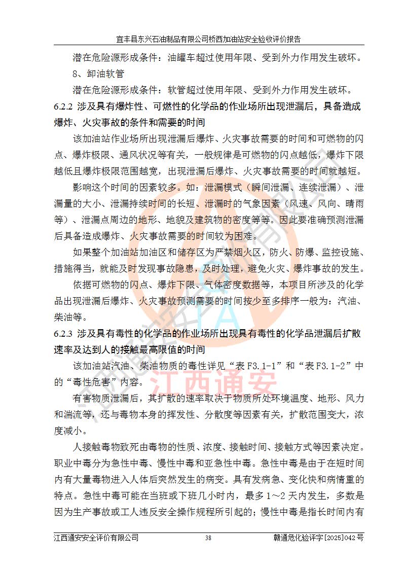 其它 | 一、安全狀況綜合評述 宜豐縣東興石油制品有限公司橋西加油站位于宜春市宜豐縣橋西鄉(xiāng),從事成品油(汽油、柴油)零售業(yè)務(wù),屬二級加油站。 通過對該加油站建設(shè)項目安全驗收評價,得出以下評價結(jié)論: 化學品、設(shè)備及工藝辨識結(jié)果 經(jīng)辨識,該加油站經(jīng)營、儲存危險化學品為汽油和柴油,其中汽油屬于重點監(jiān)管危險化學品、特別管控危險化學品;該加油站不涉及劇毒化學品、高毒物品、易制毒化學品、監(jiān)控化學品、易制爆化學品。經(jīng)營、儲存過程中采用的設(shè)備及工藝不屬于淘汰落后設(shè)備及工藝、不涉及危險化工工藝,生產(chǎn)和儲存單元均不構(gòu)成危險化學品重大危險源。 建設(shè)項目所在地的安全條件和周邊的安全間距 該站東南側(cè)臨354國道,北側(cè)、西側(cè)、東側(cè)為居民建筑,加油站為二級加油站,設(shè)有油氣回收系統(tǒng),站外50米范圍內(nèi)無重要公共建筑物、明火設(shè)備和甲、乙類生產(chǎn)及儲存設(shè)施,站區(qū)內(nèi)加油設(shè)施與周邊建構(gòu)筑物之間的距離能夠滿足《汽車加油加氣加氫站技術(shù)標準》GB50156-2021 和《建筑設(shè)計防火規(guī)范》GB50016-2014(2018 年版)以及相關(guān)**規(guī)范要求。本報告認為該加油站建設(shè)項目周邊對加油站的影響以及建設(shè)項目所在地的自然條件對建設(shè)項目投入使用后的影響均較小,該加油站具備標準規(guī)范所要求的安全條件。 該項目安全設(shè)計診斷報告的采納情況 該加油站安全設(shè)計診斷報告核查的問題(共15項)及整改建議均已采納,經(jīng)評價組現(xiàn)場復(fù)核,均已整改完成。 該項目調(diào)試中表現(xiàn)出的技術(shù)、工藝和裝置、設(shè)備(設(shè)施)的安全、 可靠性和安全水平。 該加油站整改過程工作進展順利,處于正常狀態(tài)。經(jīng)查閱資料和分析評價,認為本項目技術(shù)、工藝和裝置、設(shè)備(設(shè)施)的安全、可靠性和安全水平符合**相應(yīng)安全標準的要求。 該加油站儲存經(jīng)營的汽油屬于重點監(jiān)管的危險化學品和特別管控危險化學品,該加油站在后續(xù)的經(jīng)營中應(yīng)按照相關(guān)規(guī)范和要求加強安全管理,要求油品運輸單位強化運輸管理、自身加強儲存定制化管理。 該加油站經(jīng)營過程中存在的危險有害因素為:①火災(zāi)、爆炸;② 中毒和窒息;③**傷害;④觸電;⑤高處墜落;⑥物體打擊、⑦其他傷害。 其中火災(zāi)、爆炸是主要的危險、有害因素,加油站埋地儲罐區(qū)、加油區(qū)、卸 油區(qū)是主要的危險源。 (7)經(jīng)采用作業(yè)條件危險性評價法(LEC)進行分析,該加油站的作業(yè)條件相對比較安全。在選定的加油作業(yè)、卸油作業(yè)、維修作業(yè)、配電作業(yè)等4個單元中均為“一般危險、需要注意”作業(yè)環(huán)境,且一般危險作業(yè)環(huán)境的出現(xiàn)均由物料的危險程度所決定,作業(yè)條件相對安全。 (8)采用危險度評價法分析,油罐區(qū)主要危險物質(zhì)為汽油和柴油,常溫、常壓下儲存。儲罐區(qū)汽油罐為Ⅰ級,屬**危險;柴油罐得分為為Ⅲ級,屬低度危險。油罐采用雙層罐埋地設(shè)置,按要求設(shè)置了通氣管,并裝設(shè)了阻火器;設(shè)置了液位監(jiān)測報警系統(tǒng)和緊急切斷系統(tǒng),埋地加油管道設(shè)置雙層管道,其安全風險可控。 (9)采用檢查表評價法對該加油站站址選擇、總平面布置、加油工藝及設(shè)施、消防設(shè)施和給排水、電氣與報警和緊急切斷系統(tǒng)等進行檢查分析,經(jīng)整改后,該加油站涉及的強制條款和其他項均符合要求。該加油站設(shè)置了消防安全設(shè)施、防雷防靜電設(shè)施、液位監(jiān)測措施、油罐泄漏檢測措施、電氣防爆措施等安全防護設(shè)施,取得了消防驗收意見書和防雷檢測合格報告,符合**法律法規(guī)、標準規(guī)范的要求。該加油站公用工程能夠滿足安全經(jīng)營的基本需要,符合安全經(jīng)營的條件。 (10)該加油站相關(guān)證照齊全,成立了安全生產(chǎn)**小組,配備了安全管理人員,制定了安全管理制度、操作規(guī)程和事故應(yīng)急預(yù)案,加油站的安全管理機構(gòu)工作有力,加油站安全經(jīng)營管理處于正常有序開展范圍。 (11)對宜豐縣東興石油制品有限公司橋西加油站存在重大生產(chǎn)安全事故隱患進行判定,檢查結(jié)果為該加油站不存在重大生產(chǎn)安全事故隱患。 總體評價結(jié)論:宜豐縣東興石油制品有限公司橋西加油站認真落實并合理采納安全設(shè)計診斷報告中的安全對策、措施及建議,現(xiàn)場與安全設(shè)施設(shè)計單位重新繪制的現(xiàn)狀總平面布置圖一致,安全設(shè)計診斷報告提出的安全對策措施已落實到位。對潛在的危險、 有害因素采取了安全對策措施,工程潛在的危險、有害因素可得到**控制, 風險在**控制和可接受范圍內(nèi)。