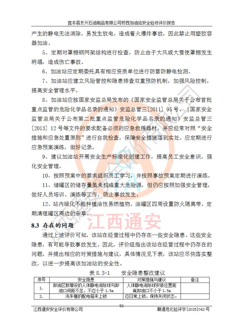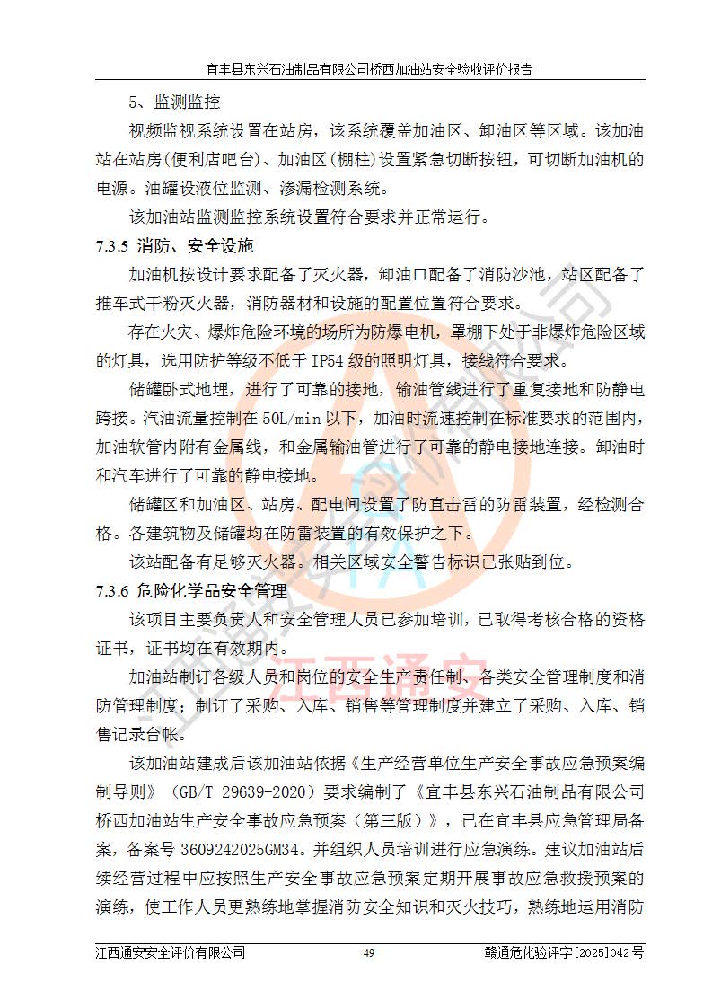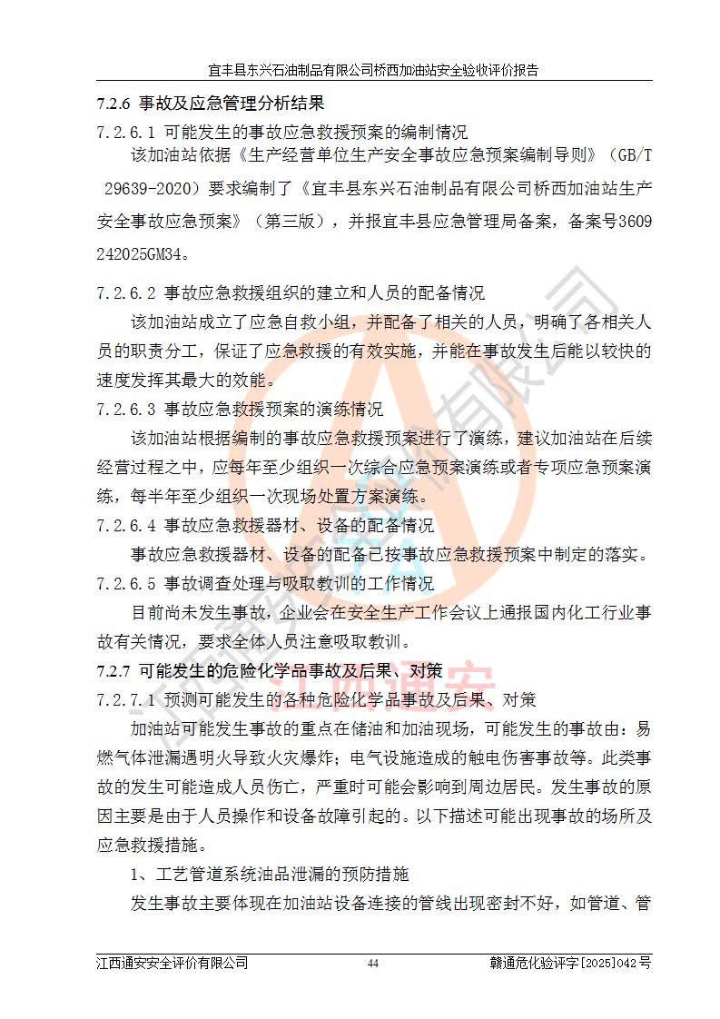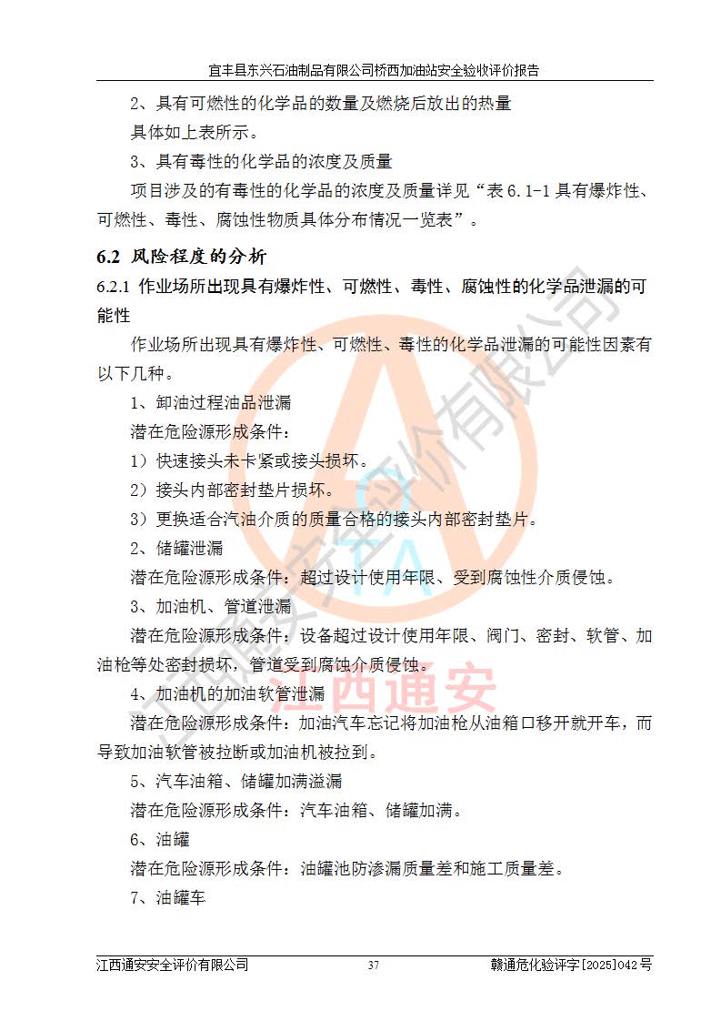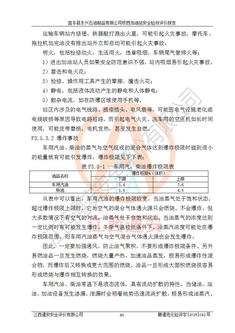 其它 | 一、安全狀況綜合評述 宜豐縣東興石油制品有限公司橋西加油站位于宜春市宜豐縣橋西鄉(xiāng),從事成品油(汽油、柴油)零售業(yè)務(wù),屬二級加油站。 通過對該加油站建設(shè)項目安全驗收評價,得出以下評價結(jié)論: 化學品、設(shè)備及工藝辨識結(jié)果 經(jīng)辨識,該加油站經(jīng)營、儲存危險化學品為汽油和柴油,其中汽油屬于重點監(jiān)管危險化學品、特別管控危險化學品;該加油站不涉及劇毒化學品、高毒物品、易制毒化學品、監(jiān)控化學品、易制爆化學品。經(jīng)營、儲存過程中采用的設(shè)備及工藝不屬于淘汰落后設(shè)備及工藝、不涉及危險化工工藝,生產(chǎn)和儲存單元均不構(gòu)成危險化學品重大危險源。 建設(shè)項目所在地的安全條件和周邊的安全間距 該站東南側(cè)臨354國道,北側(cè)、西側(cè)、東側(cè)為居民建筑,加油站為二級加油站,設(shè)有油氣回收系統(tǒng),站外50米范圍內(nèi)無重要公共建筑物、明火設(shè)備和甲、乙類生產(chǎn)及儲存設(shè)施,站區(qū)內(nèi)加油設(shè)施與周邊建構(gòu)筑物之間的距離能夠滿足《汽車加油加氣加氫站技術(shù)標準》GB50156-2021 和《建筑設(shè)計防火規(guī)范》GB50016-2014(2018 年版)以及相關(guān)**規(guī)范要求。本報告認為該加油站建設(shè)項目周邊對加油站的影響以及建設(shè)項目所在地的自然條件對建設(shè)項目投入使用后的影響均較小,該加油站具備標準規(guī)范所要求的安全條件。 該項目安全設(shè)計診斷報告的采納情況 該加油站安全設(shè)計診斷報告核查的問題(共15項)及整改建議均已采納,經(jīng)評價組現(xiàn)場復(fù)核,均已整改完成。 該項目調(diào)試中表現(xiàn)出的技術(shù)、工藝和裝置、設(shè)備(設(shè)施)的安全、 可靠性和安全水平。 該加油站整改過程工作進展順利,處于正常狀態(tài)。經(jīng)查閱資料和分析評價,認為本項目技術(shù)、工藝和裝置、設(shè)備(設(shè)施)的安全、可靠性和安全水平符合**相應(yīng)安全標準的要求。 該加油站儲存經(jīng)營的汽油屬于重點監(jiān)管的危險化學品和特別管控危險化學品,該加油站在后續(xù)的經(jīng)營中應(yīng)按照相關(guān)規(guī)范和要求加強安全管理,要求油品運輸單位強化運輸管理、自身加強儲存定制化管理。 該加油站經(jīng)營過程中存在的危險有害因素為:①火災(zāi)、爆炸;② 中毒和窒息;③**傷害;④觸電;⑤高處墜落;⑥物體打擊、⑦其他傷害。 其中火災(zāi)、爆炸是主要的危險、有害因素,加油站埋地儲罐區(qū)、加油區(qū)、卸 油區(qū)是主要的危險源。 (7)經(jīng)采用作業(yè)條件危險性評價法(LEC)進行分析,該加油站的作業(yè)條件相對比較安全。在選定的加油作業(yè)、卸油作業(yè)、維修作業(yè)、配電作業(yè)等4個單元中均為“一般危險、需要注意”作業(yè)環(huán)境,且一般危險作業(yè)環(huán)境的出現(xiàn)均由物料的危險程度所決定,作業(yè)條件相對安全。 (8)采用危險度評價法分析,油罐區(qū)主要危險物質(zhì)為汽油和柴油,常溫、常壓下儲存。儲罐區(qū)汽油罐為Ⅰ級,屬**危險;柴油罐得分為為Ⅲ級,屬低度危險。油罐采用雙層罐埋地設(shè)置,按要求設(shè)置了通氣管,并裝設(shè)了阻火器;設(shè)置了液位監(jiān)測報警系統(tǒng)和緊急切斷系統(tǒng),埋地加油管道設(shè)置雙層管道,其安全風險可控。 (9)采用檢查表評價法對該加油站站址選擇、總平面布置、加油工藝及設(shè)施、消防設(shè)施和給排水、電氣與報警和緊急切斷系統(tǒng)等進行檢查分析,經(jīng)整改后,該加油站涉及的強制條款和其他項均符合要求。該加油站設(shè)置了消防安全設(shè)施、防雷防靜電設(shè)施、液位監(jiān)測措施、油罐泄漏檢測措施、電氣防爆措施等安全防護設(shè)施,取得了消防驗收意見書和防雷檢測合格報告,符合**法律法規(guī)、標準規(guī)范的要求。該加油站公用工程能夠滿足安全經(jīng)營的基本需要,符合安全經(jīng)營的條件。 (10)該加油站相關(guān)證照齊全,成立了安全生產(chǎn)**小組,配備了安全管理人員,制定了安全管理制度、操作規(guī)程和事故應(yīng)急預(yù)案,加油站的安全管理機構(gòu)工作有力,加油站安全經(jīng)營管理處于正常有序開展范圍。 (11)對宜豐縣東興石油制品有限公司橋西加油站存在重大生產(chǎn)安全事故隱患進行判定,檢查結(jié)果為該加油站不存在重大生產(chǎn)安全事故隱患。 總體評價結(jié)論:宜豐縣東興石油制品有限公司橋西加油站認真落實并合理采納安全設(shè)計診斷報告中的安全對策、措施及建議,現(xiàn)場與安全設(shè)施設(shè)計單位重新繪制的現(xiàn)狀總平面布置圖一致,安全設(shè)計診斷報告提出的安全對策措施已落實到位。對潛在的危險、 有害因素采取了安全對策措施,工程潛在的危險、有害因素可得到**控制, 風險在**控制和可接受范圍內(nèi)。