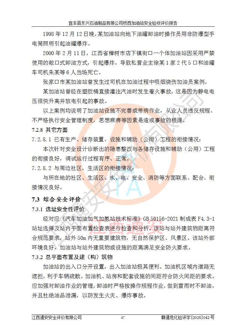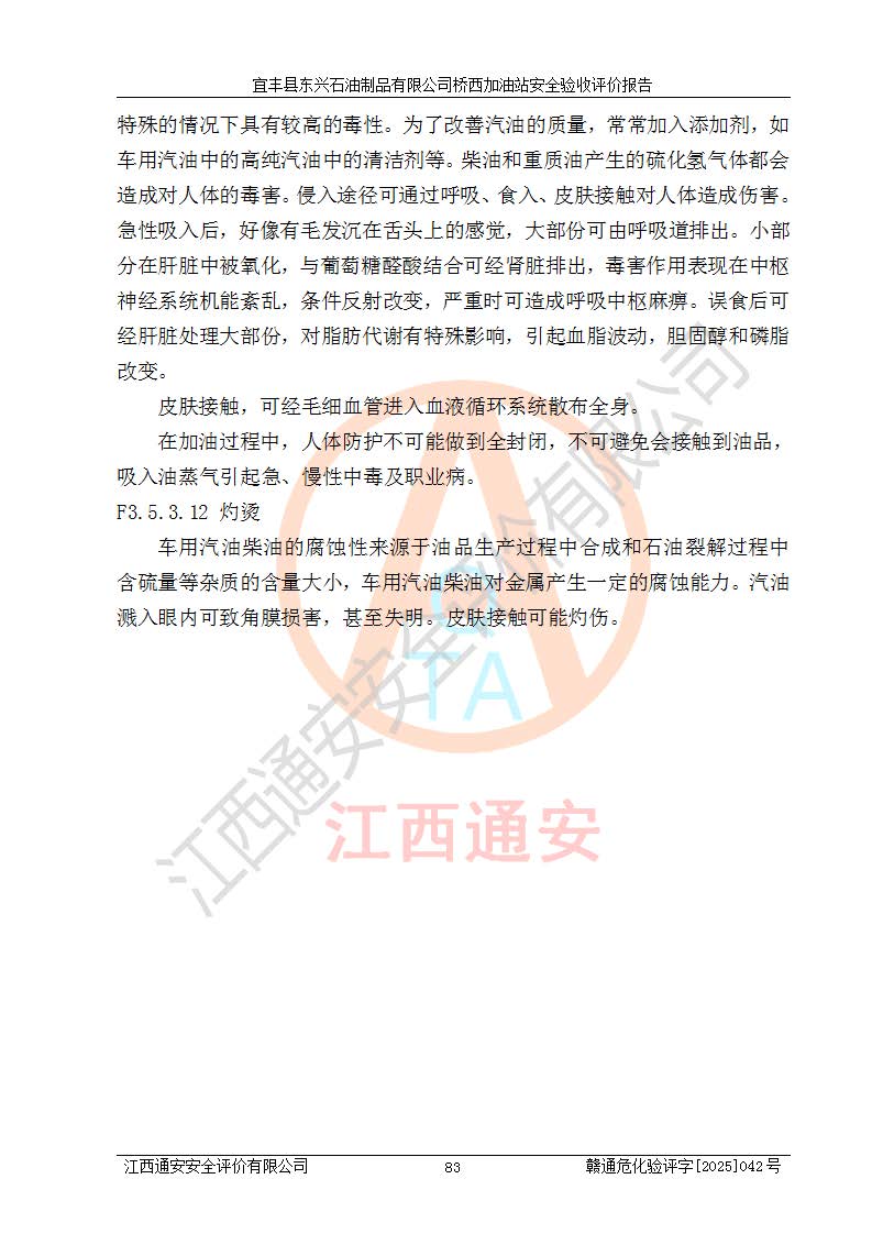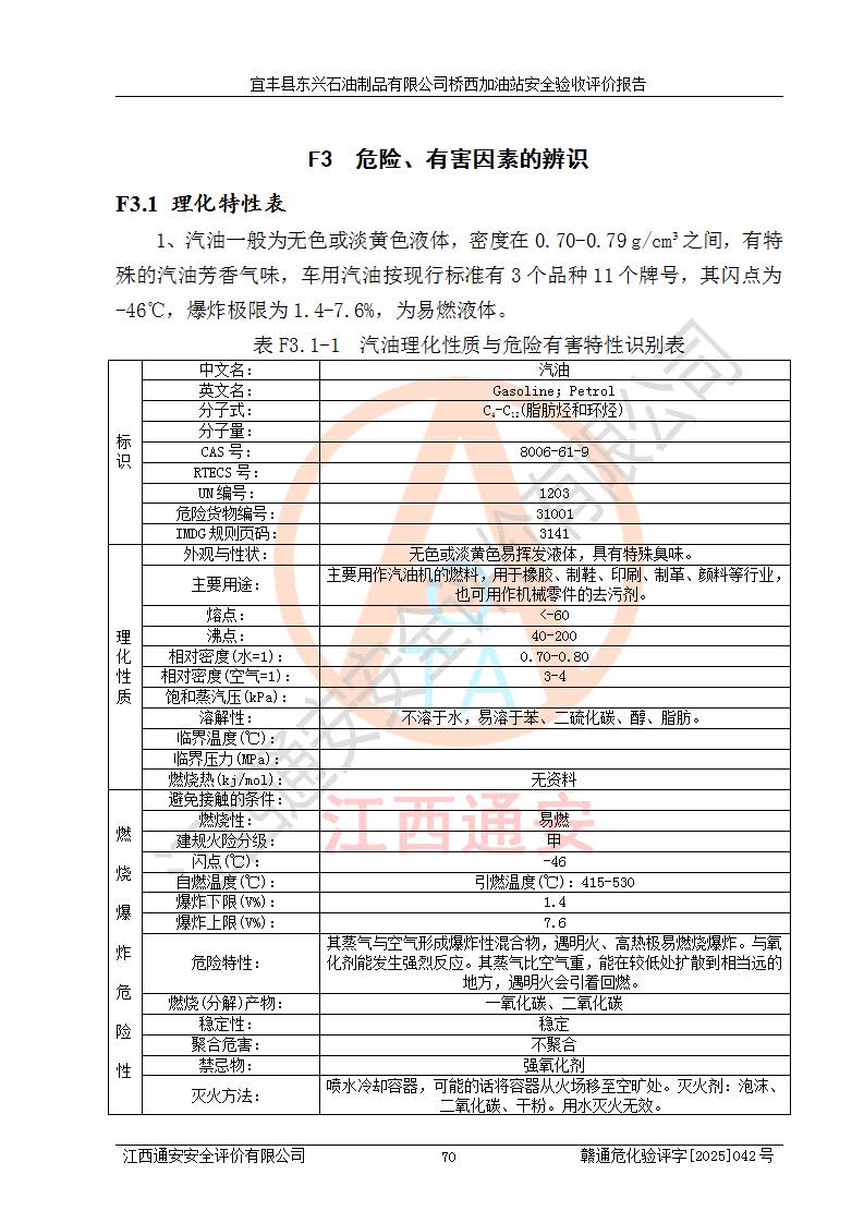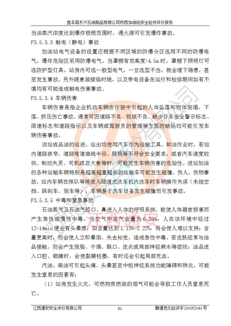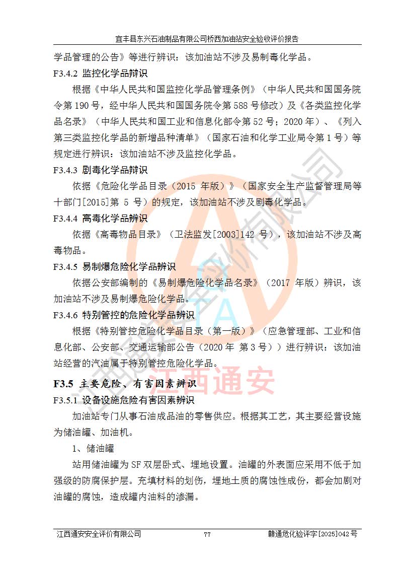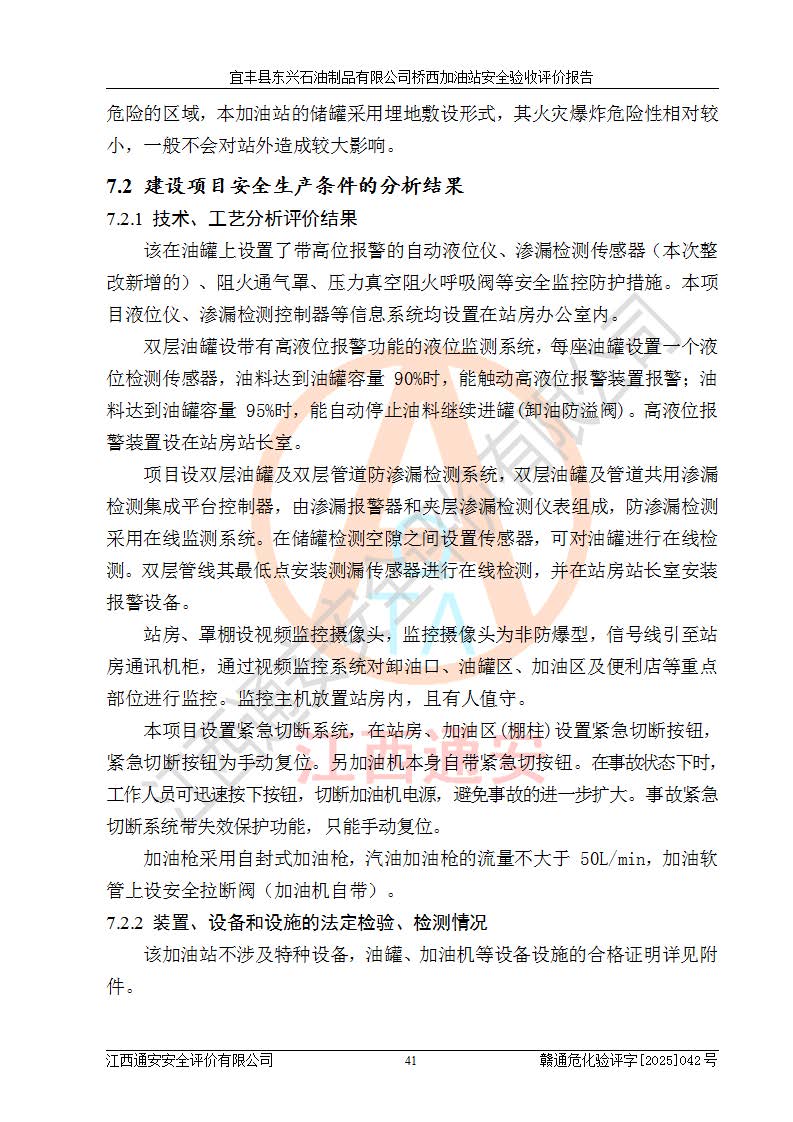 其它 | 一、安全狀況綜合評述 宜豐縣東興石油制品有限公司橋西加油站位于宜春市宜豐縣橋西鄉(xiāng),從事成品油(汽油、柴油)零售業(yè)務(wù),屬二級加油站。 通過對該加油站建設(shè)項目安全驗收評價,得出以下評價結(jié)論: 化學品、設(shè)備及工藝辨識結(jié)果 經(jīng)辨識,該加油站經(jīng)營、儲存危險化學品為汽油和柴油,其中汽油屬于重點監(jiān)管危險化學品、特別管控危險化學品;該加油站不涉及劇毒化學品、高毒物品、易制毒化學品、監(jiān)控化學品、易制爆化學品。經(jīng)營、儲存過程中采用的設(shè)備及工藝不屬于淘汰落后設(shè)備及工藝、不涉及危險化工工藝,生產(chǎn)和儲存單元均不構(gòu)成危險化學品重大危險源。 建設(shè)項目所在地的安全條件和周邊的安全間距 該站東南側(cè)臨354國道,北側(cè)、西側(cè)、東側(cè)為居民建筑,加油站為二級加油站,設(shè)有油氣回收系統(tǒng),站外50米范圍內(nèi)無重要公共建筑物、明火設(shè)備和甲、乙類生產(chǎn)及儲存設(shè)施,站區(qū)內(nèi)加油設(shè)施與周邊建構(gòu)筑物之間的距離能夠滿足《汽車加油加氣加氫站技術(shù)標準》GB50156-2021 和《建筑設(shè)計防火規(guī)范》GB50016-2014(2018 年版)以及相關(guān)**規(guī)范要求。本報告認為該加油站建設(shè)項目周邊對加油站的影響以及建設(shè)項目所在地的自然條件對建設(shè)項目投入使用后的影響均較小,該加油站具備標準規(guī)范所要求的安全條件。 該項目安全設(shè)計診斷報告的采納情況 該加油站安全設(shè)計診斷報告核查的問題(共15項)及整改建議均已采納,經(jīng)評價組現(xiàn)場復(fù)核,均已整改完成。 該項目調(diào)試中表現(xiàn)出的技術(shù)、工藝和裝置、設(shè)備(設(shè)施)的安全、 可靠性和安全水平。 該加油站整改過程工作進展順利,處于正常狀態(tài)。經(jīng)查閱資料和分析評價,認為本項目技術(shù)、工藝和裝置、設(shè)備(設(shè)施)的安全、可靠性和安全水平符合**相應(yīng)安全標準的要求。 該加油站儲存經(jīng)營的汽油屬于重點監(jiān)管的危險化學品和特別管控危險化學品,該加油站在后續(xù)的經(jīng)營中應(yīng)按照相關(guān)規(guī)范和要求加強安全管理,要求油品運輸單位強化運輸管理、自身加強儲存定制化管理。 該加油站經(jīng)營過程中存在的危險有害因素為:①火災(zāi)、爆炸;② 中毒和窒息;③**傷害;④觸電;⑤高處墜落;⑥物體打擊、⑦其他傷害。 其中火災(zāi)、爆炸是主要的危險、有害因素,加油站埋地儲罐區(qū)、加油區(qū)、卸 油區(qū)是主要的危險源。 (7)經(jīng)采用作業(yè)條件危險性評價法(LEC)進行分析,該加油站的作業(yè)條件相對比較安全。在選定的加油作業(yè)、卸油作業(yè)、維修作業(yè)、配電作業(yè)等4個單元中均為“一般危險、需要注意”作業(yè)環(huán)境,且一般危險作業(yè)環(huán)境的出現(xiàn)均由物料的危險程度所決定,作業(yè)條件相對安全。 (8)采用危險度評價法分析,油罐區(qū)主要危險物質(zhì)為汽油和柴油,常溫、常壓下儲存。儲罐區(qū)汽油罐為Ⅰ級,屬**危險;柴油罐得分為為Ⅲ級,屬低度危險。油罐采用雙層罐埋地設(shè)置,按要求設(shè)置了通氣管,并裝設(shè)了阻火器;設(shè)置了液位監(jiān)測報警系統(tǒng)和緊急切斷系統(tǒng),埋地加油管道設(shè)置雙層管道,其安全風險可控。 (9)采用檢查表評價法對該加油站站址選擇、總平面布置、加油工藝及設(shè)施、消防設(shè)施和給排水、電氣與報警和緊急切斷系統(tǒng)等進行檢查分析,經(jīng)整改后,該加油站涉及的強制條款和其他項均符合要求。該加油站設(shè)置了消防安全設(shè)施、防雷防靜電設(shè)施、液位監(jiān)測措施、油罐泄漏檢測措施、電氣防爆措施等安全防護設(shè)施,取得了消防驗收意見書和防雷檢測合格報告,符合**法律法規(guī)、標準規(guī)范的要求。該加油站公用工程能夠滿足安全經(jīng)營的基本需要,符合安全經(jīng)營的條件。 (10)該加油站相關(guān)證照齊全,成立了安全生產(chǎn)**小組,配備了安全管理人員,制定了安全管理制度、操作規(guī)程和事故應(yīng)急預(yù)案,加油站的安全管理機構(gòu)工作有力,加油站安全經(jīng)營管理處于正常有序開展范圍。 (11)對宜豐縣東興石油制品有限公司橋西加油站存在重大生產(chǎn)安全事故隱患進行判定,檢查結(jié)果為該加油站不存在重大生產(chǎn)安全事故隱患。 總體評價結(jié)論:宜豐縣東興石油制品有限公司橋西加油站認真落實并合理采納安全設(shè)計診斷報告中的安全對策、措施及建議,現(xiàn)場與安全設(shè)施設(shè)計單位重新繪制的現(xiàn)狀總平面布置圖一致,安全設(shè)計診斷報告提出的安全對策措施已落實到位。對潛在的危險、 有害因素采取了安全對策措施,工程潛在的危險、有害因素可得到**控制, 風險在**控制和可接受范圍內(nèi)。