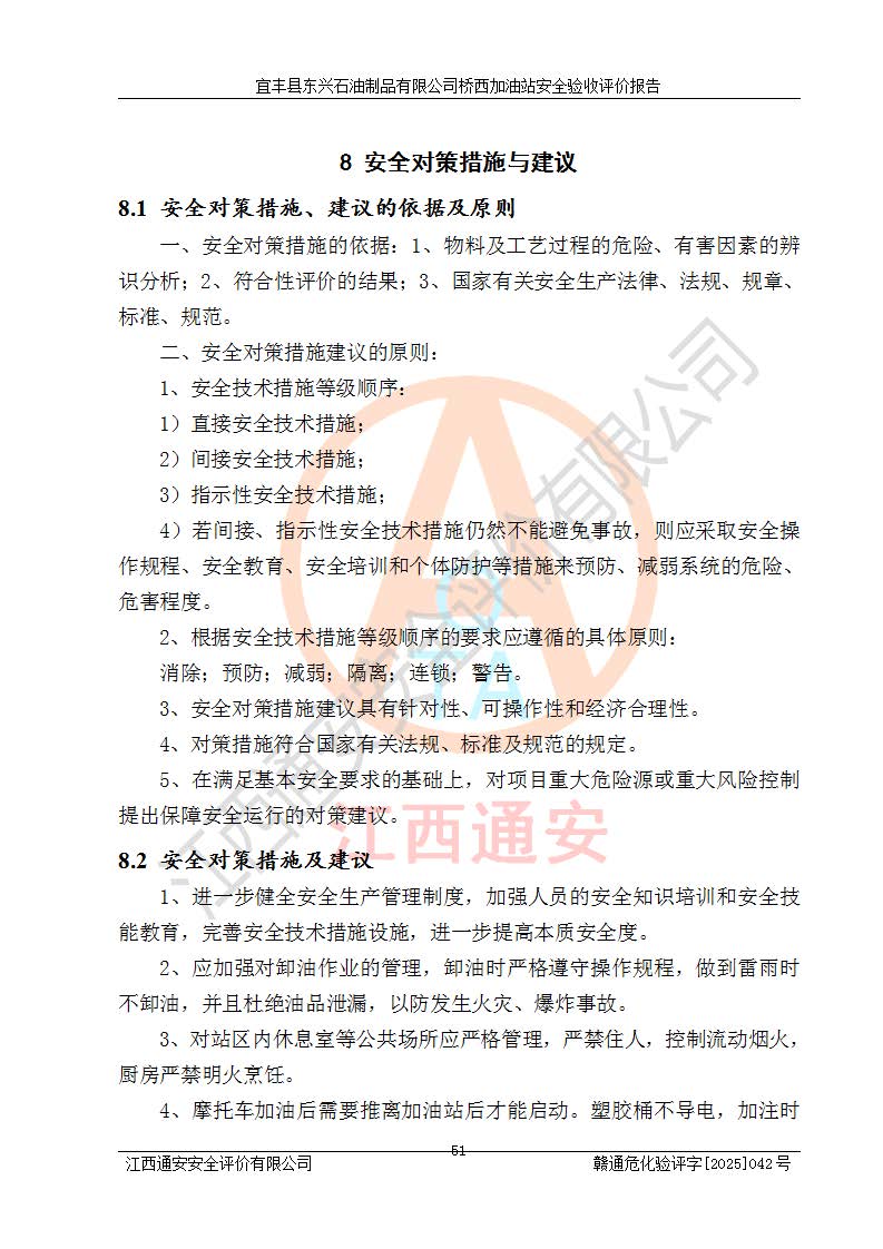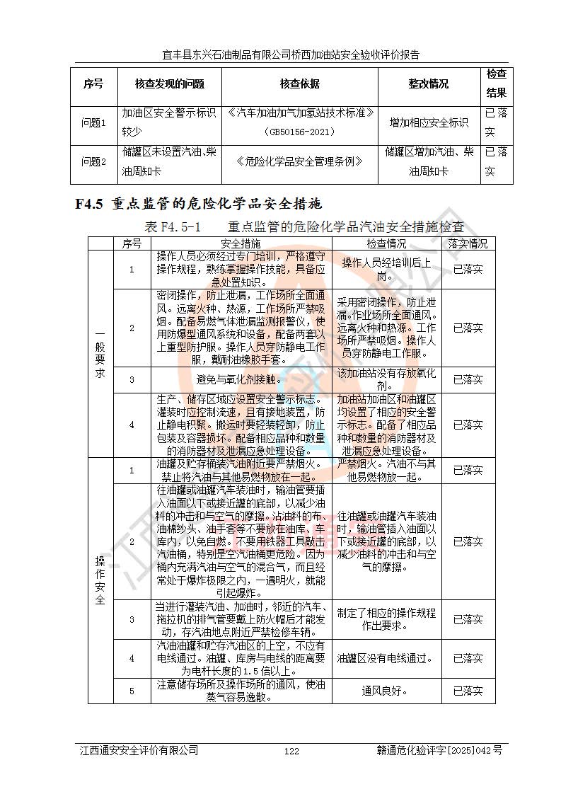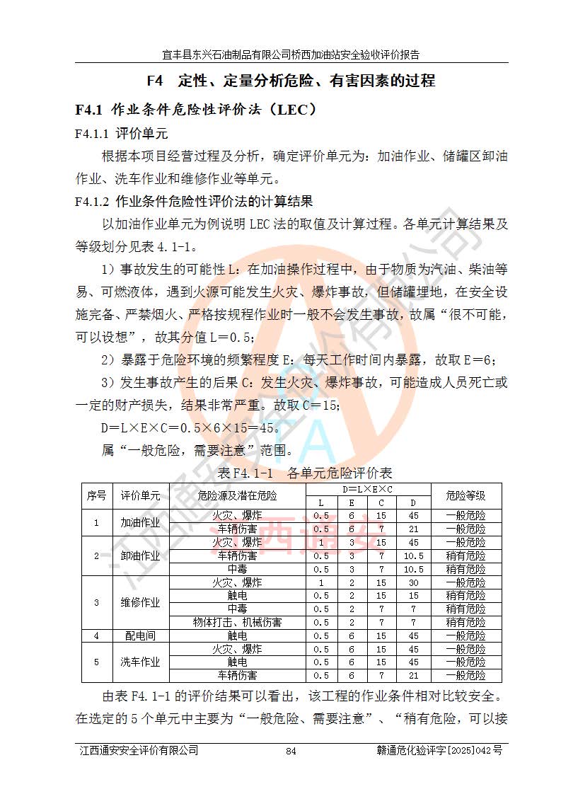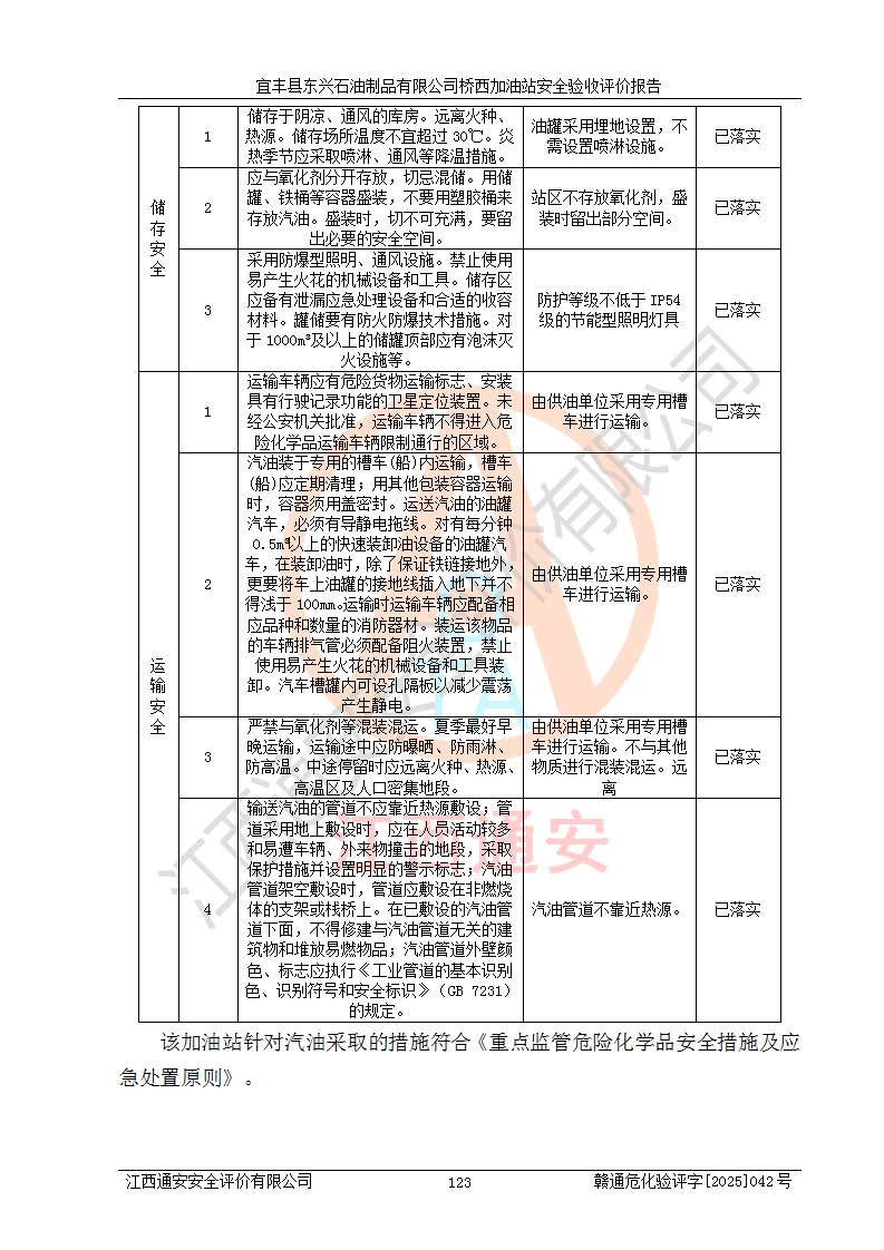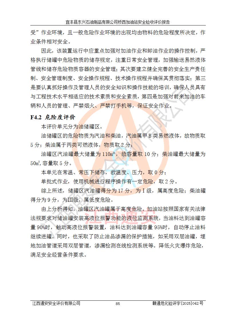 其它 | 一、安全狀況綜合評述 宜豐縣東興石油制品有限公司橋西加油站位于宜春市宜豐縣橋西鄉(xiāng),從事成品油(汽油、柴油)零售業(yè)務(wù),屬二級加油站。 通過對該加油站建設(shè)項目安全驗收評價,得出以下評價結(jié)論: 化學品、設(shè)備及工藝辨識結(jié)果 經(jīng)辨識,該加油站經(jīng)營、儲存危險化學品為汽油和柴油,其中汽油屬于重點監(jiān)管危險化學品、特別管控危險化學品;該加油站不涉及劇毒化學品、高毒物品、易制毒化學品、監(jiān)控化學品、易制爆化學品。經(jīng)營、儲存過程中采用的設(shè)備及工藝不屬于淘汰落后設(shè)備及工藝、不涉及危險化工工藝,生產(chǎn)和儲存單元均不構(gòu)成危險化學品重大危險源。 建設(shè)項目所在地的安全條件和周邊的安全間距 該站東南側(cè)臨354國道,北側(cè)、西側(cè)、東側(cè)為居民建筑,加油站為二級加油站,設(shè)有油氣回收系統(tǒng),站外50米范圍內(nèi)無重要公共建筑物、明火設(shè)備和甲、乙類生產(chǎn)及儲存設(shè)施,站區(qū)內(nèi)加油設(shè)施與周邊建構(gòu)筑物之間的距離能夠滿足《汽車加油加氣加氫站技術(shù)標準》GB50156-2021 和《建筑設(shè)計防火規(guī)范》GB50016-2014(2018 年版)以及相關(guān)**規(guī)范要求。本報告認為該加油站建設(shè)項目周邊對加油站的影響以及建設(shè)項目所在地的自然條件對建設(shè)項目投入使用后的影響均較小,該加油站具備標準規(guī)范所要求的安全條件。 該項目安全設(shè)計診斷報告的采納情況 該加油站安全設(shè)計診斷報告核查的問題(共15項)及整改建議均已采納,經(jīng)評價組現(xiàn)場復(fù)核,均已整改完成。 該項目調(diào)試中表現(xiàn)出的技術(shù)、工藝和裝置、設(shè)備(設(shè)施)的安全、 可靠性和安全水平。 該加油站整改過程工作進展順利,處于正常狀態(tài)。經(jīng)查閱資料和分析評價,認為本項目技術(shù)、工藝和裝置、設(shè)備(設(shè)施)的安全、可靠性和安全水平符合**相應(yīng)安全標準的要求。 該加油站儲存經(jīng)營的汽油屬于重點監(jiān)管的危險化學品和特別管控危險化學品,該加油站在后續(xù)的經(jīng)營中應(yīng)按照相關(guān)規(guī)范和要求加強安全管理,要求油品運輸單位強化運輸管理、自身加強儲存定制化管理。 該加油站經(jīng)營過程中存在的危險有害因素為:①火災(zāi)、爆炸;② 中毒和窒息;③**傷害;④觸電;⑤高處墜落;⑥物體打擊、⑦其他傷害。 其中火災(zāi)、爆炸是主要的危險、有害因素,加油站埋地儲罐區(qū)、加油區(qū)、卸 油區(qū)是主要的危險源。 (7)經(jīng)采用作業(yè)條件危險性評價法(LEC)進行分析,該加油站的作業(yè)條件相對比較安全。在選定的加油作業(yè)、卸油作業(yè)、維修作業(yè)、配電作業(yè)等4個單元中均為“一般危險、需要注意”作業(yè)環(huán)境,且一般危險作業(yè)環(huán)境的出現(xiàn)均由物料的危險程度所決定,作業(yè)條件相對安全。 (8)采用危險度評價法分析,油罐區(qū)主要危險物質(zhì)為汽油和柴油,常溫、常壓下儲存。儲罐區(qū)汽油罐為Ⅰ級,屬**危險;柴油罐得分為為Ⅲ級,屬低度危險。油罐采用雙層罐埋地設(shè)置,按要求設(shè)置了通氣管,并裝設(shè)了阻火器;設(shè)置了液位監(jiān)測報警系統(tǒng)和緊急切斷系統(tǒng),埋地加油管道設(shè)置雙層管道,其安全風險可控。 (9)采用檢查表評價法對該加油站站址選擇、總平面布置、加油工藝及設(shè)施、消防設(shè)施和給排水、電氣與報警和緊急切斷系統(tǒng)等進行檢查分析,經(jīng)整改后,該加油站涉及的強制條款和其他項均符合要求。該加油站設(shè)置了消防安全設(shè)施、防雷防靜電設(shè)施、液位監(jiān)測措施、油罐泄漏檢測措施、電氣防爆措施等安全防護設(shè)施,取得了消防驗收意見書和防雷檢測合格報告,符合**法律法規(guī)、標準規(guī)范的要求。該加油站公用工程能夠滿足安全經(jīng)營的基本需要,符合安全經(jīng)營的條件。 (10)該加油站相關(guān)證照齊全,成立了安全生產(chǎn)**小組,配備了安全管理人員,制定了安全管理制度、操作規(guī)程和事故應(yīng)急預(yù)案,加油站的安全管理機構(gòu)工作有力,加油站安全經(jīng)營管理處于正常有序開展范圍。 (11)對宜豐縣東興石油制品有限公司橋西加油站存在重大生產(chǎn)安全事故隱患進行判定,檢查結(jié)果為該加油站不存在重大生產(chǎn)安全事故隱患。 總體評價結(jié)論:宜豐縣東興石油制品有限公司橋西加油站認真落實并合理采納安全設(shè)計診斷報告中的安全對策、措施及建議,現(xiàn)場與安全設(shè)施設(shè)計單位重新繪制的現(xiàn)狀總平面布置圖一致,安全設(shè)計診斷報告提出的安全對策措施已落實到位。對潛在的危險、 有害因素采取了安全對策措施,工程潛在的危險、有害因素可得到**控制, 風險在**控制和可接受范圍內(nèi)。