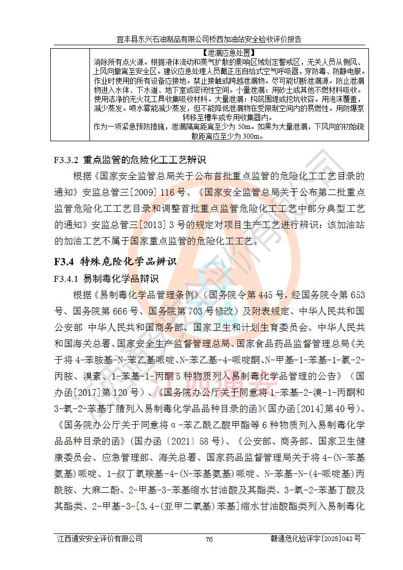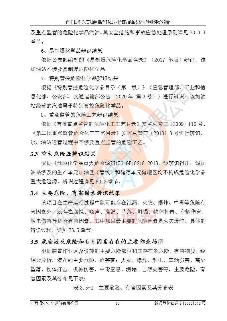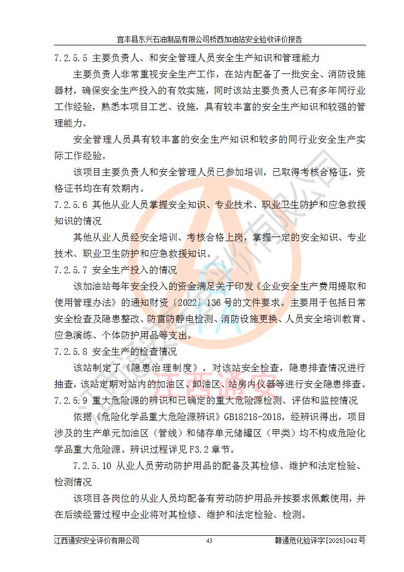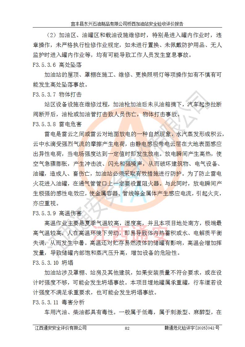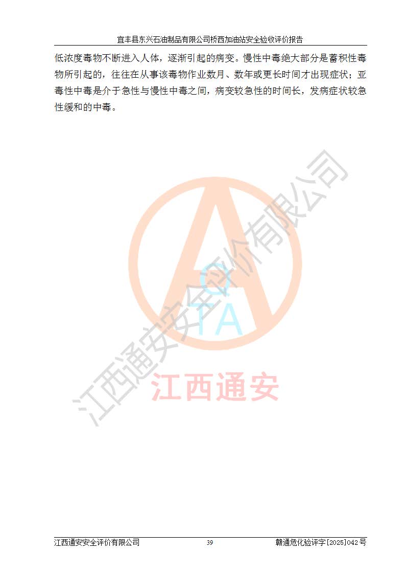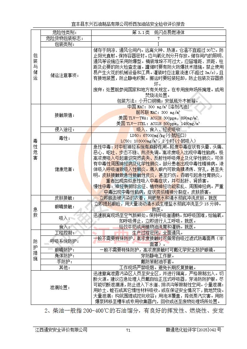 其它 | 一、安全狀況綜合評述 宜豐縣東興石油制品有限公司橋西加油站位于宜春市宜豐縣橋西鄉(xiāng),從事成品油(汽油、柴油)零售業(yè)務(wù),屬二級加油站。 通過對該加油站建設(shè)項目安全驗收評價,得出以下評價結(jié)論: 化學品、設(shè)備及工藝辨識結(jié)果 經(jīng)辨識,該加油站經(jīng)營、儲存危險化學品為汽油和柴油,其中汽油屬于重點監(jiān)管危險化學品、特別管控危險化學品;該加油站不涉及劇毒化學品、高毒物品、易制毒化學品、監(jiān)控化學品、易制爆化學品。經(jīng)營、儲存過程中采用的設(shè)備及工藝不屬于淘汰落后設(shè)備及工藝、不涉及危險化工工藝,生產(chǎn)和儲存單元均不構(gòu)成危險化學品重大危險源。 建設(shè)項目所在地的安全條件和周邊的安全間距 該站東南側(cè)臨354國道,北側(cè)、西側(cè)、東側(cè)為居民建筑,加油站為二級加油站,設(shè)有油氣回收系統(tǒng),站外50米范圍內(nèi)無重要公共建筑物、明火設(shè)備和甲、乙類生產(chǎn)及儲存設(shè)施,站區(qū)內(nèi)加油設(shè)施與周邊建構(gòu)筑物之間的距離能夠滿足《汽車加油加氣加氫站技術(shù)標準》GB50156-2021 和《建筑設(shè)計防火規(guī)范》GB50016-2014(2018 年版)以及相關(guān)**規(guī)范要求。本報告認為該加油站建設(shè)項目周邊對加油站的影響以及建設(shè)項目所在地的自然條件對建設(shè)項目投入使用后的影響均較小,該加油站具備標準規(guī)范所要求的安全條件。 該項目安全設(shè)計診斷報告的采納情況 該加油站安全設(shè)計診斷報告核查的問題(共15項)及整改建議均已采納,經(jīng)評價組現(xiàn)場復(fù)核,均已整改完成。 該項目調(diào)試中表現(xiàn)出的技術(shù)、工藝和裝置、設(shè)備(設(shè)施)的安全、 可靠性和安全水平。 該加油站整改過程工作進展順利,處于正常狀態(tài)。經(jīng)查閱資料和分析評價,認為本項目技術(shù)、工藝和裝置、設(shè)備(設(shè)施)的安全、可靠性和安全水平符合**相應(yīng)安全標準的要求。 該加油站儲存經(jīng)營的汽油屬于重點監(jiān)管的危險化學品和特別管控危險化學品,該加油站在后續(xù)的經(jīng)營中應(yīng)按照相關(guān)規(guī)范和要求加強安全管理,要求油品運輸單位強化運輸管理、自身加強儲存定制化管理。 該加油站經(jīng)營過程中存在的危險有害因素為:①火災(zāi)、爆炸;② 中毒和窒息;③**傷害;④觸電;⑤高處墜落;⑥物體打擊、⑦其他傷害。 其中火災(zāi)、爆炸是主要的危險、有害因素,加油站埋地儲罐區(qū)、加油區(qū)、卸 油區(qū)是主要的危險源。 (7)經(jīng)采用作業(yè)條件危險性評價法(LEC)進行分析,該加油站的作業(yè)條件相對比較安全。在選定的加油作業(yè)、卸油作業(yè)、維修作業(yè)、配電作業(yè)等4個單元中均為“一般危險、需要注意”作業(yè)環(huán)境,且一般危險作業(yè)環(huán)境的出現(xiàn)均由物料的危險程度所決定,作業(yè)條件相對安全。 (8)采用危險度評價法分析,油罐區(qū)主要危險物質(zhì)為汽油和柴油,常溫、常壓下儲存。儲罐區(qū)汽油罐為Ⅰ級,屬**危險;柴油罐得分為為Ⅲ級,屬低度危險。油罐采用雙層罐埋地設(shè)置,按要求設(shè)置了通氣管,并裝設(shè)了阻火器;設(shè)置了液位監(jiān)測報警系統(tǒng)和緊急切斷系統(tǒng),埋地加油管道設(shè)置雙層管道,其安全風險可控。 (9)采用檢查表評價法對該加油站站址選擇、總平面布置、加油工藝及設(shè)施、消防設(shè)施和給排水、電氣與報警和緊急切斷系統(tǒng)等進行檢查分析,經(jīng)整改后,該加油站涉及的強制條款和其他項均符合要求。該加油站設(shè)置了消防安全設(shè)施、防雷防靜電設(shè)施、液位監(jiān)測措施、油罐泄漏檢測措施、電氣防爆措施等安全防護設(shè)施,取得了消防驗收意見書和防雷檢測合格報告,符合**法律法規(guī)、標準規(guī)范的要求。該加油站公用工程能夠滿足安全經(jīng)營的基本需要,符合安全經(jīng)營的條件。 (10)該加油站相關(guān)證照齊全,成立了安全生產(chǎn)**小組,配備了安全管理人員,制定了安全管理制度、操作規(guī)程和事故應(yīng)急預(yù)案,加油站的安全管理機構(gòu)工作有力,加油站安全經(jīng)營管理處于正常有序開展范圍。 (11)對宜豐縣東興石油制品有限公司橋西加油站存在重大生產(chǎn)安全事故隱患進行判定,檢查結(jié)果為該加油站不存在重大生產(chǎn)安全事故隱患。 總體評價結(jié)論:宜豐縣東興石油制品有限公司橋西加油站認真落實并合理采納安全設(shè)計診斷報告中的安全對策、措施及建議,現(xiàn)場與安全設(shè)施設(shè)計單位重新繪制的現(xiàn)狀總平面布置圖一致,安全設(shè)計診斷報告提出的安全對策措施已落實到位。對潛在的危險、 有害因素采取了安全對策措施,工程潛在的危險、有害因素可得到**控制, 風險在**控制和可接受范圍內(nèi)。
