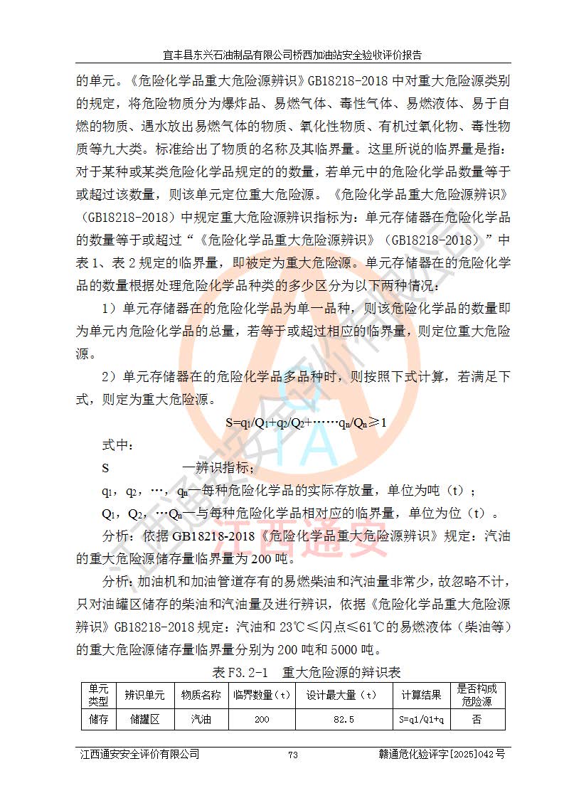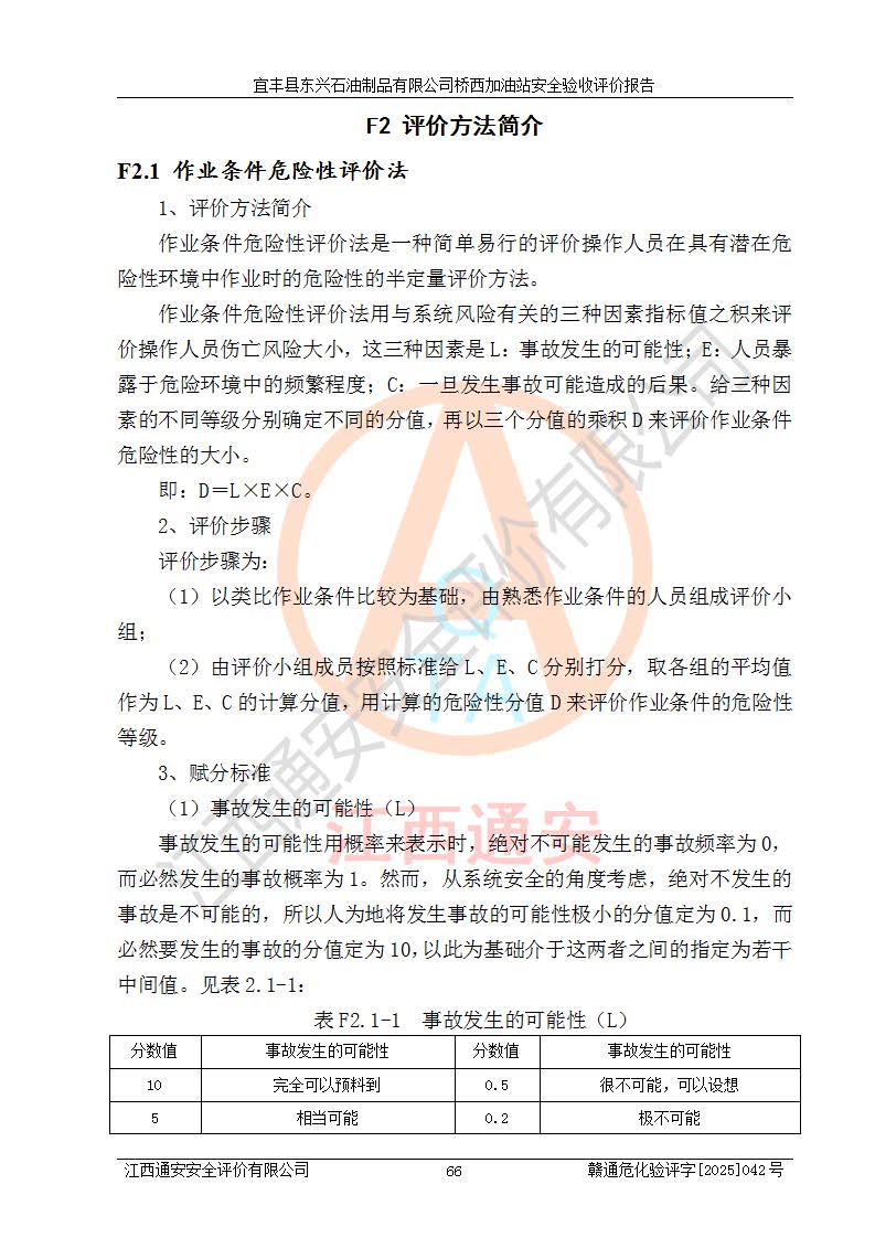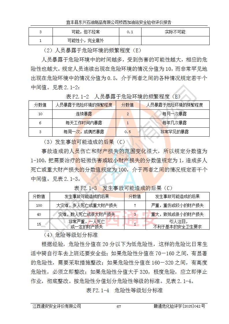 主要任務(wù) | 本評價報告主要針對評價范圍內(nèi)汽油、柴油儲存經(jīng)營過程所涉及的危險、有害因素及重大危險源等進行辨識與分析,根據(jù)相應(yīng)法律、法規(guī)、標準的要求檢查安全設(shè)施的配置及相關(guān)檢測檢驗情況及其符合性,檢查公用工程及輔助設(shè)施的配套性,審核安全生產(chǎn)管理機構(gòu)、制度、人員培訓(xùn)、設(shè)備管理、操作規(guī)程、應(yīng)急預(yù)案及勞動防護用品的配備等,對該項目安全設(shè)施及安全措施進行符合性評價,并在此基礎(chǔ)上提出相應(yīng)的安全對策措施及建議。 | ||||
