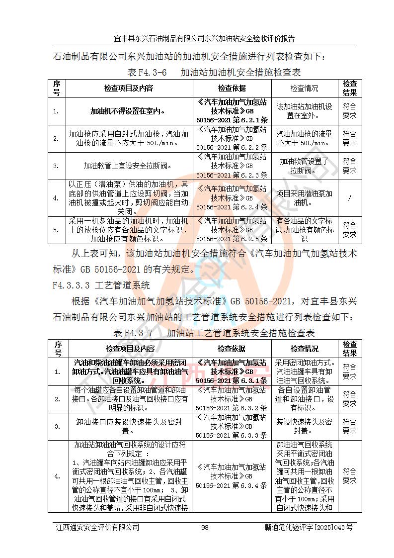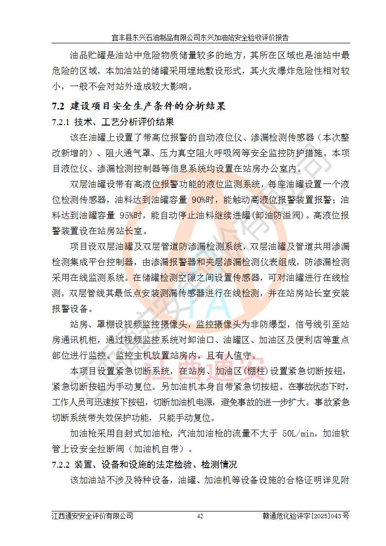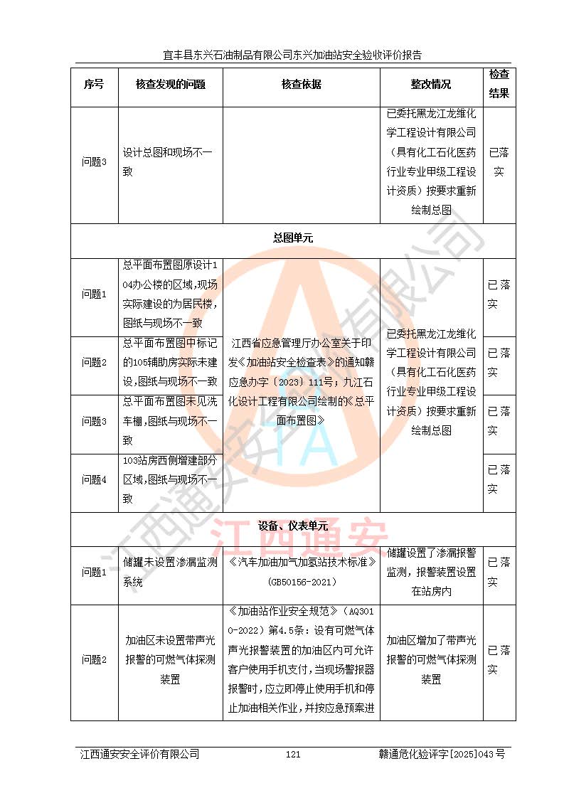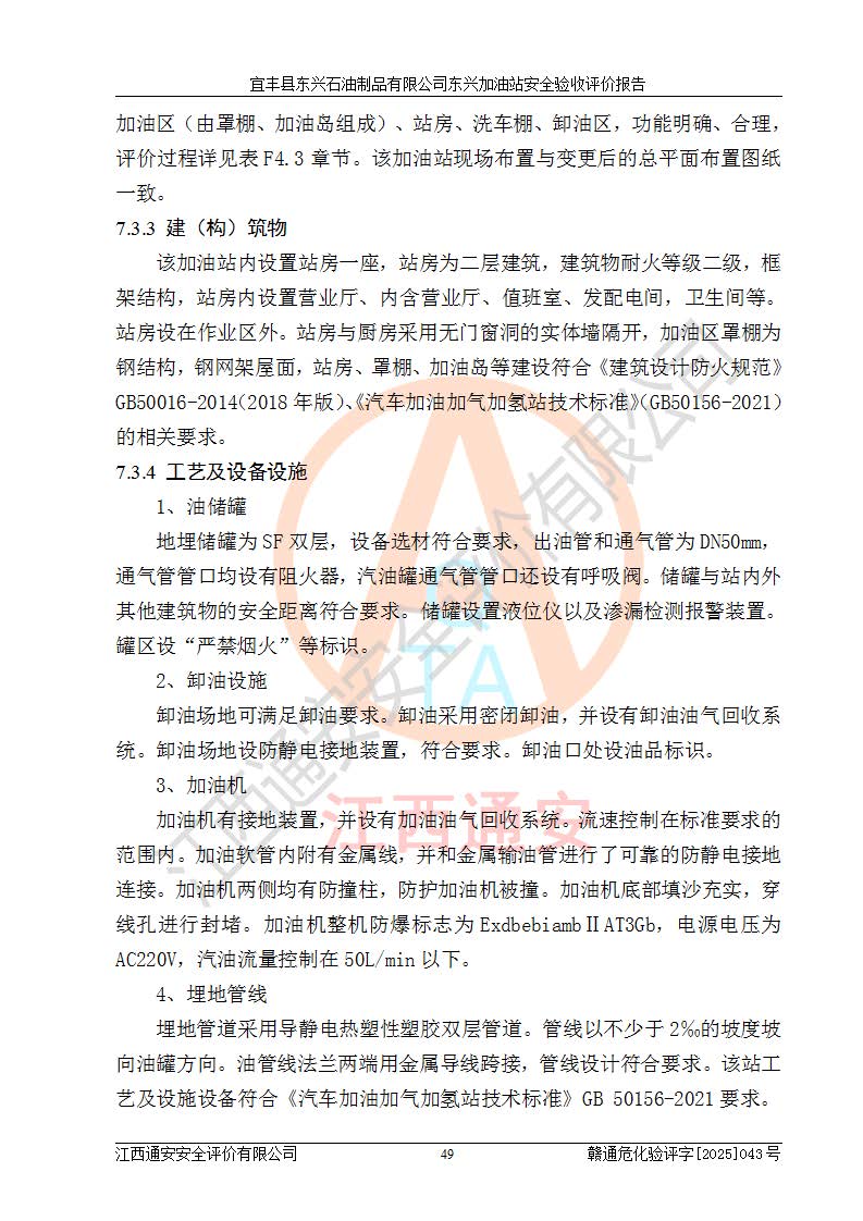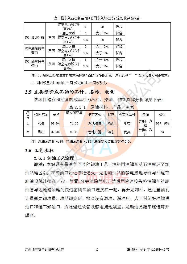項目簡介 | 宜豐縣東興石油制品有限公司東興加油站(以下簡稱“該加油站”)成立于2013年10月23日,營業(yè)場所位于宜豐縣沿山大道以北流源村元形組村民建房點以東,法定**人為張凱軍。該加油站統(tǒng)一社會信用代碼為91360924MA35HD1D8P,屬于有限責任制公司分公司(自然人投資或控股)。經(jīng)營范圍:汽油、柴油、潤滑油零售,洗車,煙、預(yù)包裝食品零售。 該加油站油罐區(qū)設(shè)有4個埋地臥式儲罐,其中1臺50m3的0#柴油儲罐,1臺50m3的92#汽油儲罐,1臺30m3的92#汽油儲罐,1臺30m3的95#汽油儲罐,柴油罐容積折半計入油罐總?cè)莘e,折算后總?cè)莘e為135m3,屬于二級加油站,站內(nèi)設(shè)有油氣回收系統(tǒng)。油罐采用直埋鋪設(shè),并設(shè)抗浮基礎(chǔ)。加油區(qū)設(shè)4個加油島,采用2臺四槍加油機,2臺雙槍加油機。該加油站于2023年2月9日經(jīng)宜豐縣應(yīng)急管理局核準,換發(fā)了新的《危險化學(xué)品經(jīng)營許可證》,證書編號:贛宜安經(jīng)油字[2022]36092401號,許可范圍:汽油、柴油。**期限為2022年9月12日至2025年9月11日。 根據(jù)《危險化學(xué)品安全管理條例》(經(jīng)***令第344號發(fā)布,***令第591號、***令第645號修改),《危險化學(xué)品經(jīng)營許可證管理辦法》(2012年7月17日**安全生產(chǎn)監(jiān)督管理總局令第55號公布,自2012年9月1日起施行;根據(jù)2015年5月27日**安全生產(chǎn)監(jiān)督管理總局令第79號修正)等法律法規(guī)及文件要求,該加油站的危險化學(xué)品經(jīng)營許可證三年**期即將到期,需要重新進行安全現(xiàn)狀評價。由于該加油站2013年建成投運,安全設(shè)施“三同時”資料不全,根據(jù)《江西省應(yīng)急管理廳辦公室關(guān)于規(guī)范危險化學(xué)品經(jīng)營許可工作的通知》(贛應(yīng)急辦字〔2025〕58號)等要求,危險化學(xué)品經(jīng)營企業(yè)應(yīng)在一個延期換證周期內(nèi)進行安全設(shè)計診斷,并根據(jù)診斷結(jié)論開展安全設(shè)施設(shè)計整改,驗收通過后方可延期換證。該加油站于2025年6月委托黑龍江龍維化學(xué)工程設(shè)計有限公司(具有化工石化醫(yī)藥行業(yè)專業(yè)**工程設(shè)計資質(zhì))編制了《宜豐縣東興石油制品有限公司東興加油站安全設(shè)計診斷報告》,并通過了專家評審。根據(jù)該安全設(shè)計診斷報告提出的安全隱患及整改建議,該加油站及時進行了整改,目前已整改到位,具備安全設(shè)施驗收條件。 | ||||