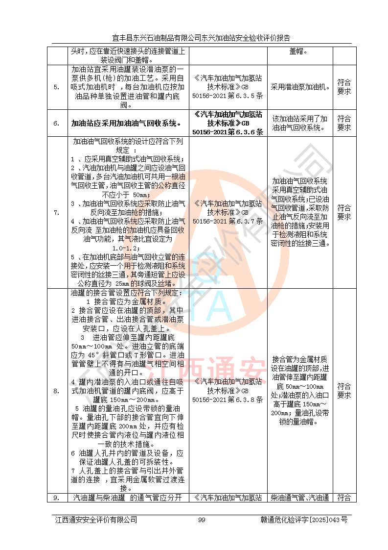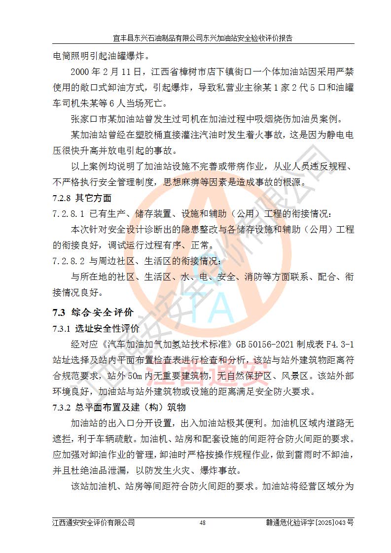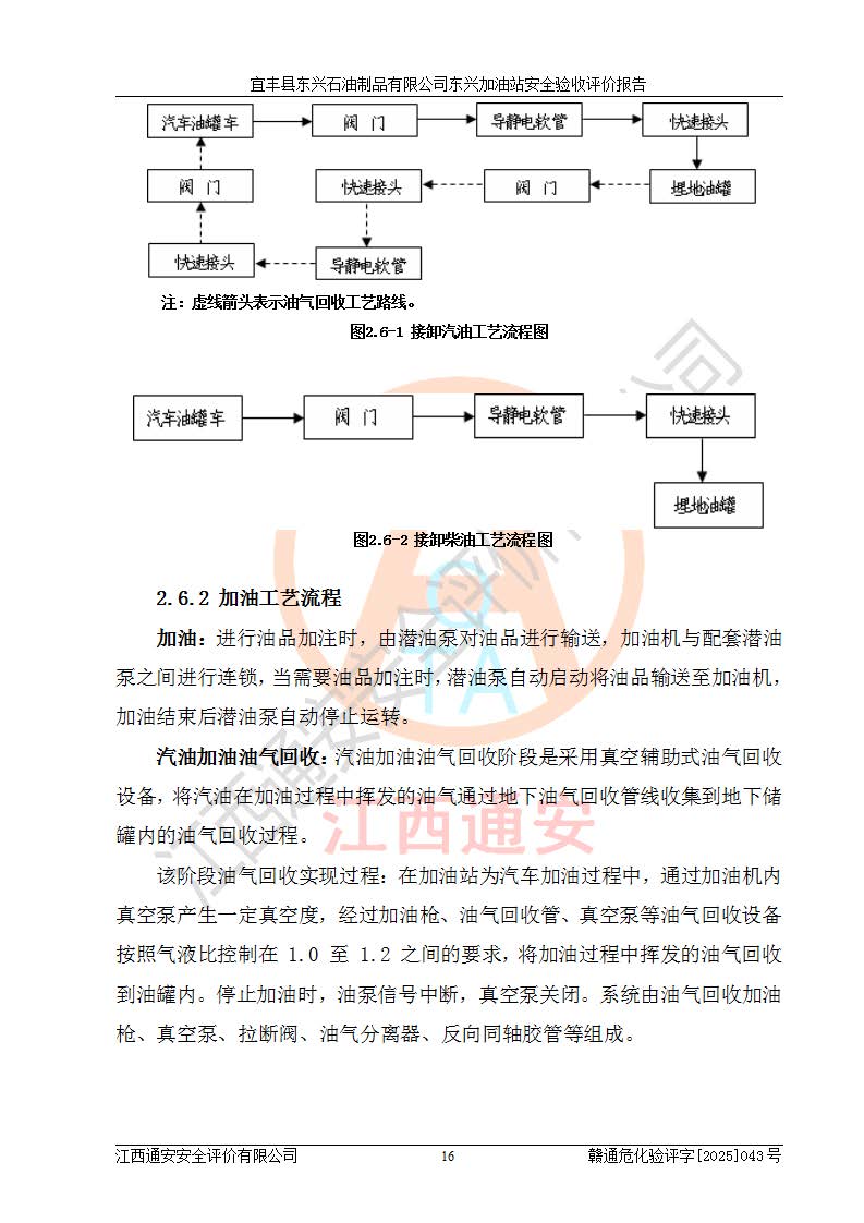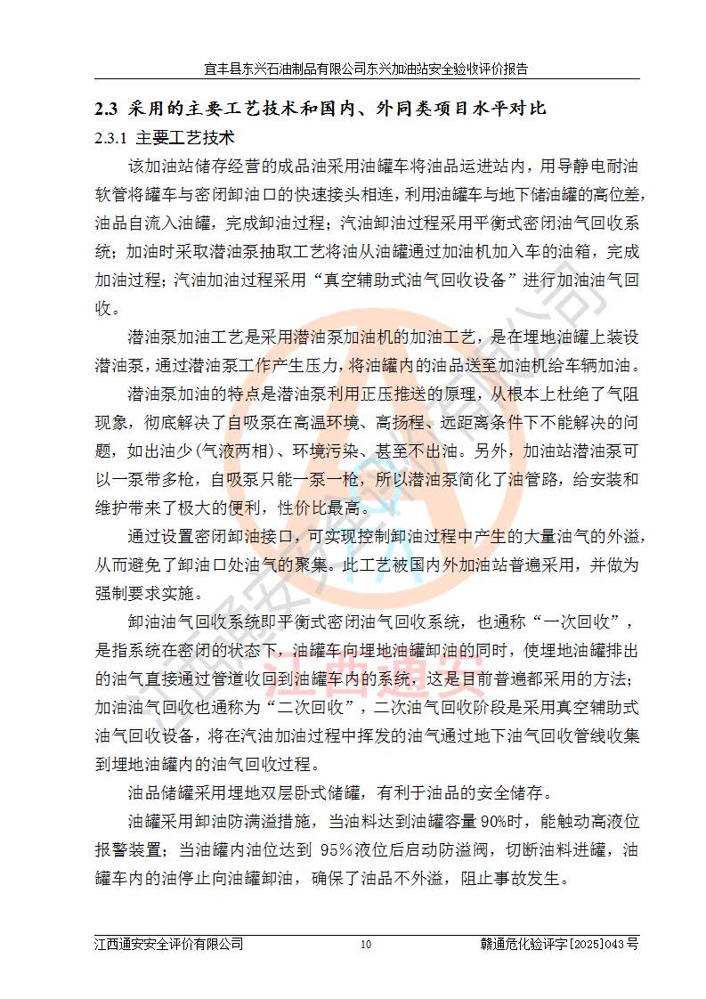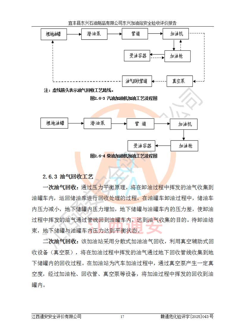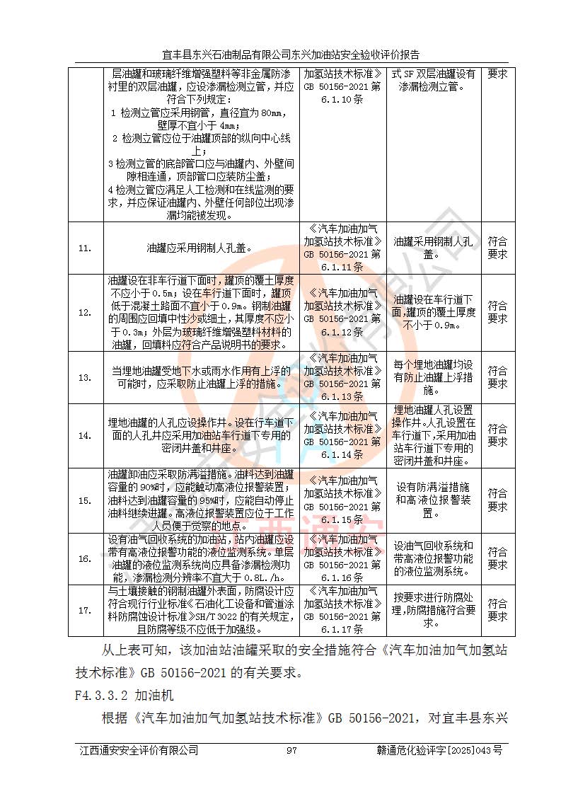 項目簡介 | 宜豐縣東興石油制品有限公司東興加油站(以下簡稱“該加油站”)成立于2013年10月23日,營業(yè)場所位于宜豐縣沿山大道以北流源村元形組村民建房點以東,法定**人為張凱軍。該加油站統(tǒng)一社會信用代碼為91360924MA35HD1D8P,屬于有限責任制公司分公司(自然人投資或控股)。經(jīng)營范圍:汽油、柴油、潤滑油零售,洗車,煙、預(yù)包裝食品零售。 該加油站油罐區(qū)設(shè)有4個埋地臥式儲罐,其中1臺50m3的0#柴油儲罐,1臺50m3的92#汽油儲罐,1臺30m3的92#汽油儲罐,1臺30m3的95#汽油儲罐,柴油罐容積折半計入油罐總?cè)莘e,折算后總?cè)莘e為135m3,屬于二級加油站,站內(nèi)設(shè)有油氣回收系統(tǒng)。油罐采用直埋鋪設(shè),并設(shè)抗浮基礎(chǔ)。加油區(qū)設(shè)4個加油島,采用2臺四槍加油機,2臺雙槍加油機。該加油站于2023年2月9日經(jīng)宜豐縣應(yīng)急管理局核準,換發(fā)了新的《危險化學(xué)品經(jīng)營許可證》,證書編號:贛宜安經(jīng)油字[2022]36092401號,許可范圍:汽油、柴油。**期限為2022年9月12日至2025年9月11日。 根據(jù)《危險化學(xué)品安全管理條例》(經(jīng)***令第344號發(fā)布,***令第591號、***令第645號修改),《危險化學(xué)品經(jīng)營許可證管理辦法》(2012年7月17日**安全生產(chǎn)監(jiān)督管理總局令第55號公布,自2012年9月1日起施行;根據(jù)2015年5月27日**安全生產(chǎn)監(jiān)督管理總局令第79號修正)等法律法規(guī)及文件要求,該加油站的危險化學(xué)品經(jīng)營許可證三年**期即將到期,需要重新進行安全現(xiàn)狀評價。由于該加油站2013年建成投運,安全設(shè)施“三同時”資料不全,根據(jù)《江西省應(yīng)急管理廳辦公室關(guān)于規(guī)范危險化學(xué)品經(jīng)營許可工作的通知》(贛應(yīng)急辦字〔2025〕58號)等要求,危險化學(xué)品經(jīng)營企業(yè)應(yīng)在一個延期換證周期內(nèi)進行安全設(shè)計診斷,并根據(jù)診斷結(jié)論開展安全設(shè)施設(shè)計整改,驗收通過后方可延期換證。該加油站于2025年6月委托黑龍江龍維化學(xué)工程設(shè)計有限公司(具有化工石化醫(yī)藥行業(yè)專業(yè)**工程設(shè)計資質(zhì))編制了《宜豐縣東興石油制品有限公司東興加油站安全設(shè)計診斷報告》,并通過了專家評審。根據(jù)該安全設(shè)計診斷報告提出的安全隱患及整改建議,該加油站及時進行了整改,目前已整改到位,具備安全設(shè)施驗收條件。 | ||||