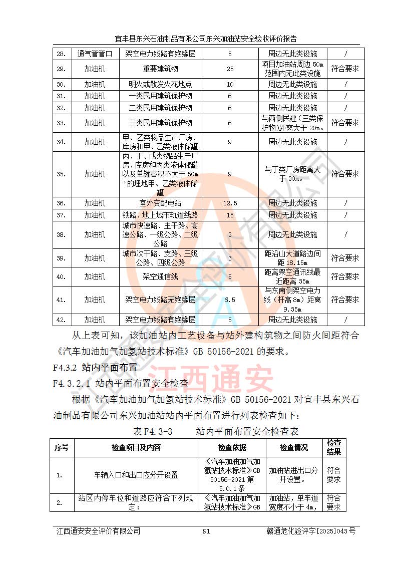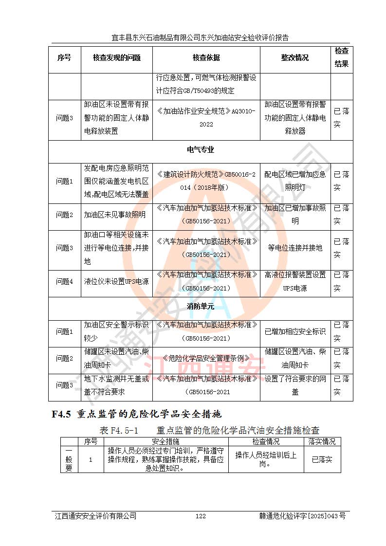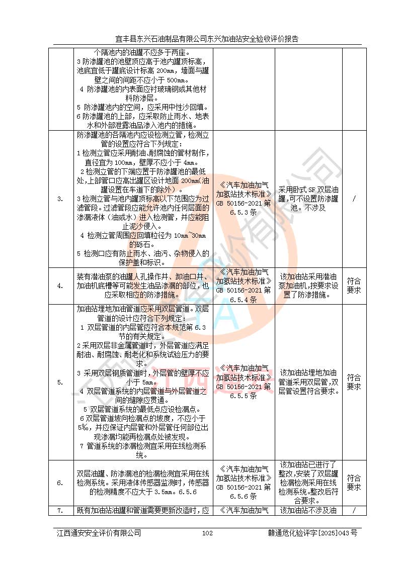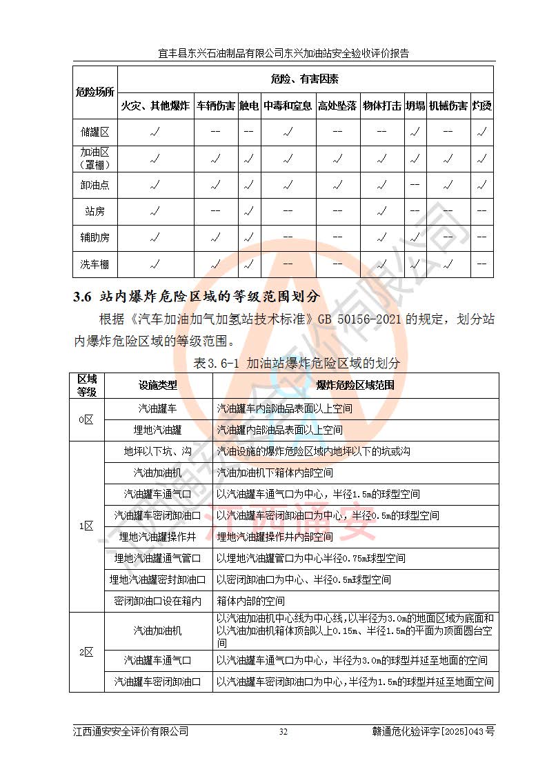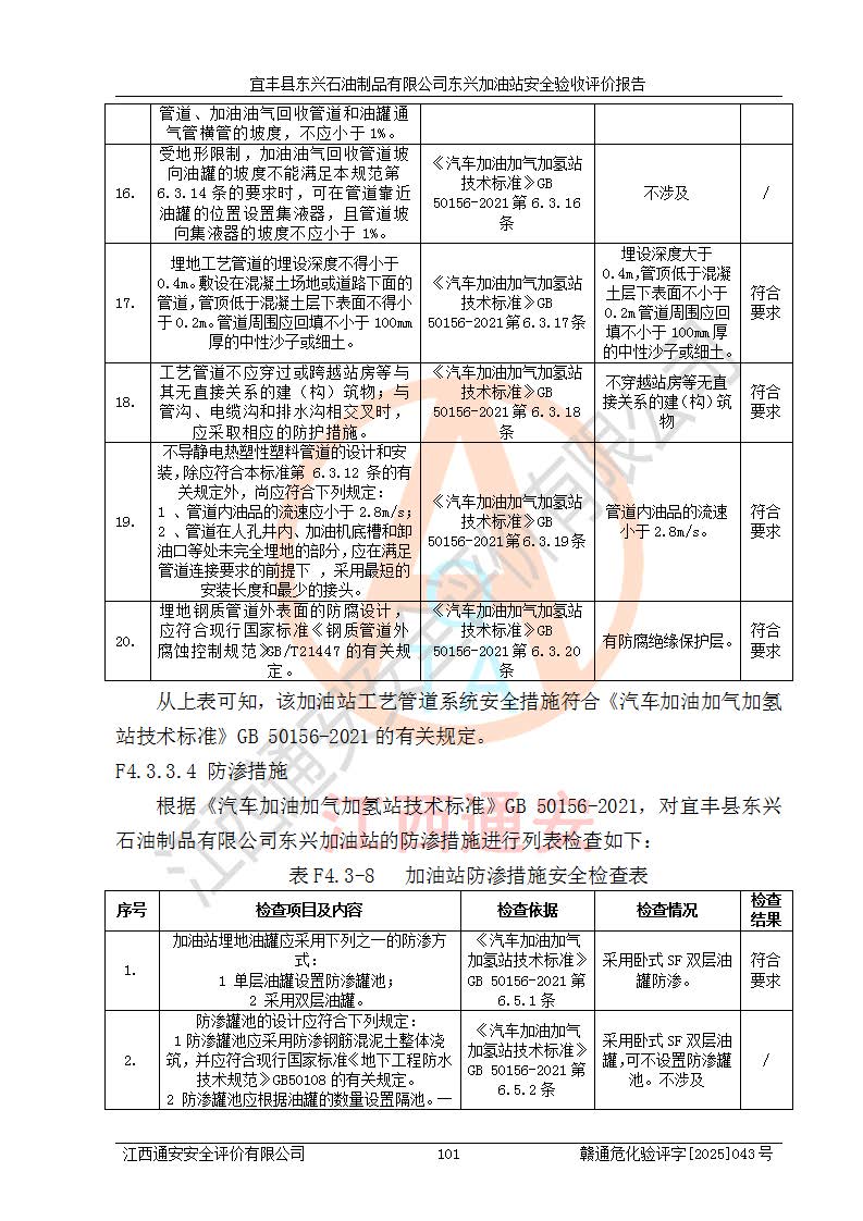 項目簡介 | 宜豐縣東興石油制品有限公司東興加油站(以下簡稱“該加油站”)成立于2013年10月23日,營業(yè)場所位于宜豐縣沿山大道以北流源村元形組村民建房點以東,法定**人為張凱軍。該加油站統(tǒng)一社會信用代碼為91360924MA35HD1D8P,屬于有限責任制公司分公司(自然人投資或控股)。經(jīng)營范圍:汽油、柴油、潤滑油零售,洗車,煙、預(yù)包裝食品零售。 該加油站油罐區(qū)設(shè)有4個埋地臥式儲罐,其中1臺50m3的0#柴油儲罐,1臺50m3的92#汽油儲罐,1臺30m3的92#汽油儲罐,1臺30m3的95#汽油儲罐,柴油罐容積折半計入油罐總?cè)莘e,折算后總?cè)莘e為135m3,屬于二級加油站,站內(nèi)設(shè)有油氣回收系統(tǒng)。油罐采用直埋鋪設(shè),并設(shè)抗浮基礎(chǔ)。加油區(qū)設(shè)4個加油島,采用2臺四槍加油機,2臺雙槍加油機。該加油站于2023年2月9日經(jīng)宜豐縣應(yīng)急管理局核準,換發(fā)了新的《危險化學(xué)品經(jīng)營許可證》,證書編號:贛宜安經(jīng)油字[2022]36092401號,許可范圍:汽油、柴油。**期限為2022年9月12日至2025年9月11日。 根據(jù)《危險化學(xué)品安全管理條例》(經(jīng)***令第344號發(fā)布,***令第591號、***令第645號修改),《危險化學(xué)品經(jīng)營許可證管理辦法》(2012年7月17日**安全生產(chǎn)監(jiān)督管理總局令第55號公布,自2012年9月1日起施行;根據(jù)2015年5月27日**安全生產(chǎn)監(jiān)督管理總局令第79號修正)等法律法規(guī)及文件要求,該加油站的危險化學(xué)品經(jīng)營許可證三年**期即將到期,需要重新進行安全現(xiàn)狀評價。由于該加油站2013年建成投運,安全設(shè)施“三同時”資料不全,根據(jù)《江西省應(yīng)急管理廳辦公室關(guān)于規(guī)范危險化學(xué)品經(jīng)營許可工作的通知》(贛應(yīng)急辦字〔2025〕58號)等要求,危險化學(xué)品經(jīng)營企業(yè)應(yīng)在一個延期換證周期內(nèi)進行安全設(shè)計診斷,并根據(jù)診斷結(jié)論開展安全設(shè)施設(shè)計整改,驗收通過后方可延期換證。該加油站于2025年6月委托黑龍江龍維化學(xué)工程設(shè)計有限公司(具有化工石化醫(yī)藥行業(yè)專業(yè)**工程設(shè)計資質(zhì))編制了《宜豐縣東興石油制品有限公司東興加油站安全設(shè)計診斷報告》,并通過了專家評審。根據(jù)該安全設(shè)計診斷報告提出的安全隱患及整改建議,該加油站及時進行了整改,目前已整改到位,具備安全設(shè)施驗收條件。 | ||||