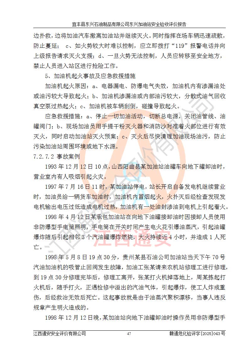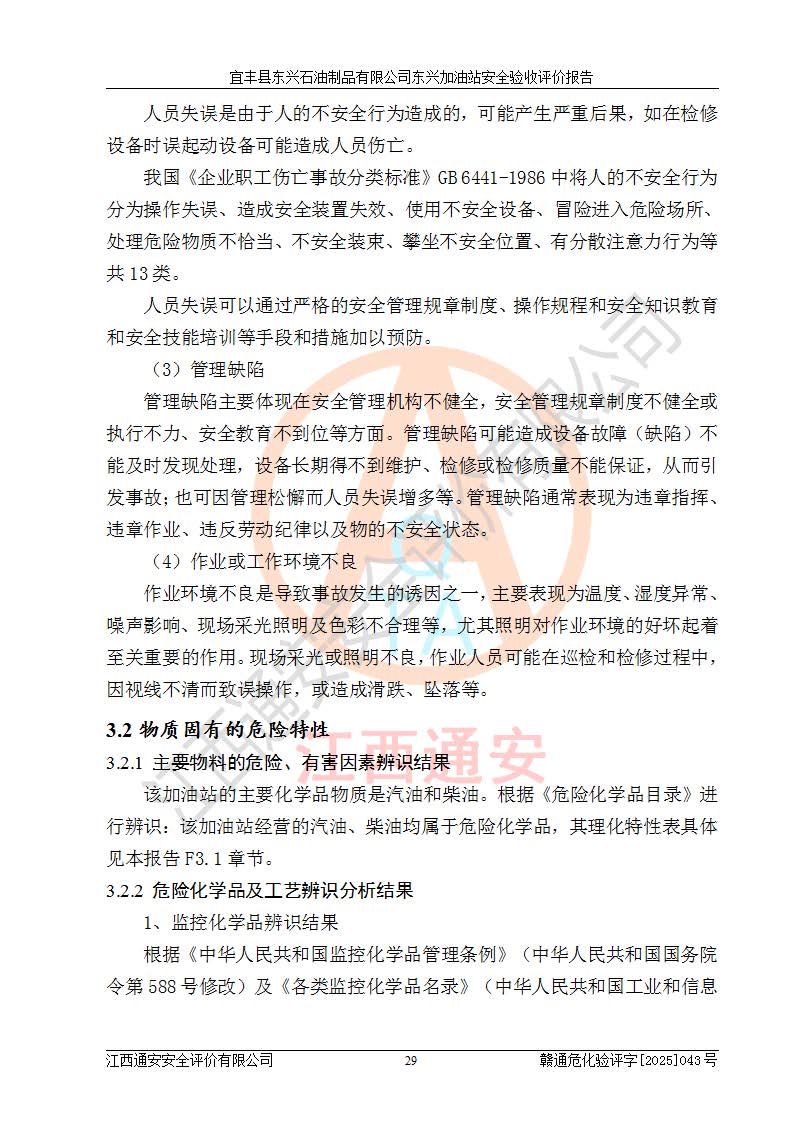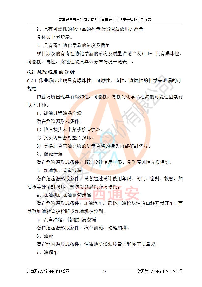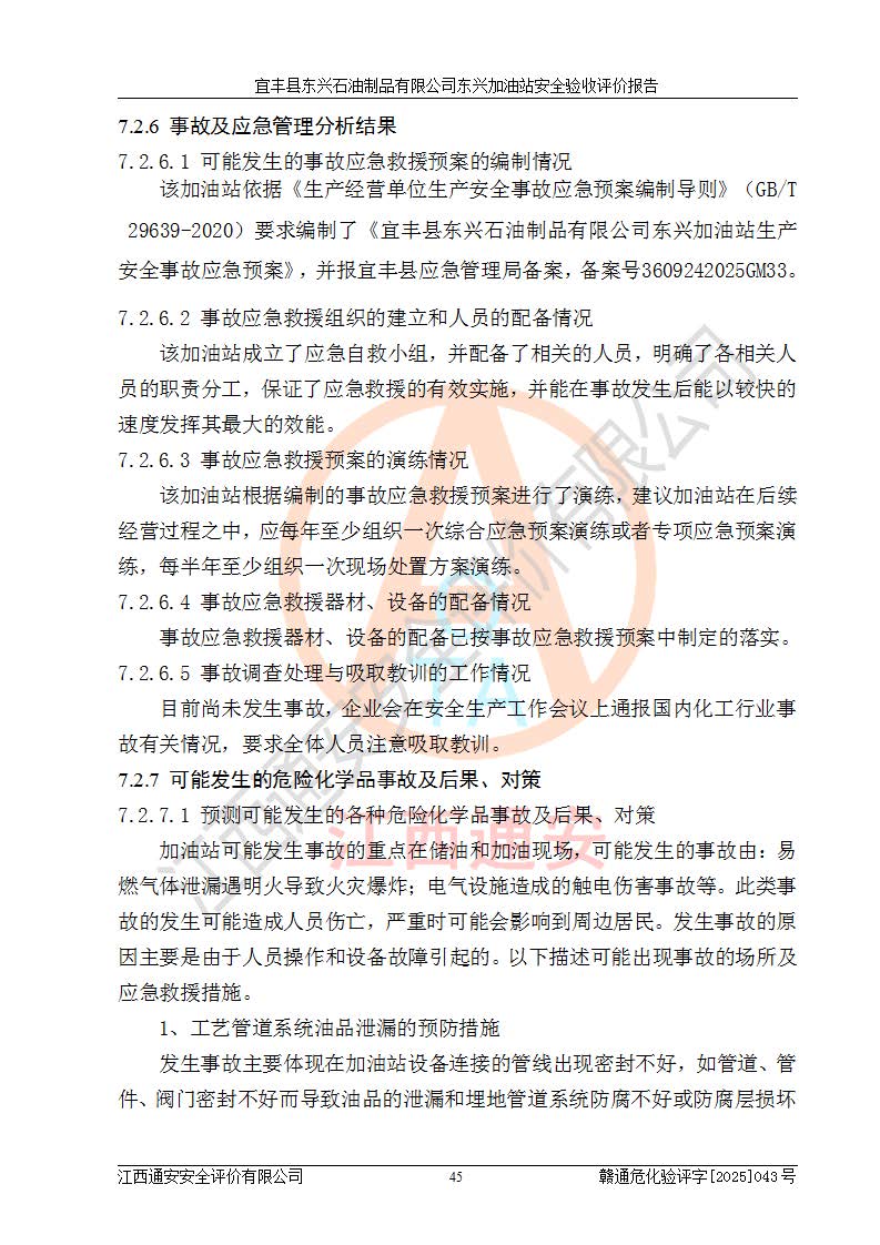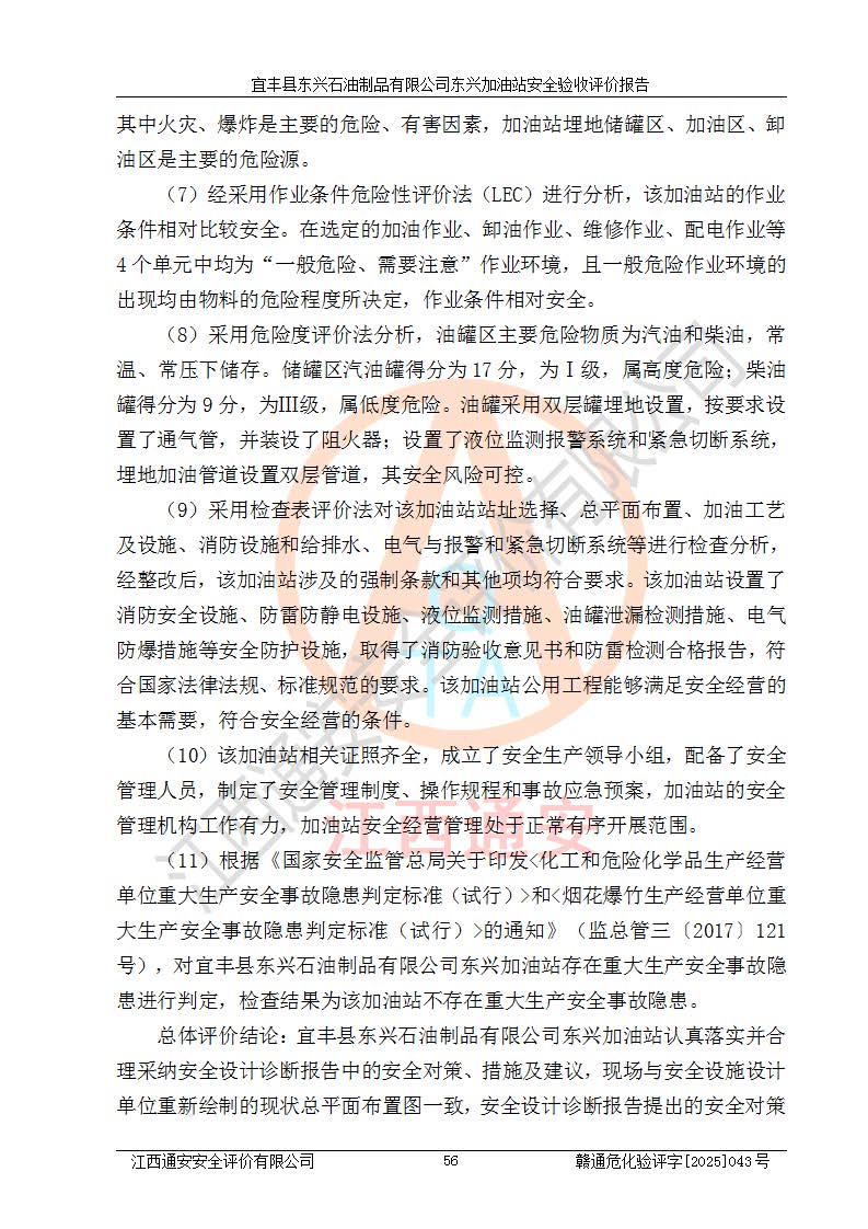 其它 | 一、安全狀況綜合評述 宜豐縣東興石油制品有限公司東興加油站位于宜豐縣沿山大道以北流源村元形組村民建房點以東,從事成品油(汽油、柴油)零售業(yè)務(wù),屬二級加油站。 通過對該加油站建設(shè)項目安全驗收評價,得出以下評價結(jié)論: (1)化學(xué)品、設(shè)備及工藝辨識結(jié)果 經(jīng)辨識,該加油站經(jīng)營、儲存危險化學(xué)品為汽油和柴油,其中汽油屬于重點監(jiān)管危險化學(xué)品、特別管控危險化學(xué)品;該加油站不涉及劇毒化學(xué)品、高毒物品、易制毒化學(xué)品、監(jiān)控化學(xué)品、易制爆化學(xué)品。經(jīng)營、儲存過程中采用的設(shè)備及工藝不屬于淘汰落后設(shè)備及工藝、不涉及危險化工工藝,生產(chǎn)和儲存單元均不構(gòu)成危險化學(xué)品重大危險源。 (2)建設(shè)項目所在地的安全條件和周邊的安全間距 該站東南側(cè)為沿山大道和架空電力線,西南側(cè)和西北側(cè)為居民建筑,北側(cè)為丁類廠房。加油站為二級加油站,設(shè)有油氣回收系統(tǒng),站外50米范圍內(nèi)無重要公共建筑物、明火設(shè)備和甲、乙類生產(chǎn)及儲存設(shè)施,站區(qū)內(nèi)加油設(shè)施與周邊建構(gòu)筑物之間的距離能夠滿足《汽車加油加氣加氫站技術(shù)標準》GB50156-2021 和《建筑設(shè)計防火規(guī)范》GB50016-2014(2018 年版)以及相關(guān)**規(guī)范要求。本報告認為該加油站建設(shè)項目周邊對加油站的影響以及建設(shè)項目所在地的自然條件對建設(shè)項目投入使用后的影響均較小,該加油站具備標準規(guī)范所要求的安全條件。 (3)該項目安全設(shè)計診斷報告的采納情況 該加油站安全設(shè)計診斷報告核查的問題(共17項)及整改建議均已采納,經(jīng)評價組現(xiàn)場復(fù)核,均已整改完成。該加油站整改過程工作進展順利,處于正常狀態(tài)。經(jīng)查閱資料和分析評價,認為本項目技術(shù)、工藝和裝置、設(shè)備(設(shè)施)的安全、可靠性和安全水平符合**相應(yīng)安全標準的要求。 (4)該加油站儲存經(jīng)營的汽油屬于重點監(jiān)管的危險化學(xué)品和特別控危險化學(xué)品,該加油站在后續(xù)的經(jīng)營中應(yīng)按照相關(guān)規(guī)范和要求加強安全管理,要求油品運輸單位強化運輸管理、自身加強儲存定制化管理。 (5)該加油站經(jīng)營過程中存在的危險有害因素為:①火災(zāi)、爆炸;② 中毒和窒息;③**傷害;④觸電;⑤高處墜落;⑥物體打擊、⑦其他傷害。 其中火災(zāi)、爆炸是主要的危險、有害因素,加油站埋地儲罐區(qū)、加油區(qū)、卸 油區(qū)是主要的危險源。 (7)經(jīng)采用作業(yè)條件危險性評價法(LEC)進行分析,該加油站的作業(yè)條件相對比較安全。在選定的加油作業(yè)、卸油作業(yè)、維修作業(yè)、配電作業(yè)等4個單元中均為“一般危險、需要注意”作業(yè)環(huán)境,且一般危險作業(yè)環(huán)境的出現(xiàn)均由物料的危險程度所決定,作業(yè)條件相對安全。 (8)采用危險度評價法分析,油罐區(qū)主要危險物質(zhì)為汽油和柴油,常溫、常壓下儲存。儲罐區(qū)汽油罐為Ⅰ級,屬高度危險;柴油罐得分為Ⅲ級,屬低度危險。油罐采用雙層罐埋地設(shè)置,按要求設(shè)置了通氣管,并裝設(shè)了阻火器;設(shè)置了液位監(jiān)測報警系統(tǒng)和緊急切斷系統(tǒng),埋地加油管道設(shè)置雙層管道,其安全風險可控。 (9)采用檢查表評價法對該加油站站址選擇、總平面布置、加油工藝及設(shè)施、消防設(shè)施和給排水、電氣與報警和緊急切斷系統(tǒng)等進行檢查分析,經(jīng)整改后,該加油站涉及的強制條款和其他項均符合要求。該加油站設(shè)置了消防安全設(shè)施、防雷防靜電設(shè)施、液位監(jiān)測措施、油罐泄漏檢測措施、電氣防爆措施等安全防護設(shè)施,取得了消防驗收意見書和防雷檢測合格報告,符合**法律法規(guī)、標準規(guī)范的要求。該加油站公用工程能夠滿足安全經(jīng)營的基本需要,符合安全經(jīng)營的條件。 (10)該加油站相關(guān)證照齊全,成立了安全生產(chǎn)**小組,配備了安全管理人員,制定了安全管理制度、操作規(guī)程和事故應(yīng)急預(yù)案,加油站的安全管理機構(gòu)工作有力,加油站安全經(jīng)營管理處于正常有序開展范圍。 (11)對宜豐縣東興石油制品有限公司東興加油站存在重大生產(chǎn)安全事故隱患進行判定,檢查結(jié)果為該加油站不存在重大生產(chǎn)安全事故隱患。 總體評價結(jié)論:宜豐縣東興石油制品有限公司東興加油站認真落實并合理采納安全設(shè)計診斷報告中的安全對策、措施及建議,現(xiàn)場與安全設(shè)施設(shè)計單位重新繪制的現(xiàn)狀總平面布置圖一致,安全設(shè)計診斷報告提出的安全對策措施已落實到位。對潛在的危險、 有害因素采取了安全對策措施,工程潛在的危險、有害因素可得到**控制, 風險在**控制和可接受范圍內(nèi)。 | ||||