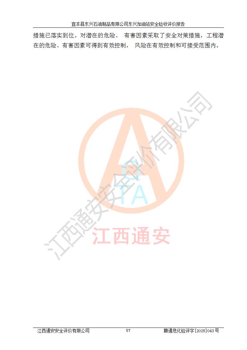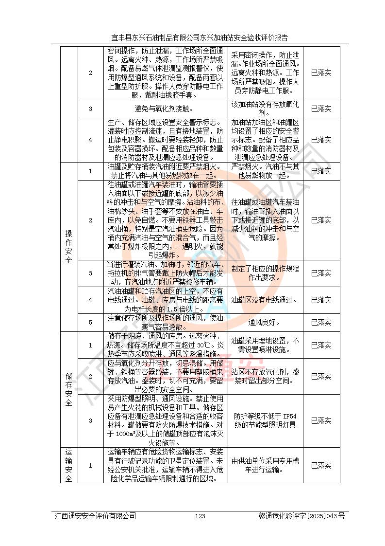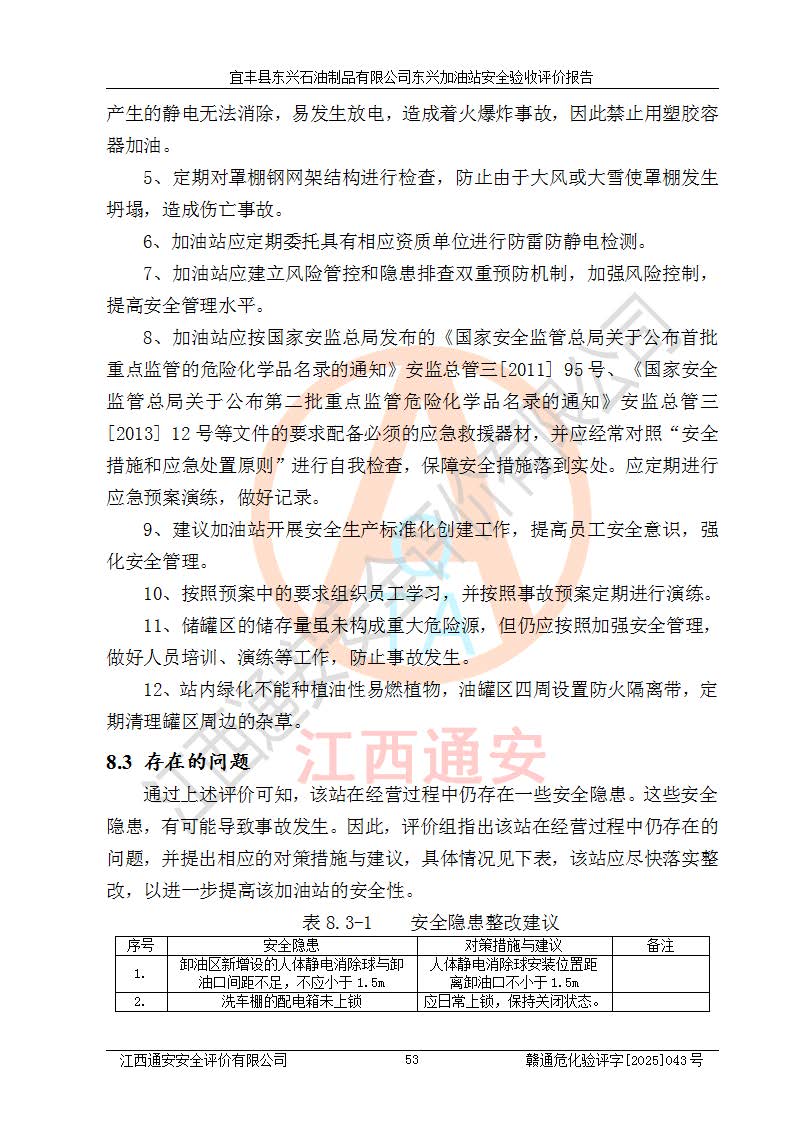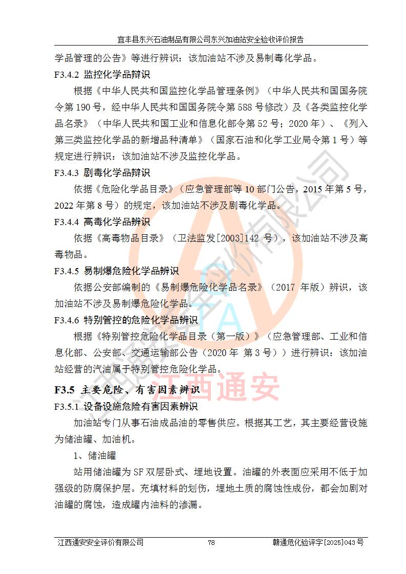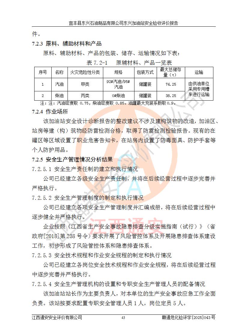 其它 | 一、安全狀況綜合評述 宜豐縣東興石油制品有限公司東興加油站位于宜豐縣沿山大道以北流源村元形組村民建房點以東,從事成品油(汽油、柴油)零售業(yè)務(wù),屬二級加油站。 通過對該加油站建設(shè)項目安全驗收評價,得出以下評價結(jié)論: (1)化學(xué)品、設(shè)備及工藝辨識結(jié)果 經(jīng)辨識,該加油站經(jīng)營、儲存危險化學(xué)品為汽油和柴油,其中汽油屬于重點監(jiān)管危險化學(xué)品、特別管控危險化學(xué)品;該加油站不涉及劇毒化學(xué)品、高毒物品、易制毒化學(xué)品、監(jiān)控化學(xué)品、易制爆化學(xué)品。經(jīng)營、儲存過程中采用的設(shè)備及工藝不屬于淘汰落后設(shè)備及工藝、不涉及危險化工工藝,生產(chǎn)和儲存單元均不構(gòu)成危險化學(xué)品重大危險源。 (2)建設(shè)項目所在地的安全條件和周邊的安全間距 該站東南側(cè)為沿山大道和架空電力線,西南側(cè)和西北側(cè)為居民建筑,北側(cè)為丁類廠房。加油站為二級加油站,設(shè)有油氣回收系統(tǒng),站外50米范圍內(nèi)無重要公共建筑物、明火設(shè)備和甲、乙類生產(chǎn)及儲存設(shè)施,站區(qū)內(nèi)加油設(shè)施與周邊建構(gòu)筑物之間的距離能夠滿足《汽車加油加氣加氫站技術(shù)標準》GB50156-2021 和《建筑設(shè)計防火規(guī)范》GB50016-2014(2018 年版)以及相關(guān)**規(guī)范要求。本報告認為該加油站建設(shè)項目周邊對加油站的影響以及建設(shè)項目所在地的自然條件對建設(shè)項目投入使用后的影響均較小,該加油站具備標準規(guī)范所要求的安全條件。 (3)該項目安全設(shè)計診斷報告的采納情況 該加油站安全設(shè)計診斷報告核查的問題(共17項)及整改建議均已采納,經(jīng)評價組現(xiàn)場復(fù)核,均已整改完成。該加油站整改過程工作進展順利,處于正常狀態(tài)。經(jīng)查閱資料和分析評價,認為本項目技術(shù)、工藝和裝置、設(shè)備(設(shè)施)的安全、可靠性和安全水平符合**相應(yīng)安全標準的要求。 (4)該加油站儲存經(jīng)營的汽油屬于重點監(jiān)管的危險化學(xué)品和特別控危險化學(xué)品,該加油站在后續(xù)的經(jīng)營中應(yīng)按照相關(guān)規(guī)范和要求加強安全管理,要求油品運輸單位強化運輸管理、自身加強儲存定制化管理。 (5)該加油站經(jīng)營過程中存在的危險有害因素為:①火災(zāi)、爆炸;② 中毒和窒息;③**傷害;④觸電;⑤高處墜落;⑥物體打擊、⑦其他傷害。 其中火災(zāi)、爆炸是主要的危險、有害因素,加油站埋地儲罐區(qū)、加油區(qū)、卸 油區(qū)是主要的危險源。 (7)經(jīng)采用作業(yè)條件危險性評價法(LEC)進行分析,該加油站的作業(yè)條件相對比較安全。在選定的加油作業(yè)、卸油作業(yè)、維修作業(yè)、配電作業(yè)等4個單元中均為“一般危險、需要注意”作業(yè)環(huán)境,且一般危險作業(yè)環(huán)境的出現(xiàn)均由物料的危險程度所決定,作業(yè)條件相對安全。 (8)采用危險度評價法分析,油罐區(qū)主要危險物質(zhì)為汽油和柴油,常溫、常壓下儲存。儲罐區(qū)汽油罐為Ⅰ級,屬高度危險;柴油罐得分為Ⅲ級,屬低度危險。油罐采用雙層罐埋地設(shè)置,按要求設(shè)置了通氣管,并裝設(shè)了阻火器;設(shè)置了液位監(jiān)測報警系統(tǒng)和緊急切斷系統(tǒng),埋地加油管道設(shè)置雙層管道,其安全風險可控。 (9)采用檢查表評價法對該加油站站址選擇、總平面布置、加油工藝及設(shè)施、消防設(shè)施和給排水、電氣與報警和緊急切斷系統(tǒng)等進行檢查分析,經(jīng)整改后,該加油站涉及的強制條款和其他項均符合要求。該加油站設(shè)置了消防安全設(shè)施、防雷防靜電設(shè)施、液位監(jiān)測措施、油罐泄漏檢測措施、電氣防爆措施等安全防護設(shè)施,取得了消防驗收意見書和防雷檢測合格報告,符合**法律法規(guī)、標準規(guī)范的要求。該加油站公用工程能夠滿足安全經(jīng)營的基本需要,符合安全經(jīng)營的條件。 (10)該加油站相關(guān)證照齊全,成立了安全生產(chǎn)**小組,配備了安全管理人員,制定了安全管理制度、操作規(guī)程和事故應(yīng)急預(yù)案,加油站的安全管理機構(gòu)工作有力,加油站安全經(jīng)營管理處于正常有序開展范圍。 (11)對宜豐縣東興石油制品有限公司東興加油站存在重大生產(chǎn)安全事故隱患進行判定,檢查結(jié)果為該加油站不存在重大生產(chǎn)安全事故隱患。 總體評價結(jié)論:宜豐縣東興石油制品有限公司東興加油站認真落實并合理采納安全設(shè)計診斷報告中的安全對策、措施及建議,現(xiàn)場與安全設(shè)施設(shè)計單位重新繪制的現(xiàn)狀總平面布置圖一致,安全設(shè)計診斷報告提出的安全對策措施已落實到位。對潛在的危險、 有害因素采取了安全對策措施,工程潛在的危險、有害因素可得到**控制, 風險在**控制和可接受范圍內(nèi)。 | ||||