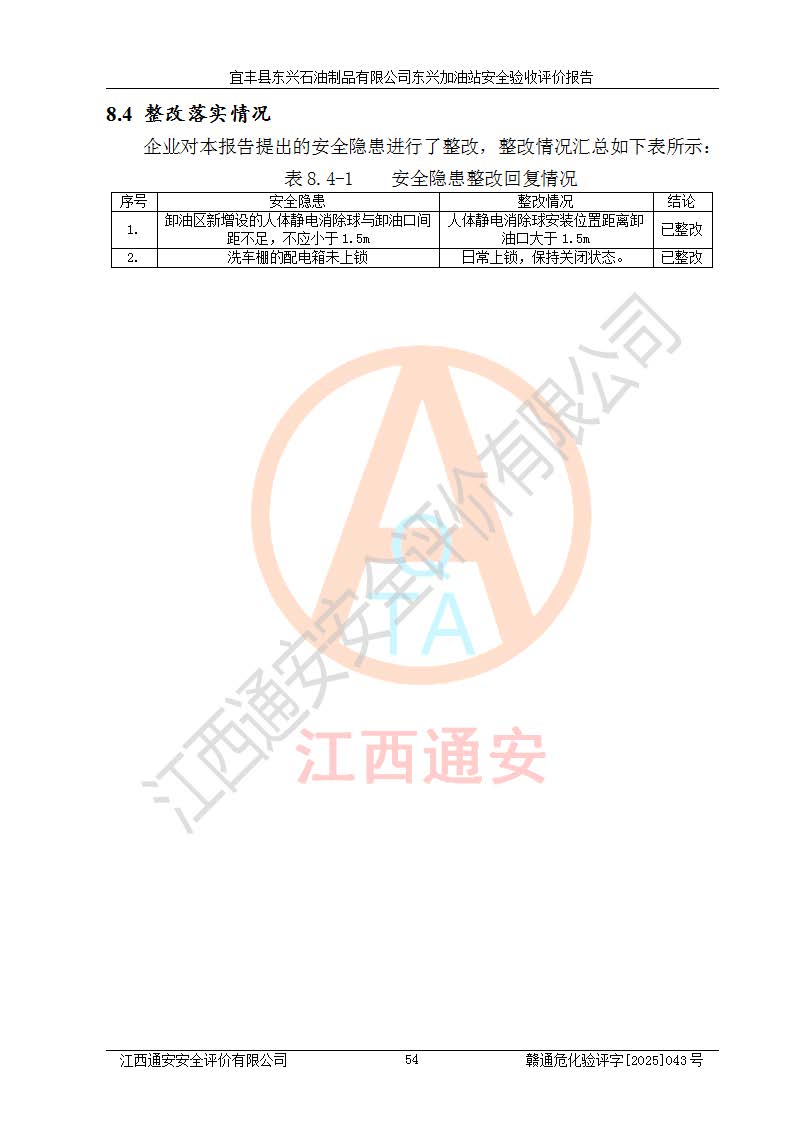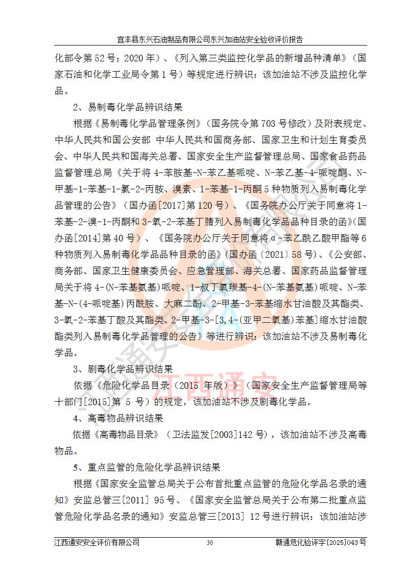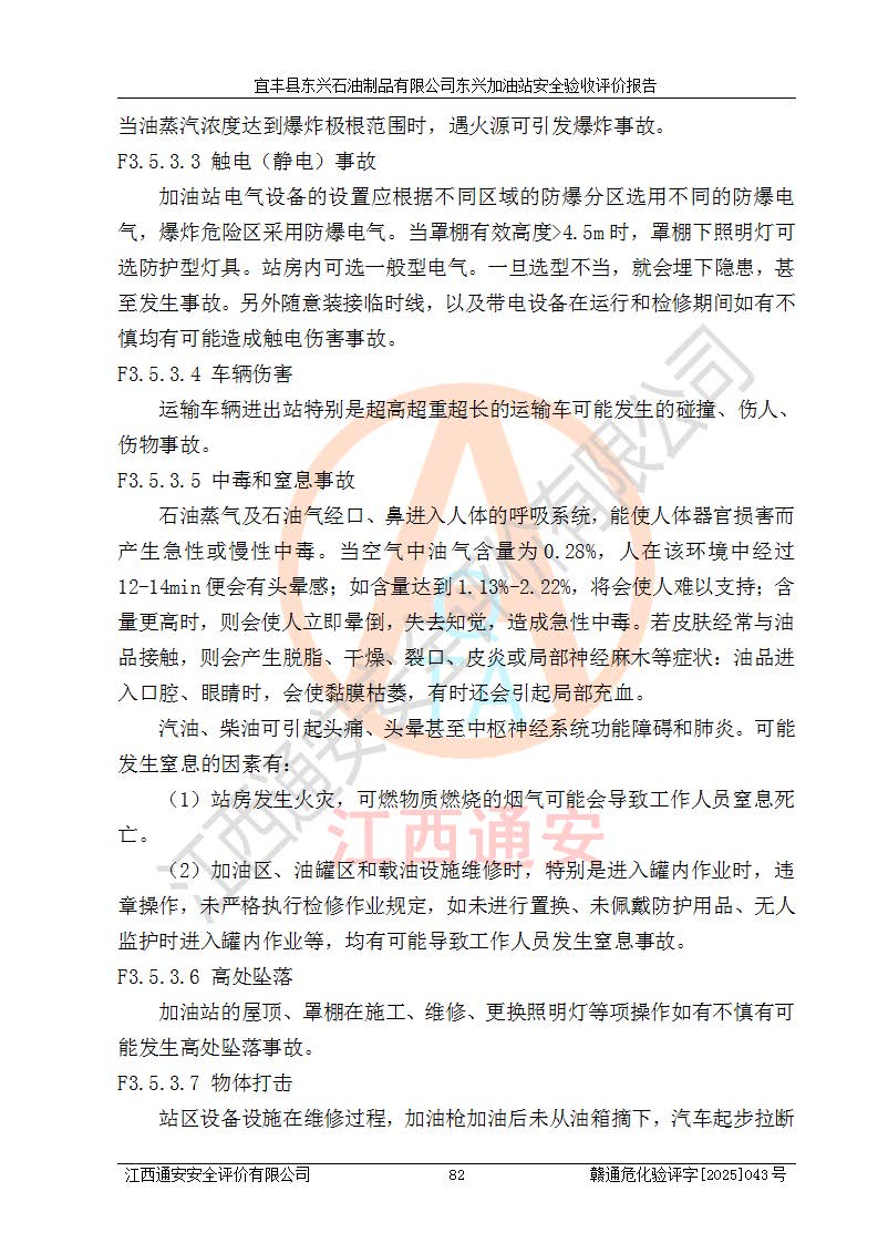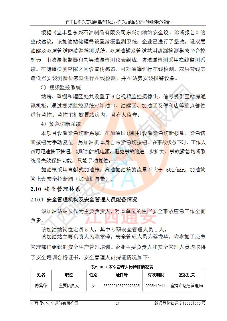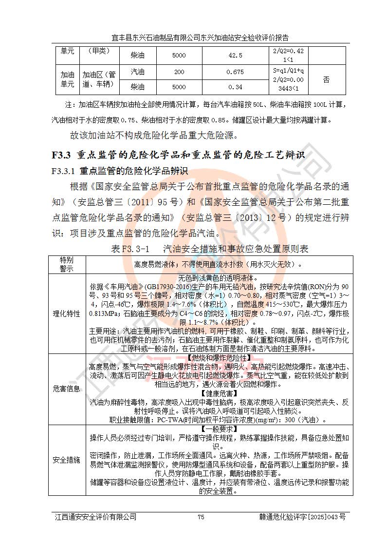 其它 | 一、安全狀況綜合評述 宜豐縣東興石油制品有限公司東興加油站位于宜豐縣沿山大道以北流源村元形組村民建房點以東,從事成品油(汽油、柴油)零售業(yè)務(wù),屬二級加油站。 通過對該加油站建設(shè)項目安全驗收評價,得出以下評價結(jié)論: (1)化學(xué)品、設(shè)備及工藝辨識結(jié)果 經(jīng)辨識,該加油站經(jīng)營、儲存危險化學(xué)品為汽油和柴油,其中汽油屬于重點監(jiān)管危險化學(xué)品、特別管控危險化學(xué)品;該加油站不涉及劇毒化學(xué)品、高毒物品、易制毒化學(xué)品、監(jiān)控化學(xué)品、易制爆化學(xué)品。經(jīng)營、儲存過程中采用的設(shè)備及工藝不屬于淘汰落后設(shè)備及工藝、不涉及危險化工工藝,生產(chǎn)和儲存單元均不構(gòu)成危險化學(xué)品重大危險源。 (2)建設(shè)項目所在地的安全條件和周邊的安全間距 該站東南側(cè)為沿山大道和架空電力線,西南側(cè)和西北側(cè)為居民建筑,北側(cè)為丁類廠房。加油站為二級加油站,設(shè)有油氣回收系統(tǒng),站外50米范圍內(nèi)無重要公共建筑物、明火設(shè)備和甲、乙類生產(chǎn)及儲存設(shè)施,站區(qū)內(nèi)加油設(shè)施與周邊建構(gòu)筑物之間的距離能夠滿足《汽車加油加氣加氫站技術(shù)標準》GB50156-2021 和《建筑設(shè)計防火規(guī)范》GB50016-2014(2018 年版)以及相關(guān)**規(guī)范要求。本報告認為該加油站建設(shè)項目周邊對加油站的影響以及建設(shè)項目所在地的自然條件對建設(shè)項目投入使用后的影響均較小,該加油站具備標準規(guī)范所要求的安全條件。 (3)該項目安全設(shè)計診斷報告的采納情況 該加油站安全設(shè)計診斷報告核查的問題(共17項)及整改建議均已采納,經(jīng)評價組現(xiàn)場復(fù)核,均已整改完成。該加油站整改過程工作進展順利,處于正常狀態(tài)。經(jīng)查閱資料和分析評價,認為本項目技術(shù)、工藝和裝置、設(shè)備(設(shè)施)的安全、可靠性和安全水平符合**相應(yīng)安全標準的要求。 (4)該加油站儲存經(jīng)營的汽油屬于重點監(jiān)管的危險化學(xué)品和特別控危險化學(xué)品,該加油站在后續(xù)的經(jīng)營中應(yīng)按照相關(guān)規(guī)范和要求加強安全管理,要求油品運輸單位強化運輸管理、自身加強儲存定制化管理。 (5)該加油站經(jīng)營過程中存在的危險有害因素為:①火災(zāi)、爆炸;② 中毒和窒息;③**傷害;④觸電;⑤高處墜落;⑥物體打擊、⑦其他傷害。 其中火災(zāi)、爆炸是主要的危險、有害因素,加油站埋地儲罐區(qū)、加油區(qū)、卸 油區(qū)是主要的危險源。 (7)經(jīng)采用作業(yè)條件危險性評價法(LEC)進行分析,該加油站的作業(yè)條件相對比較安全。在選定的加油作業(yè)、卸油作業(yè)、維修作業(yè)、配電作業(yè)等4個單元中均為“一般危險、需要注意”作業(yè)環(huán)境,且一般危險作業(yè)環(huán)境的出現(xiàn)均由物料的危險程度所決定,作業(yè)條件相對安全。 (8)采用危險度評價法分析,油罐區(qū)主要危險物質(zhì)為汽油和柴油,常溫、常壓下儲存。儲罐區(qū)汽油罐為Ⅰ級,屬高度危險;柴油罐得分為Ⅲ級,屬低度危險。油罐采用雙層罐埋地設(shè)置,按要求設(shè)置了通氣管,并裝設(shè)了阻火器;設(shè)置了液位監(jiān)測報警系統(tǒng)和緊急切斷系統(tǒng),埋地加油管道設(shè)置雙層管道,其安全風險可控。 (9)采用檢查表評價法對該加油站站址選擇、總平面布置、加油工藝及設(shè)施、消防設(shè)施和給排水、電氣與報警和緊急切斷系統(tǒng)等進行檢查分析,經(jīng)整改后,該加油站涉及的強制條款和其他項均符合要求。該加油站設(shè)置了消防安全設(shè)施、防雷防靜電設(shè)施、液位監(jiān)測措施、油罐泄漏檢測措施、電氣防爆措施等安全防護設(shè)施,取得了消防驗收意見書和防雷檢測合格報告,符合**法律法規(guī)、標準規(guī)范的要求。該加油站公用工程能夠滿足安全經(jīng)營的基本需要,符合安全經(jīng)營的條件。 (10)該加油站相關(guān)證照齊全,成立了安全生產(chǎn)**小組,配備了安全管理人員,制定了安全管理制度、操作規(guī)程和事故應(yīng)急預(yù)案,加油站的安全管理機構(gòu)工作有力,加油站安全經(jīng)營管理處于正常有序開展范圍。 (11)對宜豐縣東興石油制品有限公司東興加油站存在重大生產(chǎn)安全事故隱患進行判定,檢查結(jié)果為該加油站不存在重大生產(chǎn)安全事故隱患。 總體評價結(jié)論:宜豐縣東興石油制品有限公司東興加油站認真落實并合理采納安全設(shè)計診斷報告中的安全對策、措施及建議,現(xiàn)場與安全設(shè)施設(shè)計單位重新繪制的現(xiàn)狀總平面布置圖一致,安全設(shè)計診斷報告提出的安全對策措施已落實到位。對潛在的危險、 有害因素采取了安全對策措施,工程潛在的危險、有害因素可得到**控制, 風險在**控制和可接受范圍內(nèi)。 | ||||
