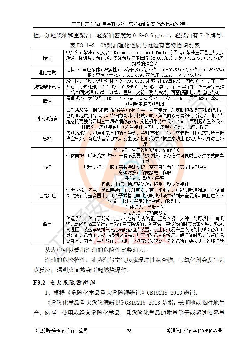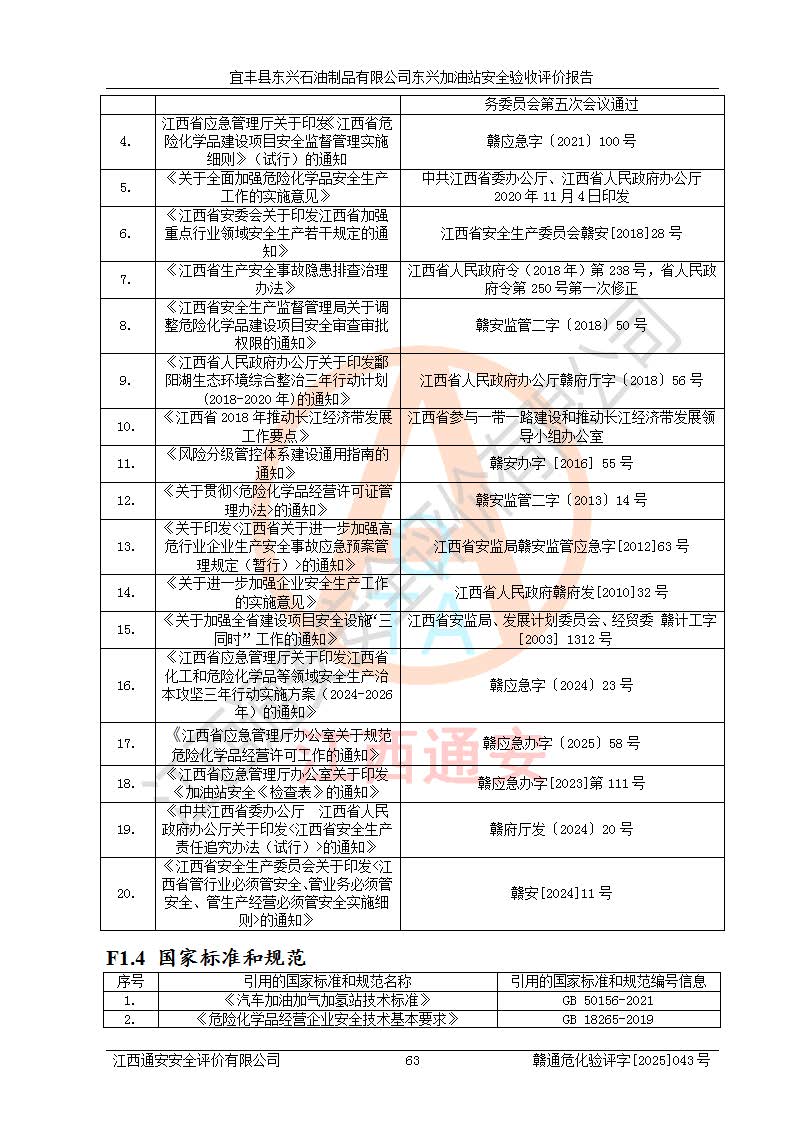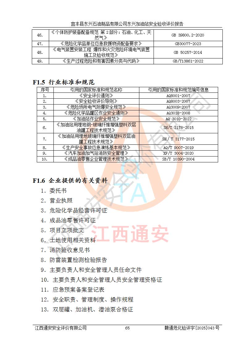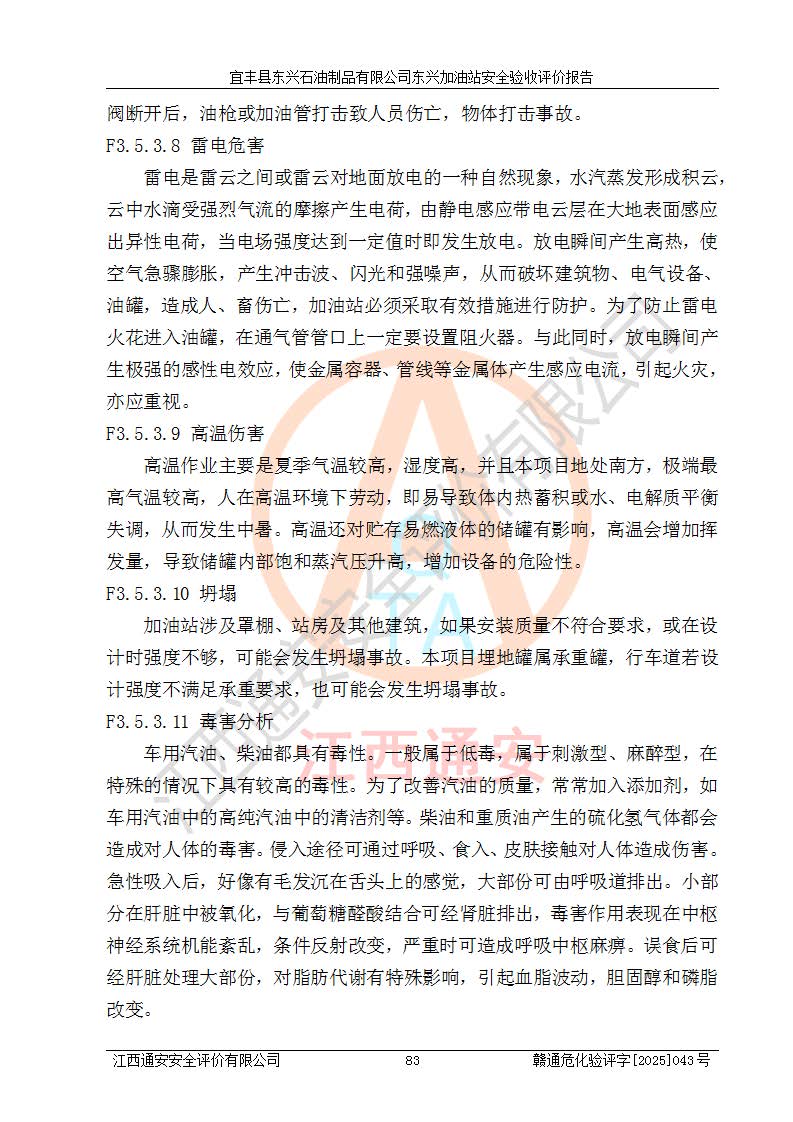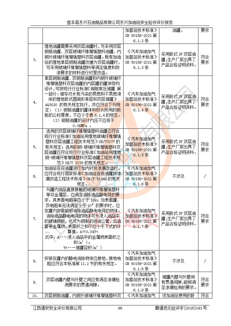 主要任務(wù) | 本評價報告主要針對評價范圍內(nèi)汽油、柴油儲存經(jīng)營過程所涉及的危險、有害因素及重大危險源等進行辨識與分析,根據(jù)相應(yīng)法律、法規(guī)、標準的要求檢查安全設(shè)施的配置及相關(guān)檢測檢驗情況及其符合性,檢查公用工程及輔助設(shè)施的配套性,審核安全生產(chǎn)管理機構(gòu)、制度、人員培訓(xùn)、設(shè)備管理、操作規(guī)程、應(yīng)急預(yù)案及勞動防護用品的配備等,對該項目安全設(shè)施及安全措施進行符合性評價,并在此基礎(chǔ)上提出相應(yīng)的安全對策措施及建議。 | ||||