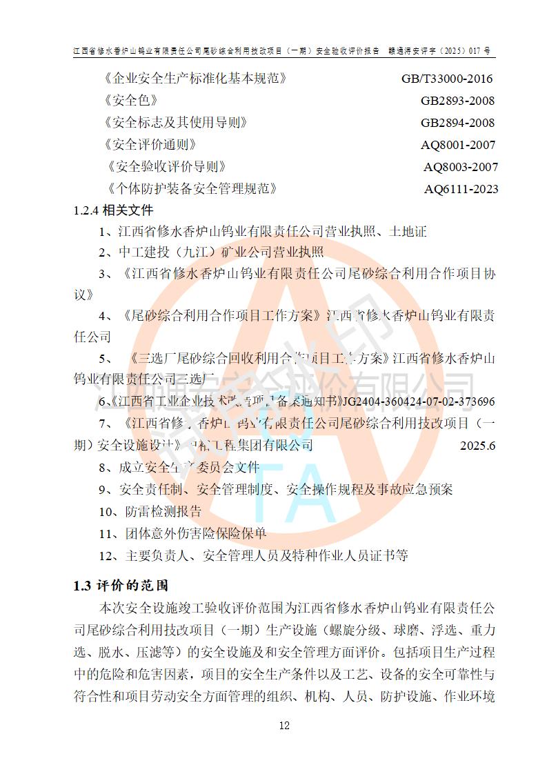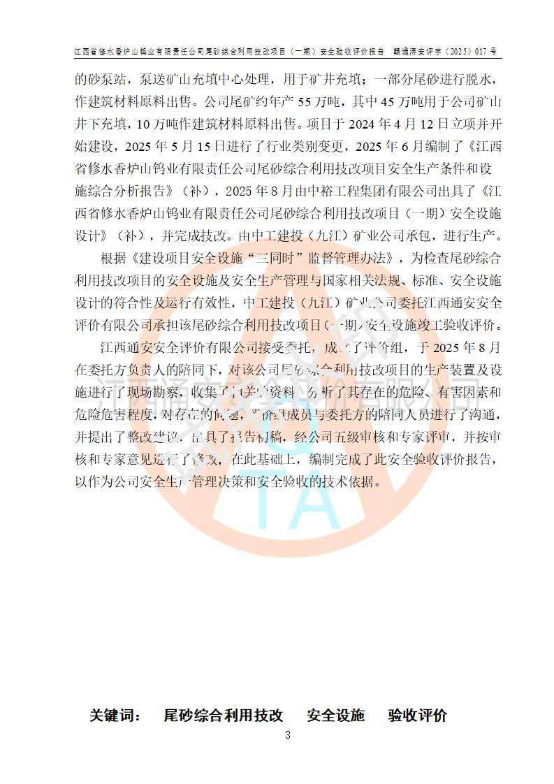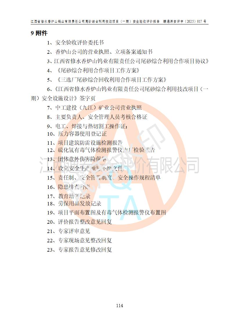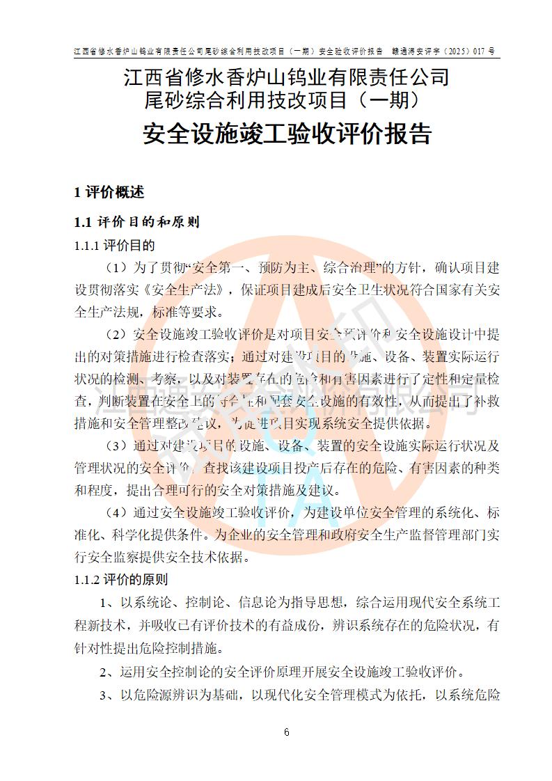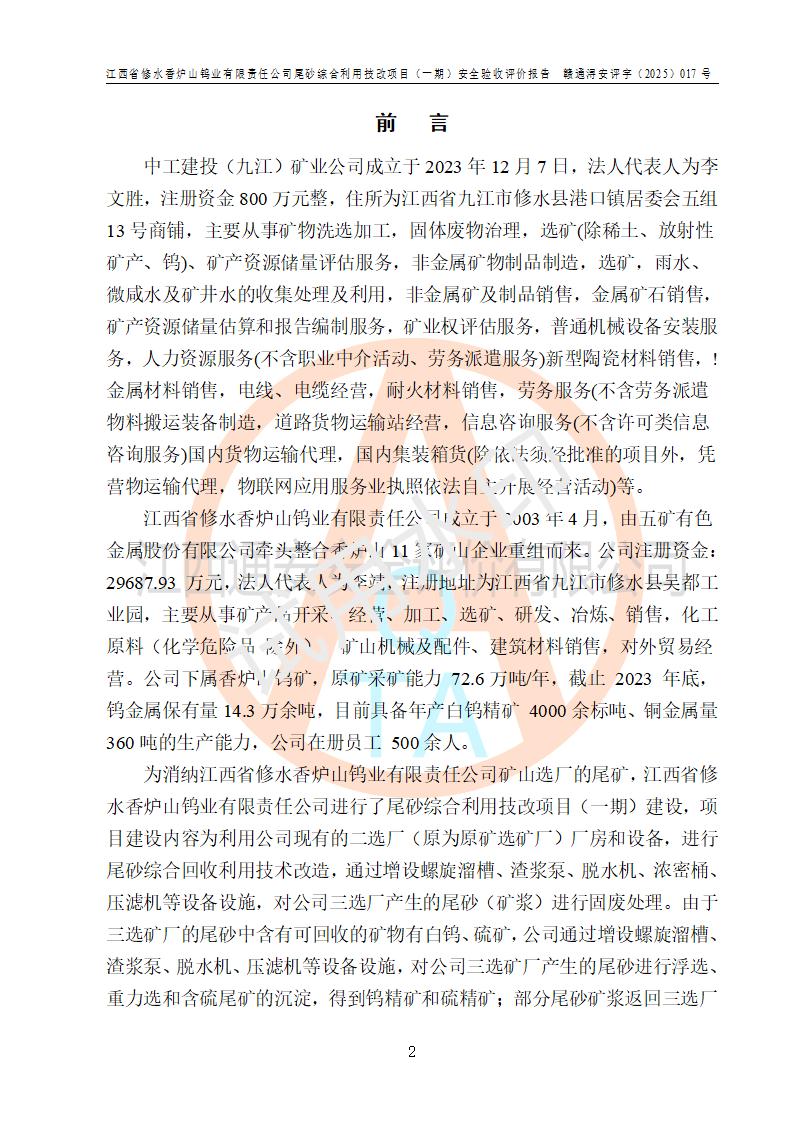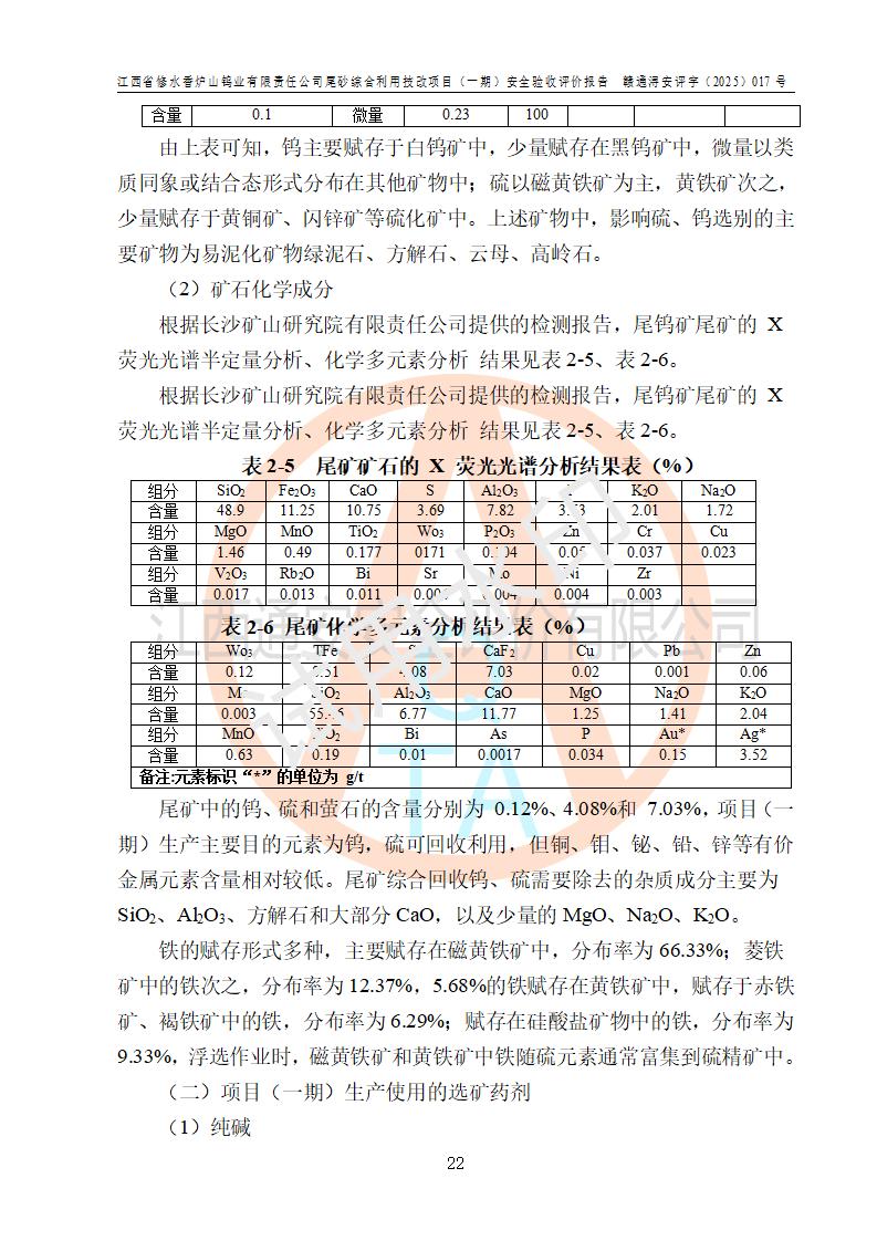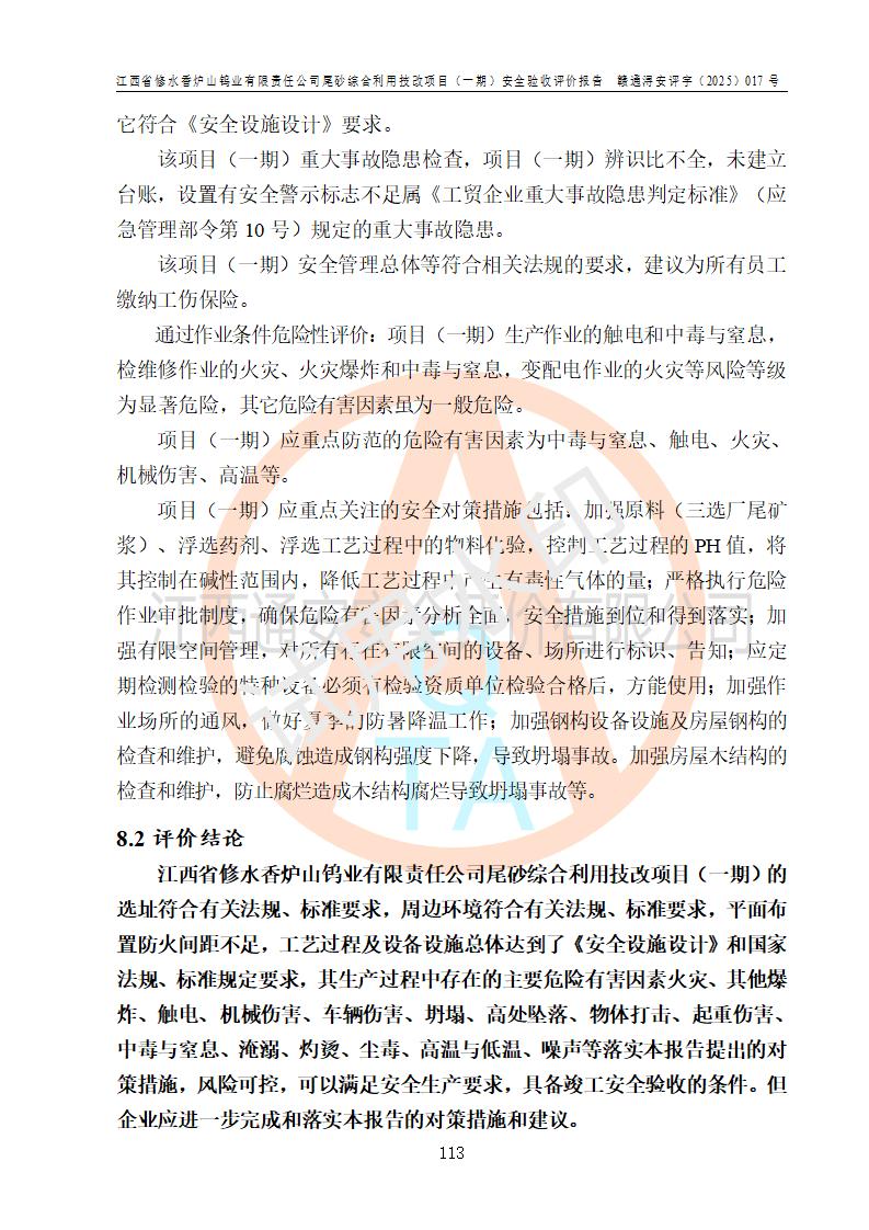評價報告名稱 | 江西省修水香爐山鎢業(yè)有限責任公司尾砂綜合利用技改項目(一期)安全驗收評價報告 | |||||