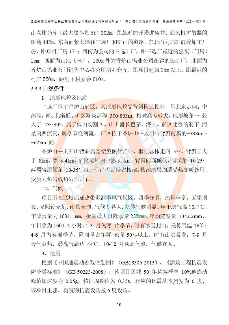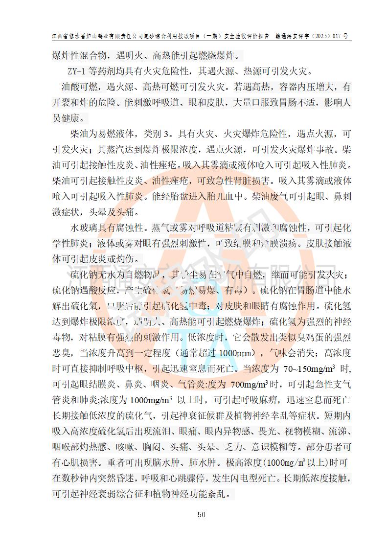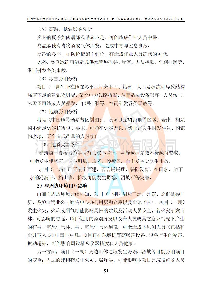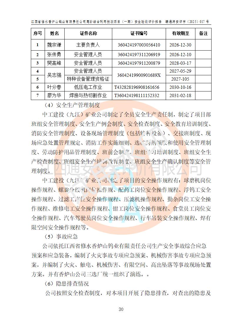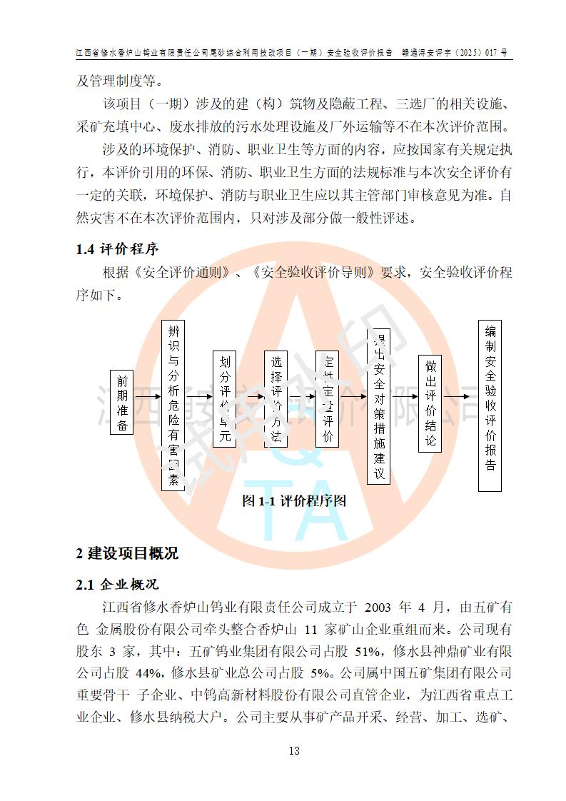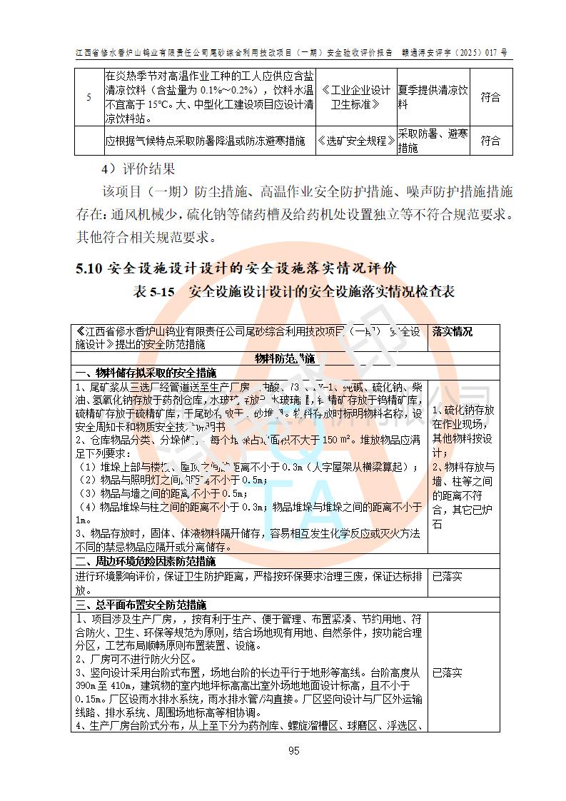 評價報告名稱 | 江西省修水香爐山鎢業(yè)有限責任公司尾砂綜合利用技改項目(一期)安全驗收評價報告 | |||||