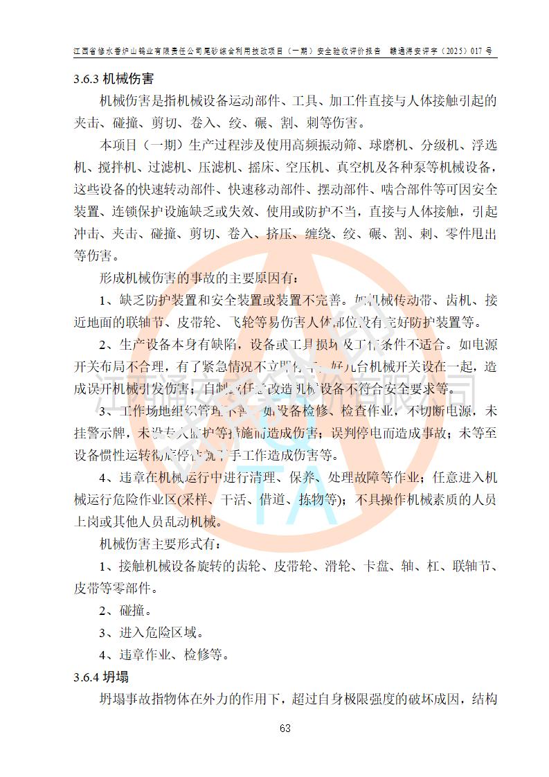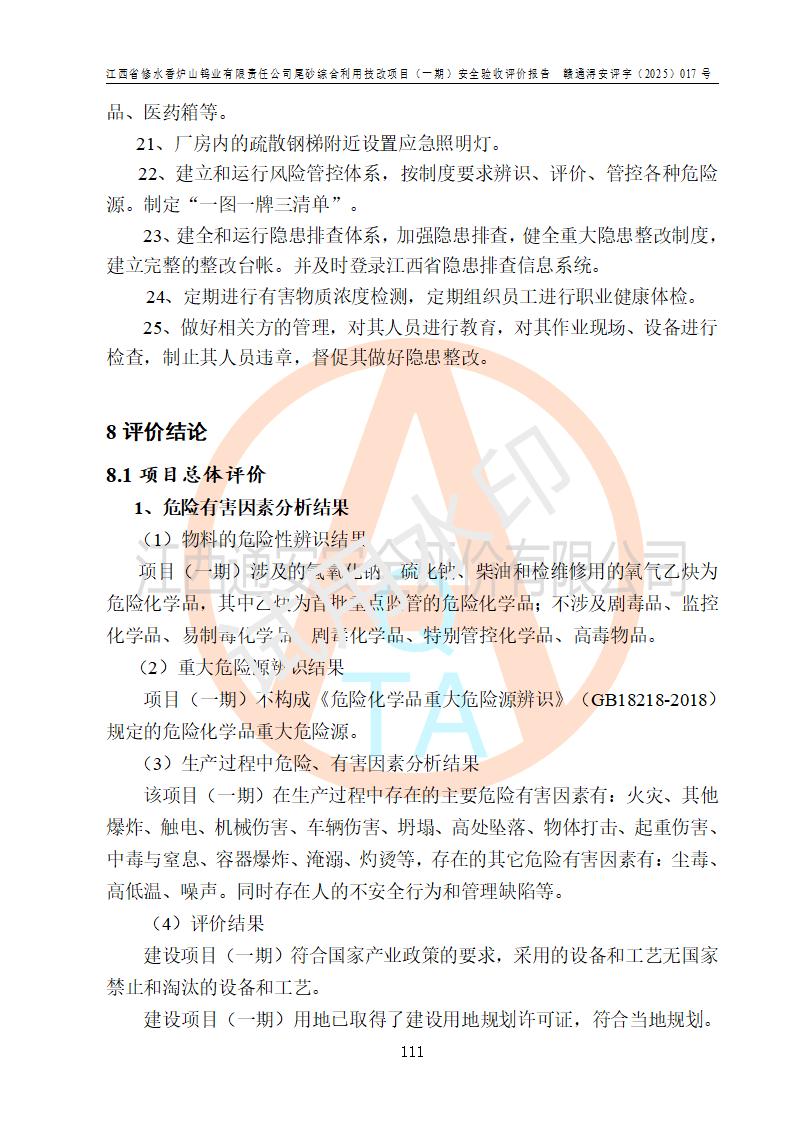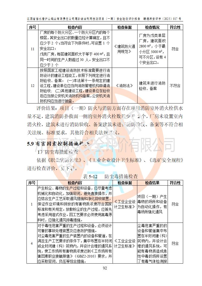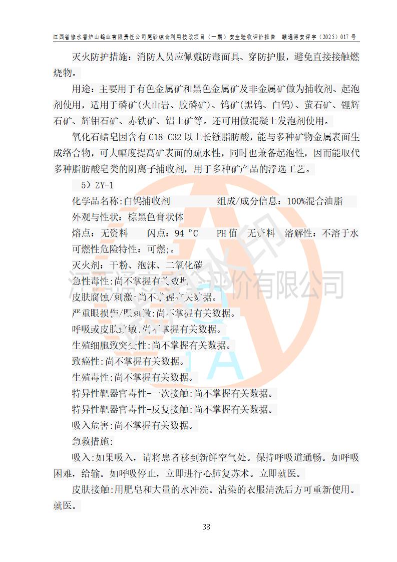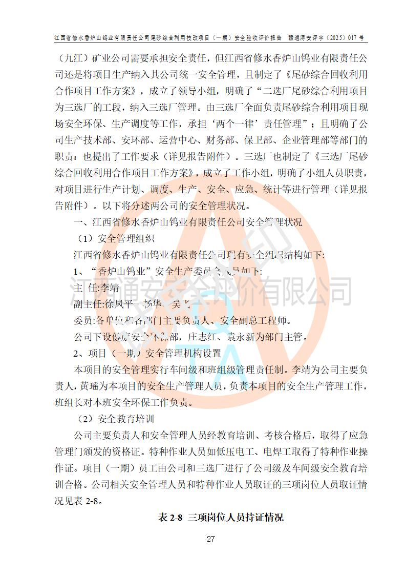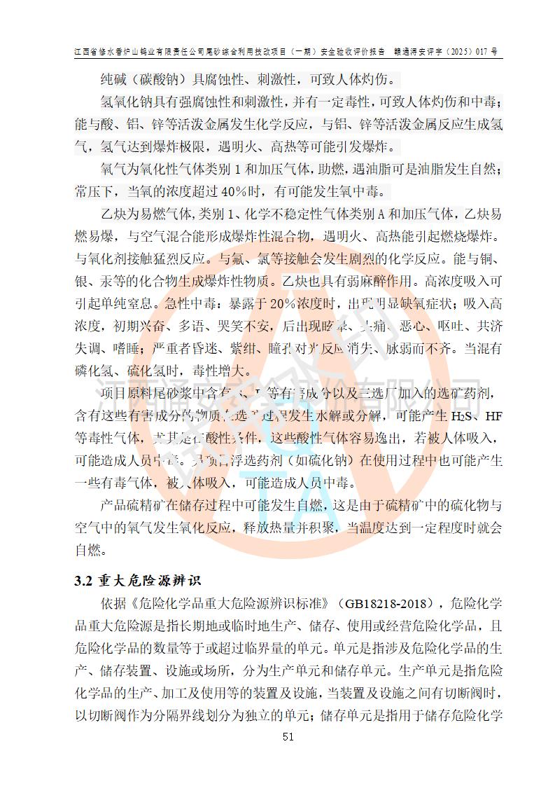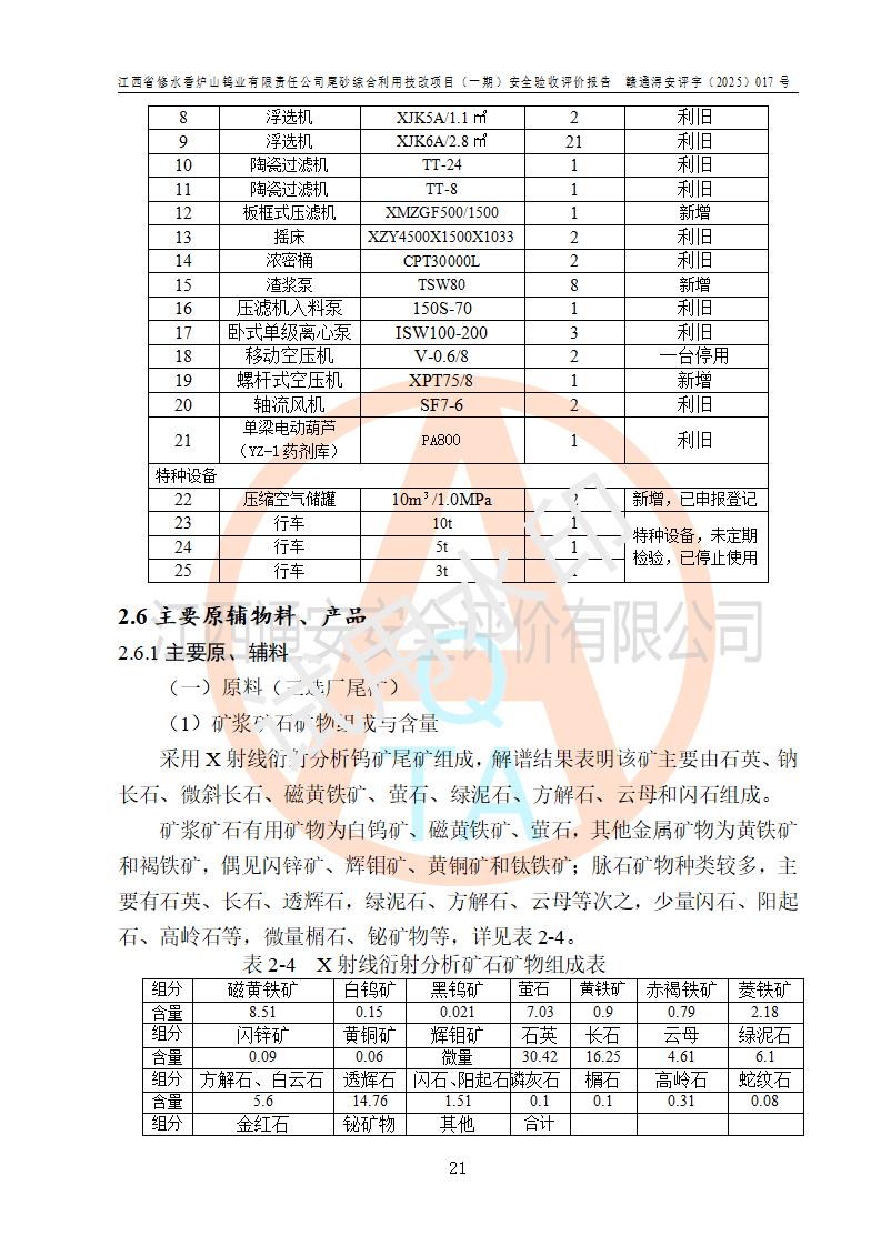 評價報告名稱 | 江西省修水香爐山鎢業(yè)有限責任公司尾砂綜合利用技改項目(一期)安全驗收評價報告 | |||||