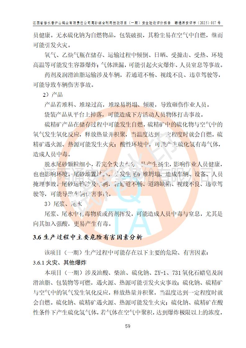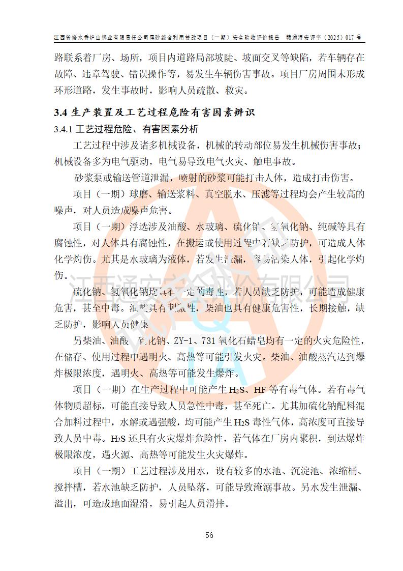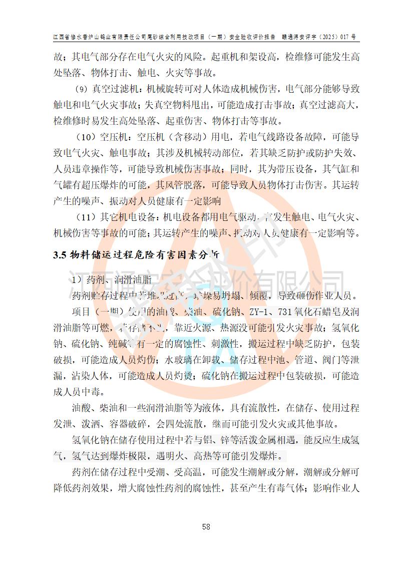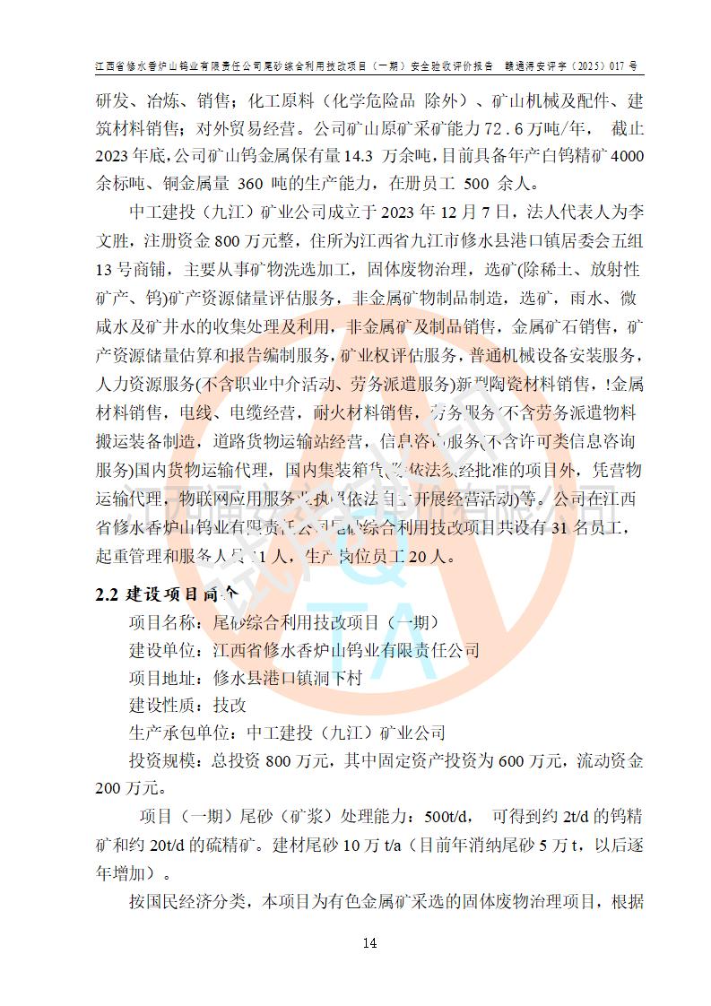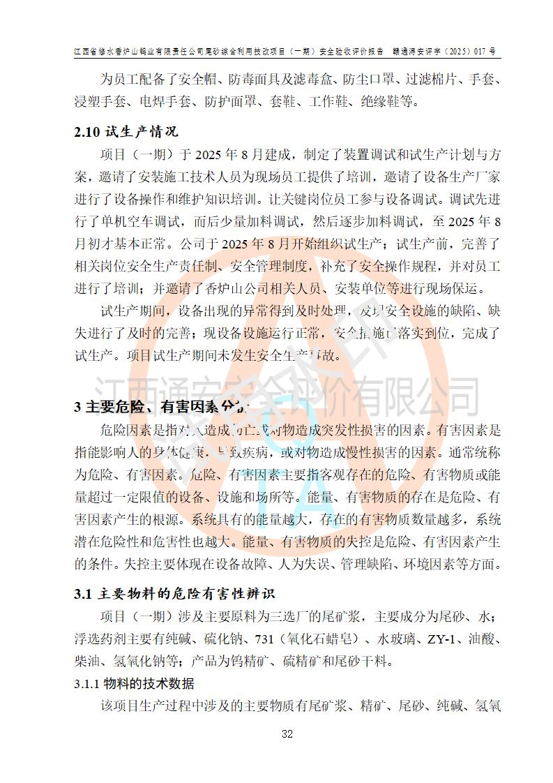 項目簡介 | 江西省修水香爐山鎢業(yè)有限責任公司成立于2003年4月,由五礦有色金屬股份有限公司牽頭整合香爐山11家礦山企業(yè)重組而來。公司注冊資金:29687.93 萬元,法人**人為李靖,注冊地址為江西省九江市修水縣吳都工業(yè)園,主要從事礦產(chǎn)品開采、經(jīng)營、加工、選礦、研發(fā)、冶煉、銷售,化工原料(化學危險品 除外)、礦山機械及配件、建筑材料銷售,對外貿(mào)易經(jīng)營。公司下屬香爐山鎢礦,原礦采礦能力 72.6萬噸/年,截止 2023 年底,鎢金屬保有量14.3萬余噸,目前具備年產(chǎn)白鎢精礦4000余標噸、銅金屬量360噸的生產(chǎn)能力,公司在冊員工 500余人。 為消納江西省修水香爐山鎢業(yè)有限責任公司礦山選廠的尾礦,江西省修水香爐山鎢業(yè)有限責任公司進行了尾砂綜合利用技改項目(一期)建設,項目建設內(nèi)容為利用公司現(xiàn)有的二選廠(原為原礦選礦廠)廠房和設備,進行尾砂綜合回收利用技術改造,通過增設螺旋溜槽、渣漿泵、脫水機、濃密桶、壓濾機等設備設施,對公司三選廠產(chǎn)生的尾砂(礦漿)進行固廢處理。由于三選礦廠的尾砂中含有可回收的礦物有白鎢、硫礦,公司通過增設螺旋溜槽、渣漿泵、脫水機、壓濾機等設備設施,對公司三選礦廠產(chǎn)生的尾砂進行浮選、重力選和含硫尾礦的沉淀,得到鎢精礦和硫精礦;部分尾砂礦漿返回三選廠的砂泵站,泵送礦山充填中心處理,用于礦井充填;一部分尾砂進行脫水,作建筑材料原料出售。公司尾礦約年產(chǎn)55萬噸,其中45萬噸用于公司礦山井下充填,10萬噸作建筑材料原料出售。項目于2024年4月12日立項并開始建設,2025年5月15日進行了行業(yè)類別變更,2025年6月編制了《江西省修水香爐山鎢業(yè)有限責任公司尾砂綜合利用技改項目安全生產(chǎn)條件和設施綜合分析報告》(補),2025年8月由中裕工程集團有限公司出具了《江西省修水香爐山鎢業(yè)有限責任公司尾砂綜合利用技改項目(一期)安全設施設計》(補),并完成技改。由中工建投(九江)礦業(yè)公司承包,進行生產(chǎn)。 中工建投(九江)礦業(yè)公司成立于2023年12月7日,法人**人為李文勝,注冊資金800萬元整,住所為江西省九江市修水縣港口鎮(zhèn)居委會五組13號商鋪,主要從事礦物洗選加工,固體廢物治理,選礦(除稀土、放射性礦產(chǎn)、鎢)、礦產(chǎn)資源儲量評估服務,非金屬礦物制品制造,選礦,雨水、微咸水及礦井水的收集處理及利用,非金屬礦及制品銷售,金屬礦石銷售,礦產(chǎn)資源儲量估算和報告編制服務,礦業(yè)權評估服務,普通機械設備安裝服務,人力資源服務(不含職業(yè)中介活動、勞務派遣服務)新型陶瓷材料銷售,!金屬材料銷售,電線、電纜經(jīng)營,耐火材料銷售,勞務服務(不含勞務派遣物料搬運裝備制造,道路貨物運輸站經(jīng)營,信息咨詢服務(不含許可類信息咨詢服務)**貨物運輸代理,**集裝箱貨(除依法須經(jīng)批準的項目外,憑營物運輸代理,物聯(lián)網(wǎng)應用服務業(yè)執(zhí)照依法自主開展經(jīng)營活動)等。 | |||||