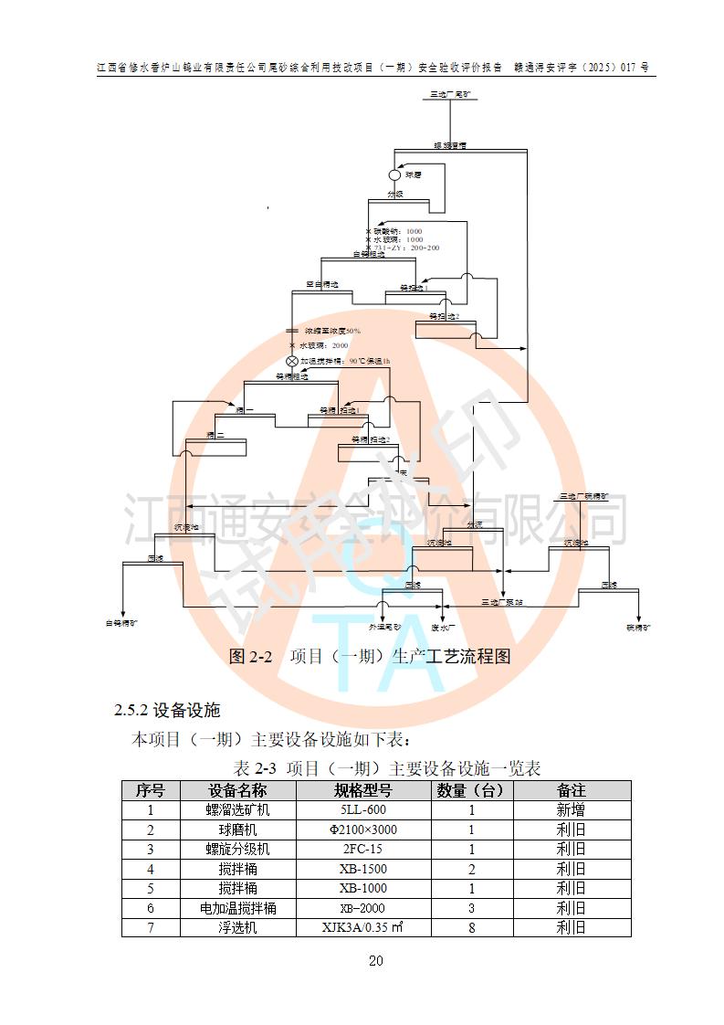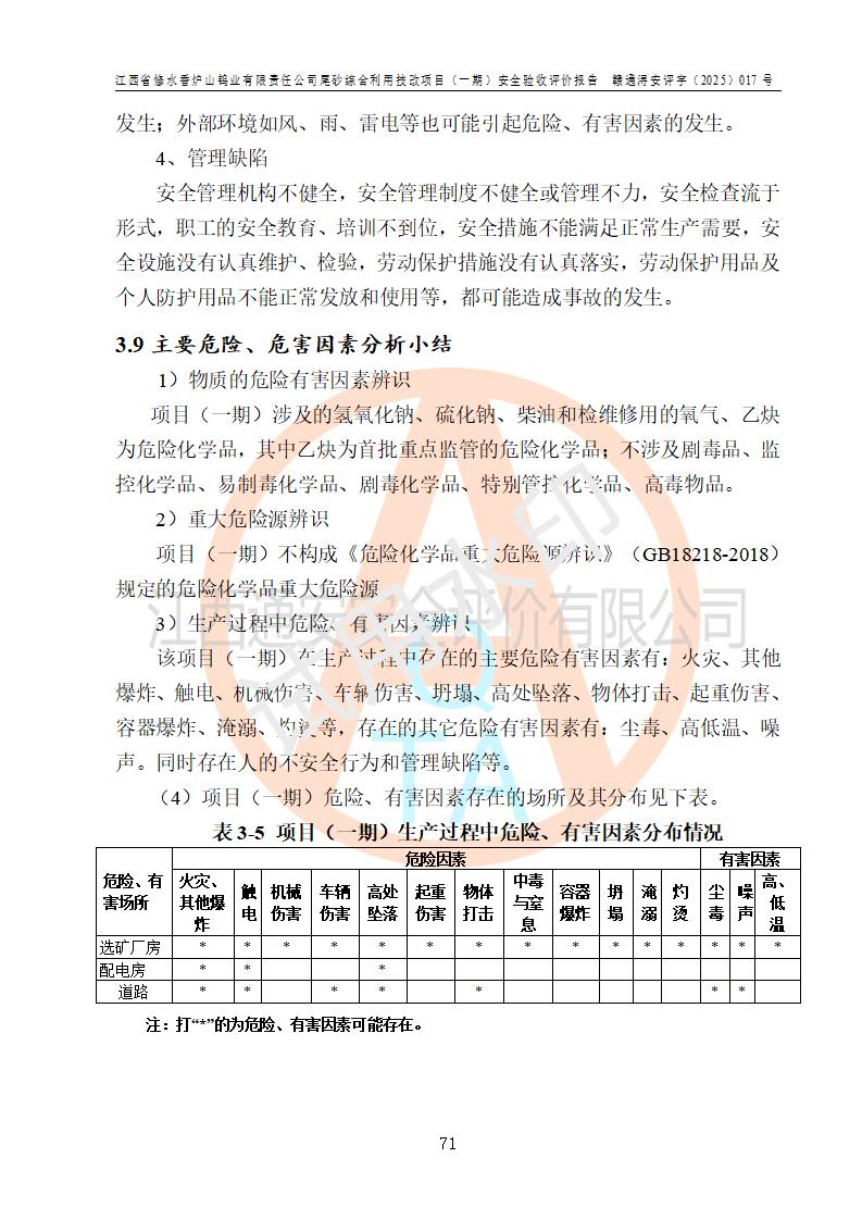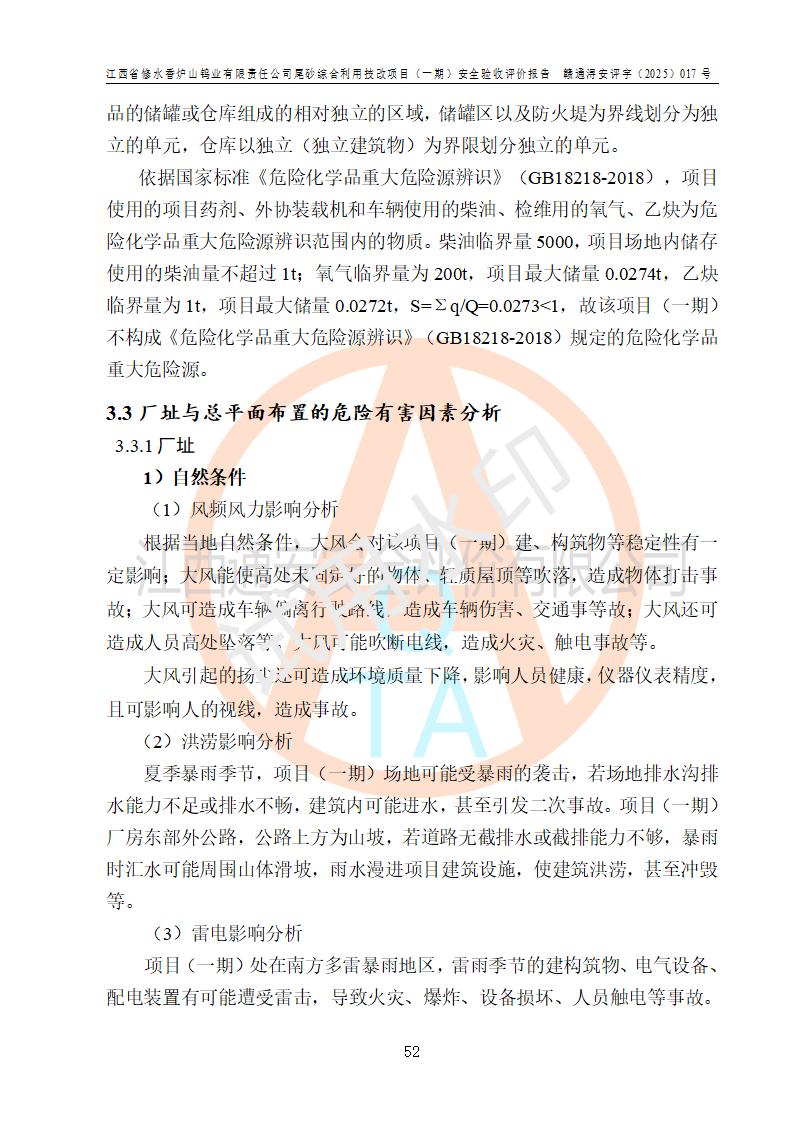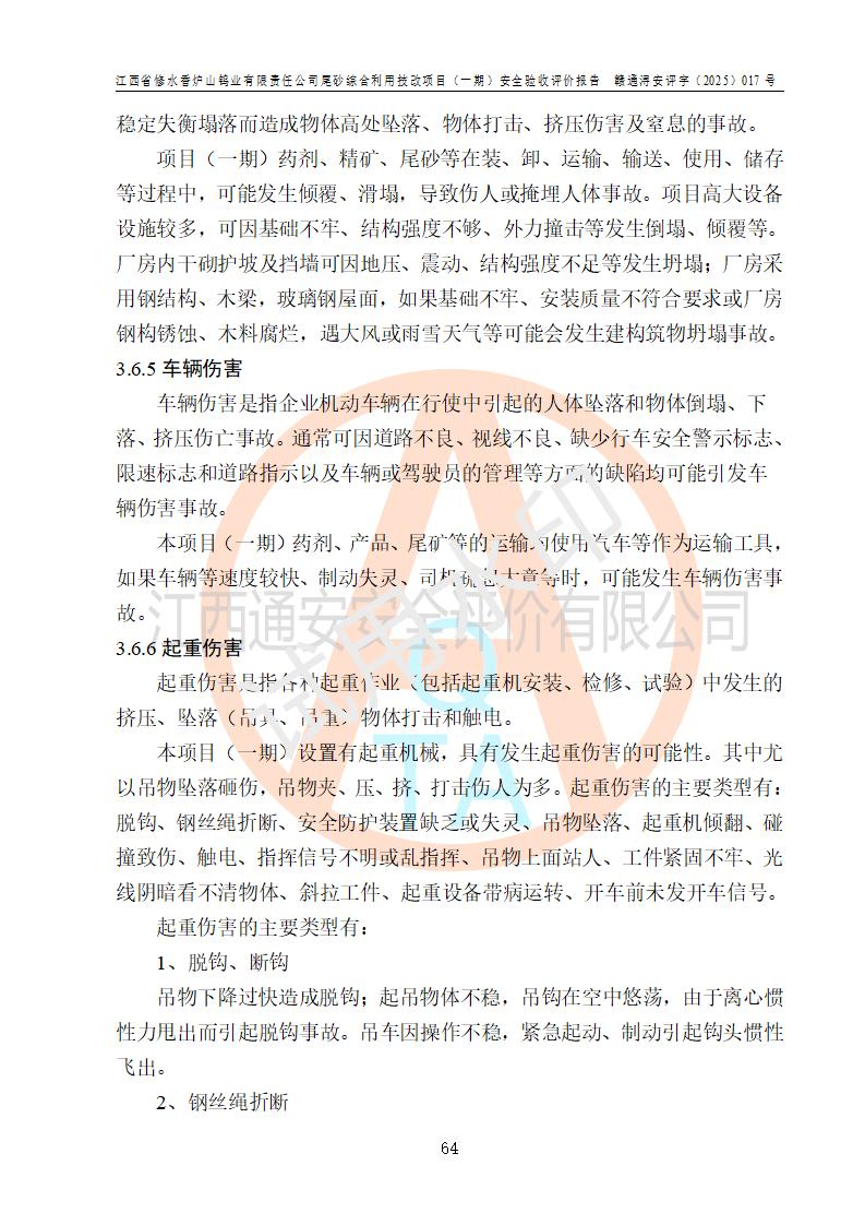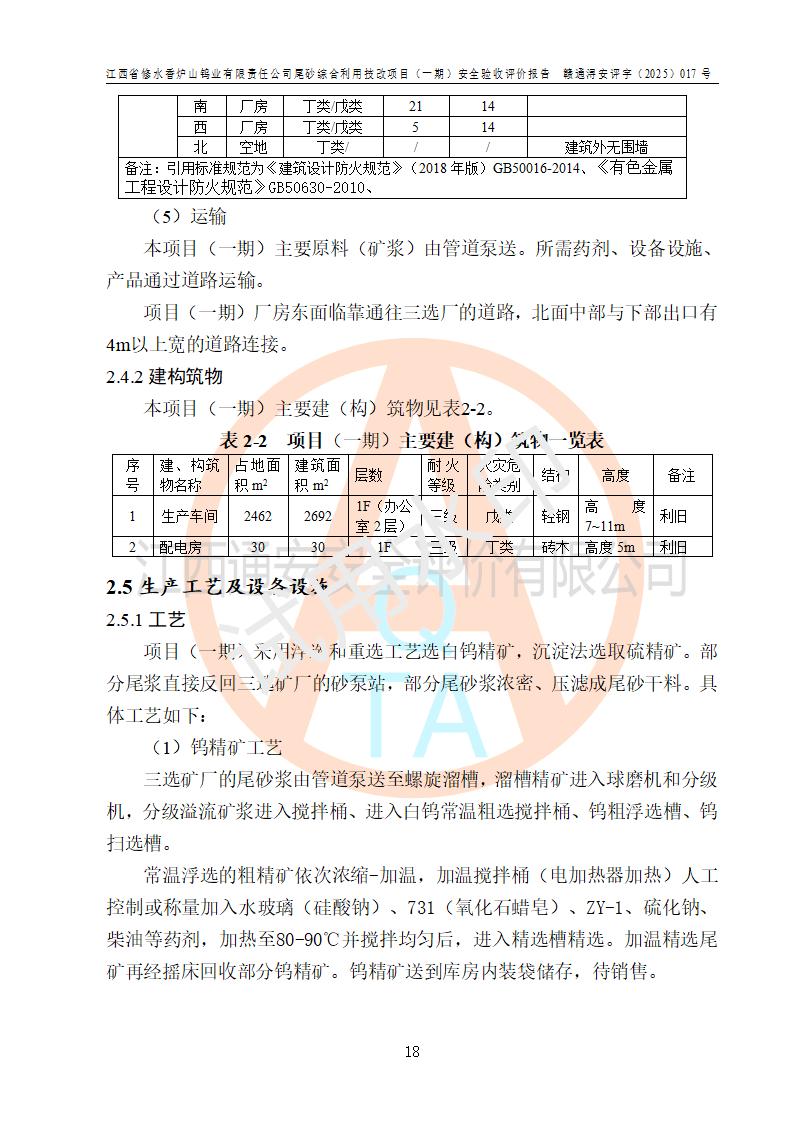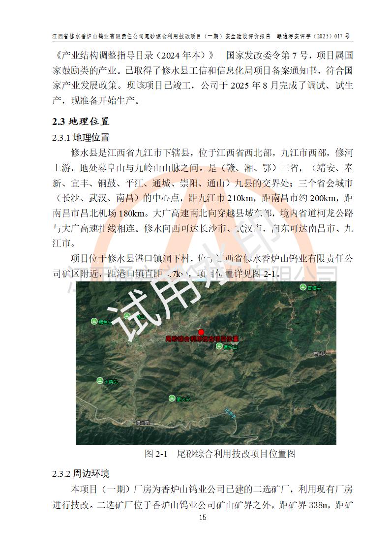 項目簡介 | 江西省修水香爐山鎢業(yè)有限責任公司成立于2003年4月,由五礦有色金屬股份有限公司牽頭整合香爐山11家礦山企業(yè)重組而來。公司注冊資金:29687.93 萬元,法人**人為李靖,注冊地址為江西省九江市修水縣吳都工業(yè)園,主要從事礦產(chǎn)品開采、經(jīng)營、加工、選礦、研發(fā)、冶煉、銷售,化工原料(化學危險品 除外)、礦山機械及配件、建筑材料銷售,對外貿(mào)易經(jīng)營。公司下屬香爐山鎢礦,原礦采礦能力 72.6萬噸/年,截止 2023 年底,鎢金屬保有量14.3萬余噸,目前具備年產(chǎn)白鎢精礦4000余標噸、銅金屬量360噸的生產(chǎn)能力,公司在冊員工 500余人。 為消納江西省修水香爐山鎢業(yè)有限責任公司礦山選廠的尾礦,江西省修水香爐山鎢業(yè)有限責任公司進行了尾砂綜合利用技改項目(一期)建設,項目建設內(nèi)容為利用公司現(xiàn)有的二選廠(原為原礦選礦廠)廠房和設備,進行尾砂綜合回收利用技術改造,通過增設螺旋溜槽、渣漿泵、脫水機、濃密桶、壓濾機等設備設施,對公司三選廠產(chǎn)生的尾砂(礦漿)進行固廢處理。由于三選礦廠的尾砂中含有可回收的礦物有白鎢、硫礦,公司通過增設螺旋溜槽、渣漿泵、脫水機、壓濾機等設備設施,對公司三選礦廠產(chǎn)生的尾砂進行浮選、重力選和含硫尾礦的沉淀,得到鎢精礦和硫精礦;部分尾砂礦漿返回三選廠的砂泵站,泵送礦山充填中心處理,用于礦井充填;一部分尾砂進行脫水,作建筑材料原料出售。公司尾礦約年產(chǎn)55萬噸,其中45萬噸用于公司礦山井下充填,10萬噸作建筑材料原料出售。項目于2024年4月12日立項并開始建設,2025年5月15日進行了行業(yè)類別變更,2025年6月編制了《江西省修水香爐山鎢業(yè)有限責任公司尾砂綜合利用技改項目安全生產(chǎn)條件和設施綜合分析報告》(補),2025年8月由中裕工程集團有限公司出具了《江西省修水香爐山鎢業(yè)有限責任公司尾砂綜合利用技改項目(一期)安全設施設計》(補),并完成技改。由中工建投(九江)礦業(yè)公司承包,進行生產(chǎn)。 中工建投(九江)礦業(yè)公司成立于2023年12月7日,法人**人為李文勝,注冊資金800萬元整,住所為江西省九江市修水縣港口鎮(zhèn)居委會五組13號商鋪,主要從事礦物洗選加工,固體廢物治理,選礦(除稀土、放射性礦產(chǎn)、鎢)、礦產(chǎn)資源儲量評估服務,非金屬礦物制品制造,選礦,雨水、微咸水及礦井水的收集處理及利用,非金屬礦及制品銷售,金屬礦石銷售,礦產(chǎn)資源儲量估算和報告編制服務,礦業(yè)權評估服務,普通機械設備安裝服務,人力資源服務(不含職業(yè)中介活動、勞務派遣服務)新型陶瓷材料銷售,!金屬材料銷售,電線、電纜經(jīng)營,耐火材料銷售,勞務服務(不含勞務派遣物料搬運裝備制造,道路貨物運輸站經(jīng)營,信息咨詢服務(不含許可類信息咨詢服務)**貨物運輸代理,**集裝箱貨(除依法須經(jīng)批準的項目外,憑營物運輸代理,物聯(lián)網(wǎng)應用服務業(yè)執(zhí)照依法自主開展經(jīng)營活動)等。 | |||||