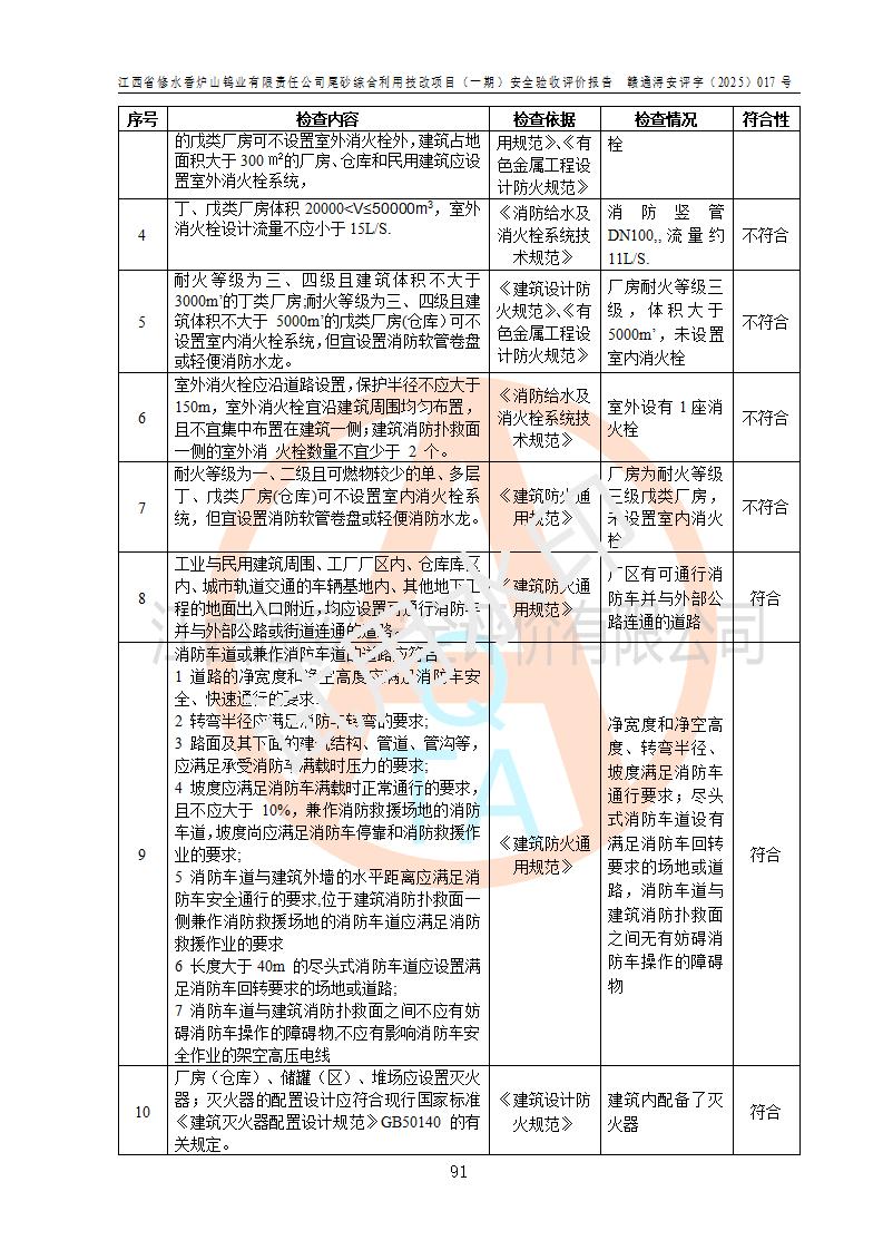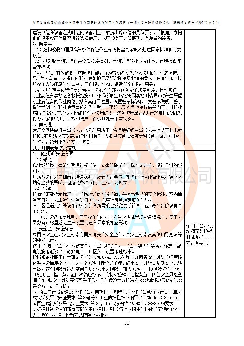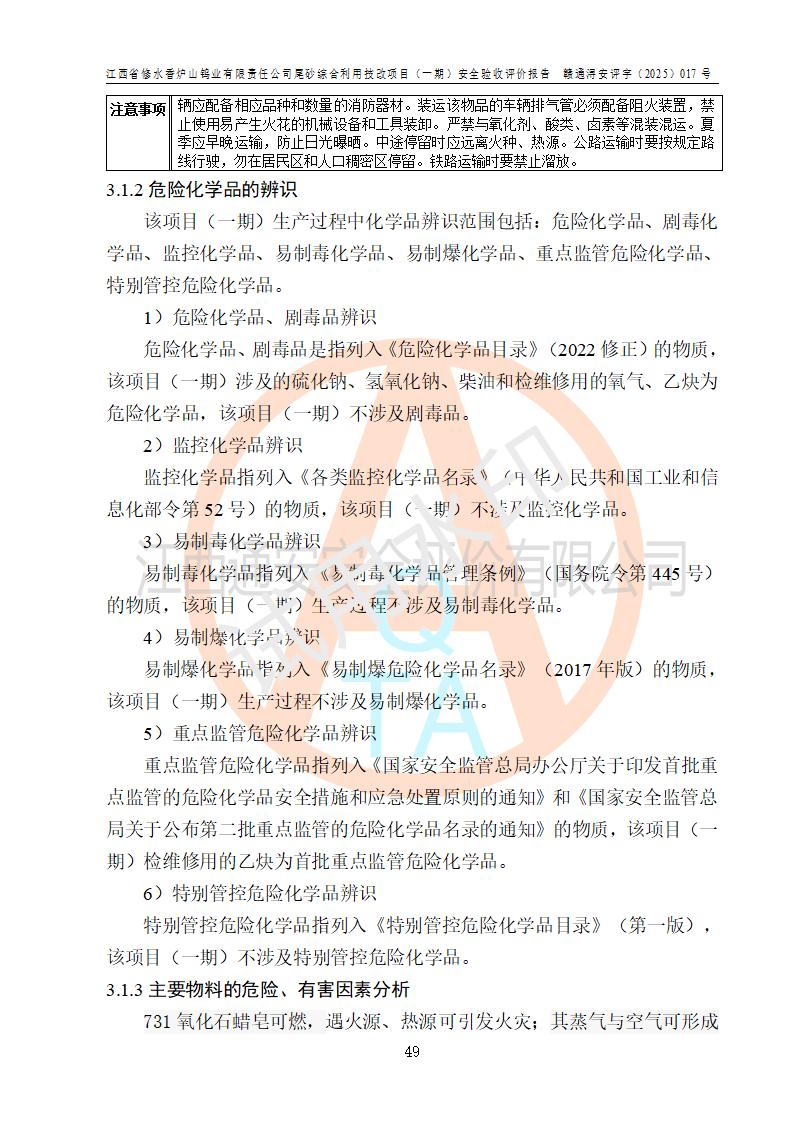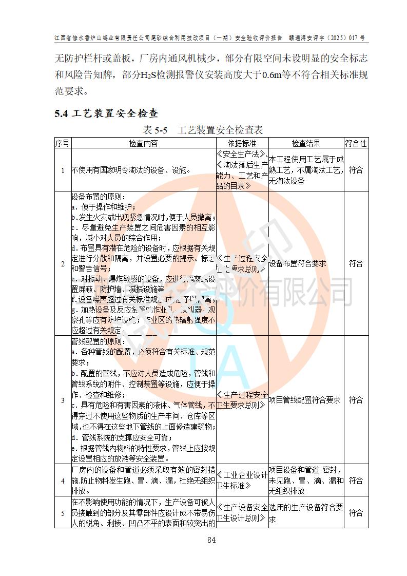 評價結(jié)論 | 總體結(jié)論:江西省修水香爐山鎢業(yè)有限責任公司尾砂綜合利用技改項目(一期)的選址符合有關法規(guī)、標準要求,周邊環(huán)境符合有關法規(guī)、標準要求,平面布置防火間距不足,工藝過程及設備設施總體達到了《安全設施設計》和**法規(guī)、標準規(guī)定要求,其生產(chǎn)過程中存在的主要危險有害因素火災、其他爆炸、觸電、機械傷害、**傷害、坍塌、高處墜落、物體打擊、起重傷害、中毒與窒息、淹溺、灼燙、塵毒、高溫與低溫、噪聲等落實本報告提出的對策措施,風險可控,可以滿足安全生產(chǎn)要求,具備竣工安全驗收的條件。但企業(yè)應進一步完成和落實本報告的對策措施和建議。 | |||||