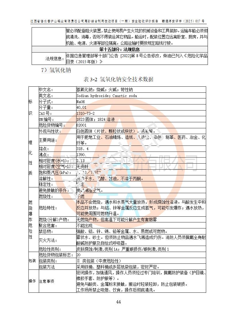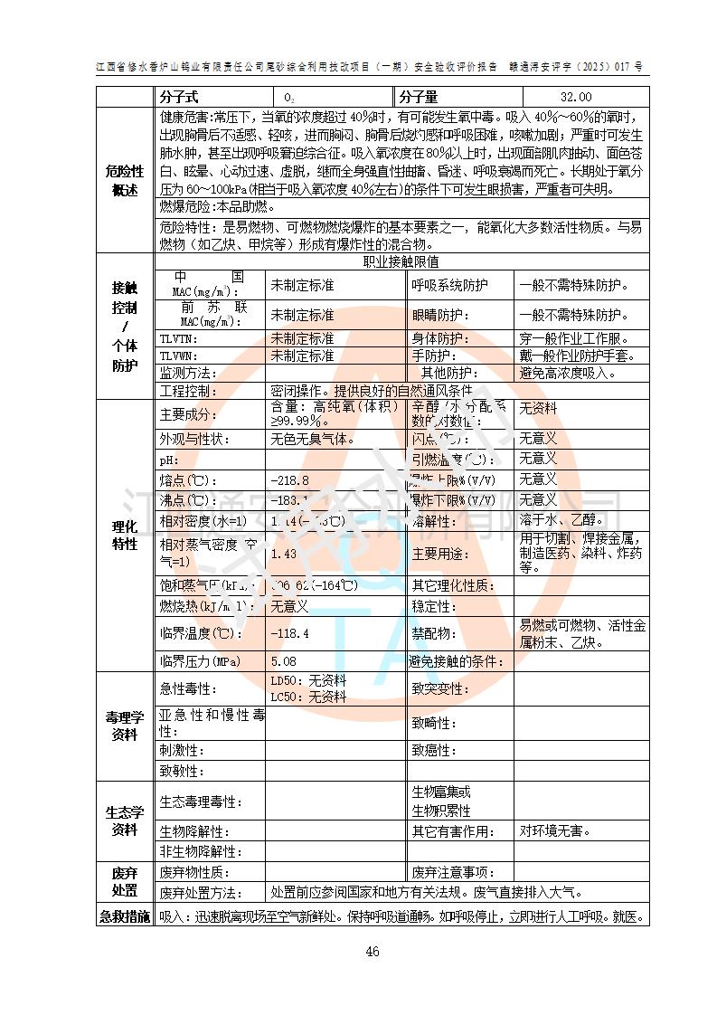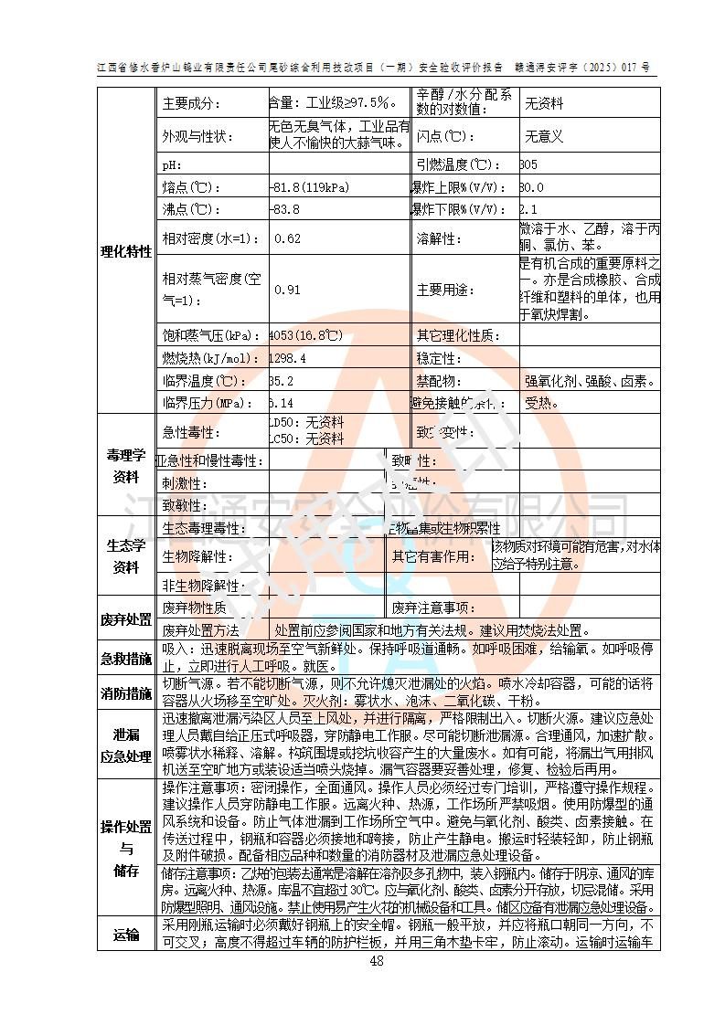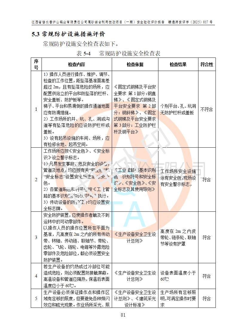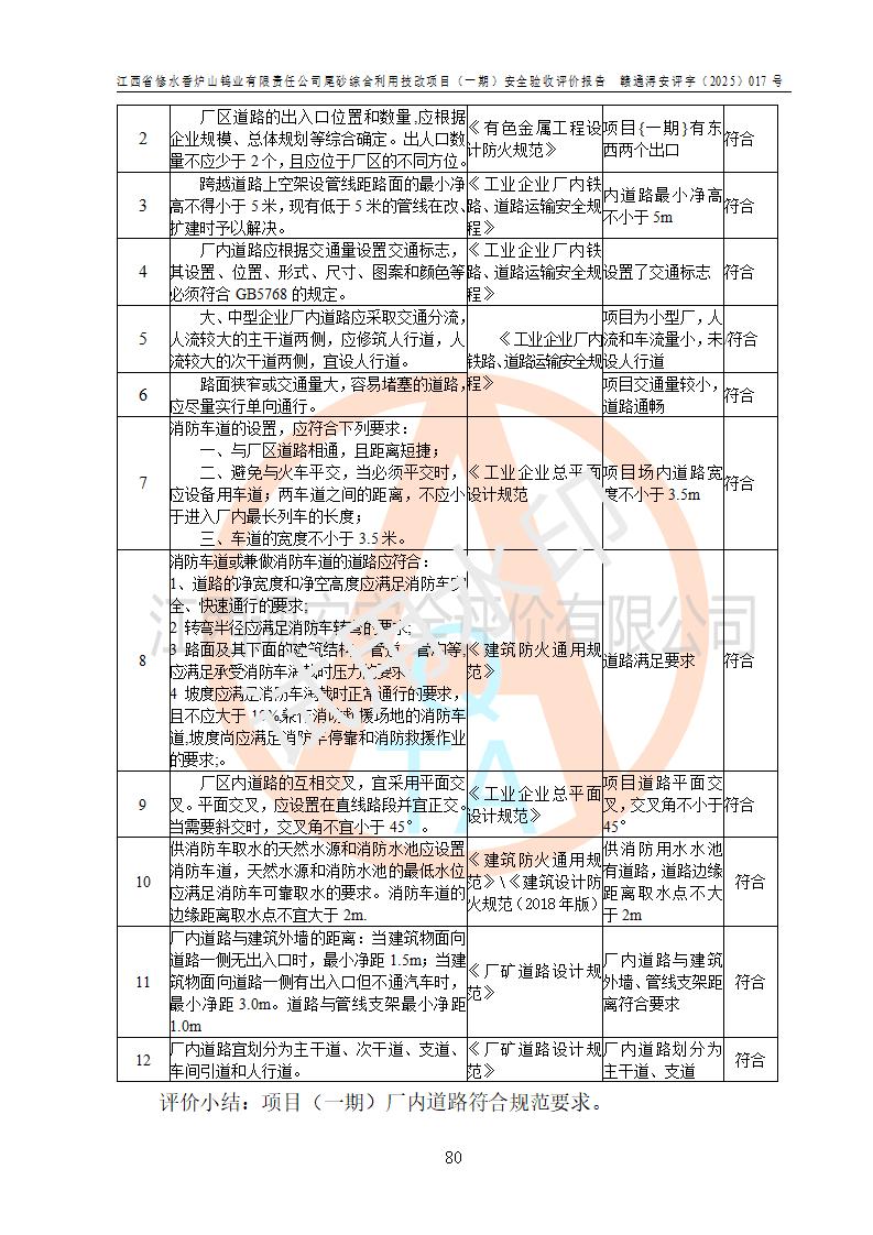 評價結(jié)論 | 總體結(jié)論:江西省修水香爐山鎢業(yè)有限責任公司尾砂綜合利用技改項目(一期)的選址符合有關法規(guī)、標準要求,周邊環(huán)境符合有關法規(guī)、標準要求,平面布置防火間距不足,工藝過程及設備設施總體達到了《安全設施設計》和**法規(guī)、標準規(guī)定要求,其生產(chǎn)過程中存在的主要危險有害因素火災、其他爆炸、觸電、機械傷害、**傷害、坍塌、高處墜落、物體打擊、起重傷害、中毒與窒息、淹溺、灼燙、塵毒、高溫與低溫、噪聲等落實本報告提出的對策措施,風險可控,可以滿足安全生產(chǎn)要求,具備竣工安全驗收的條件。但企業(yè)應進一步完成和落實本報告的對策措施和建議。 | |||||