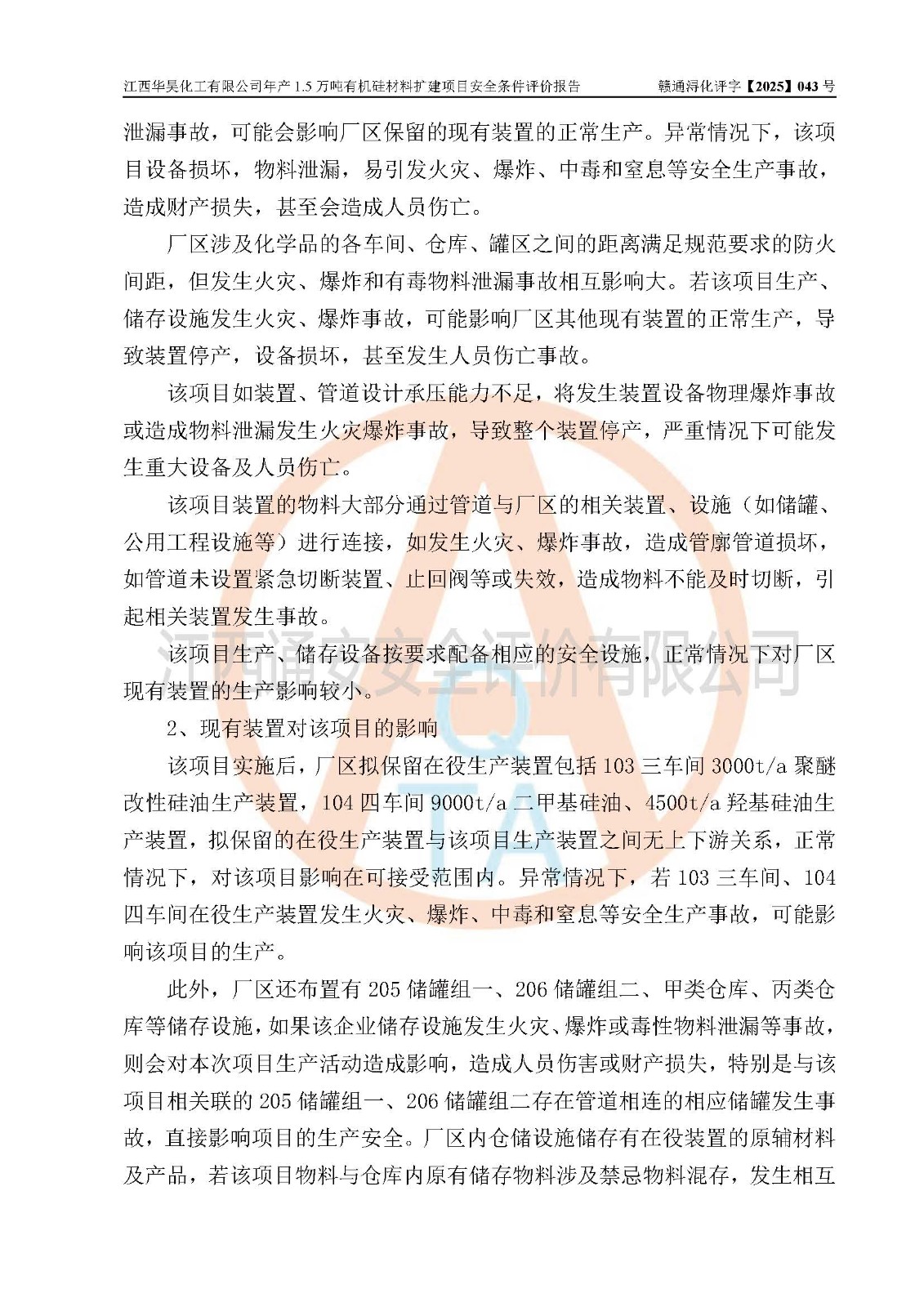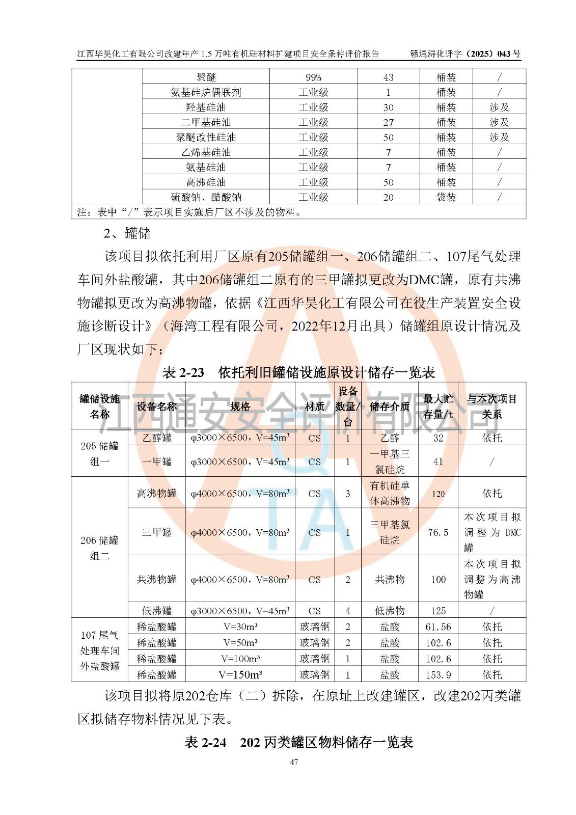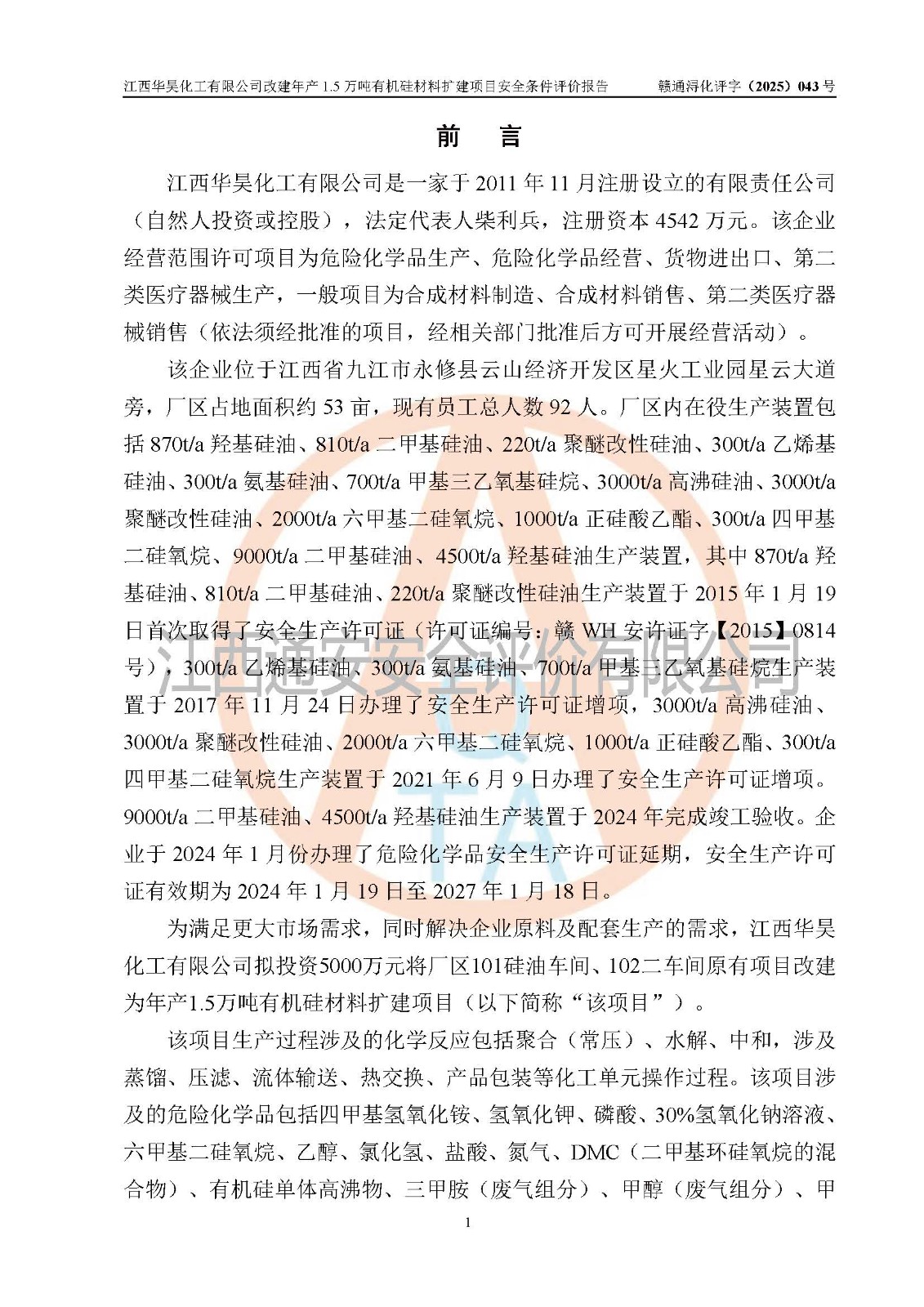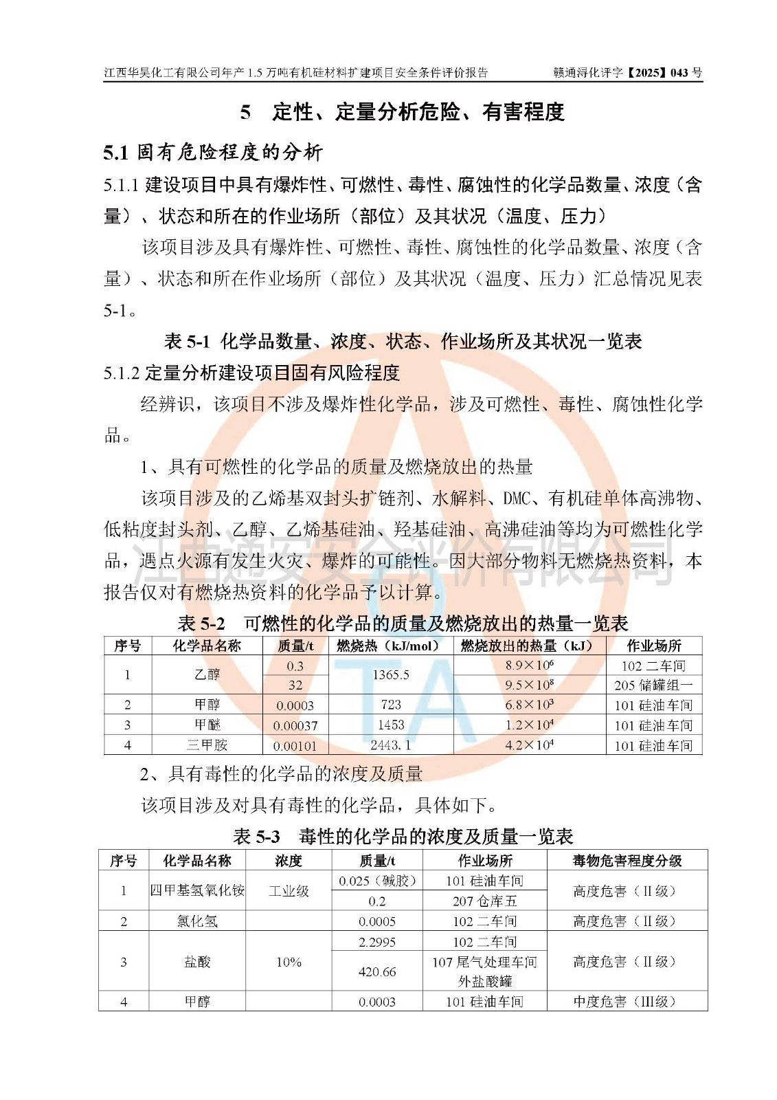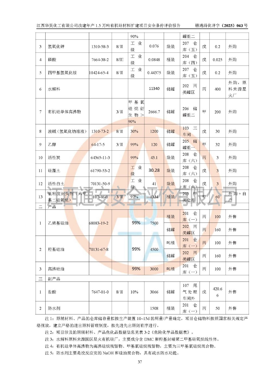 江西華昊化工有限公司是一家于2011年11月注冊成立的有限責(zé)任公司(自然人投資或控股),注冊地址位于永修縣云山經(jīng)濟(jì)開發(fā)區(qū)星火工業(yè)園星云大道旁,法定**人柴利兵,注冊資本1542萬元,經(jīng)營范圍包括許可項(xiàng)目和一般項(xiàng)目,許可項(xiàng)目為危險(xiǎn)化學(xué)品生產(chǎn)、危險(xiǎn)化學(xué)品經(jīng)營、貨物進(jìn)出口、第二類醫(yī)療器械生產(chǎn),一般項(xiàng)目為合成材料制造(不含危險(xiǎn)化學(xué)品)、合成材料銷售、第二類醫(yī)療器械銷售。 為滿足更大市場需求,同時(shí)解決企業(yè)原料及配套生產(chǎn)的需求,江西華昊化工有限公司擬投資5000萬元將廠區(qū)101硅油車間、102二車間原有項(xiàng)目改建為年產(chǎn)1.5萬噸有機(jī)硅材料擴(kuò)建項(xiàng)目(以下簡稱“該項(xiàng)目”)。 該項(xiàng)目生產(chǎn)過程涉及的化學(xué)反應(yīng)包括聚合(常壓)、水解、中和,涉及蒸餾、壓濾、流體輸送、熱交換、產(chǎn)品包裝等化工單元操作過程。該項(xiàng)目涉及的危險(xiǎn)化學(xué)品包括四甲基氫氧化銨、氫氧化鉀、磷酸、30%氫氧化鈉溶液、六甲基二硅氧烷、乙醇、氯化氫、鹽酸、氮?dú)?/span>、DMC(二甲基環(huán)硅氧烷的混合物)、有機(jī)硅單體高沸物、**胺(廢氣組分)、甲醇(廢氣組分)、甲醚(廢氣組分),其中甲醇、甲醚屬于重點(diǎn)監(jiān)管的危險(xiǎn)化學(xué)品,鹽酸屬于第三類易制毒化學(xué)品,乙醇、甲醇、甲醚屬于特別管控危險(xiǎn)化學(xué)品,四甲基氫氧化銨、乙醇、**胺、甲醇、甲醚屬于第四類監(jiān)控化學(xué)品。該項(xiàng)目不涉及劇毒品、易制爆化學(xué)品、高毒物品,不涉及**、二、三類監(jiān)控化學(xué)品。 該項(xiàng)目不涉及重點(diǎn)監(jiān)管的典型危險(xiǎn)化工工藝,生產(chǎn)單元、儲存單元不構(gòu)成危險(xiǎn)化學(xué)品重大危險(xiǎn)源。 該項(xiàng)目副產(chǎn)品鹽酸、中間產(chǎn)品低粘度封頭劑(六甲基二硅氧烷)屬于危險(xiǎn)化學(xué)品,該項(xiàng)目屬于危險(xiǎn)化學(xué)品生產(chǎn)項(xiàng)目,依據(jù)《危險(xiǎn)化學(xué)品生產(chǎn)企業(yè)安全生產(chǎn)許可證實(shí)施辦法》(**安全生產(chǎn)監(jiān)督管理總局令第41號,第79號、89號修改),項(xiàng)目需要辦理危險(xiǎn)化學(xué)品安全生產(chǎn)許可證。 |