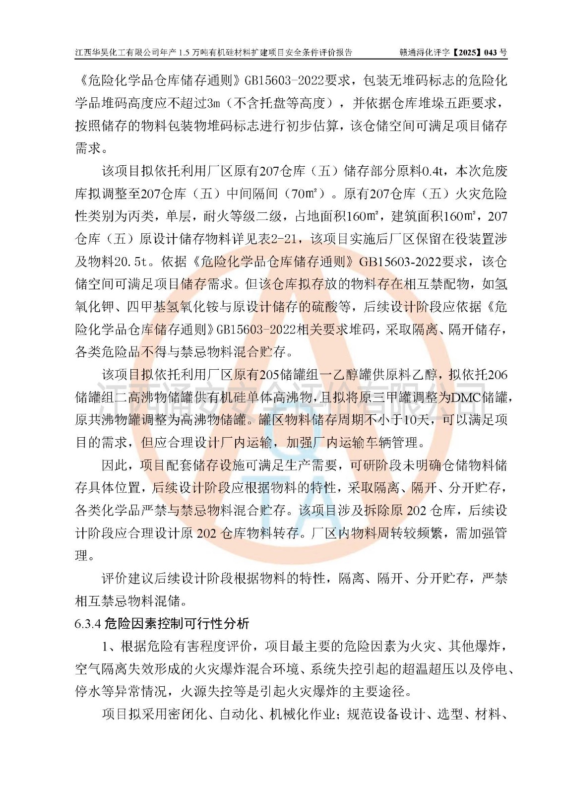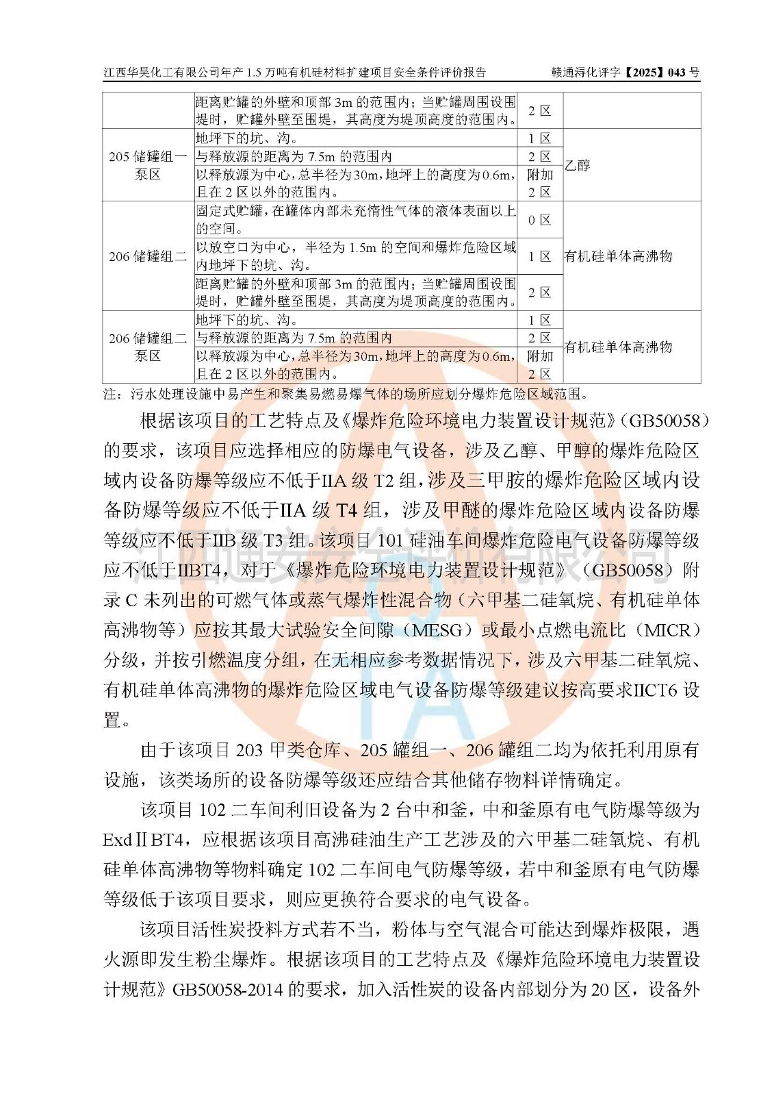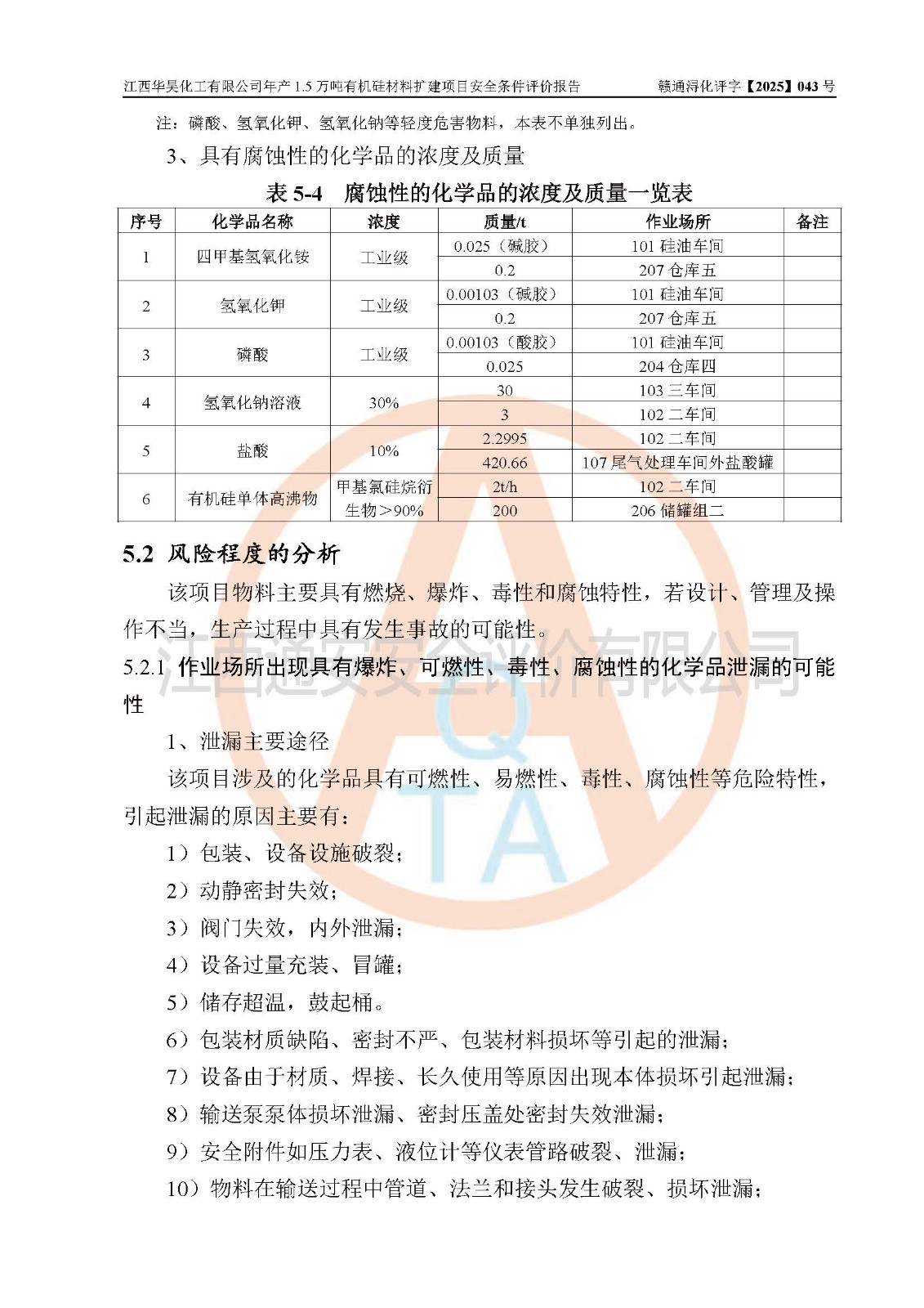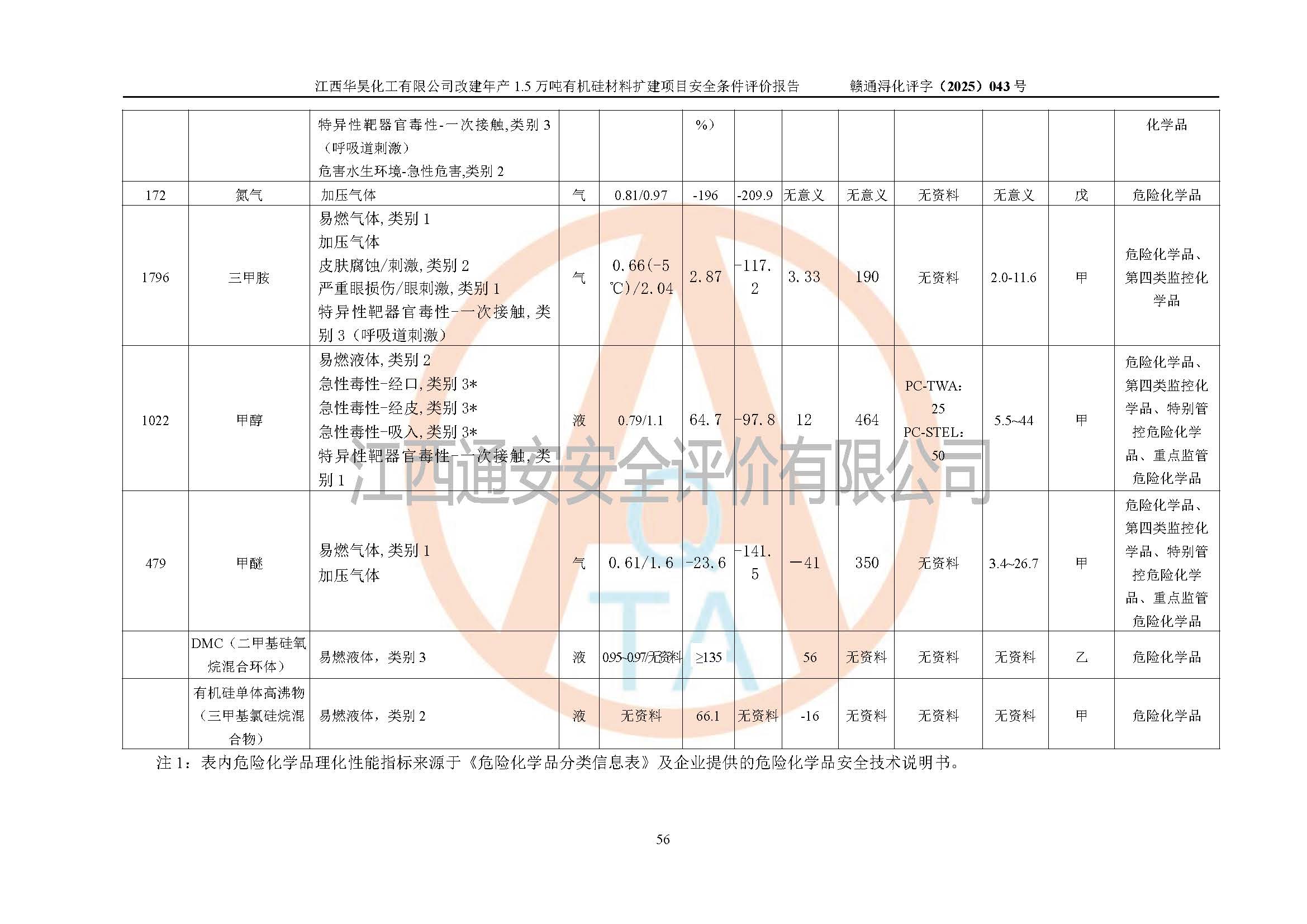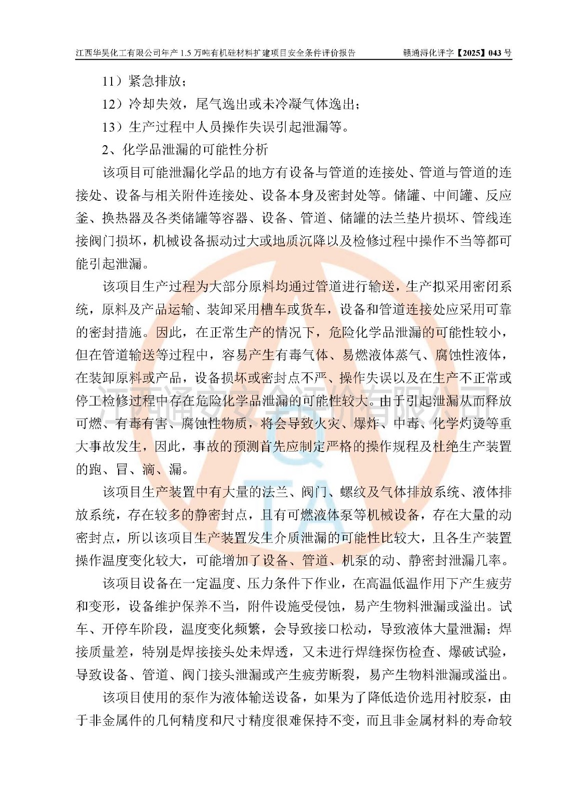 江西華昊化工有限公司是一家于2011年11月注冊成立的有限責(zé)任公司(自然人投資或控股),注冊地址位于永修縣云山經(jīng)濟(jì)開發(fā)區(qū)星火工業(yè)園星云大道旁,法定**人柴利兵,注冊資本1542萬元,經(jīng)營范圍包括許可項(xiàng)目和一般項(xiàng)目,許可項(xiàng)目為危險(xiǎn)化學(xué)品生產(chǎn)、危險(xiǎn)化學(xué)品經(jīng)營、貨物進(jìn)出口、第二類醫(yī)療器械生產(chǎn),一般項(xiàng)目為合成材料制造(不含危險(xiǎn)化學(xué)品)、合成材料銷售、第二類醫(yī)療器械銷售。 為滿足更大市場需求,同時(shí)解決企業(yè)原料及配套生產(chǎn)的需求,江西華昊化工有限公司擬投資5000萬元將廠區(qū)101硅油車間、102二車間原有項(xiàng)目改建為年產(chǎn)1.5萬噸有機(jī)硅材料擴(kuò)建項(xiàng)目(以下簡稱“該項(xiàng)目”)。 該項(xiàng)目生產(chǎn)過程涉及的化學(xué)反應(yīng)包括聚合(常壓)、水解、中和,涉及蒸餾、壓濾、流體輸送、熱交換、產(chǎn)品包裝等化工單元操作過程。該項(xiàng)目涉及的危險(xiǎn)化學(xué)品包括四甲基氫氧化銨、氫氧化鉀、磷酸、30%氫氧化鈉溶液、六甲基二硅氧烷、乙醇、氯化氫、鹽酸、氮?dú)?/span>、DMC(二甲基環(huán)硅氧烷的混合物)、有機(jī)硅單體高沸物、**胺(廢氣組分)、甲醇(廢氣組分)、甲醚(廢氣組分),其中甲醇、甲醚屬于重點(diǎn)監(jiān)管的危險(xiǎn)化學(xué)品,鹽酸屬于第三類易制毒化學(xué)品,乙醇、甲醇、甲醚屬于特別管控危險(xiǎn)化學(xué)品,四甲基氫氧化銨、乙醇、**胺、甲醇、甲醚屬于第四類監(jiān)控化學(xué)品。該項(xiàng)目不涉及劇毒品、易制爆化學(xué)品、高毒物品,不涉及**、二、三類監(jiān)控化學(xué)品。 該項(xiàng)目不涉及重點(diǎn)監(jiān)管的典型危險(xiǎn)化工工藝,生產(chǎn)單元、儲存單元不構(gòu)成危險(xiǎn)化學(xué)品重大危險(xiǎn)源。 該項(xiàng)目副產(chǎn)品鹽酸、中間產(chǎn)品低粘度封頭劑(六甲基二硅氧烷)屬于危險(xiǎn)化學(xué)品,該項(xiàng)目屬于危險(xiǎn)化學(xué)品生產(chǎn)項(xiàng)目,依據(jù)《危險(xiǎn)化學(xué)品生產(chǎn)企業(yè)安全生產(chǎn)許可證實(shí)施辦法》(**安全生產(chǎn)監(jiān)督管理總局令第41號,第79號、89號修改),項(xiàng)目需要辦理危險(xiǎn)化學(xué)品安全生產(chǎn)許可證。 |