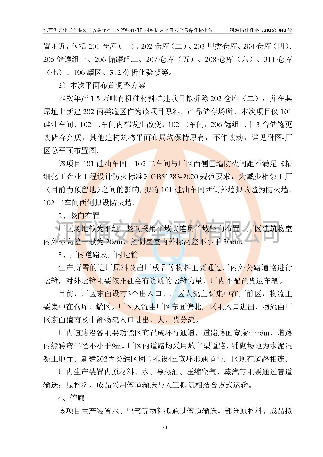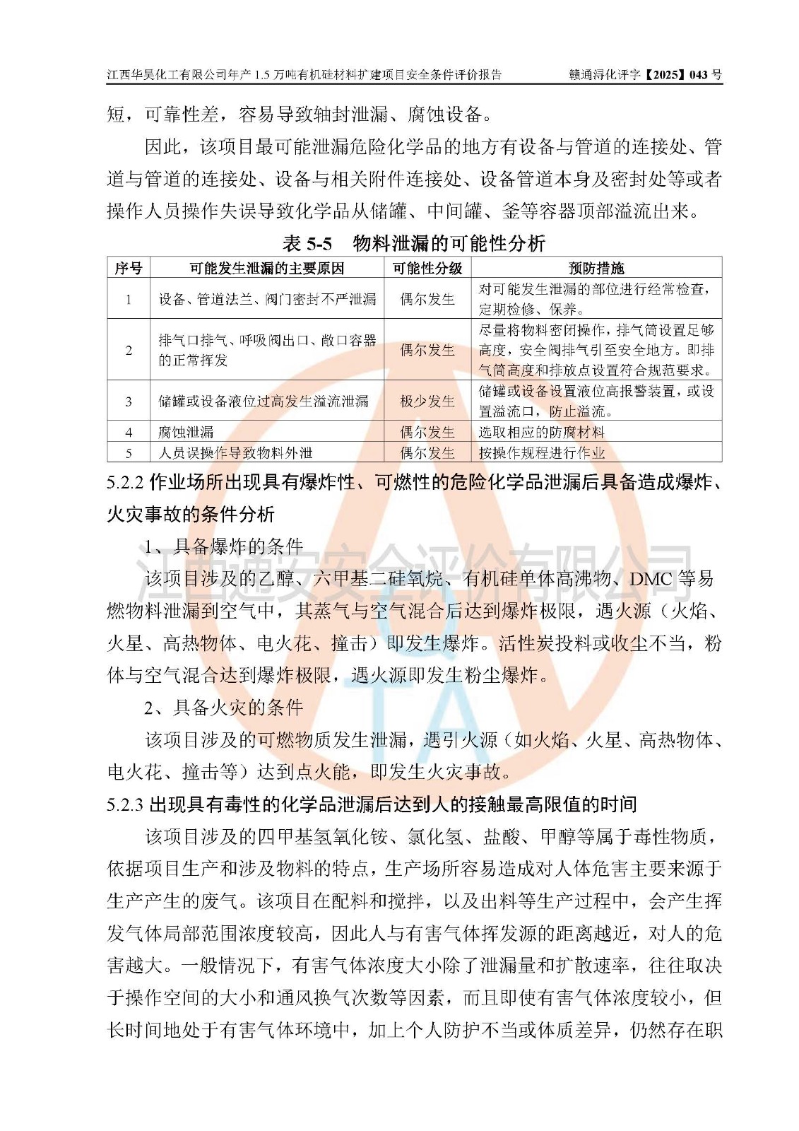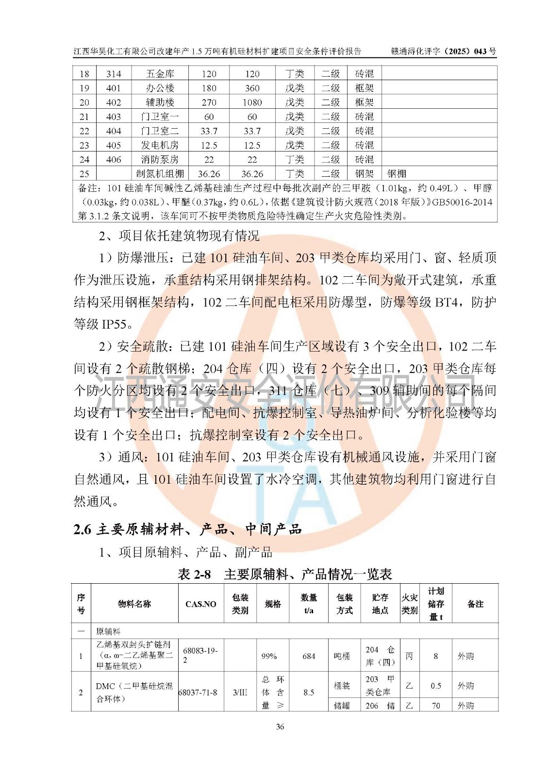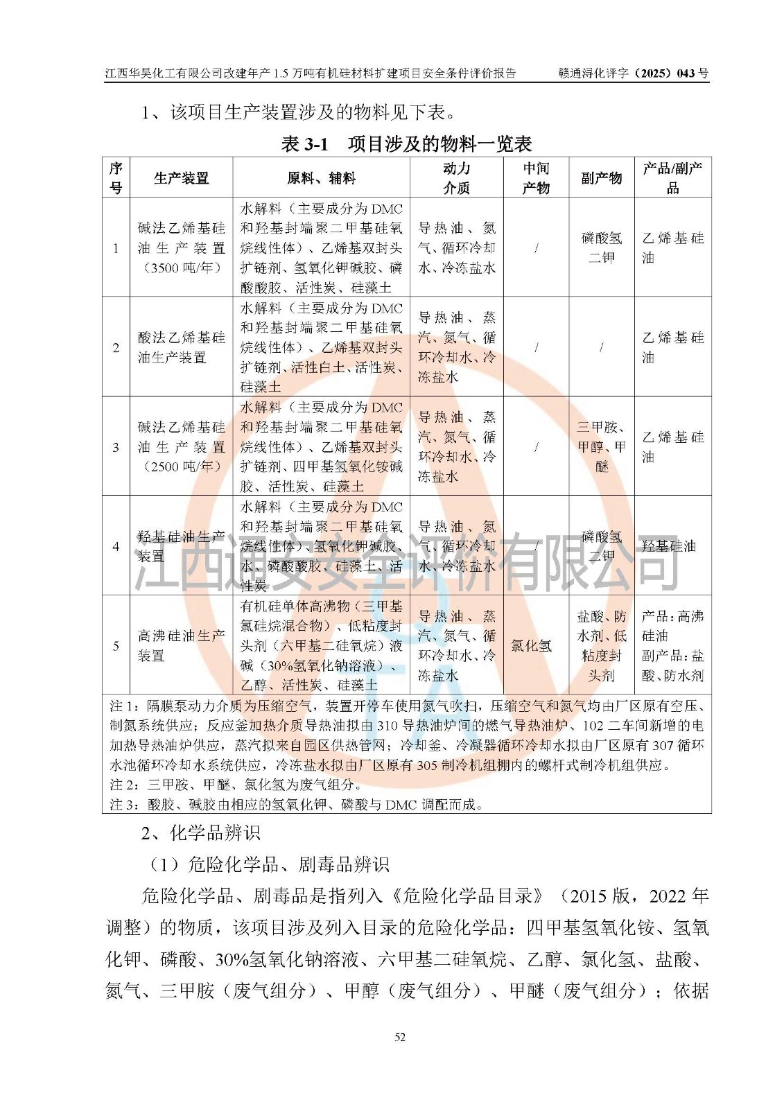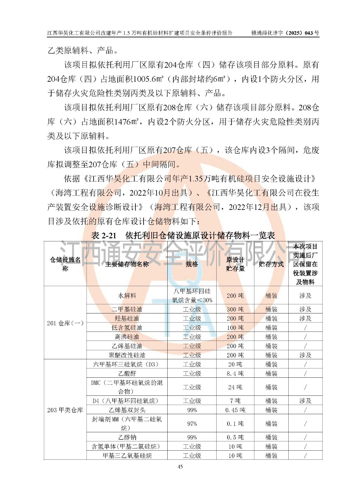 江西華昊化工有限公司是一家于2011年11月注冊成立的有限責(zé)任公司(自然人投資或控股),注冊地址位于永修縣云山經(jīng)濟(jì)開發(fā)區(qū)星火工業(yè)園星云大道旁,法定**人柴利兵,注冊資本1542萬元,經(jīng)營范圍包括許可項(xiàng)目和一般項(xiàng)目,許可項(xiàng)目為危險(xiǎn)化學(xué)品生產(chǎn)、危險(xiǎn)化學(xué)品經(jīng)營、貨物進(jìn)出口、第二類醫(yī)療器械生產(chǎn),一般項(xiàng)目為合成材料制造(不含危險(xiǎn)化學(xué)品)、合成材料銷售、第二類醫(yī)療器械銷售。 為滿足更大市場需求,同時(shí)解決企業(yè)原料及配套生產(chǎn)的需求,江西華昊化工有限公司擬投資5000萬元將廠區(qū)101硅油車間、102二車間原有項(xiàng)目改建為年產(chǎn)1.5萬噸有機(jī)硅材料擴(kuò)建項(xiàng)目(以下簡稱“該項(xiàng)目”)。 該項(xiàng)目生產(chǎn)過程涉及的化學(xué)反應(yīng)包括聚合(常壓)、水解、中和,涉及蒸餾、壓濾、流體輸送、熱交換、產(chǎn)品包裝等化工單元操作過程。該項(xiàng)目涉及的危險(xiǎn)化學(xué)品包括四甲基氫氧化銨、氫氧化鉀、磷酸、30%氫氧化鈉溶液、六甲基二硅氧烷、乙醇、氯化氫、鹽酸、氮?dú)?/span>、DMC(二甲基環(huán)硅氧烷的混合物)、有機(jī)硅單體高沸物、**胺(廢氣組分)、甲醇(廢氣組分)、甲醚(廢氣組分),其中甲醇、甲醚屬于重點(diǎn)監(jiān)管的危險(xiǎn)化學(xué)品,鹽酸屬于第三類易制毒化學(xué)品,乙醇、甲醇、甲醚屬于特別管控危險(xiǎn)化學(xué)品,四甲基氫氧化銨、乙醇、**胺、甲醇、甲醚屬于第四類監(jiān)控化學(xué)品。該項(xiàng)目不涉及劇毒品、易制爆化學(xué)品、高毒物品,不涉及**、二、三類監(jiān)控化學(xué)品。 該項(xiàng)目不涉及重點(diǎn)監(jiān)管的典型危險(xiǎn)化工工藝,生產(chǎn)單元、儲存單元不構(gòu)成危險(xiǎn)化學(xué)品重大危險(xiǎn)源。 該項(xiàng)目副產(chǎn)品鹽酸、中間產(chǎn)品低粘度封頭劑(六甲基二硅氧烷)屬于危險(xiǎn)化學(xué)品,該項(xiàng)目屬于危險(xiǎn)化學(xué)品生產(chǎn)項(xiàng)目,依據(jù)《危險(xiǎn)化學(xué)品生產(chǎn)企業(yè)安全生產(chǎn)許可證實(shí)施辦法》(**安全生產(chǎn)監(jiān)督管理總局令第41號,第79號、89號修改),項(xiàng)目需要辦理危險(xiǎn)化學(xué)品安全生產(chǎn)許可證。 |