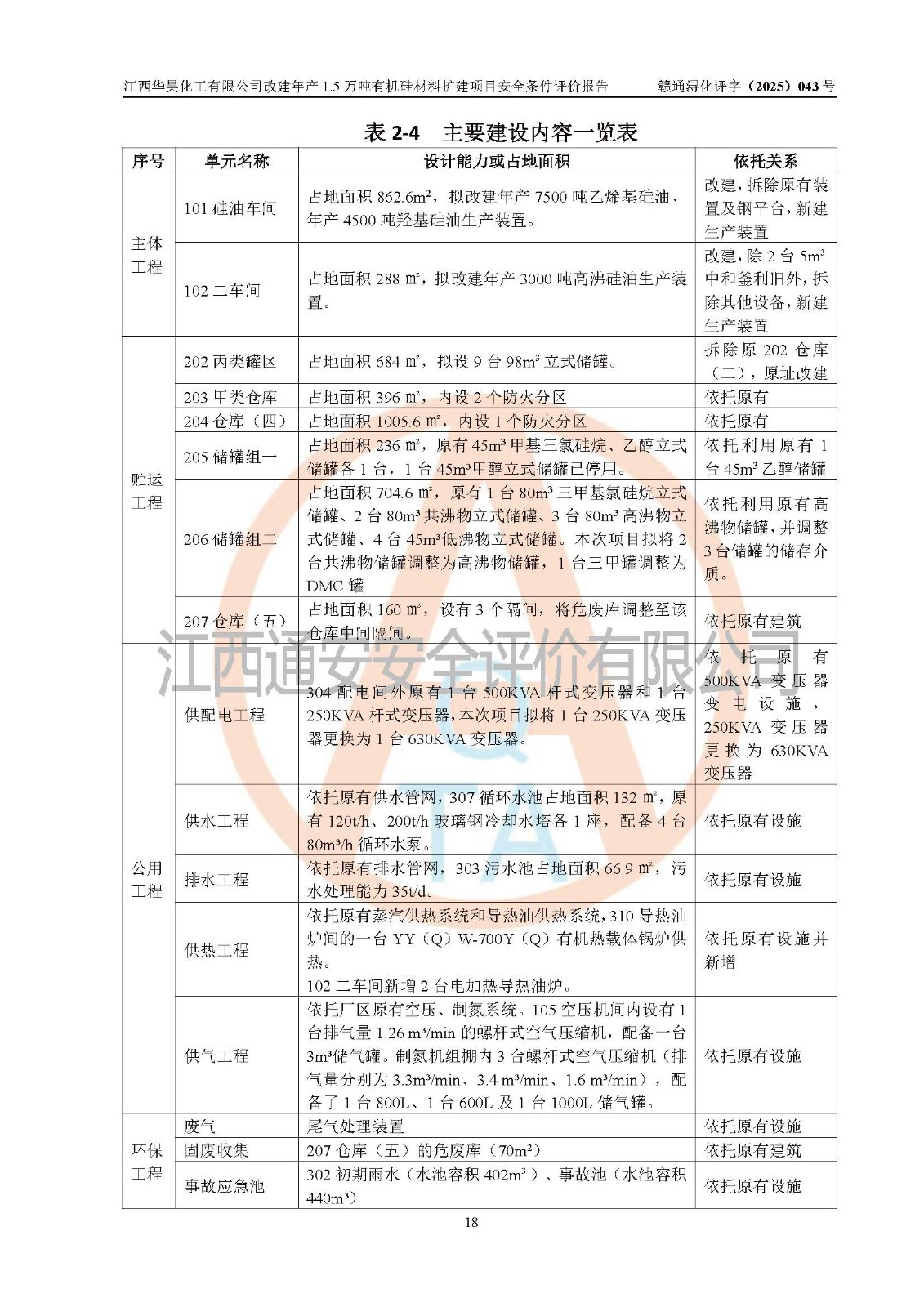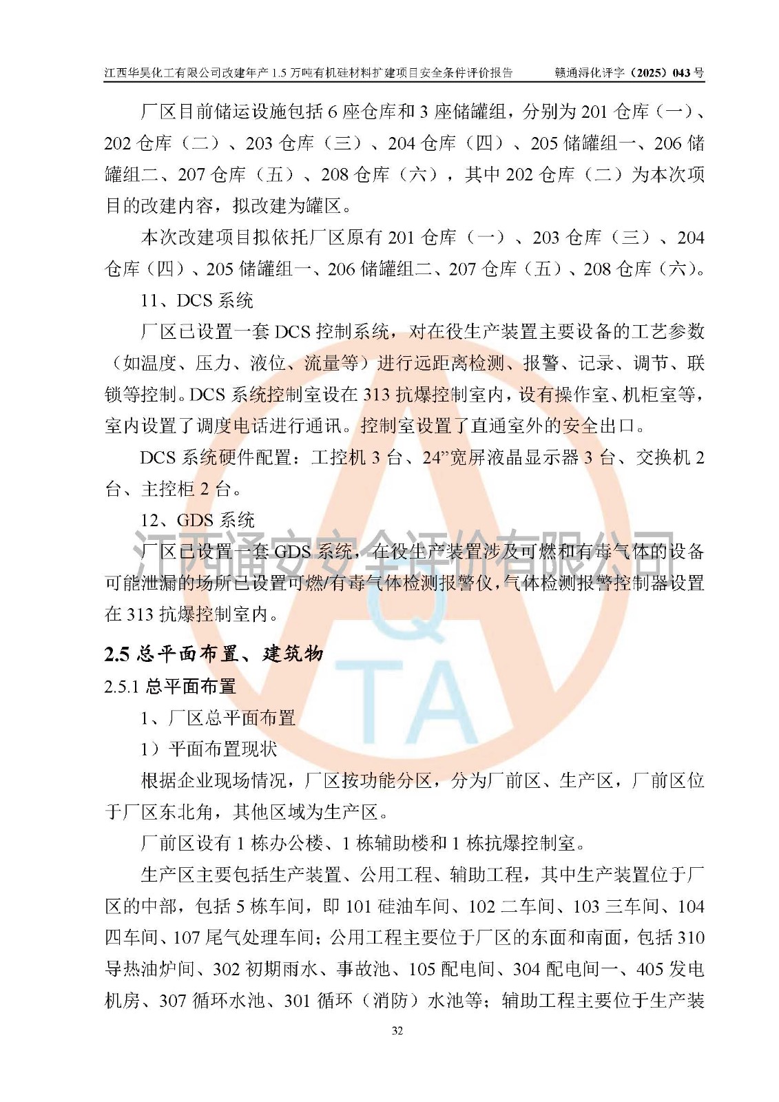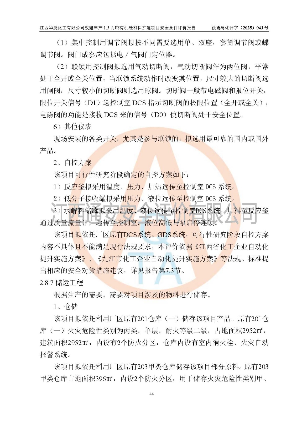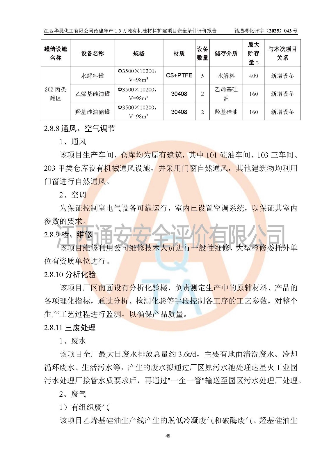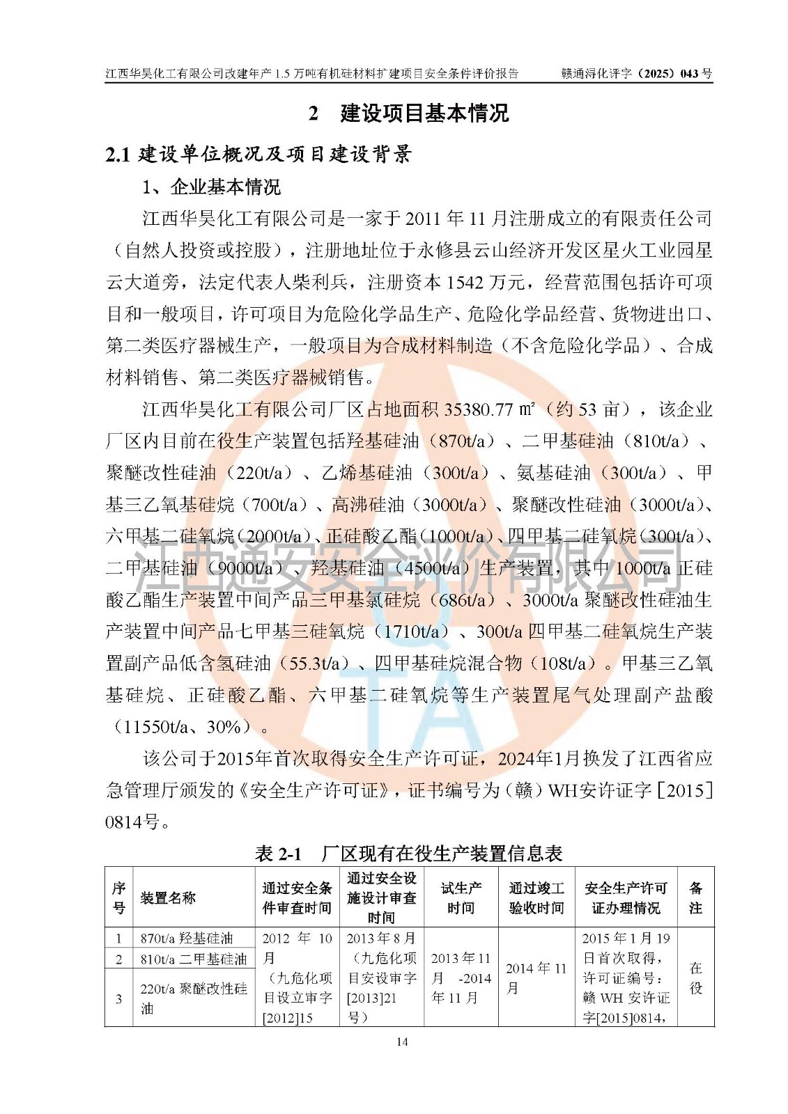 江西華昊化工有限公司是一家于2011年11月注冊成立的有限責(zé)任公司(自然人投資或控股),注冊地址位于永修縣云山經(jīng)濟(jì)開發(fā)區(qū)星火工業(yè)園星云大道旁,法定**人柴利兵,注冊資本1542萬元,經(jīng)營范圍包括許可項(xiàng)目和一般項(xiàng)目,許可項(xiàng)目為危險(xiǎn)化學(xué)品生產(chǎn)、危險(xiǎn)化學(xué)品經(jīng)營、貨物進(jìn)出口、第二類醫(yī)療器械生產(chǎn),一般項(xiàng)目為合成材料制造(不含危險(xiǎn)化學(xué)品)、合成材料銷售、第二類醫(yī)療器械銷售。 為滿足更大市場需求,同時(shí)解決企業(yè)原料及配套生產(chǎn)的需求,江西華昊化工有限公司擬投資5000萬元將廠區(qū)101硅油車間、102二車間原有項(xiàng)目改建為年產(chǎn)1.5萬噸有機(jī)硅材料擴(kuò)建項(xiàng)目(以下簡稱“該項(xiàng)目”)。 該項(xiàng)目生產(chǎn)過程涉及的化學(xué)反應(yīng)包括聚合(常壓)、水解、中和,涉及蒸餾、壓濾、流體輸送、熱交換、產(chǎn)品包裝等化工單元操作過程。該項(xiàng)目涉及的危險(xiǎn)化學(xué)品包括四甲基氫氧化銨、氫氧化鉀、磷酸、30%氫氧化鈉溶液、六甲基二硅氧烷、乙醇、氯化氫、鹽酸、氮?dú)?/span>、DMC(二甲基環(huán)硅氧烷的混合物)、有機(jī)硅單體高沸物、**胺(廢氣組分)、甲醇(廢氣組分)、甲醚(廢氣組分),其中甲醇、甲醚屬于重點(diǎn)監(jiān)管的危險(xiǎn)化學(xué)品,鹽酸屬于第三類易制毒化學(xué)品,乙醇、甲醇、甲醚屬于特別管控危險(xiǎn)化學(xué)品,四甲基氫氧化銨、乙醇、**胺、甲醇、甲醚屬于第四類監(jiān)控化學(xué)品。該項(xiàng)目不涉及劇毒品、易制爆化學(xué)品、高毒物品,不涉及**、二、三類監(jiān)控化學(xué)品。 該項(xiàng)目不涉及重點(diǎn)監(jiān)管的典型危險(xiǎn)化工工藝,生產(chǎn)單元、儲存單元不構(gòu)成危險(xiǎn)化學(xué)品重大危險(xiǎn)源。 該項(xiàng)目副產(chǎn)品鹽酸、中間產(chǎn)品低粘度封頭劑(六甲基二硅氧烷)屬于危險(xiǎn)化學(xué)品,該項(xiàng)目屬于危險(xiǎn)化學(xué)品生產(chǎn)項(xiàng)目,依據(jù)《危險(xiǎn)化學(xué)品生產(chǎn)企業(yè)安全生產(chǎn)許可證實(shí)施辦法》(**安全生產(chǎn)監(jiān)督管理總局令第41號,第79號、89號修改),項(xiàng)目需要辦理危險(xiǎn)化學(xué)品安全生產(chǎn)許可證。 |