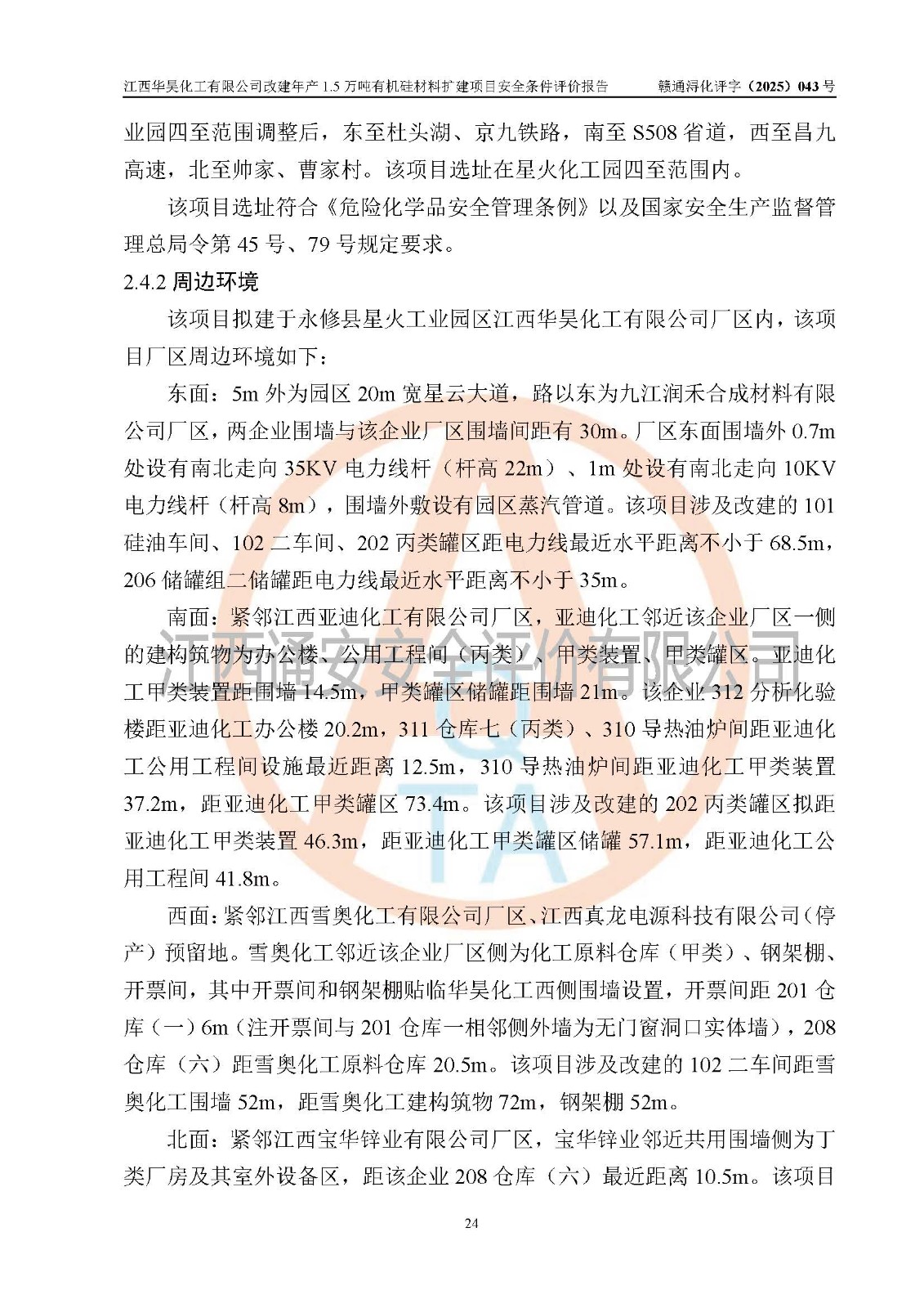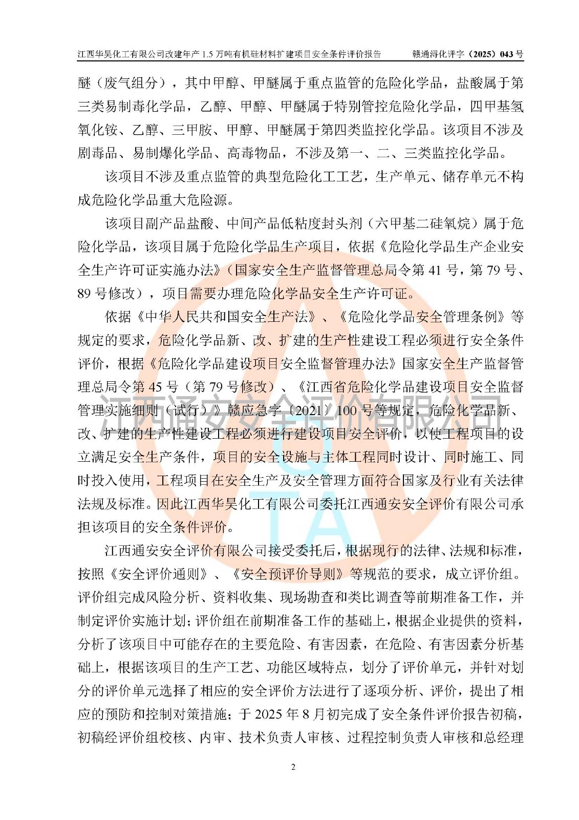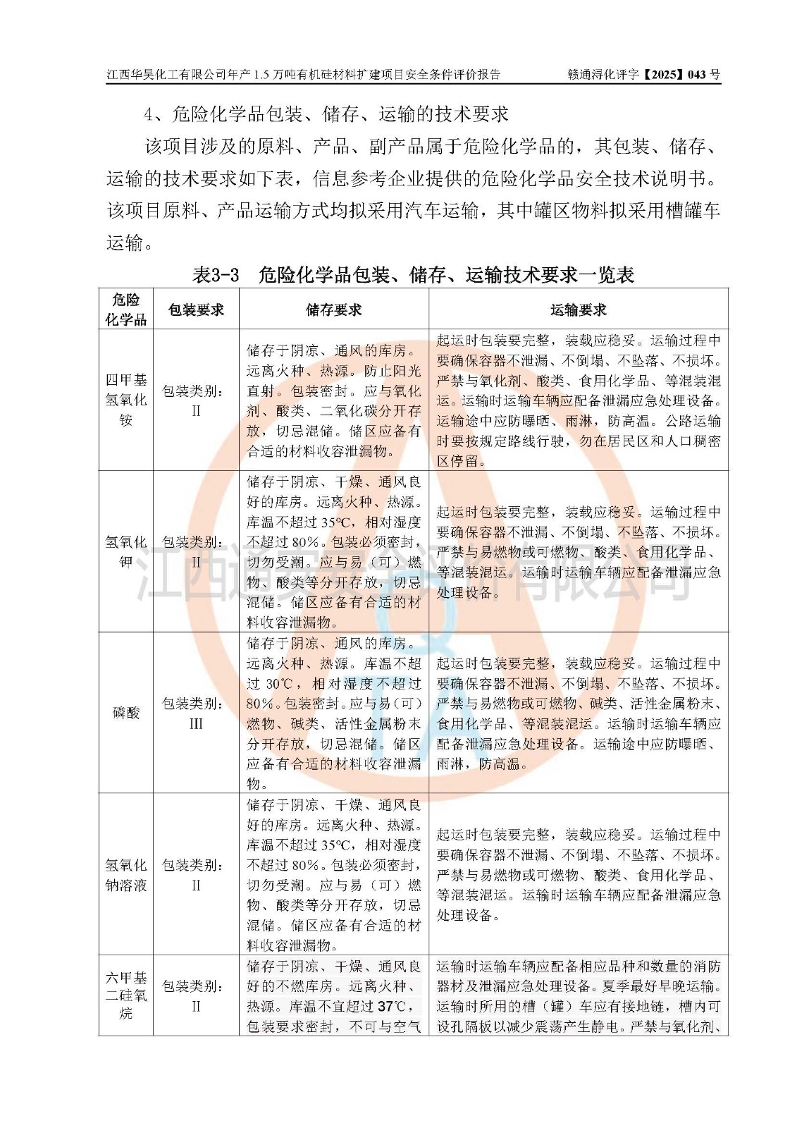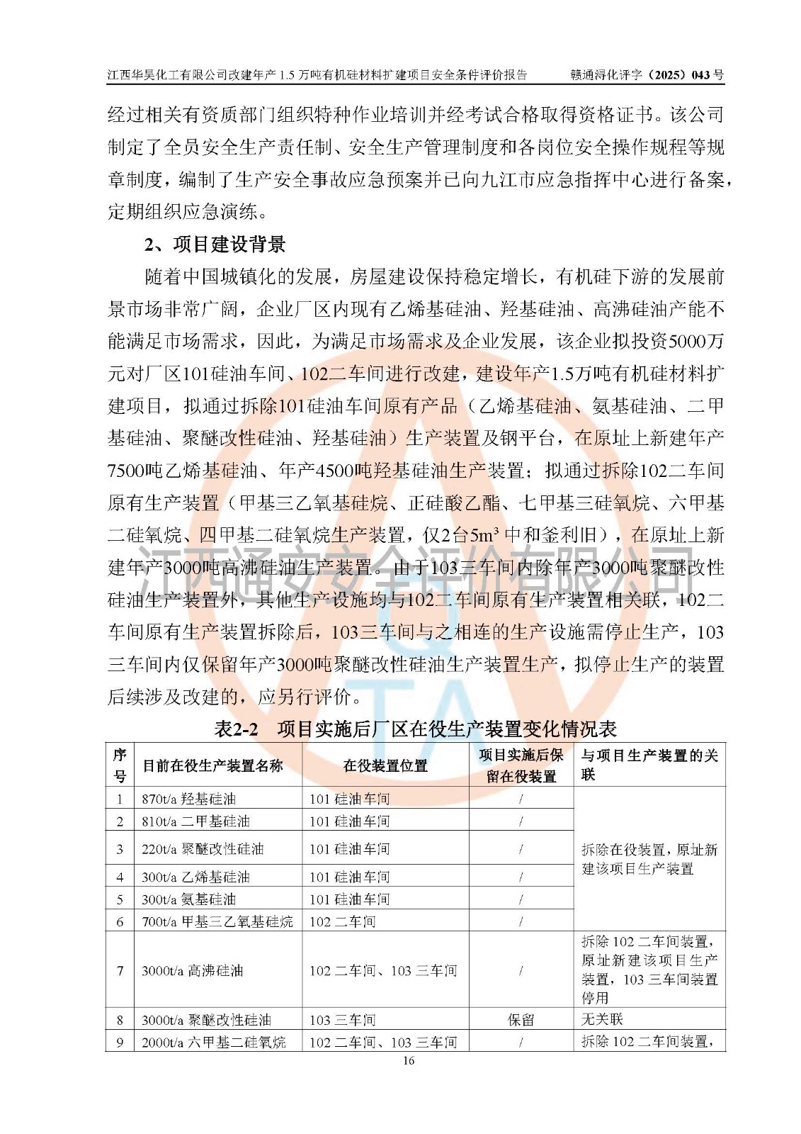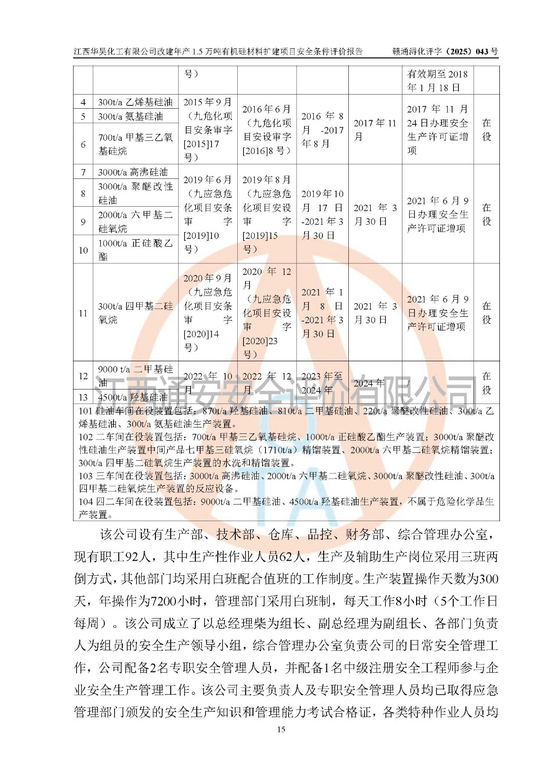 江西華昊化工有限公司是一家于2011年11月注冊成立的有限責(zé)任公司(自然人投資或控股),注冊地址位于永修縣云山經(jīng)濟(jì)開發(fā)區(qū)星火工業(yè)園星云大道旁,法定**人柴利兵,注冊資本1542萬元,經(jīng)營范圍包括許可項(xiàng)目和一般項(xiàng)目,許可項(xiàng)目為危險(xiǎn)化學(xué)品生產(chǎn)、危險(xiǎn)化學(xué)品經(jīng)營、貨物進(jìn)出口、第二類醫(yī)療器械生產(chǎn),一般項(xiàng)目為合成材料制造(不含危險(xiǎn)化學(xué)品)、合成材料銷售、第二類醫(yī)療器械銷售。 為滿足更大市場需求,同時(shí)解決企業(yè)原料及配套生產(chǎn)的需求,江西華昊化工有限公司擬投資5000萬元將廠區(qū)101硅油車間、102二車間原有項(xiàng)目改建為年產(chǎn)1.5萬噸有機(jī)硅材料擴(kuò)建項(xiàng)目(以下簡稱“該項(xiàng)目”)。 該項(xiàng)目生產(chǎn)過程涉及的化學(xué)反應(yīng)包括聚合(常壓)、水解、中和,涉及蒸餾、壓濾、流體輸送、熱交換、產(chǎn)品包裝等化工單元操作過程。該項(xiàng)目涉及的危險(xiǎn)化學(xué)品包括四甲基氫氧化銨、氫氧化鉀、磷酸、30%氫氧化鈉溶液、六甲基二硅氧烷、乙醇、氯化氫、鹽酸、氮?dú)?/span>、DMC(二甲基環(huán)硅氧烷的混合物)、有機(jī)硅單體高沸物、**胺(廢氣組分)、甲醇(廢氣組分)、甲醚(廢氣組分),其中甲醇、甲醚屬于重點(diǎn)監(jiān)管的危險(xiǎn)化學(xué)品,鹽酸屬于第三類易制毒化學(xué)品,乙醇、甲醇、甲醚屬于特別管控危險(xiǎn)化學(xué)品,四甲基氫氧化銨、乙醇、**胺、甲醇、甲醚屬于第四類監(jiān)控化學(xué)品。該項(xiàng)目不涉及劇毒品、易制爆化學(xué)品、高毒物品,不涉及**、二、三類監(jiān)控化學(xué)品。 該項(xiàng)目不涉及重點(diǎn)監(jiān)管的典型危險(xiǎn)化工工藝,生產(chǎn)單元、儲存單元不構(gòu)成危險(xiǎn)化學(xué)品重大危險(xiǎn)源。 該項(xiàng)目副產(chǎn)品鹽酸、中間產(chǎn)品低粘度封頭劑(六甲基二硅氧烷)屬于危險(xiǎn)化學(xué)品,該項(xiàng)目屬于危險(xiǎn)化學(xué)品生產(chǎn)項(xiàng)目,依據(jù)《危險(xiǎn)化學(xué)品生產(chǎn)企業(yè)安全生產(chǎn)許可證實(shí)施辦法》(**安全生產(chǎn)監(jiān)督管理總局令第41號,第79號、89號修改),項(xiàng)目需要辦理危險(xiǎn)化學(xué)品安全生產(chǎn)許可證。 |