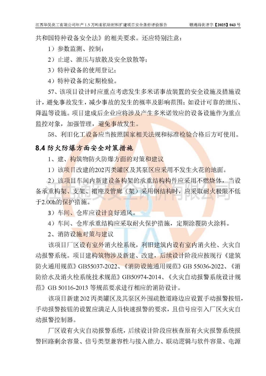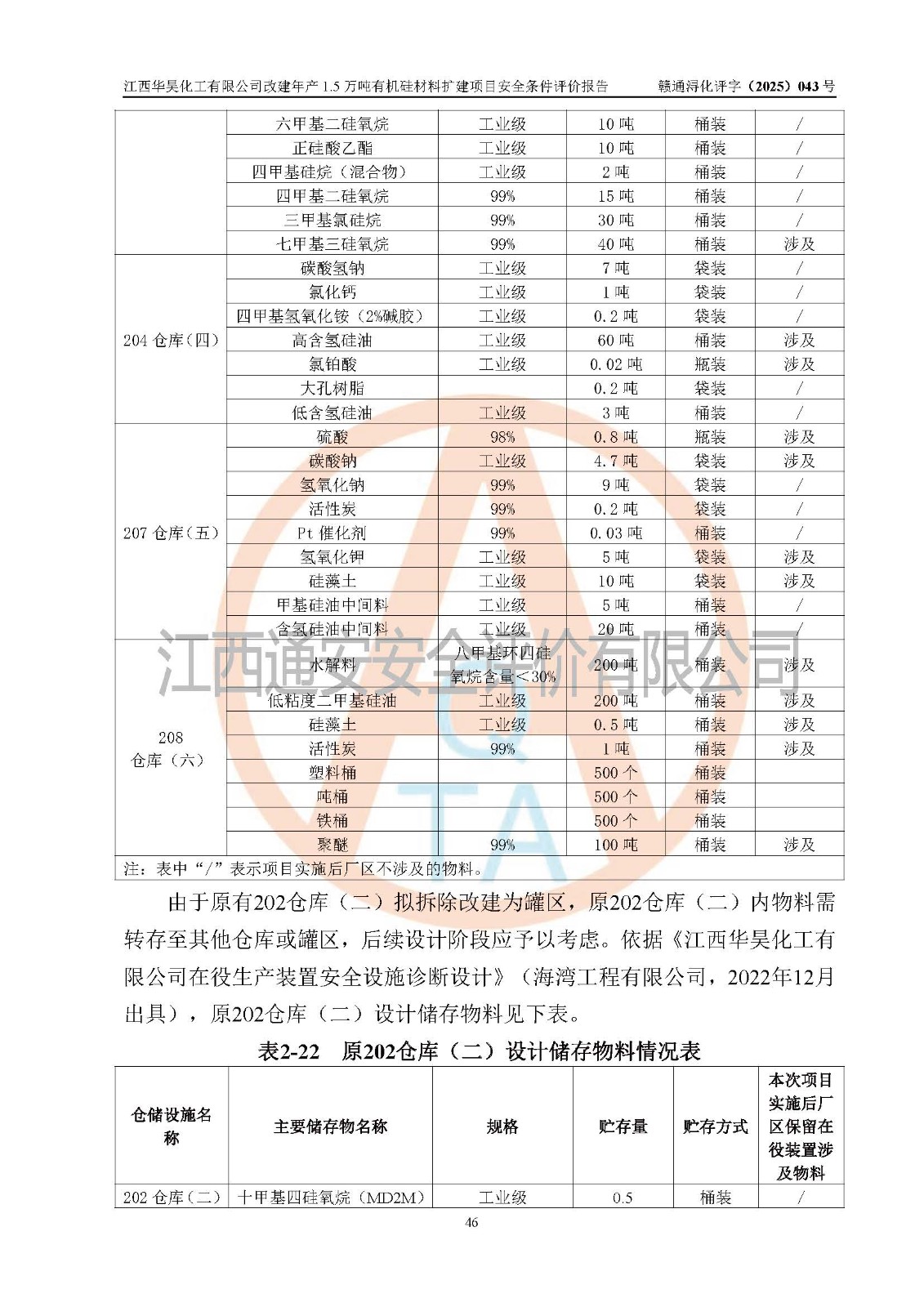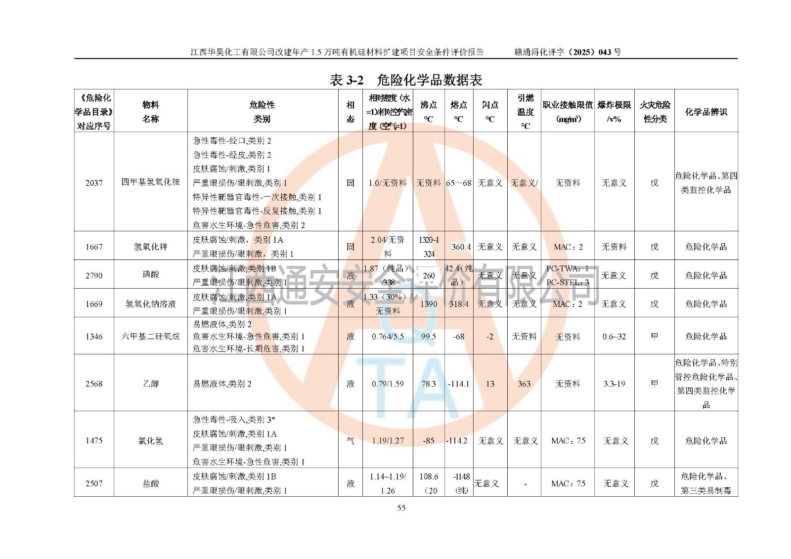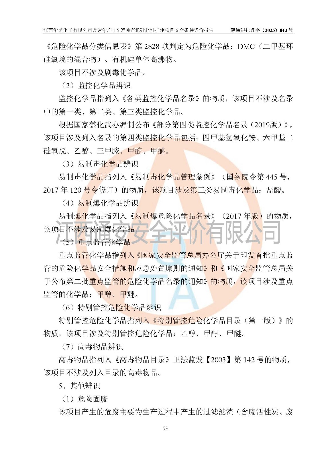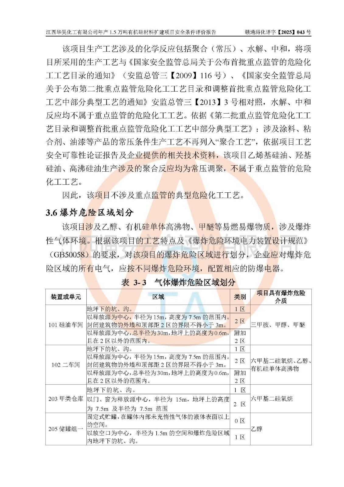江西華昊化工有限公司是一家于2011年11月注冊成立的有限責(zé)任公司(自然人投資或控股),注冊地址位于永修縣云山經(jīng)濟(jì)開發(fā)區(qū)星火工業(yè)園星云大道旁,法定**人柴利兵,注冊資本1542萬元,經(jīng)營范圍包括許可項(xiàng)目和一般項(xiàng)目,許可項(xiàng)目為危險(xiǎn)化學(xué)品生產(chǎn)、危險(xiǎn)化學(xué)品經(jīng)營、貨物進(jìn)出口、第二類醫(yī)療器械生產(chǎn),一般項(xiàng)目為合成材料制造(不含危險(xiǎn)化學(xué)品)、合成材料銷售、第二類醫(yī)療器械銷售。 為滿足更大市場需求,同時(shí)解決企業(yè)原料及配套生產(chǎn)的需求,江西華昊化工有限公司擬投資5000萬元將廠區(qū)101硅油車間、102二車間原有項(xiàng)目改建為年產(chǎn)1.5萬噸有機(jī)硅材料擴(kuò)建項(xiàng)目(以下簡稱“該項(xiàng)目”)。 該項(xiàng)目生產(chǎn)過程涉及的化學(xué)反應(yīng)包括聚合(常壓)、水解、中和,涉及蒸餾、壓濾、流體輸送、熱交換、產(chǎn)品包裝等化工單元操作過程。該項(xiàng)目涉及的危險(xiǎn)化學(xué)品包括四甲基氫氧化銨、氫氧化鉀、磷酸、30%氫氧化鈉溶液、六甲基二硅氧烷、乙醇、氯化氫、鹽酸、氮?dú)?/span>、DMC(二甲基環(huán)硅氧烷的混合物)、有機(jī)硅單體高沸物、**胺(廢氣組分)、甲醇(廢氣組分)、甲醚(廢氣組分),其中甲醇、甲醚屬于重點(diǎn)監(jiān)管的危險(xiǎn)化學(xué)品,鹽酸屬于第三類易制毒化學(xué)品,乙醇、甲醇、甲醚屬于特別管控危險(xiǎn)化學(xué)品,四甲基氫氧化銨、乙醇、**胺、甲醇、甲醚屬于第四類監(jiān)控化學(xué)品。該項(xiàng)目不涉及劇毒品、易制爆化學(xué)品、高毒物品,不涉及**、二、三類監(jiān)控化學(xué)品。 該項(xiàng)目不涉及重點(diǎn)監(jiān)管的典型危險(xiǎn)化工工藝,生產(chǎn)單元、儲存單元不構(gòu)成危險(xiǎn)化學(xué)品重大危險(xiǎn)源。 該項(xiàng)目副產(chǎn)品鹽酸、中間產(chǎn)品低粘度封頭劑(六甲基二硅氧烷)屬于危險(xiǎn)化學(xué)品,該項(xiàng)目屬于危險(xiǎn)化學(xué)品生產(chǎn)項(xiàng)目,依據(jù)《危險(xiǎn)化學(xué)品生產(chǎn)企業(yè)安全生產(chǎn)許可證實(shí)施辦法》(**安全生產(chǎn)監(jiān)督管理總局令第41號,第79號、89號修改),項(xiàng)目需要辦理危險(xiǎn)化學(xué)品安全生產(chǎn)許可證。 |