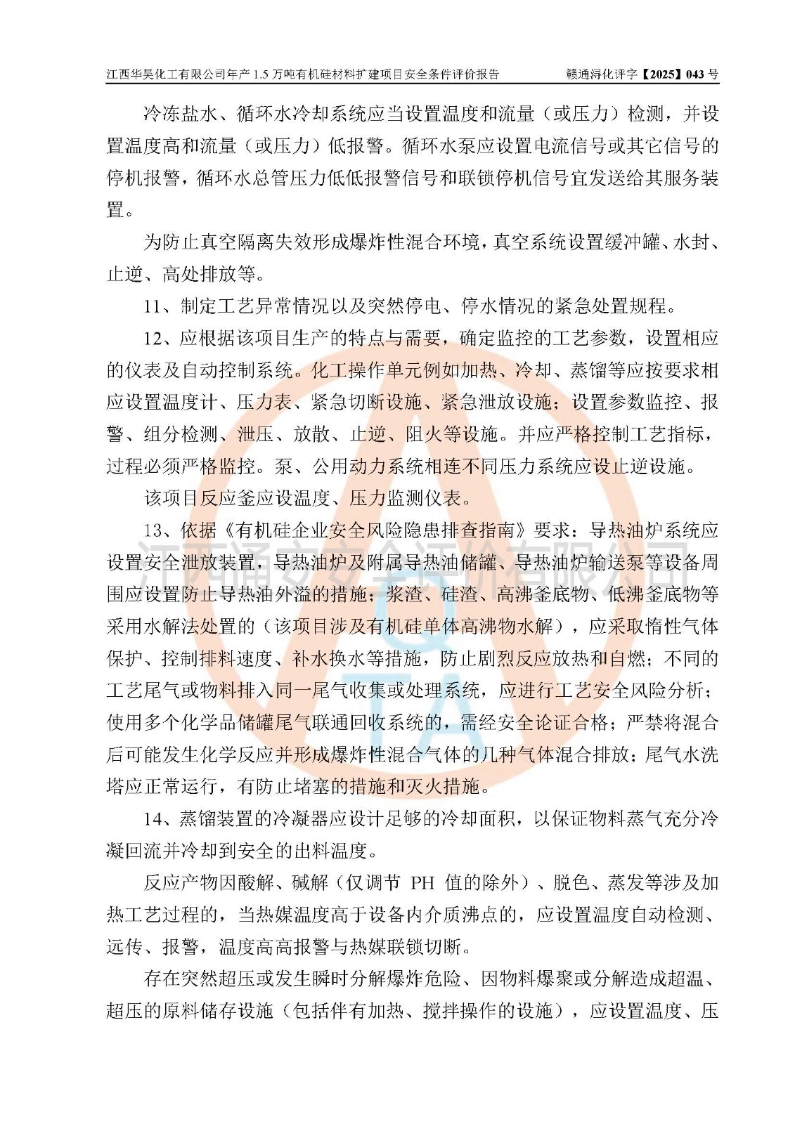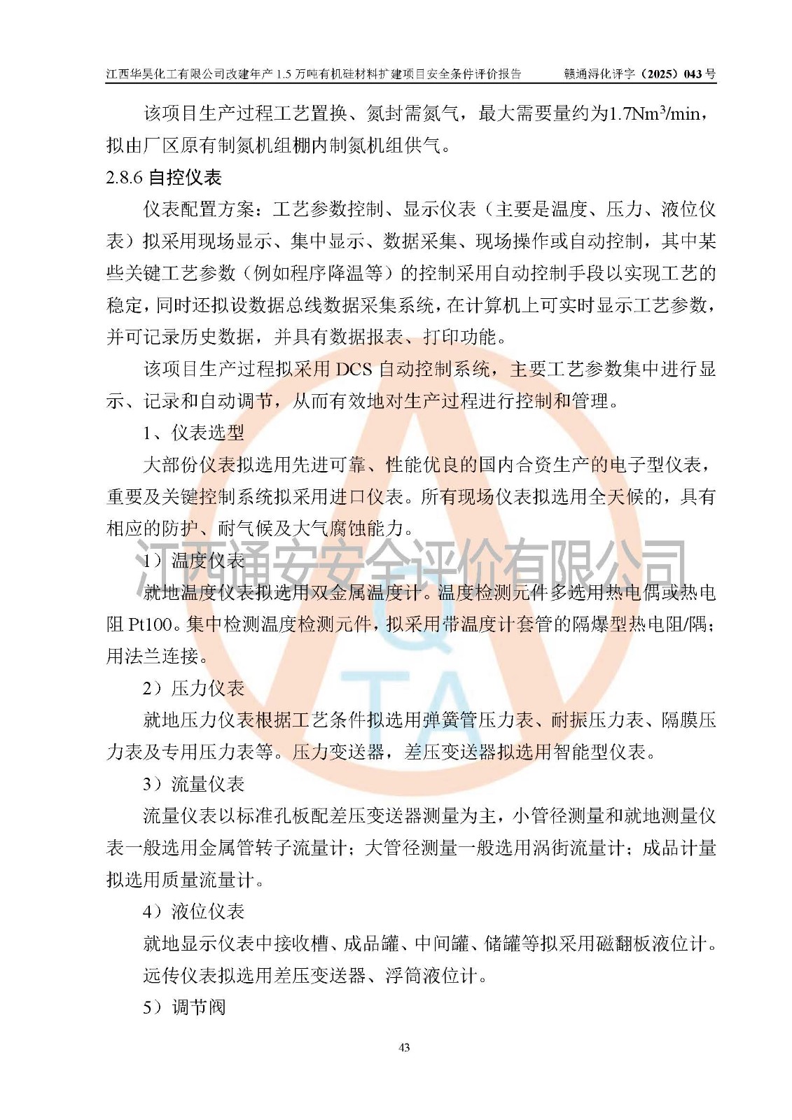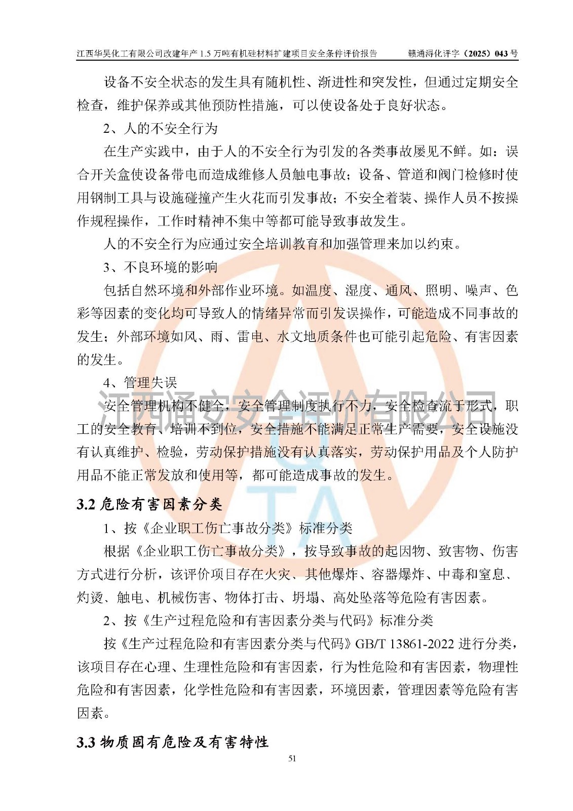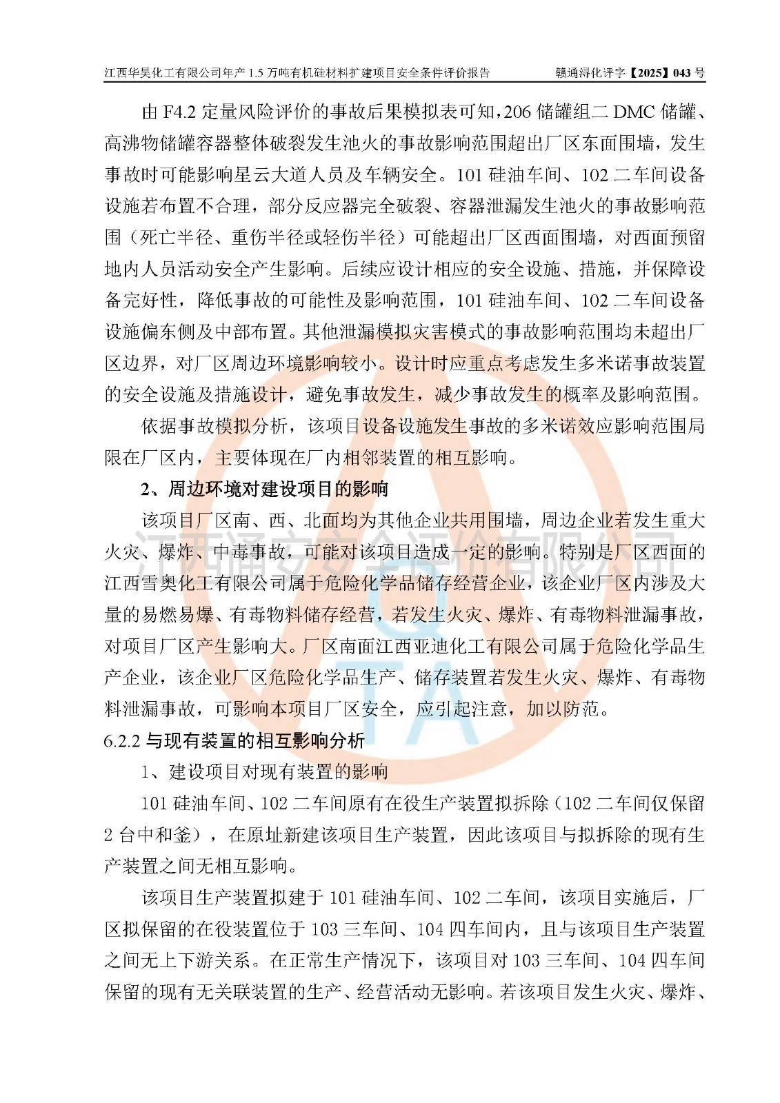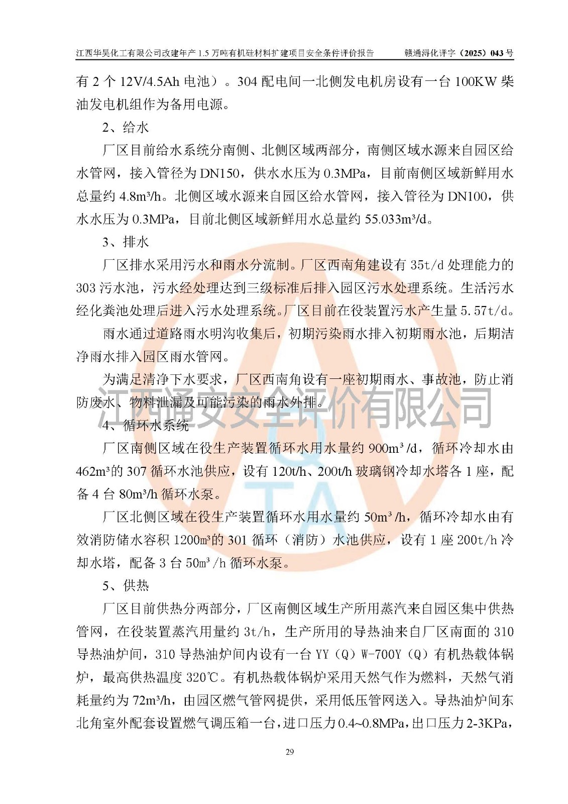 江西華昊化工有限公司是一家于2011年11月注冊成立的有限責(zé)任公司(自然人投資或控股),注冊地址位于永修縣云山經(jīng)濟(jì)開發(fā)區(qū)星火工業(yè)園星云大道旁,法定**人柴利兵,注冊資本1542萬元,經(jīng)營范圍包括許可項(xiàng)目和一般項(xiàng)目,許可項(xiàng)目為危險(xiǎn)化學(xué)品生產(chǎn)、危險(xiǎn)化學(xué)品經(jīng)營、貨物進(jìn)出口、第二類醫(yī)療器械生產(chǎn),一般項(xiàng)目為合成材料制造(不含危險(xiǎn)化學(xué)品)、合成材料銷售、第二類醫(yī)療器械銷售。 為滿足更大市場需求,同時(shí)解決企業(yè)原料及配套生產(chǎn)的需求,江西華昊化工有限公司擬投資5000萬元將廠區(qū)101硅油車間、102二車間原有項(xiàng)目改建為年產(chǎn)1.5萬噸有機(jī)硅材料擴(kuò)建項(xiàng)目(以下簡稱“該項(xiàng)目”)。 該項(xiàng)目生產(chǎn)過程涉及的化學(xué)反應(yīng)包括聚合(常壓)、水解、中和,涉及蒸餾、壓濾、流體輸送、熱交換、產(chǎn)品包裝等化工單元操作過程。該項(xiàng)目涉及的危險(xiǎn)化學(xué)品包括四甲基氫氧化銨、氫氧化鉀、磷酸、30%氫氧化鈉溶液、六甲基二硅氧烷、乙醇、氯化氫、鹽酸、氮?dú)?/span>、DMC(二甲基環(huán)硅氧烷的混合物)、有機(jī)硅單體高沸物、**胺(廢氣組分)、甲醇(廢氣組分)、甲醚(廢氣組分),其中甲醇、甲醚屬于重點(diǎn)監(jiān)管的危險(xiǎn)化學(xué)品,鹽酸屬于第三類易制毒化學(xué)品,乙醇、甲醇、甲醚屬于特別管控危險(xiǎn)化學(xué)品,四甲基氫氧化銨、乙醇、**胺、甲醇、甲醚屬于第四類監(jiān)控化學(xué)品。該項(xiàng)目不涉及劇毒品、易制爆化學(xué)品、高毒物品,不涉及**、二、三類監(jiān)控化學(xué)品。 該項(xiàng)目不涉及重點(diǎn)監(jiān)管的典型危險(xiǎn)化工工藝,生產(chǎn)單元、儲存單元不構(gòu)成危險(xiǎn)化學(xué)品重大危險(xiǎn)源。 該項(xiàng)目副產(chǎn)品鹽酸、中間產(chǎn)品低粘度封頭劑(六甲基二硅氧烷)屬于危險(xiǎn)化學(xué)品,該項(xiàng)目屬于危險(xiǎn)化學(xué)品生產(chǎn)項(xiàng)目,依據(jù)《危險(xiǎn)化學(xué)品生產(chǎn)企業(yè)安全生產(chǎn)許可證實(shí)施辦法》(**安全生產(chǎn)監(jiān)督管理總局令第41號,第79號、89號修改),項(xiàng)目需要辦理危險(xiǎn)化學(xué)品安全生產(chǎn)許可證。 |