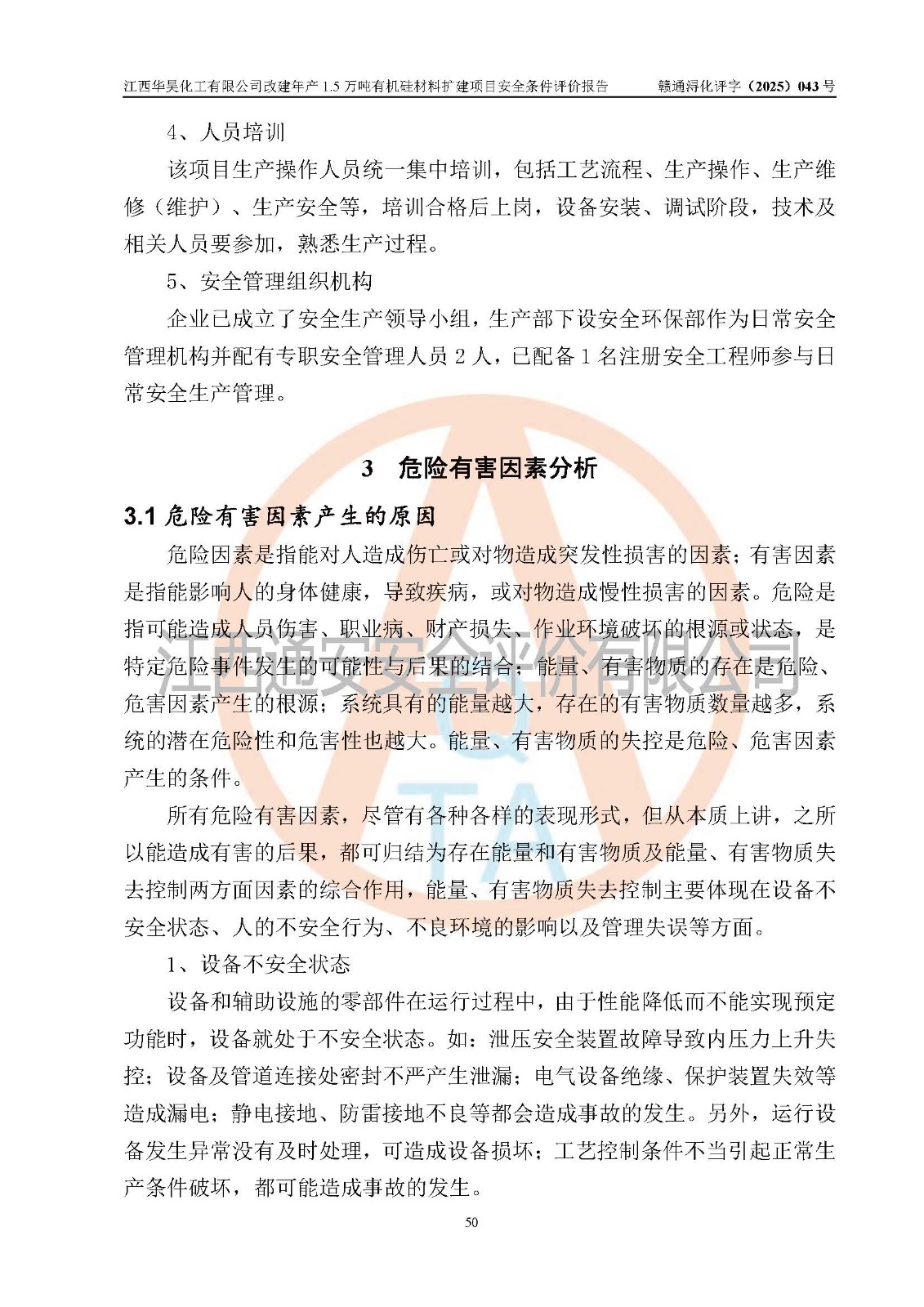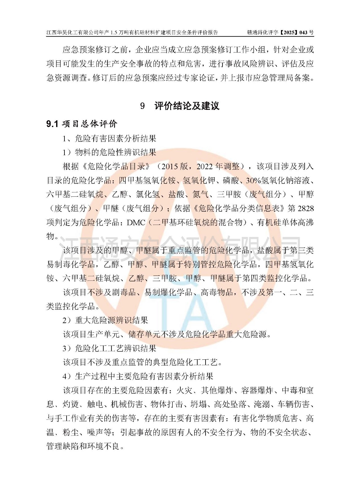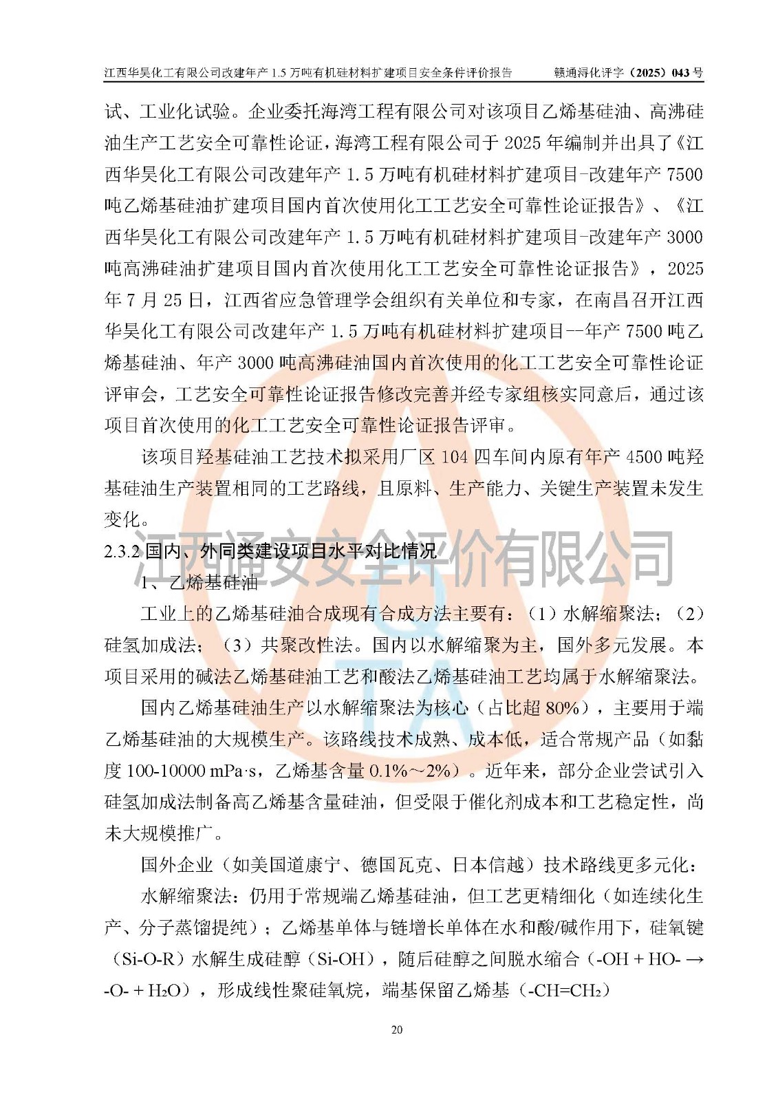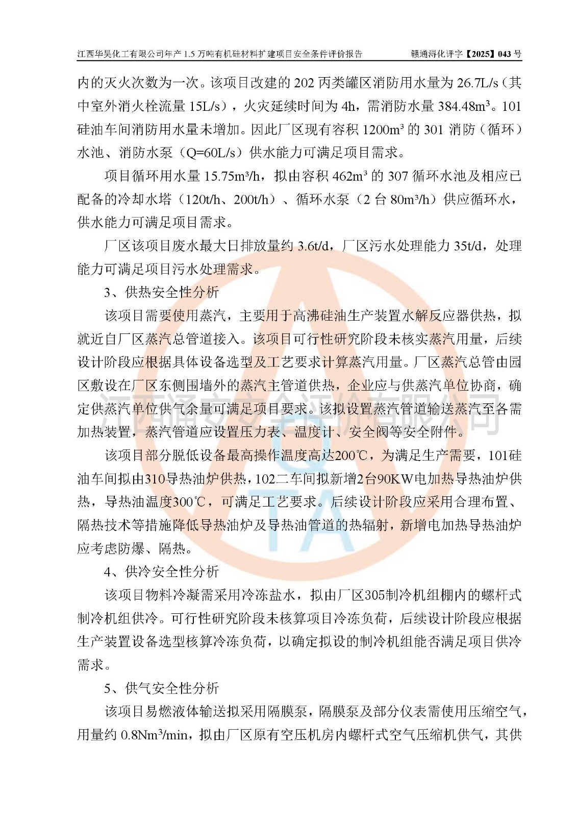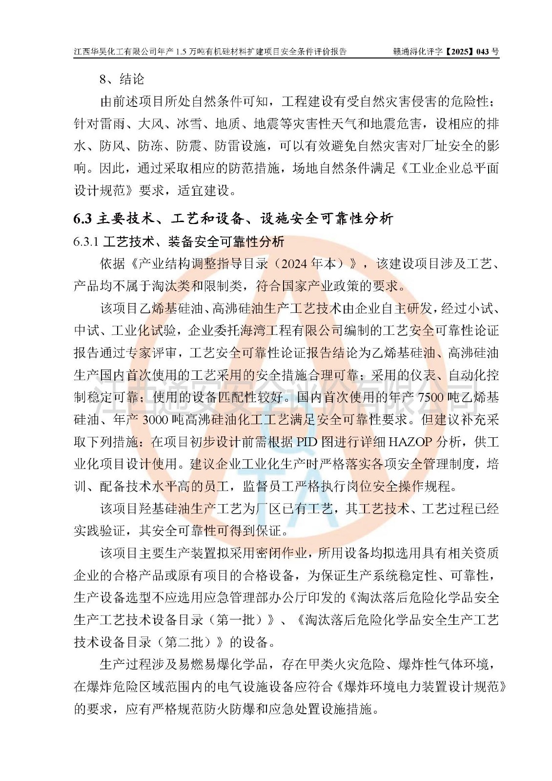 江西華昊化工有限公司是一家于2011年11月注冊成立的有限責(zé)任公司(自然人投資或控股),注冊地址位于永修縣云山經(jīng)濟(jì)開發(fā)區(qū)星火工業(yè)園星云大道旁,法定**人柴利兵,注冊資本1542萬元,經(jīng)營范圍包括許可項(xiàng)目和一般項(xiàng)目,許可項(xiàng)目為危險(xiǎn)化學(xué)品生產(chǎn)、危險(xiǎn)化學(xué)品經(jīng)營、貨物進(jìn)出口、第二類醫(yī)療器械生產(chǎn),一般項(xiàng)目為合成材料制造(不含危險(xiǎn)化學(xué)品)、合成材料銷售、第二類醫(yī)療器械銷售。 為滿足更大市場需求,同時(shí)解決企業(yè)原料及配套生產(chǎn)的需求,江西華昊化工有限公司擬投資5000萬元將廠區(qū)101硅油車間、102二車間原有項(xiàng)目改建為年產(chǎn)1.5萬噸有機(jī)硅材料擴(kuò)建項(xiàng)目(以下簡稱“該項(xiàng)目”)。 該項(xiàng)目生產(chǎn)過程涉及的化學(xué)反應(yīng)包括聚合(常壓)、水解、中和,涉及蒸餾、壓濾、流體輸送、熱交換、產(chǎn)品包裝等化工單元操作過程。該項(xiàng)目涉及的危險(xiǎn)化學(xué)品包括四甲基氫氧化銨、氫氧化鉀、磷酸、30%氫氧化鈉溶液、六甲基二硅氧烷、乙醇、氯化氫、鹽酸、氮?dú)?/span>、DMC(二甲基環(huán)硅氧烷的混合物)、有機(jī)硅單體高沸物、**胺(廢氣組分)、甲醇(廢氣組分)、甲醚(廢氣組分),其中甲醇、甲醚屬于重點(diǎn)監(jiān)管的危險(xiǎn)化學(xué)品,鹽酸屬于第三類易制毒化學(xué)品,乙醇、甲醇、甲醚屬于特別管控危險(xiǎn)化學(xué)品,四甲基氫氧化銨、乙醇、**胺、甲醇、甲醚屬于第四類監(jiān)控化學(xué)品。該項(xiàng)目不涉及劇毒品、易制爆化學(xué)品、高毒物品,不涉及**、二、三類監(jiān)控化學(xué)品。 該項(xiàng)目不涉及重點(diǎn)監(jiān)管的典型危險(xiǎn)化工工藝,生產(chǎn)單元、儲存單元不構(gòu)成危險(xiǎn)化學(xué)品重大危險(xiǎn)源。 該項(xiàng)目副產(chǎn)品鹽酸、中間產(chǎn)品低粘度封頭劑(六甲基二硅氧烷)屬于危險(xiǎn)化學(xué)品,該項(xiàng)目屬于危險(xiǎn)化學(xué)品生產(chǎn)項(xiàng)目,依據(jù)《危險(xiǎn)化學(xué)品生產(chǎn)企業(yè)安全生產(chǎn)許可證實(shí)施辦法》(**安全生產(chǎn)監(jiān)督管理總局令第41號,第79號、89號修改),項(xiàng)目需要辦理危險(xiǎn)化學(xué)品安全生產(chǎn)許可證。 |