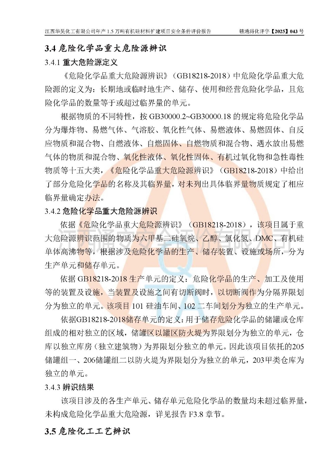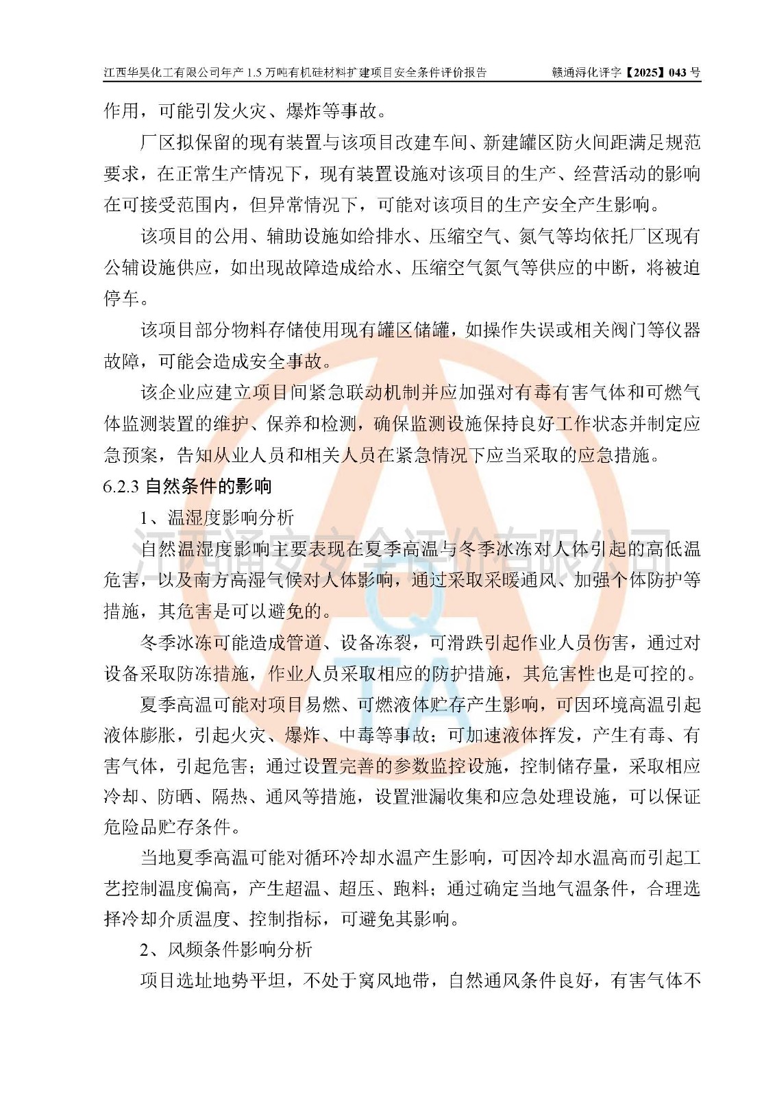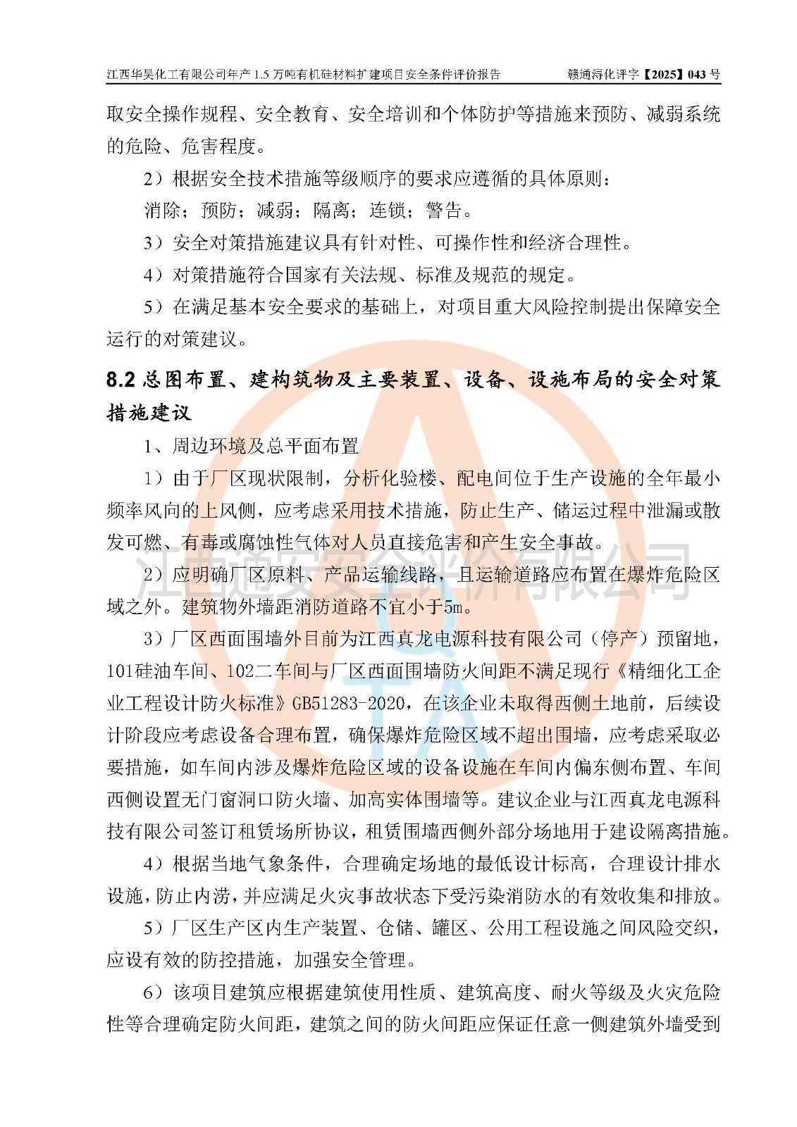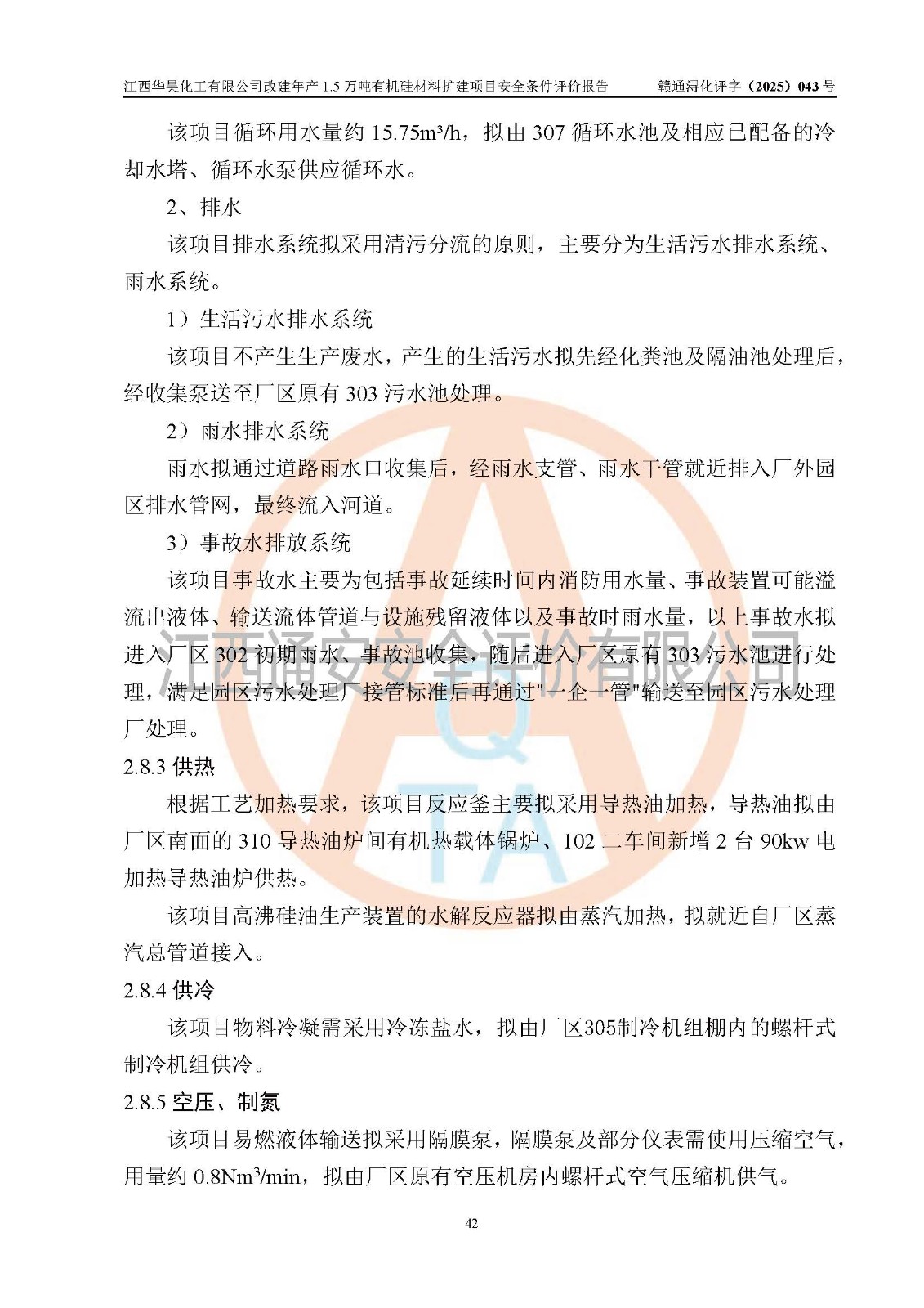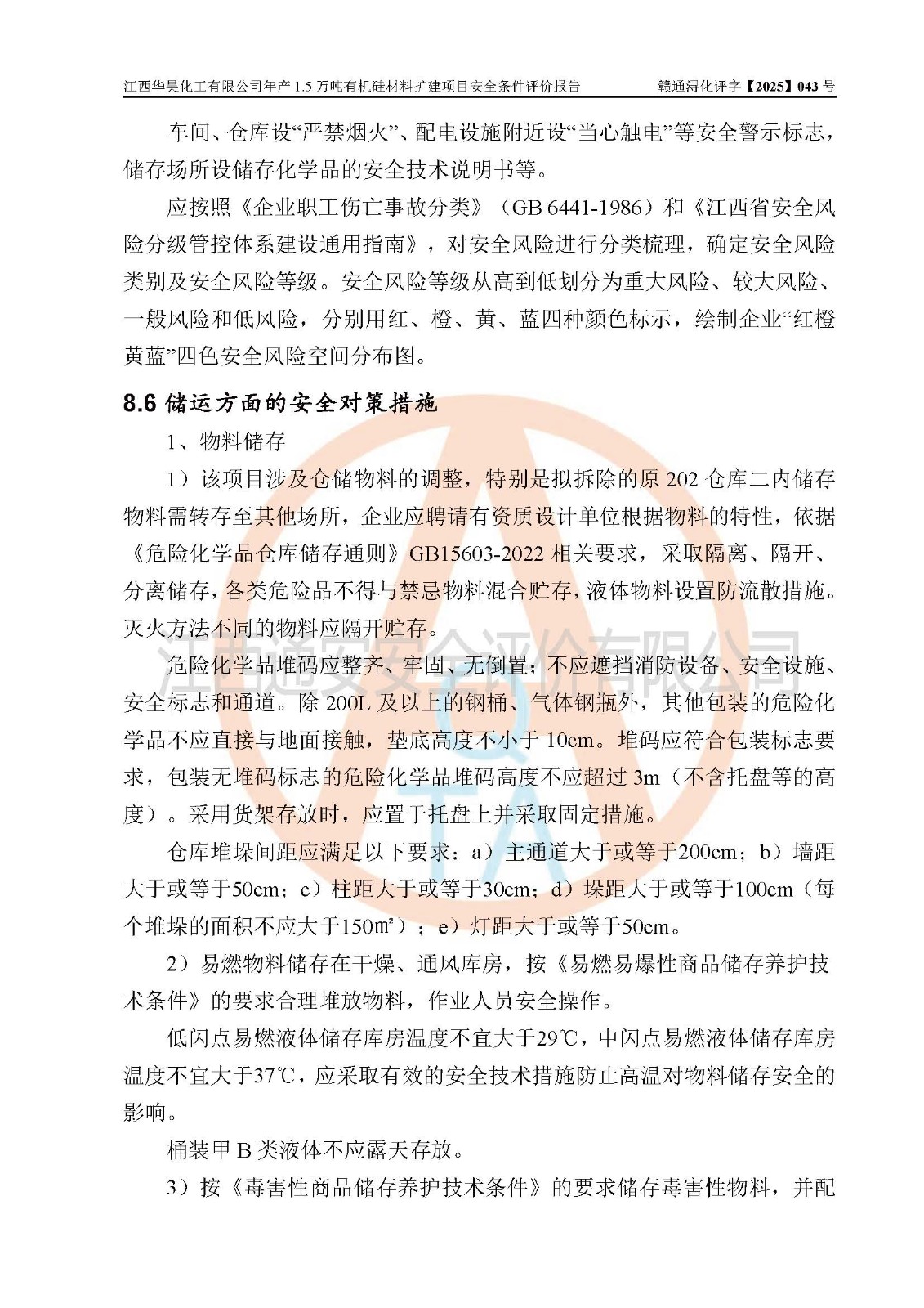 江西華昊化工有限公司是一家于2011年11月注冊成立的有限責(zé)任公司(自然人投資或控股),注冊地址位于永修縣云山經(jīng)濟(jì)開發(fā)區(qū)星火工業(yè)園星云大道旁,法定**人柴利兵,注冊資本1542萬元,經(jīng)營范圍包括許可項(xiàng)目和一般項(xiàng)目,許可項(xiàng)目為危險(xiǎn)化學(xué)品生產(chǎn)、危險(xiǎn)化學(xué)品經(jīng)營、貨物進(jìn)出口、第二類醫(yī)療器械生產(chǎn),一般項(xiàng)目為合成材料制造(不含危險(xiǎn)化學(xué)品)、合成材料銷售、第二類醫(yī)療器械銷售。 為滿足更大市場需求,同時(shí)解決企業(yè)原料及配套生產(chǎn)的需求,江西華昊化工有限公司擬投資5000萬元將廠區(qū)101硅油車間、102二車間原有項(xiàng)目改建為年產(chǎn)1.5萬噸有機(jī)硅材料擴(kuò)建項(xiàng)目(以下簡稱“該項(xiàng)目”)。 該項(xiàng)目生產(chǎn)過程涉及的化學(xué)反應(yīng)包括聚合(常壓)、水解、中和,涉及蒸餾、壓濾、流體輸送、熱交換、產(chǎn)品包裝等化工單元操作過程。該項(xiàng)目涉及的危險(xiǎn)化學(xué)品包括四甲基氫氧化銨、氫氧化鉀、磷酸、30%氫氧化鈉溶液、六甲基二硅氧烷、乙醇、氯化氫、鹽酸、氮?dú)?/span>、DMC(二甲基環(huán)硅氧烷的混合物)、有機(jī)硅單體高沸物、**胺(廢氣組分)、甲醇(廢氣組分)、甲醚(廢氣組分),其中甲醇、甲醚屬于重點(diǎn)監(jiān)管的危險(xiǎn)化學(xué)品,鹽酸屬于第三類易制毒化學(xué)品,乙醇、甲醇、甲醚屬于特別管控危險(xiǎn)化學(xué)品,四甲基氫氧化銨、乙醇、**胺、甲醇、甲醚屬于第四類監(jiān)控化學(xué)品。該項(xiàng)目不涉及劇毒品、易制爆化學(xué)品、高毒物品,不涉及**、二、三類監(jiān)控化學(xué)品。 該項(xiàng)目不涉及重點(diǎn)監(jiān)管的典型危險(xiǎn)化工工藝,生產(chǎn)單元、儲存單元不構(gòu)成危險(xiǎn)化學(xué)品重大危險(xiǎn)源。 該項(xiàng)目副產(chǎn)品鹽酸、中間產(chǎn)品低粘度封頭劑(六甲基二硅氧烷)屬于危險(xiǎn)化學(xué)品,該項(xiàng)目屬于危險(xiǎn)化學(xué)品生產(chǎn)項(xiàng)目,依據(jù)《危險(xiǎn)化學(xué)品生產(chǎn)企業(yè)安全生產(chǎn)許可證實(shí)施辦法》(**安全生產(chǎn)監(jiān)督管理總局令第41號,第79號、89號修改),項(xiàng)目需要辦理危險(xiǎn)化學(xué)品安全生產(chǎn)許可證。 |