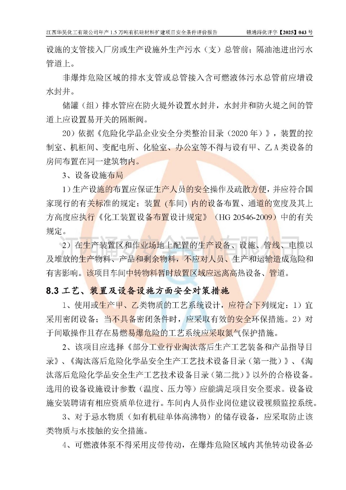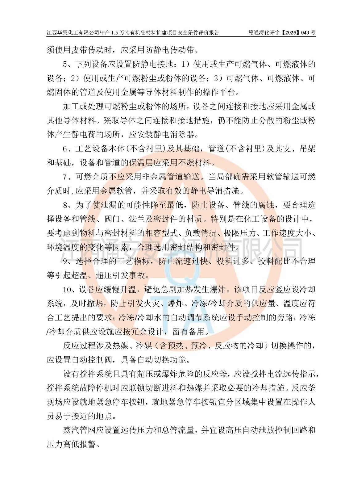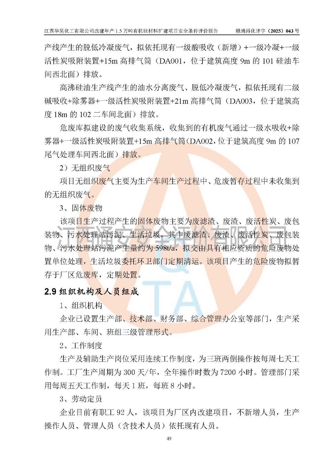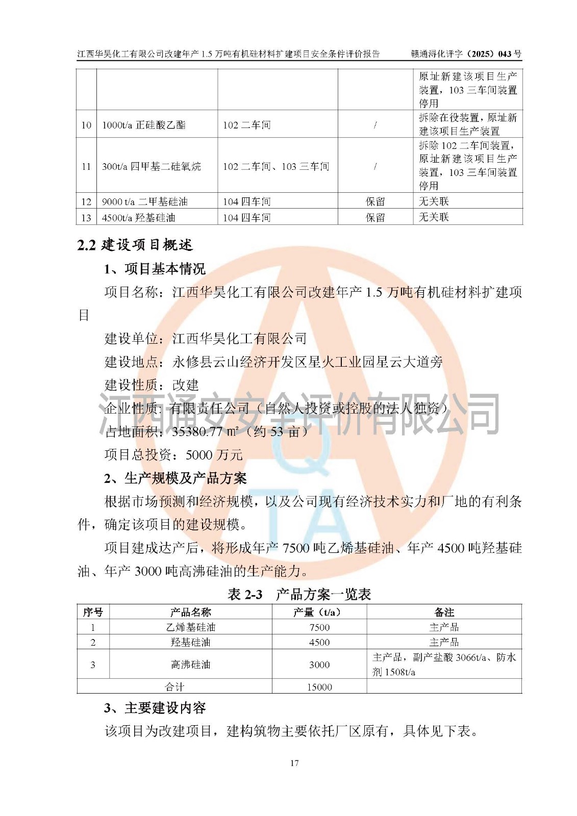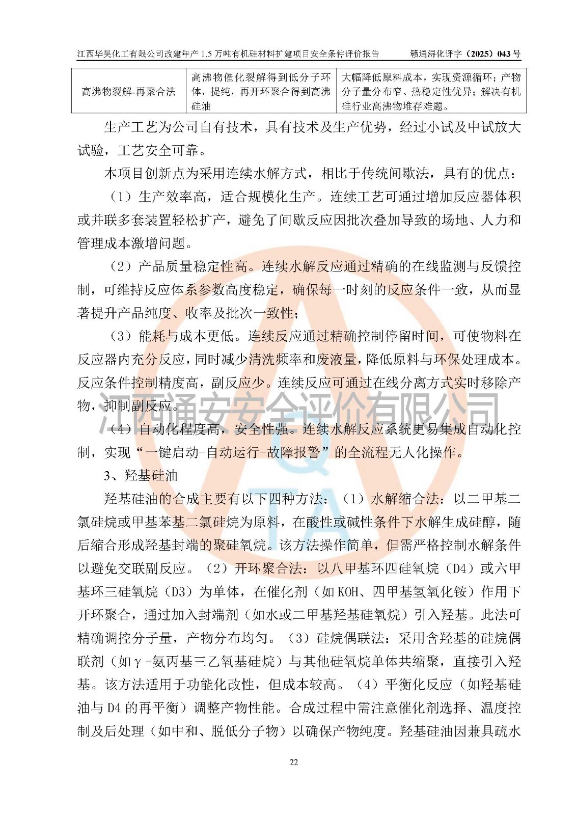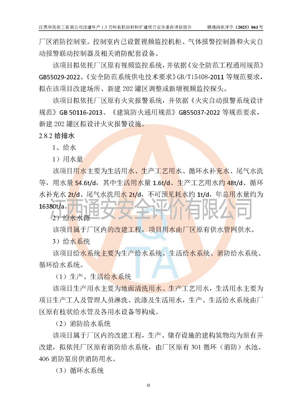江西華昊化工有限公司是一家于2011年11月注冊成立的有限責(zé)任公司(自然人投資或控股),注冊地址位于永修縣云山經(jīng)濟(jì)開發(fā)區(qū)星火工業(yè)園星云大道旁,法定**人柴利兵,注冊資本1542萬元,經(jīng)營范圍包括許可項(xiàng)目和一般項(xiàng)目,許可項(xiàng)目為危險(xiǎn)化學(xué)品生產(chǎn)、危險(xiǎn)化學(xué)品經(jīng)營、貨物進(jìn)出口、第二類醫(yī)療器械生產(chǎn),一般項(xiàng)目為合成材料制造(不含危險(xiǎn)化學(xué)品)、合成材料銷售、第二類醫(yī)療器械銷售。 為滿足更大市場需求,同時(shí)解決企業(yè)原料及配套生產(chǎn)的需求,江西華昊化工有限公司擬投資5000萬元將廠區(qū)101硅油車間、102二車間原有項(xiàng)目改建為年產(chǎn)1.5萬噸有機(jī)硅材料擴(kuò)建項(xiàng)目(以下簡稱“該項(xiàng)目”)。 該項(xiàng)目生產(chǎn)過程涉及的化學(xué)反應(yīng)包括聚合(常壓)、水解、中和,涉及蒸餾、壓濾、流體輸送、熱交換、產(chǎn)品包裝等化工單元操作過程。該項(xiàng)目涉及的危險(xiǎn)化學(xué)品包括四甲基氫氧化銨、氫氧化鉀、磷酸、30%氫氧化鈉溶液、六甲基二硅氧烷、乙醇、氯化氫、鹽酸、氮?dú)?/span>、DMC(二甲基環(huán)硅氧烷的混合物)、有機(jī)硅單體高沸物、**胺(廢氣組分)、甲醇(廢氣組分)、甲醚(廢氣組分),其中甲醇、甲醚屬于重點(diǎn)監(jiān)管的危險(xiǎn)化學(xué)品,鹽酸屬于第三類易制毒化學(xué)品,乙醇、甲醇、甲醚屬于特別管控危險(xiǎn)化學(xué)品,四甲基氫氧化銨、乙醇、**胺、甲醇、甲醚屬于第四類監(jiān)控化學(xué)品。該項(xiàng)目不涉及劇毒品、易制爆化學(xué)品、高毒物品,不涉及**、二、三類監(jiān)控化學(xué)品。 該項(xiàng)目不涉及重點(diǎn)監(jiān)管的典型危險(xiǎn)化工工藝,生產(chǎn)單元、儲存單元不構(gòu)成危險(xiǎn)化學(xué)品重大危險(xiǎn)源。 該項(xiàng)目副產(chǎn)品鹽酸、中間產(chǎn)品低粘度封頭劑(六甲基二硅氧烷)屬于危險(xiǎn)化學(xué)品,該項(xiàng)目屬于危險(xiǎn)化學(xué)品生產(chǎn)項(xiàng)目,依據(jù)《危險(xiǎn)化學(xué)品生產(chǎn)企業(yè)安全生產(chǎn)許可證實(shí)施辦法》(**安全生產(chǎn)監(jiān)督管理總局令第41號,第79號、89號修改),項(xiàng)目需要辦理危險(xiǎn)化學(xué)品安全生產(chǎn)許可證。 |