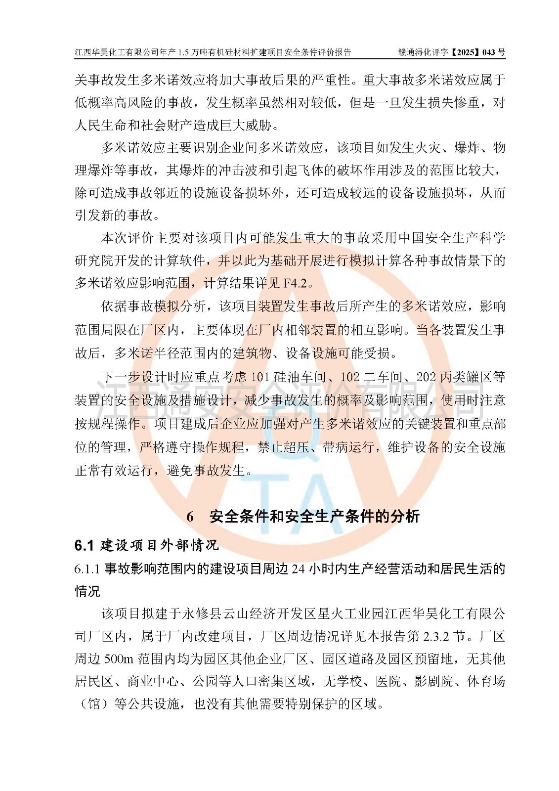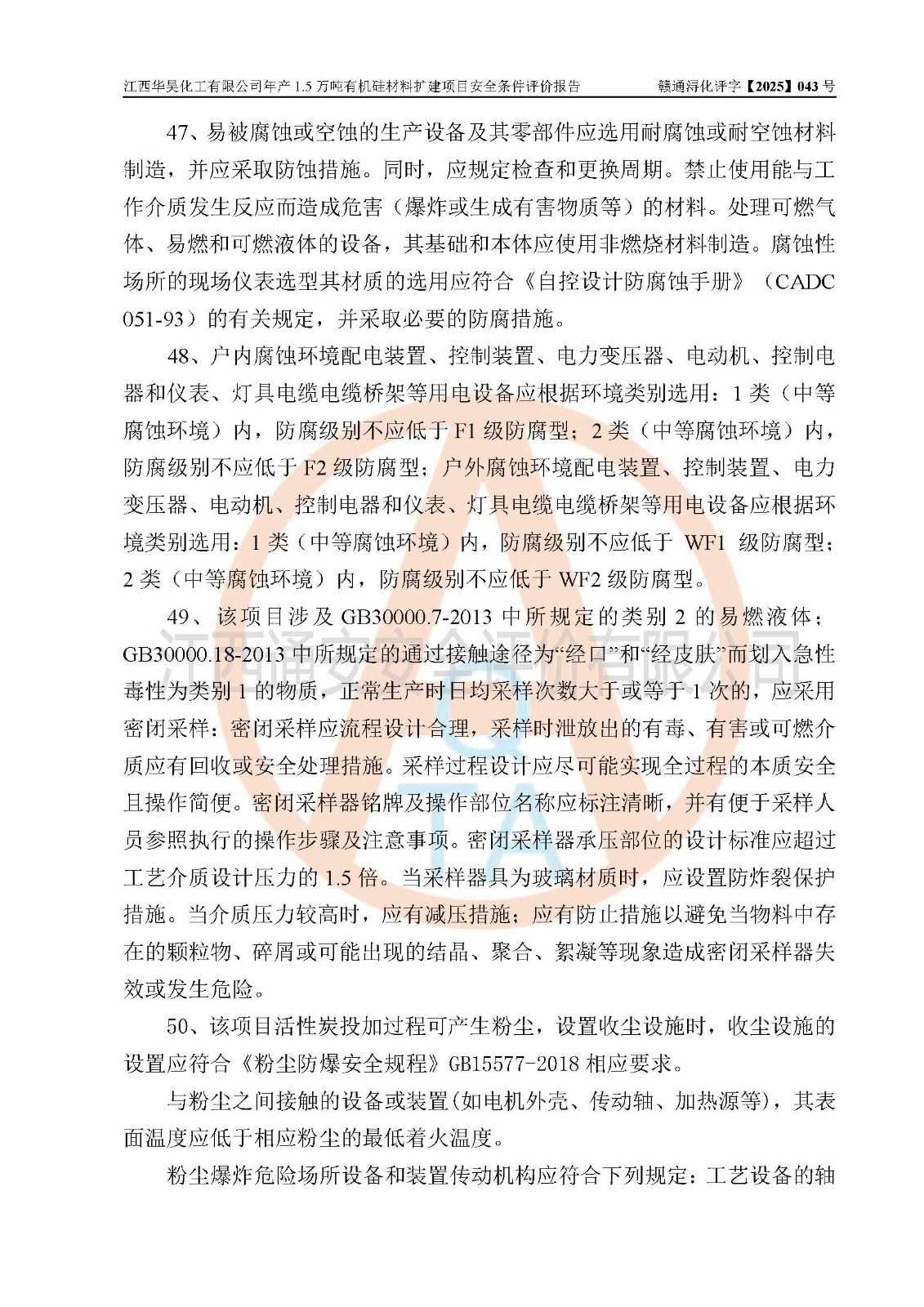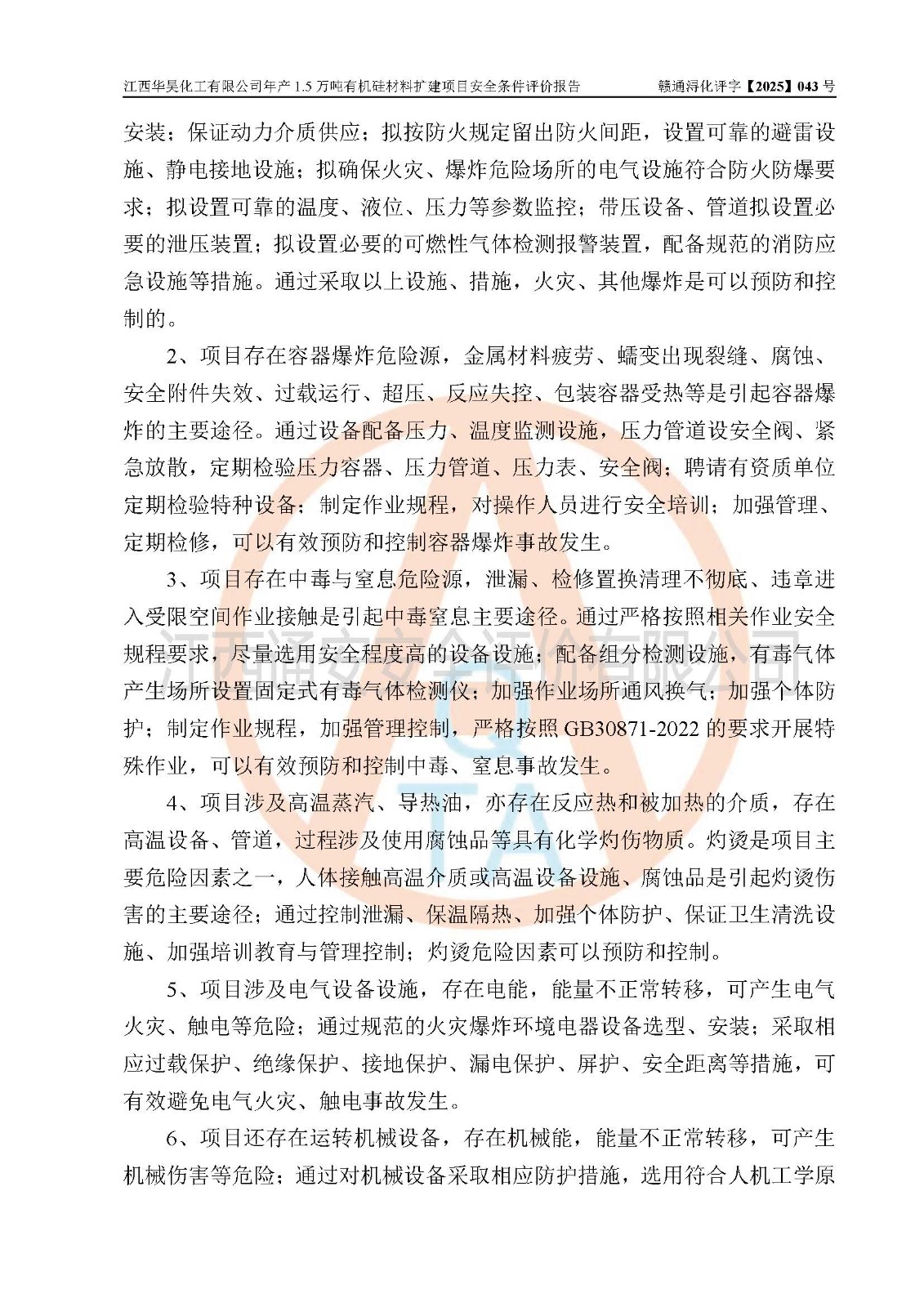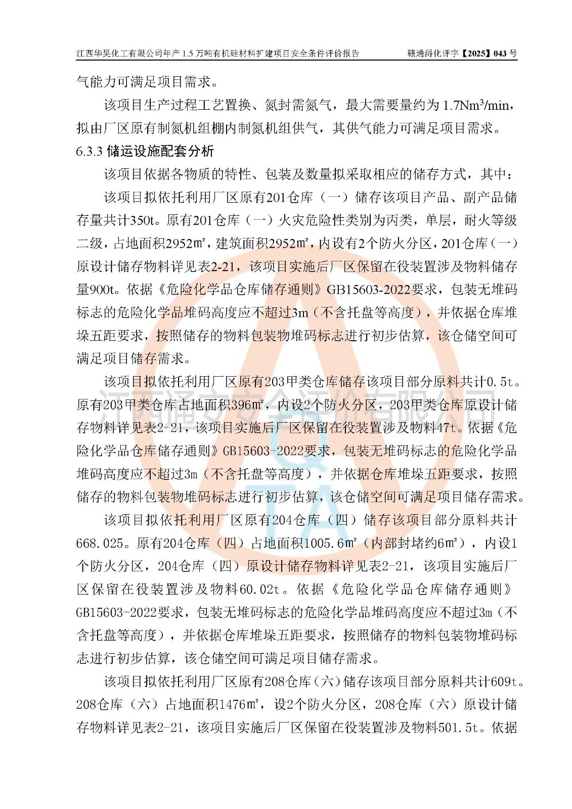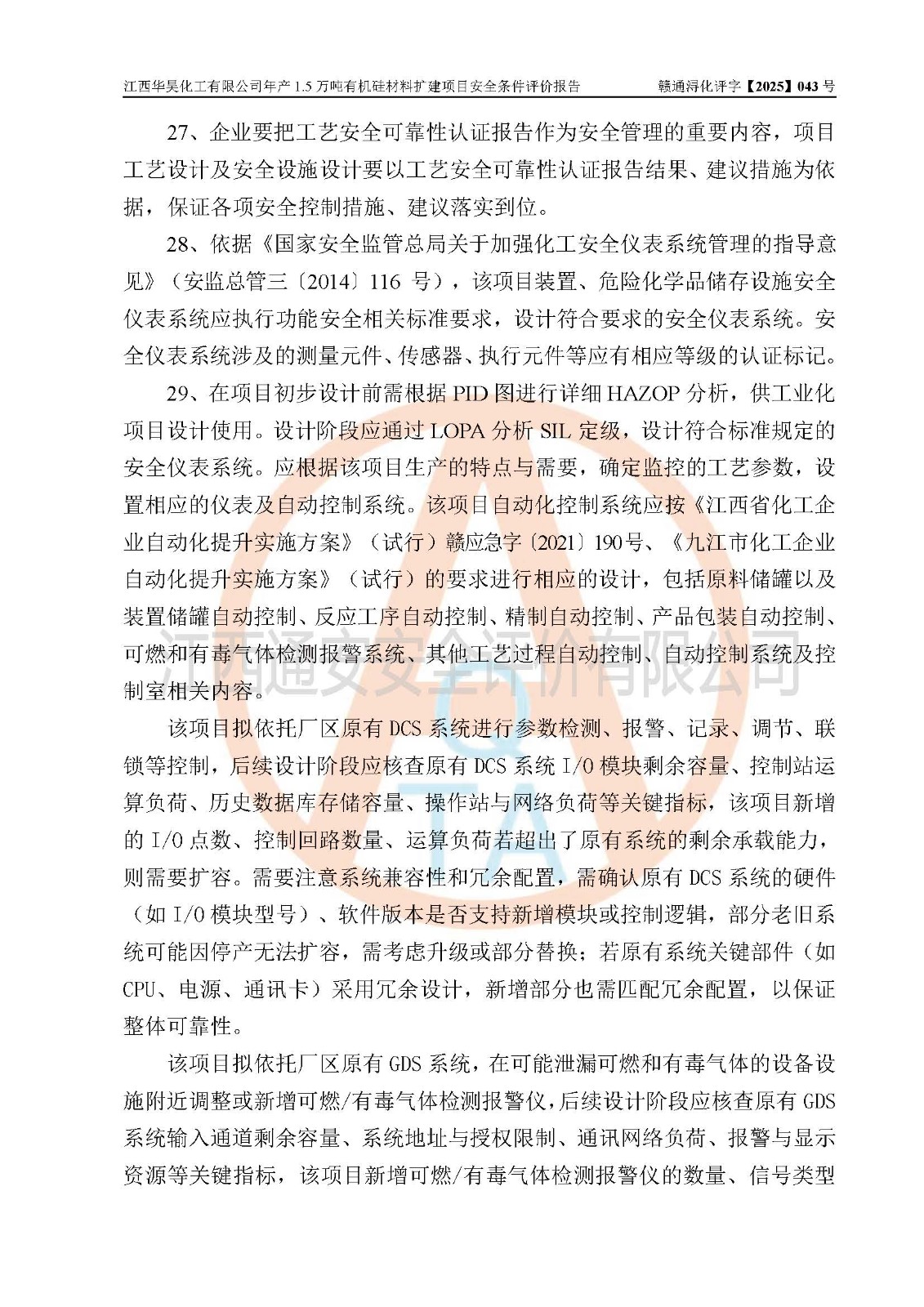 江西華昊化工有限公司是一家于2011年11月注冊成立的有限責(zé)任公司(自然人投資或控股),注冊地址位于永修縣云山經(jīng)濟(jì)開發(fā)區(qū)星火工業(yè)園星云大道旁,法定**人柴利兵,注冊資本1542萬元,經(jīng)營范圍包括許可項(xiàng)目和一般項(xiàng)目,許可項(xiàng)目為危險(xiǎn)化學(xué)品生產(chǎn)、危險(xiǎn)化學(xué)品經(jīng)營、貨物進(jìn)出口、第二類醫(yī)療器械生產(chǎn),一般項(xiàng)目為合成材料制造(不含危險(xiǎn)化學(xué)品)、合成材料銷售、第二類醫(yī)療器械銷售。 為滿足更大市場需求,同時(shí)解決企業(yè)原料及配套生產(chǎn)的需求,江西華昊化工有限公司擬投資5000萬元將廠區(qū)101硅油車間、102二車間原有項(xiàng)目改建為年產(chǎn)1.5萬噸有機(jī)硅材料擴(kuò)建項(xiàng)目(以下簡稱“該項(xiàng)目”)。 該項(xiàng)目生產(chǎn)過程涉及的化學(xué)反應(yīng)包括聚合(常壓)、水解、中和,涉及蒸餾、壓濾、流體輸送、熱交換、產(chǎn)品包裝等化工單元操作過程。該項(xiàng)目涉及的危險(xiǎn)化學(xué)品包括四甲基氫氧化銨、氫氧化鉀、磷酸、30%氫氧化鈉溶液、六甲基二硅氧烷、乙醇、氯化氫、鹽酸、氮?dú)?/span>、DMC(二甲基環(huán)硅氧烷的混合物)、有機(jī)硅單體高沸物、**胺(廢氣組分)、甲醇(廢氣組分)、甲醚(廢氣組分),其中甲醇、甲醚屬于重點(diǎn)監(jiān)管的危險(xiǎn)化學(xué)品,鹽酸屬于第三類易制毒化學(xué)品,乙醇、甲醇、甲醚屬于特別管控危險(xiǎn)化學(xué)品,四甲基氫氧化銨、乙醇、**胺、甲醇、甲醚屬于第四類監(jiān)控化學(xué)品。該項(xiàng)目不涉及劇毒品、易制爆化學(xué)品、高毒物品,不涉及**、二、三類監(jiān)控化學(xué)品。 該項(xiàng)目不涉及重點(diǎn)監(jiān)管的典型危險(xiǎn)化工工藝,生產(chǎn)單元、儲存單元不構(gòu)成危險(xiǎn)化學(xué)品重大危險(xiǎn)源。 該項(xiàng)目副產(chǎn)品鹽酸、中間產(chǎn)品低粘度封頭劑(六甲基二硅氧烷)屬于危險(xiǎn)化學(xué)品,該項(xiàng)目屬于危險(xiǎn)化學(xué)品生產(chǎn)項(xiàng)目,依據(jù)《危險(xiǎn)化學(xué)品生產(chǎn)企業(yè)安全生產(chǎn)許可證實(shí)施辦法》(**安全生產(chǎn)監(jiān)督管理總局令第41號,第79號、89號修改),項(xiàng)目需要辦理危險(xiǎn)化學(xué)品安全生產(chǎn)許可證。 |