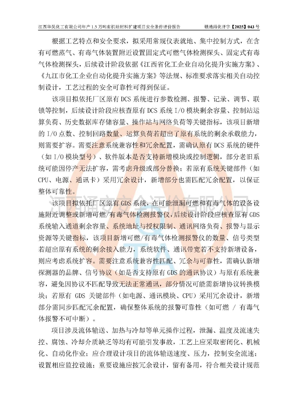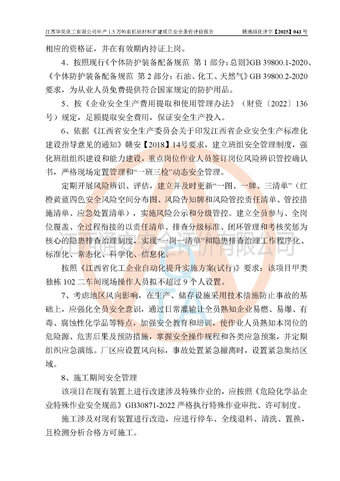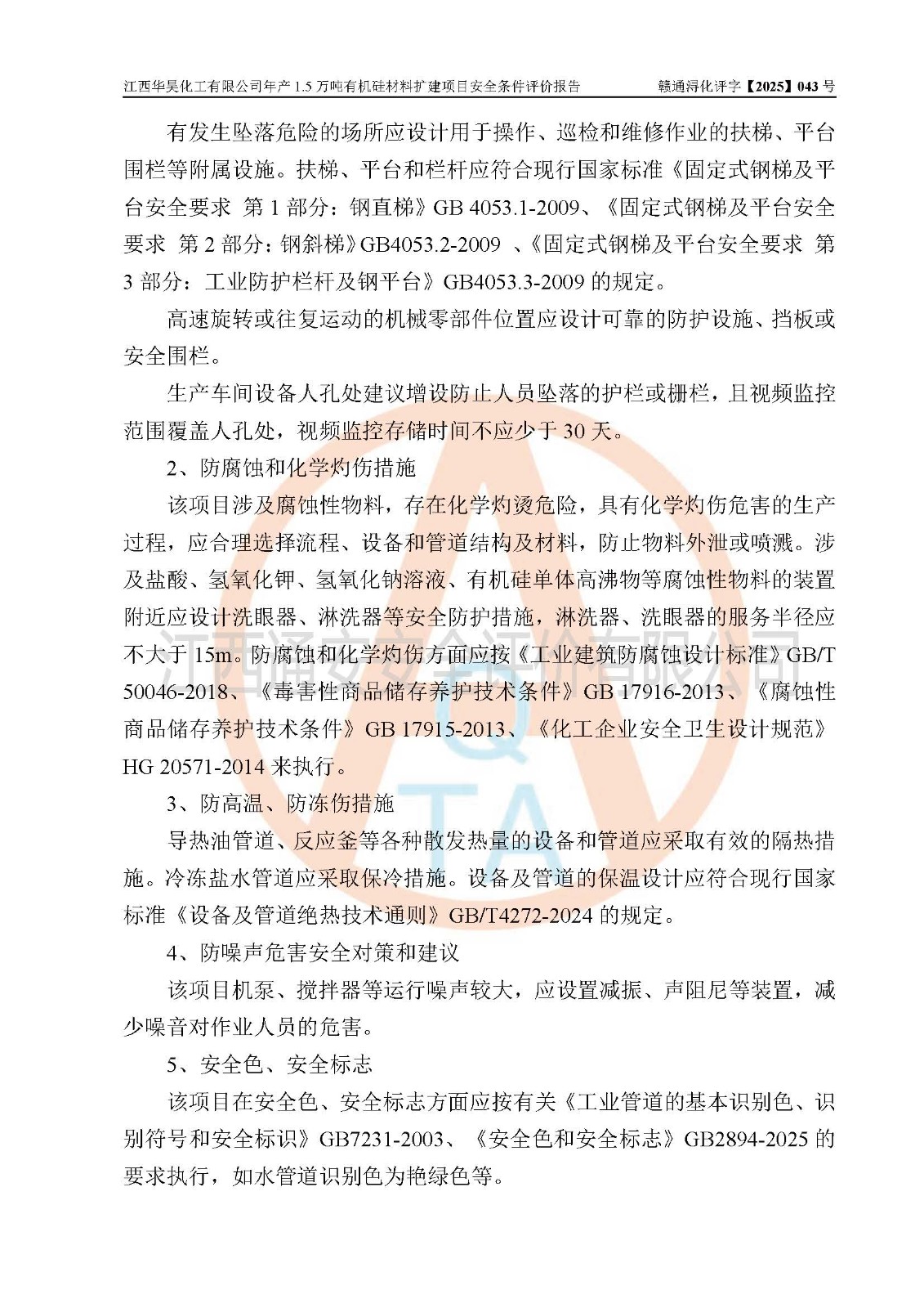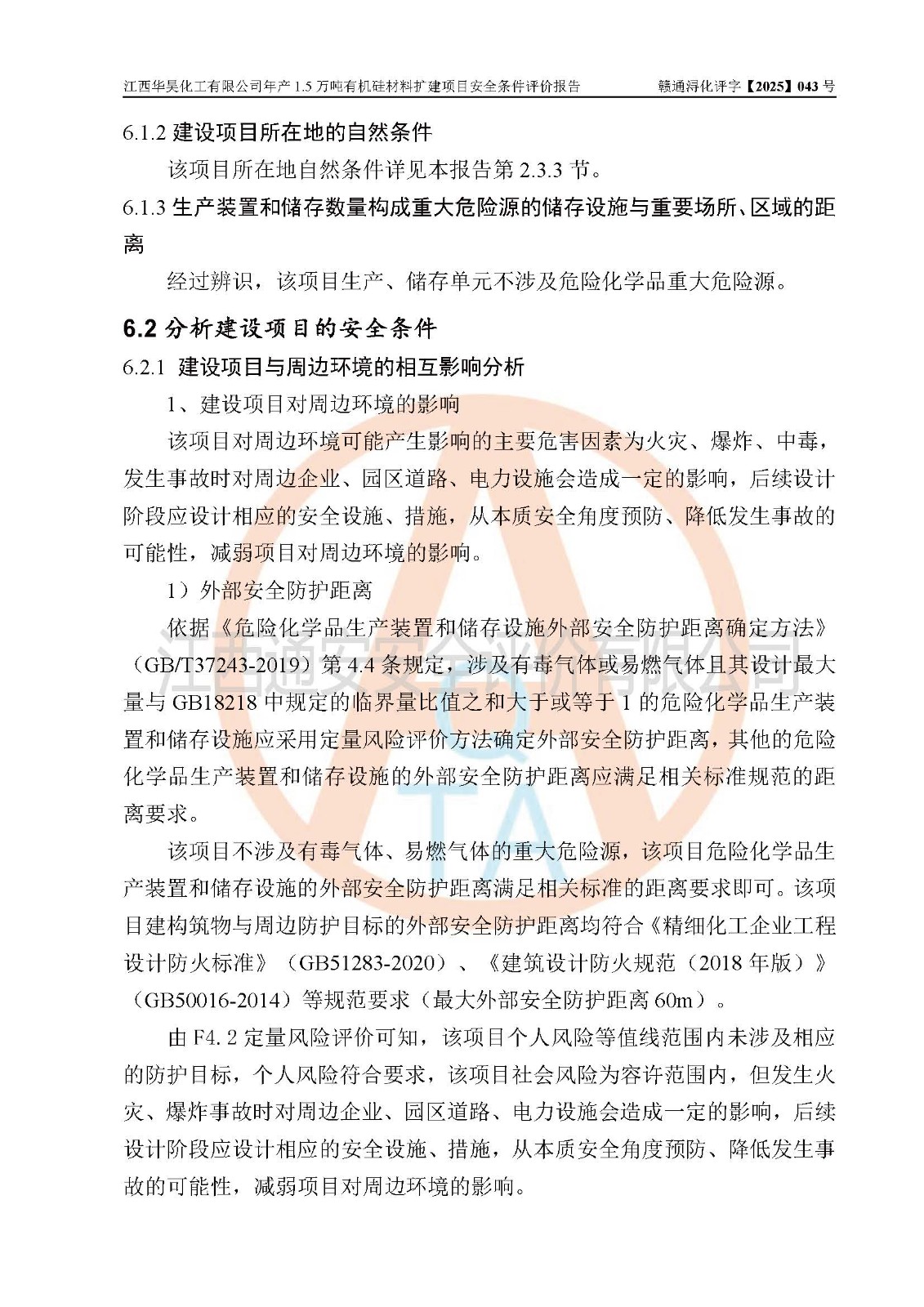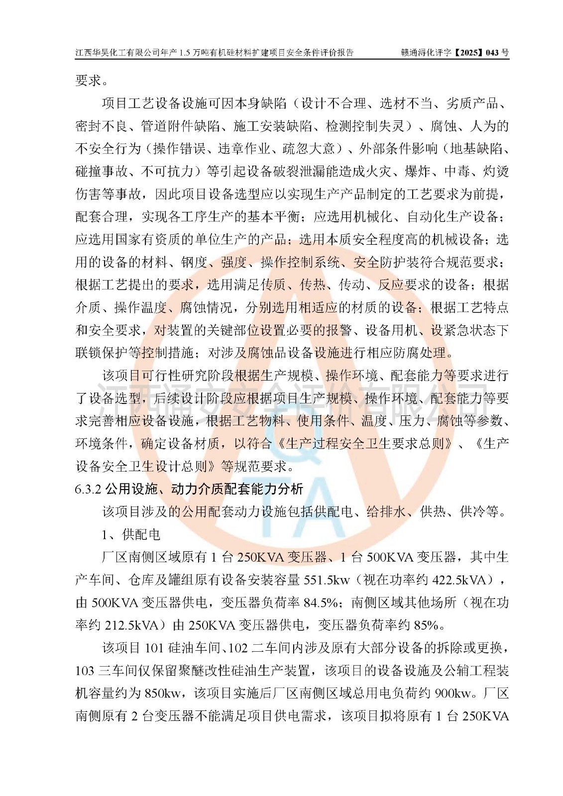 江西華昊化工有限公司是一家于2011年11月注冊成立的有限責(zé)任公司(自然人投資或控股),注冊地址位于永修縣云山經(jīng)濟(jì)開發(fā)區(qū)星火工業(yè)園星云大道旁,法定**人柴利兵,注冊資本1542萬元,經(jīng)營范圍包括許可項(xiàng)目和一般項(xiàng)目,許可項(xiàng)目為危險(xiǎn)化學(xué)品生產(chǎn)、危險(xiǎn)化學(xué)品經(jīng)營、貨物進(jìn)出口、第二類醫(yī)療器械生產(chǎn),一般項(xiàng)目為合成材料制造(不含危險(xiǎn)化學(xué)品)、合成材料銷售、第二類醫(yī)療器械銷售。 為滿足更大市場需求,同時(shí)解決企業(yè)原料及配套生產(chǎn)的需求,江西華昊化工有限公司擬投資5000萬元將廠區(qū)101硅油車間、102二車間原有項(xiàng)目改建為年產(chǎn)1.5萬噸有機(jī)硅材料擴(kuò)建項(xiàng)目(以下簡稱“該項(xiàng)目”)。 該項(xiàng)目生產(chǎn)過程涉及的化學(xué)反應(yīng)包括聚合(常壓)、水解、中和,涉及蒸餾、壓濾、流體輸送、熱交換、產(chǎn)品包裝等化工單元操作過程。該項(xiàng)目涉及的危險(xiǎn)化學(xué)品包括四甲基氫氧化銨、氫氧化鉀、磷酸、30%氫氧化鈉溶液、六甲基二硅氧烷、乙醇、氯化氫、鹽酸、氮?dú)?/span>、DMC(二甲基環(huán)硅氧烷的混合物)、有機(jī)硅單體高沸物、**胺(廢氣組分)、甲醇(廢氣組分)、甲醚(廢氣組分),其中甲醇、甲醚屬于重點(diǎn)監(jiān)管的危險(xiǎn)化學(xué)品,鹽酸屬于第三類易制毒化學(xué)品,乙醇、甲醇、甲醚屬于特別管控危險(xiǎn)化學(xué)品,四甲基氫氧化銨、乙醇、**胺、甲醇、甲醚屬于第四類監(jiān)控化學(xué)品。該項(xiàng)目不涉及劇毒品、易制爆化學(xué)品、高毒物品,不涉及**、二、三類監(jiān)控化學(xué)品。 該項(xiàng)目不涉及重點(diǎn)監(jiān)管的典型危險(xiǎn)化工工藝,生產(chǎn)單元、儲存單元不構(gòu)成危險(xiǎn)化學(xué)品重大危險(xiǎn)源。 該項(xiàng)目副產(chǎn)品鹽酸、中間產(chǎn)品低粘度封頭劑(六甲基二硅氧烷)屬于危險(xiǎn)化學(xué)品,該項(xiàng)目屬于危險(xiǎn)化學(xué)品生產(chǎn)項(xiàng)目,依據(jù)《危險(xiǎn)化學(xué)品生產(chǎn)企業(yè)安全生產(chǎn)許可證實(shí)施辦法》(**安全生產(chǎn)監(jiān)督管理總局令第41號,第79號、89號修改),項(xiàng)目需要辦理危險(xiǎn)化學(xué)品安全生產(chǎn)許可證。 |